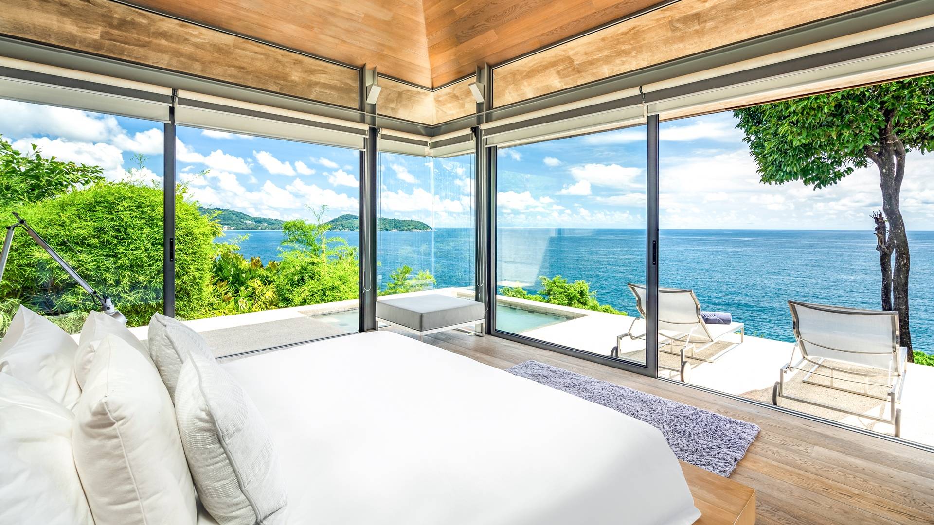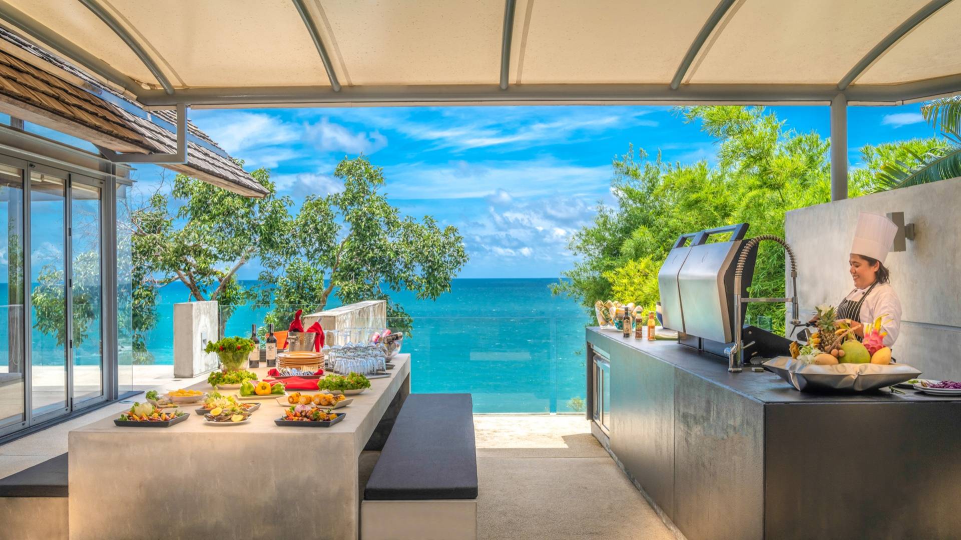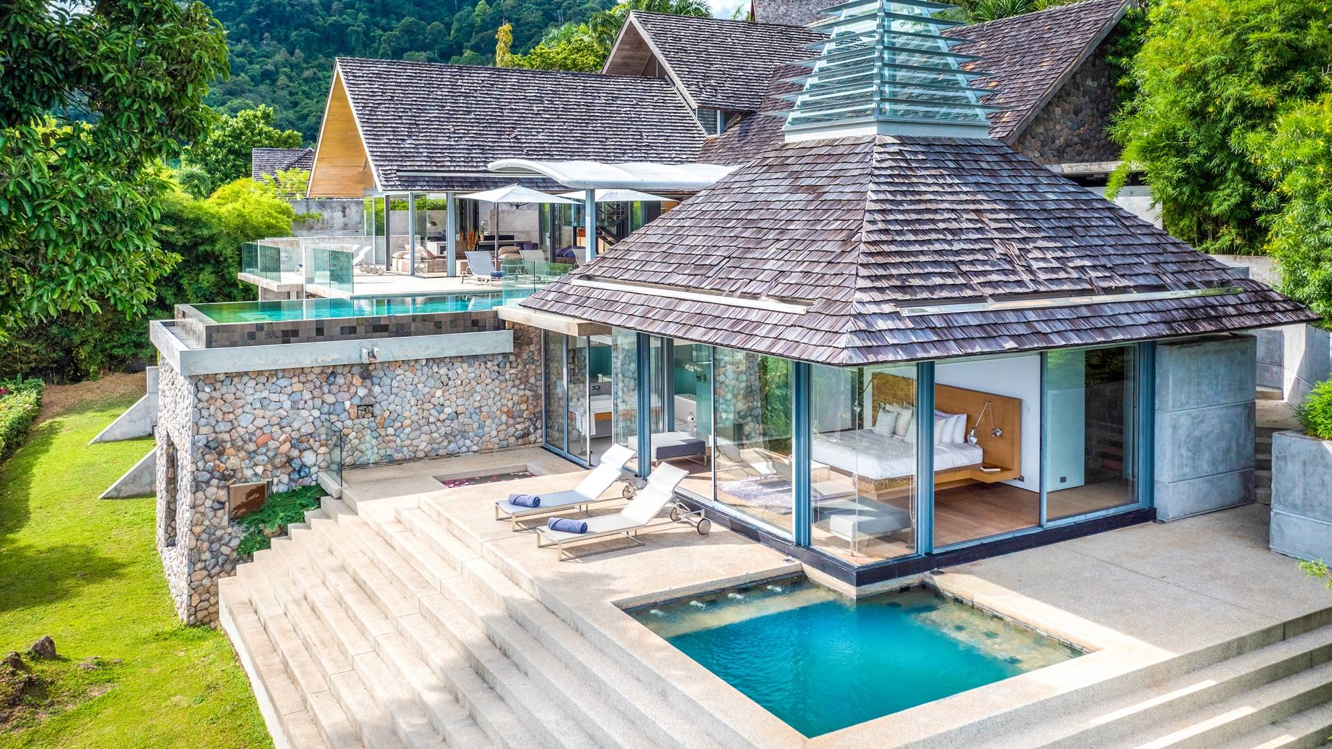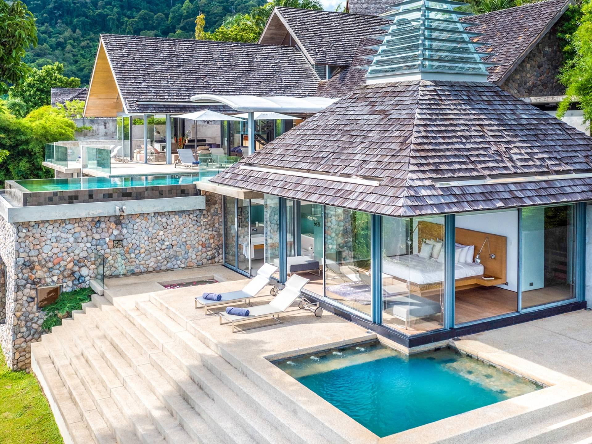 Oozing industrial chic, the covered outdoor dining space features a top-of-the-line barbecue unit built into the granite island kitchen counter and a long dinner table and benches made of matching brushed concrete. The addition of a poolside sala, perched on the corner of the plot and overlooking the Andaman sea, means sundowner rituals easily become an irresistible part of the stay. Meanwhile, an on-site office dedicated AV room, and an attached games room with a billiards table ensure there’s plenty to keep friends or colleagues entertained after a day of exploring or brainstorming without ever leaving the villa’s enchanting view-soaked surrounds.