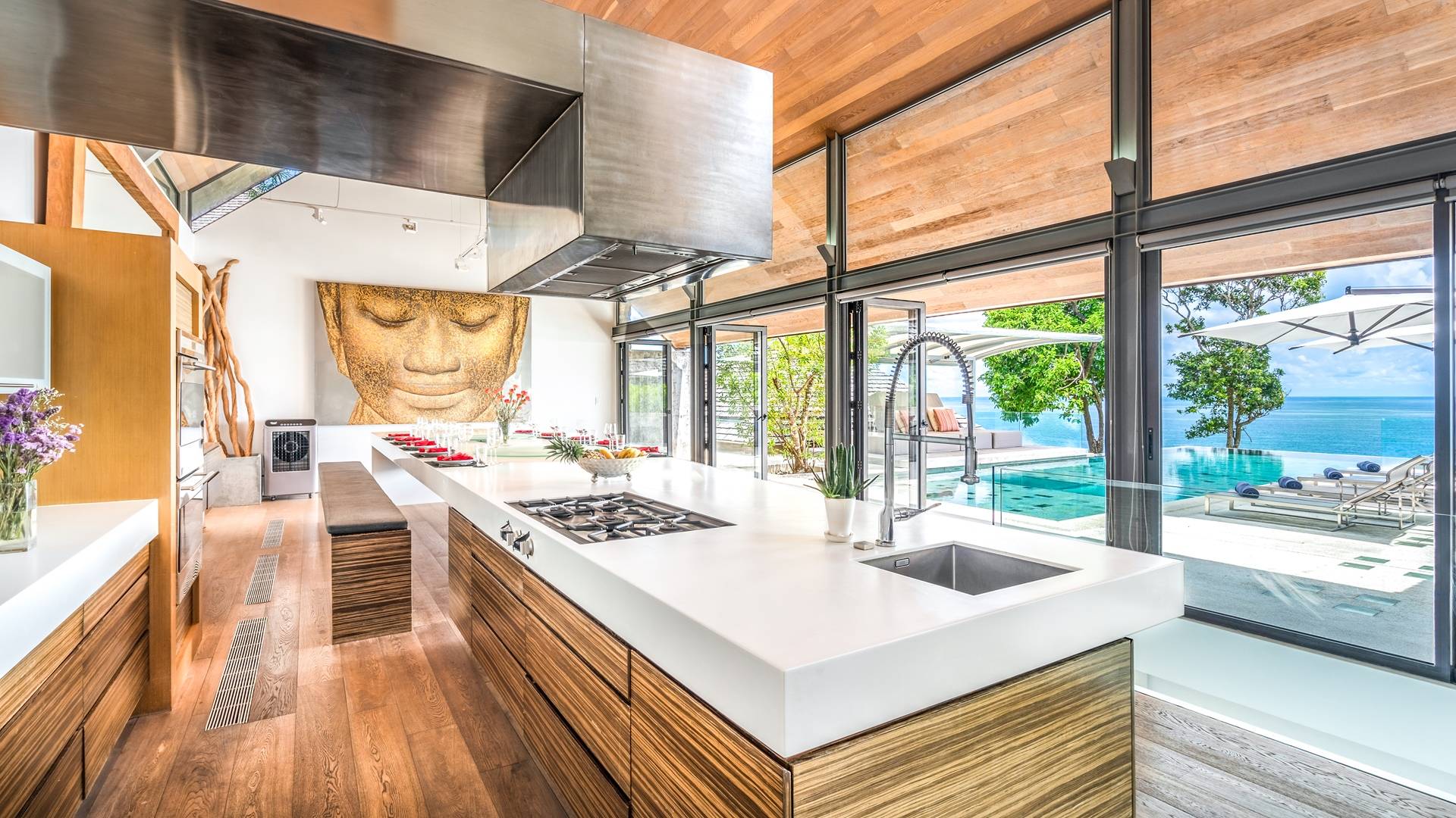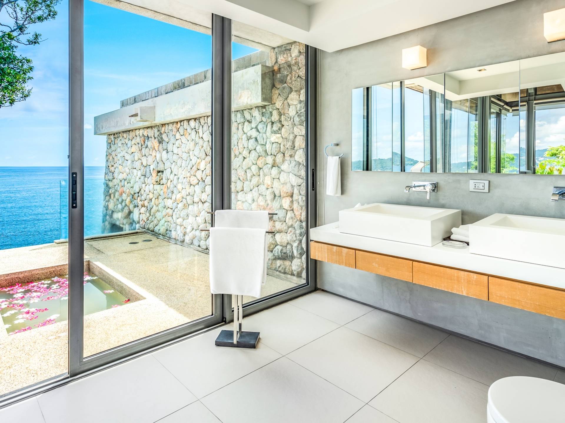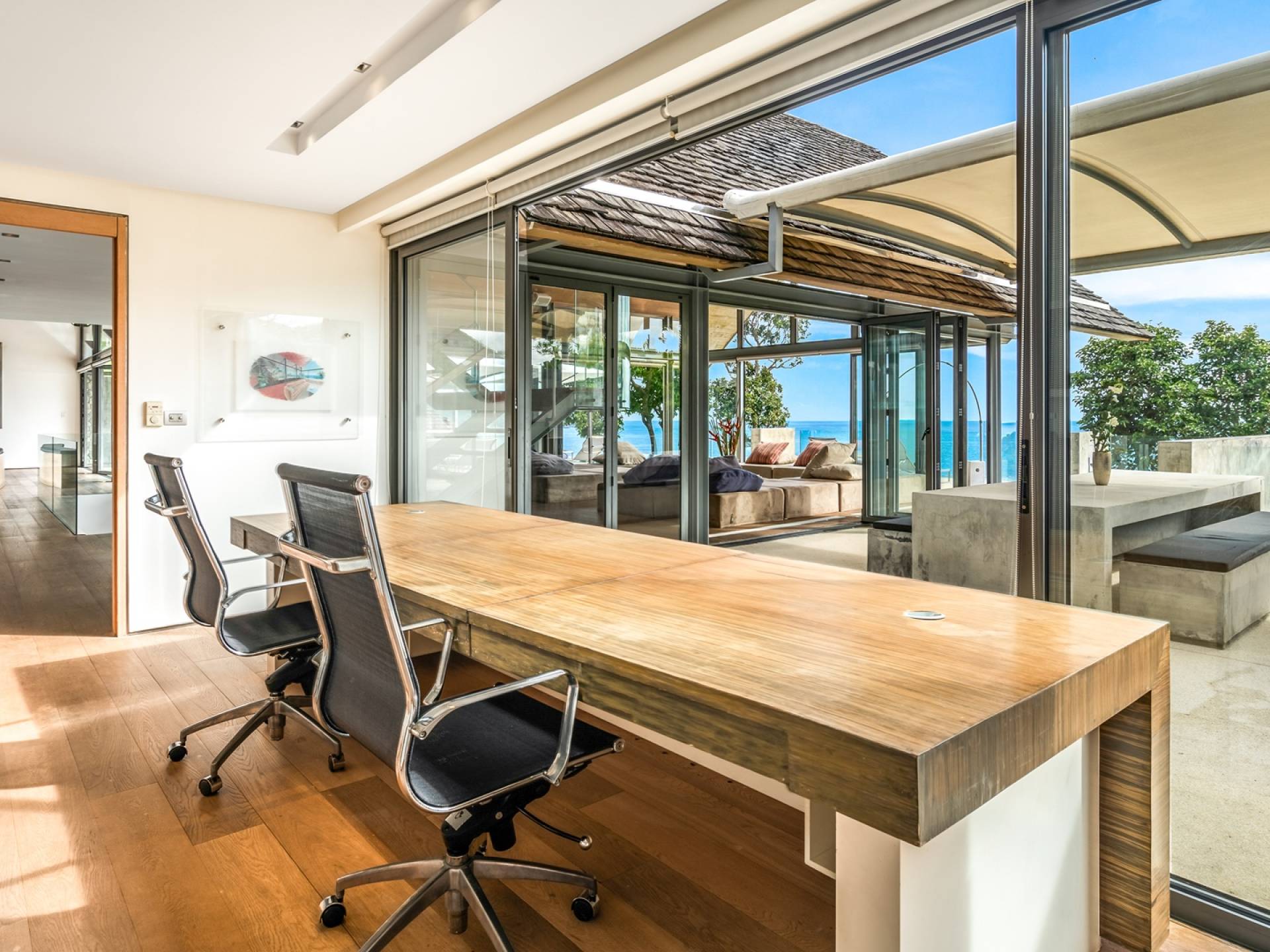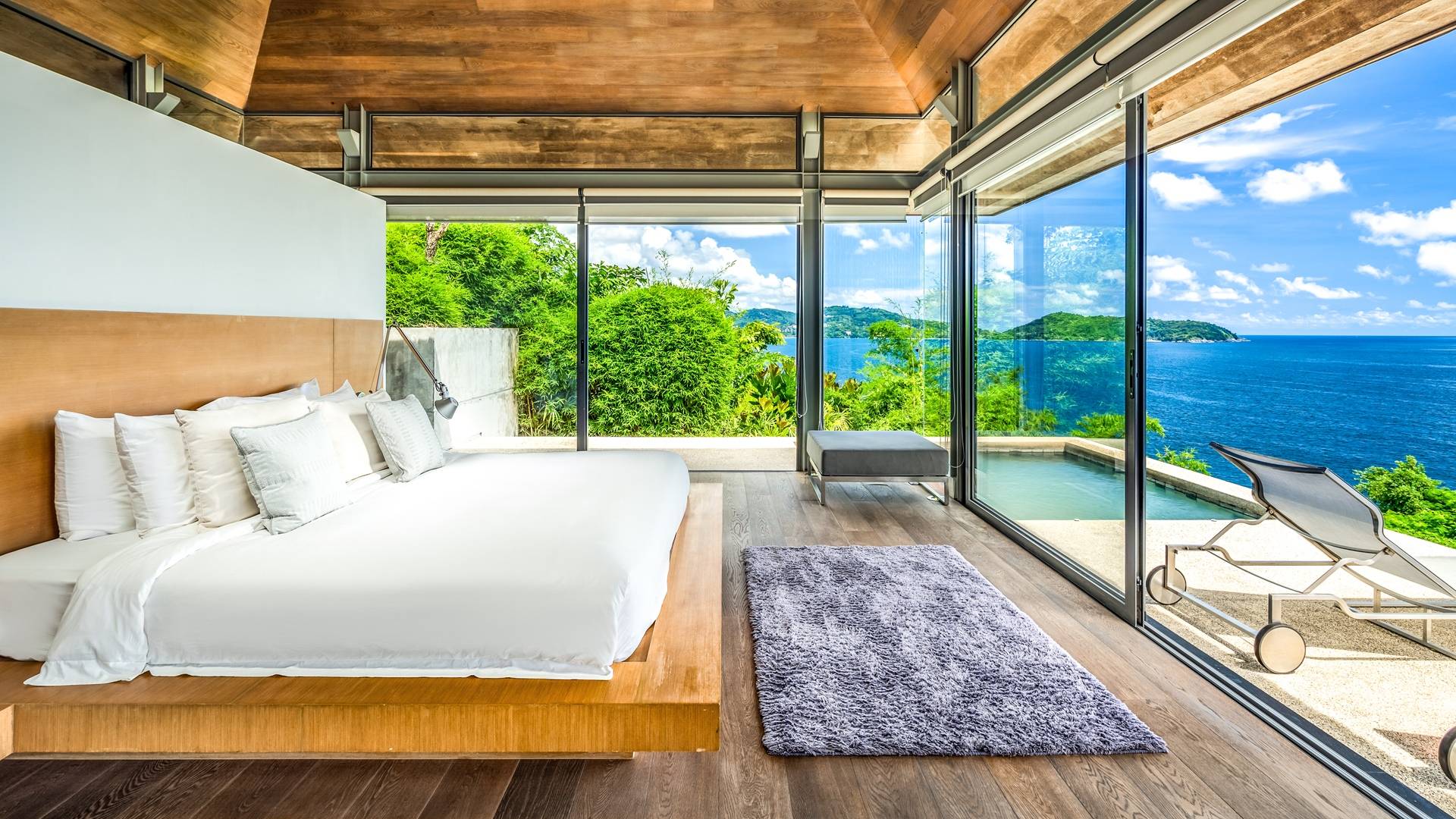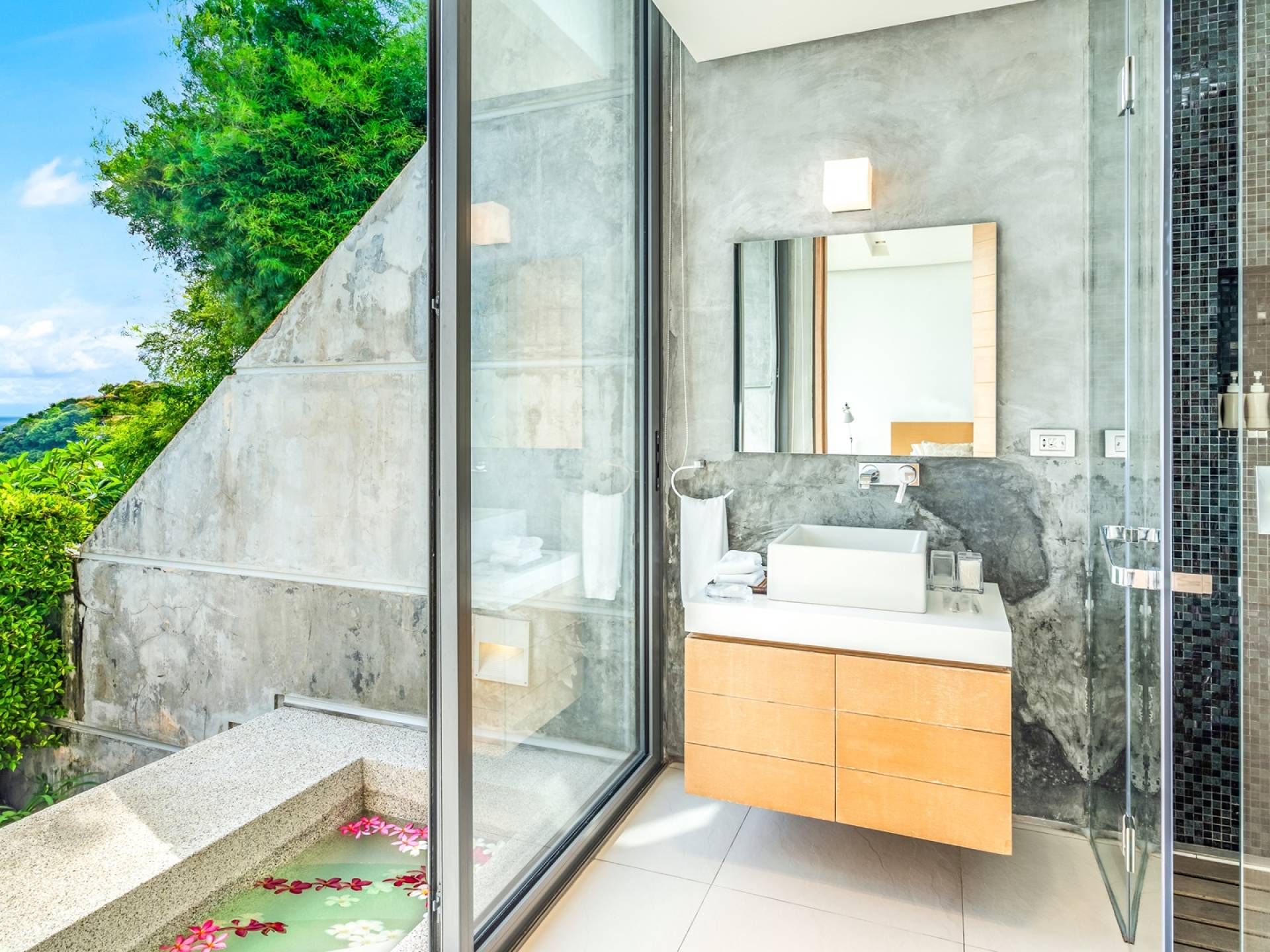 Oozing industrial chic, the covered outdoor dining space features a top-of-the-line barbecue unit built into the granite island kitchen counter and a long dinner table and benches made of matching brushed concrete. The addition of a poolside sala, perched on the corner of the plot and overlooking the Andaman sea, means sundowner rituals easily become an irresistible part of the stay. Meanwhile, an on-site office dedicated AV room, and an attached games room with a billiards table ensure there’s plenty to keep friends or colleagues entertained after a day of exploring or brainstorming without ever leaving the villa’s enchanting view-soaked surrounds.