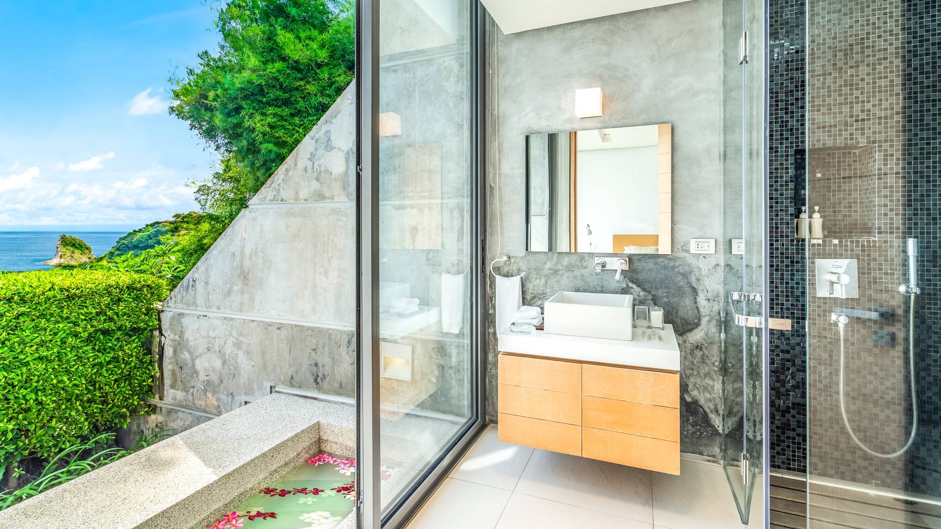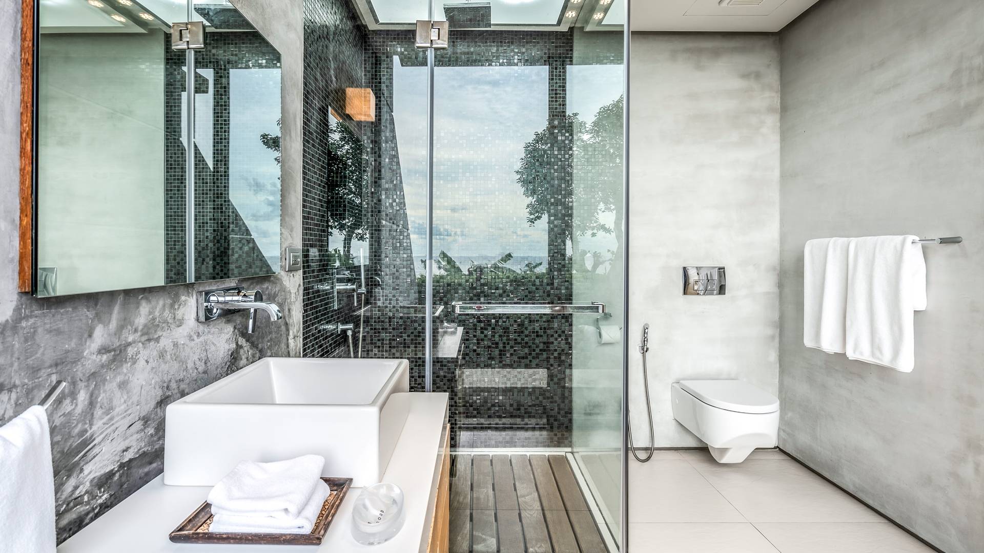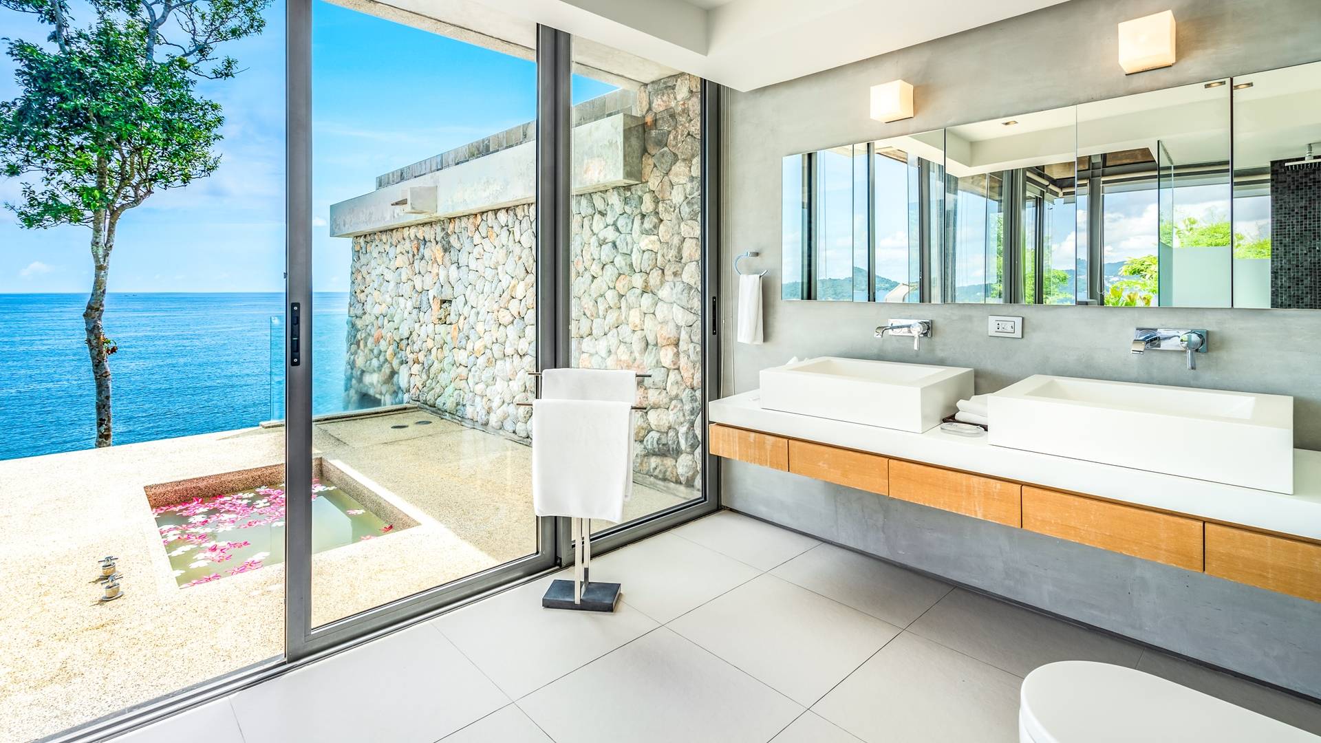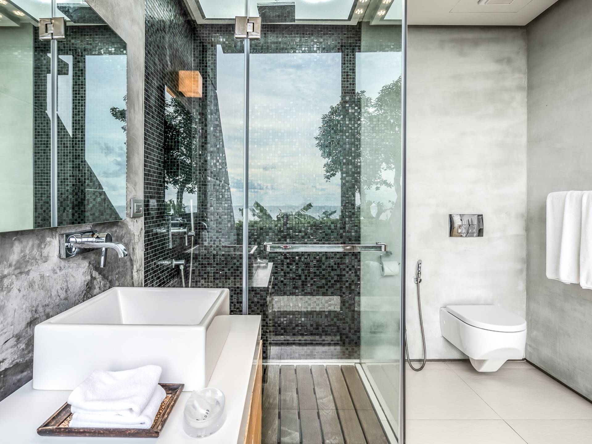 Oozing industrial chic, the covered outdoor dining space features a top-of-the-line barbecue unit built into the granite island kitchen counter and a long dinner table and benches made of matching brushed concrete. The addition of a poolside sala, perched on the corner of the plot and overlooking the Andaman sea, means sundowner rituals easily become an irresistible part of the stay. Meanwhile, an on-site office dedicated AV room, and an attached games room with a billiards table ensure there’s plenty to keep friends or colleagues entertained after a day of exploring or brainstorming without ever leaving the villa’s enchanting view-soaked surrounds.