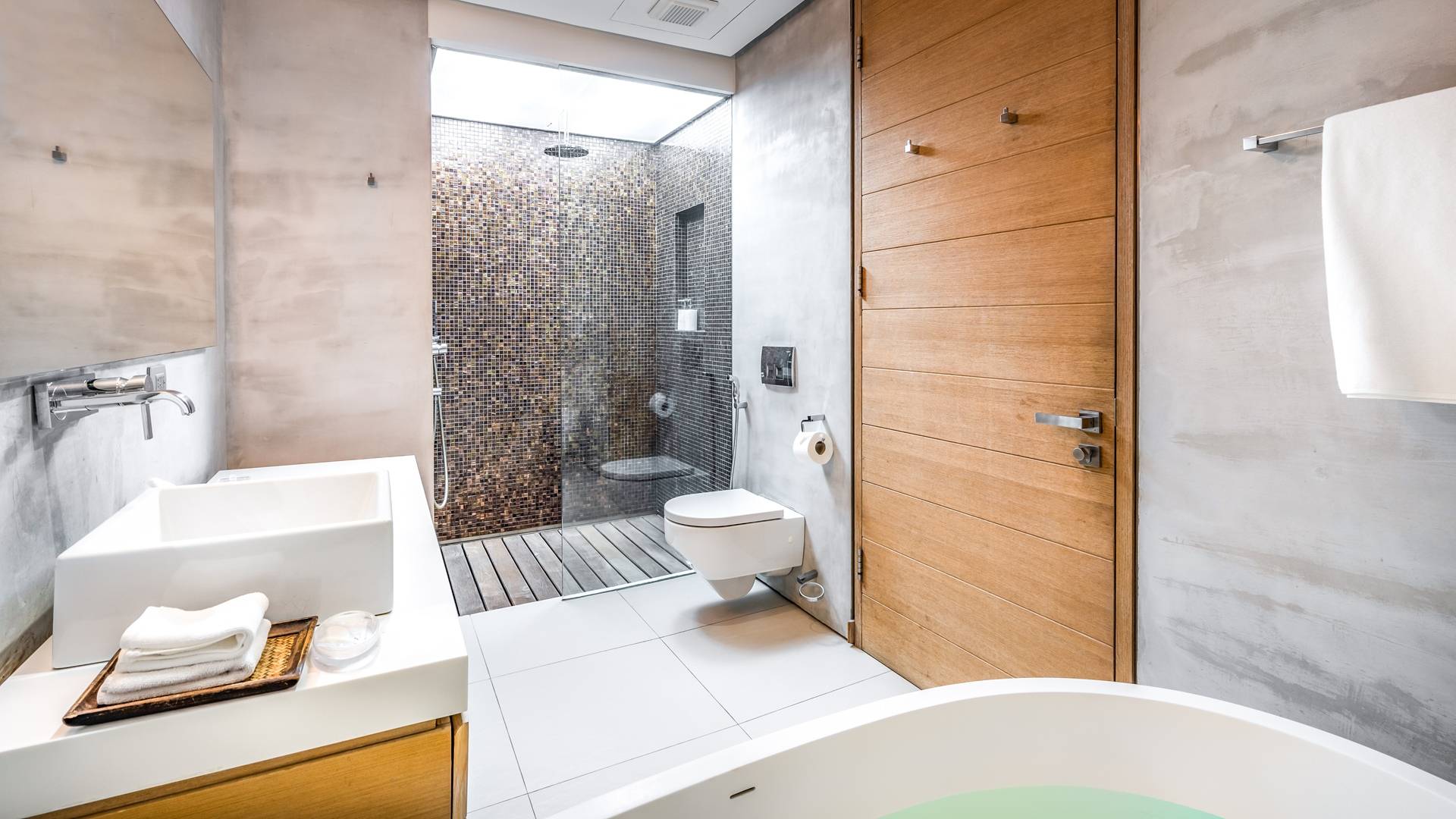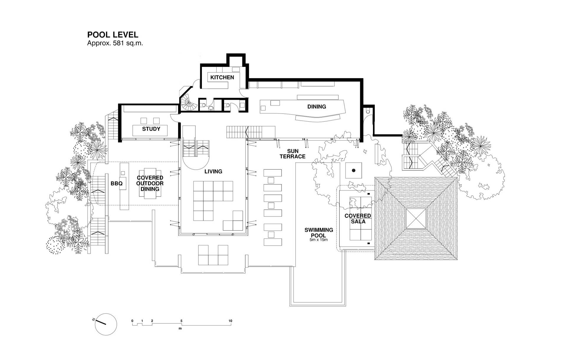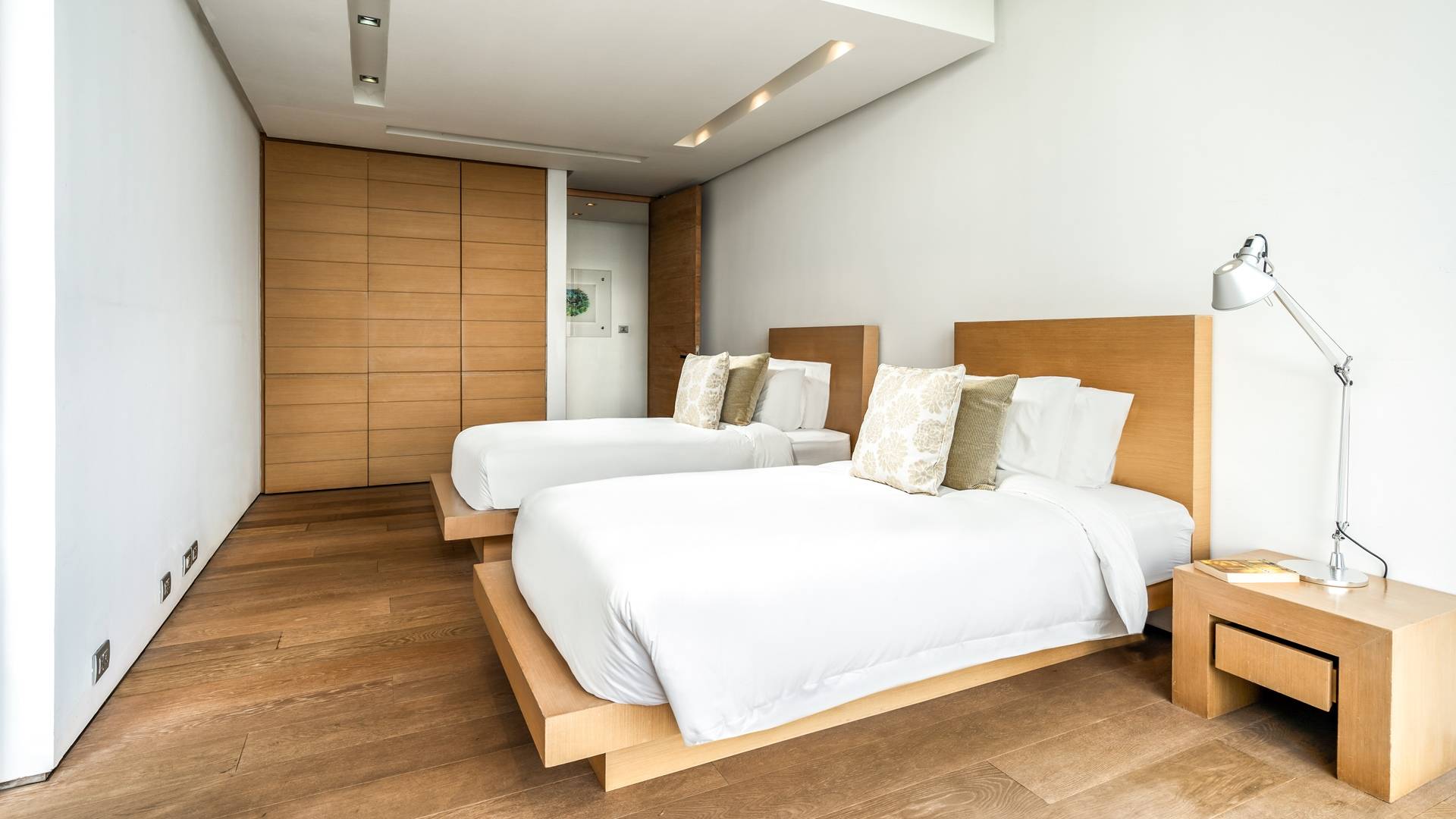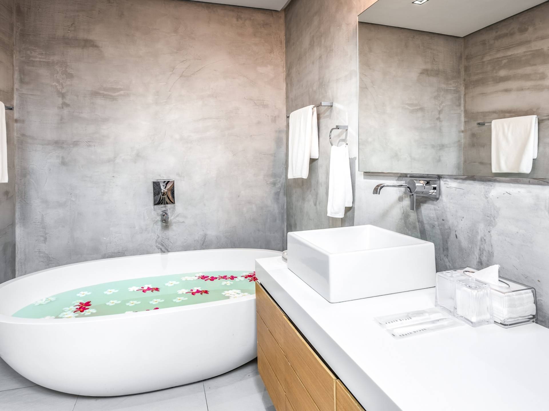 Oozing industrial chic, the covered outdoor dining space features a top-of-the-line barbecue unit built into the granite island kitchen counter and a long dinner table and benches made of matching brushed concrete. The addition of a poolside sala, perched on the corner of the plot and overlooking the Andaman sea, means sundowner rituals easily become an irresistible part of the stay. Meanwhile, an on-site office dedicated AV room, and an attached games room with a billiards table ensure there’s plenty to keep friends or colleagues entertained after a day of exploring or brainstorming without ever leaving the villa’s enchanting view-soaked surrounds.