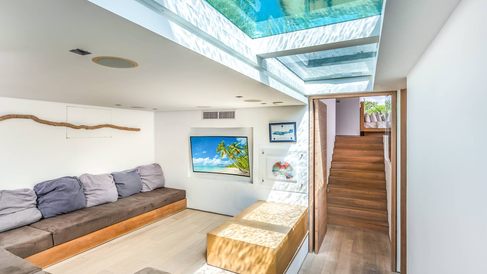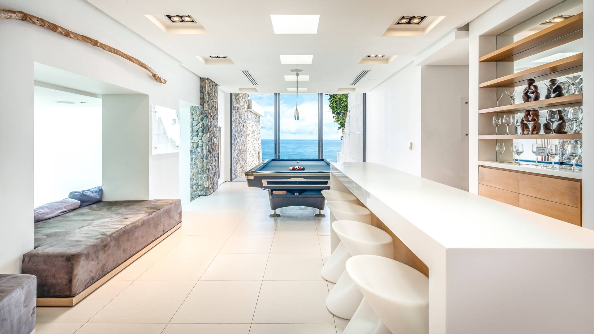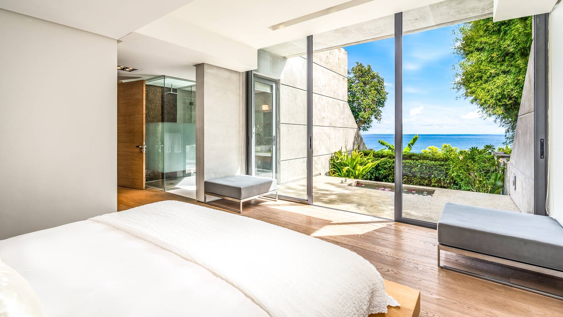 An entrance staircase descends dramatically from the foyer into the main living room, an airy space featuring a custom-made oversize sofa suite, its stark modular lines mirroring the panoramic ocean horizon sweeping as wide as the eye can see. Guests can effortlessly drift between the villa’s multidimensional spaces, indoor and out; the glass enclosure of the double-height central lounge can be slid all the way open to allow the space to flow seamlessly from the outdoor dining area, through the lounge and out onto the al fresco pool terrace and open-air relaxation pavilion.
