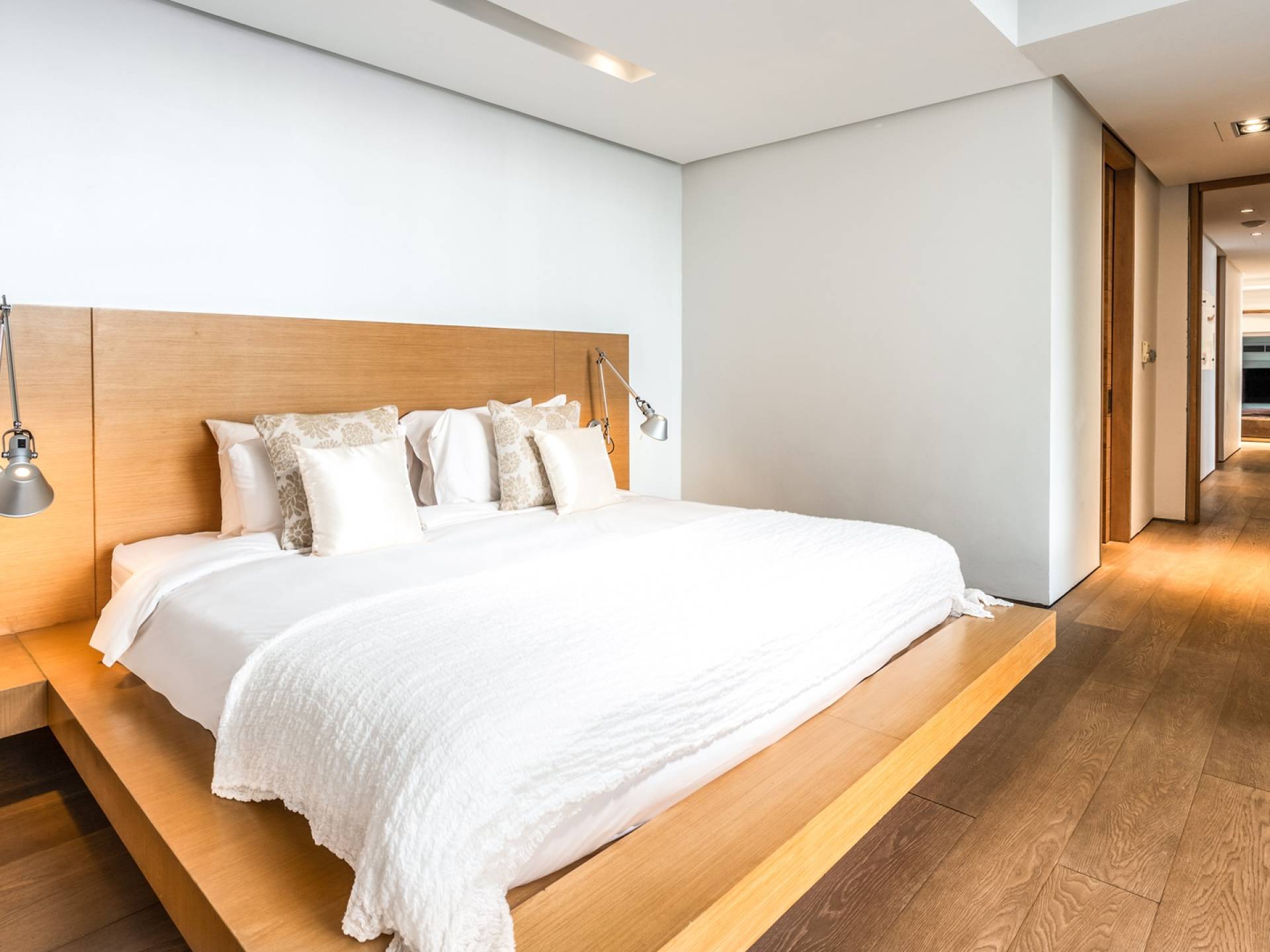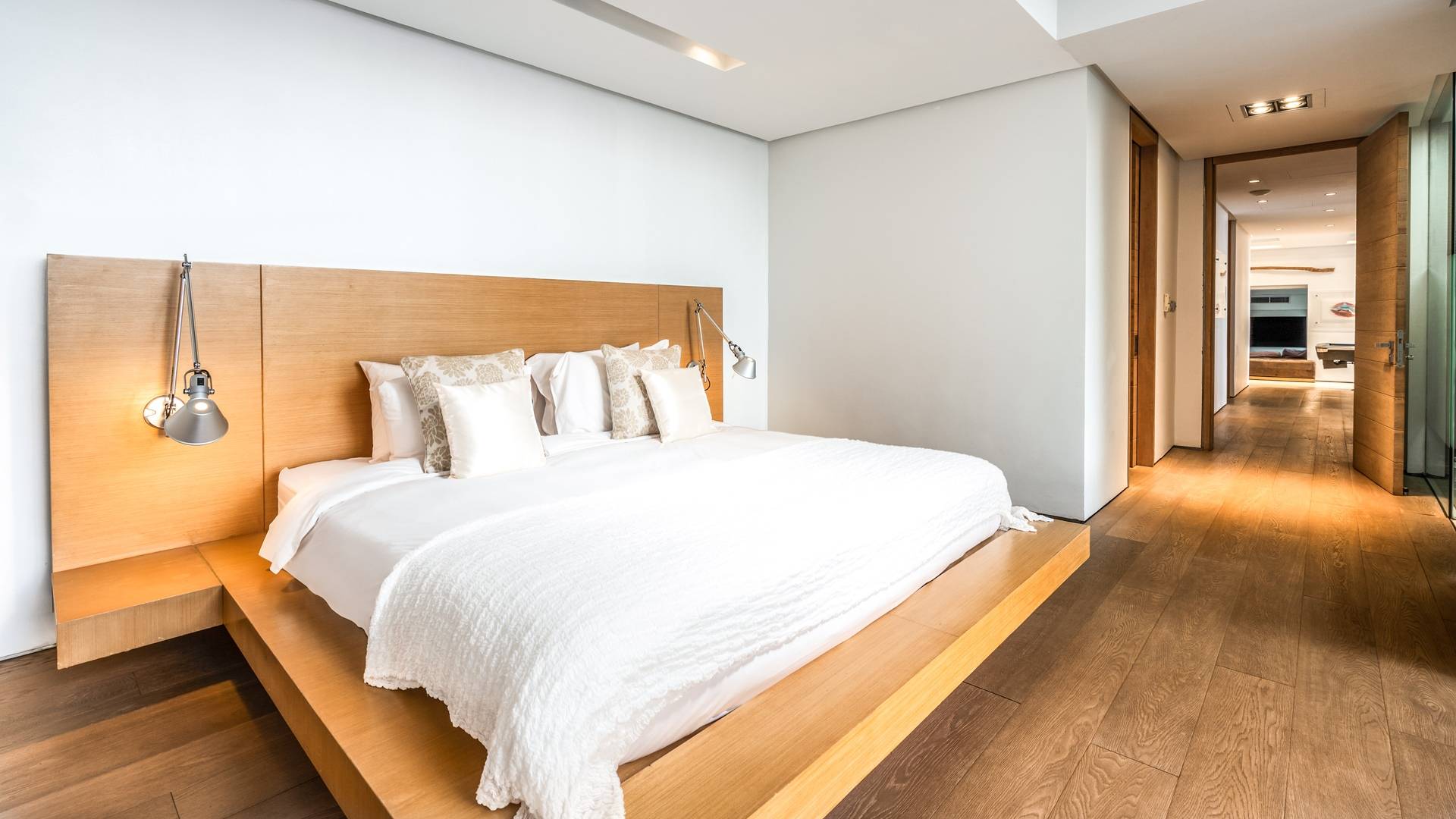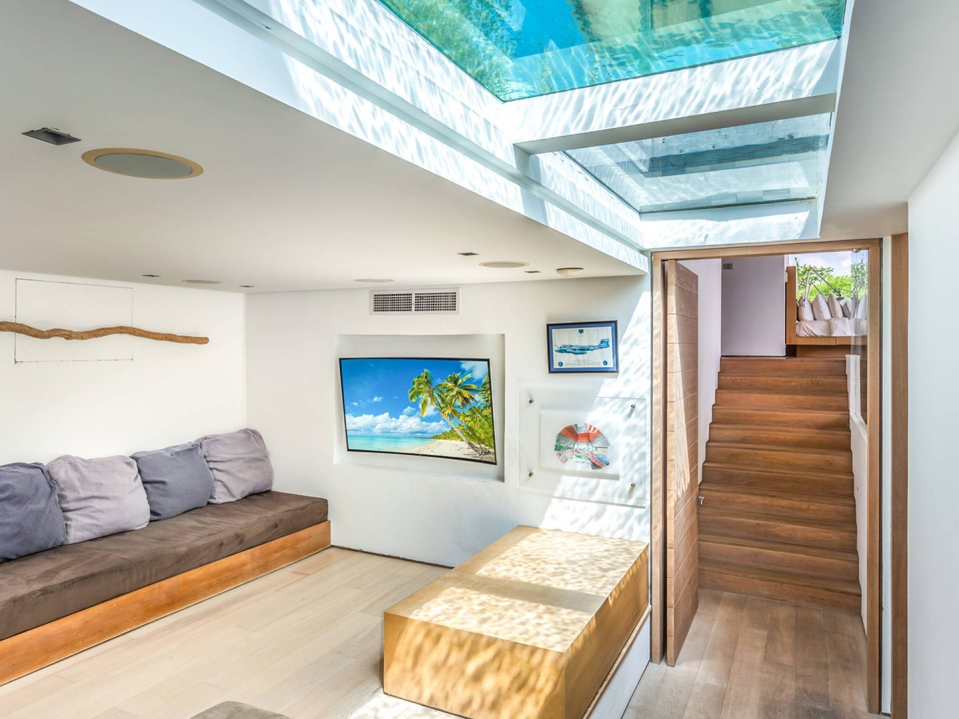 An entrance staircase descends dramatically from the foyer into the main living room, an airy space featuring a custom-made oversize sofa suite, its stark modular lines mirroring the panoramic ocean horizon sweeping as wide as the eye can see. Guests can effortlessly drift between the villa’s multidimensional spaces, indoor and out; the glass enclosure of the double-height central lounge can be slid all the way open to allow the space to flow seamlessly from the outdoor dining area, through the lounge and out onto the al fresco pool terrace and open-air relaxation pavilion.