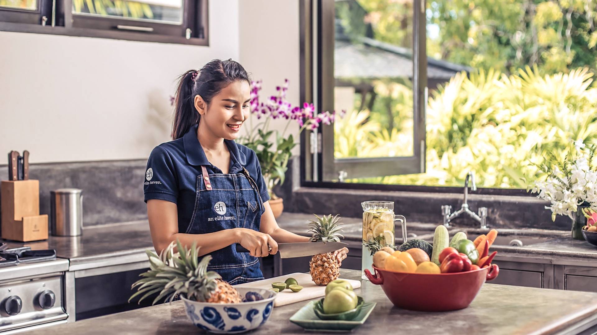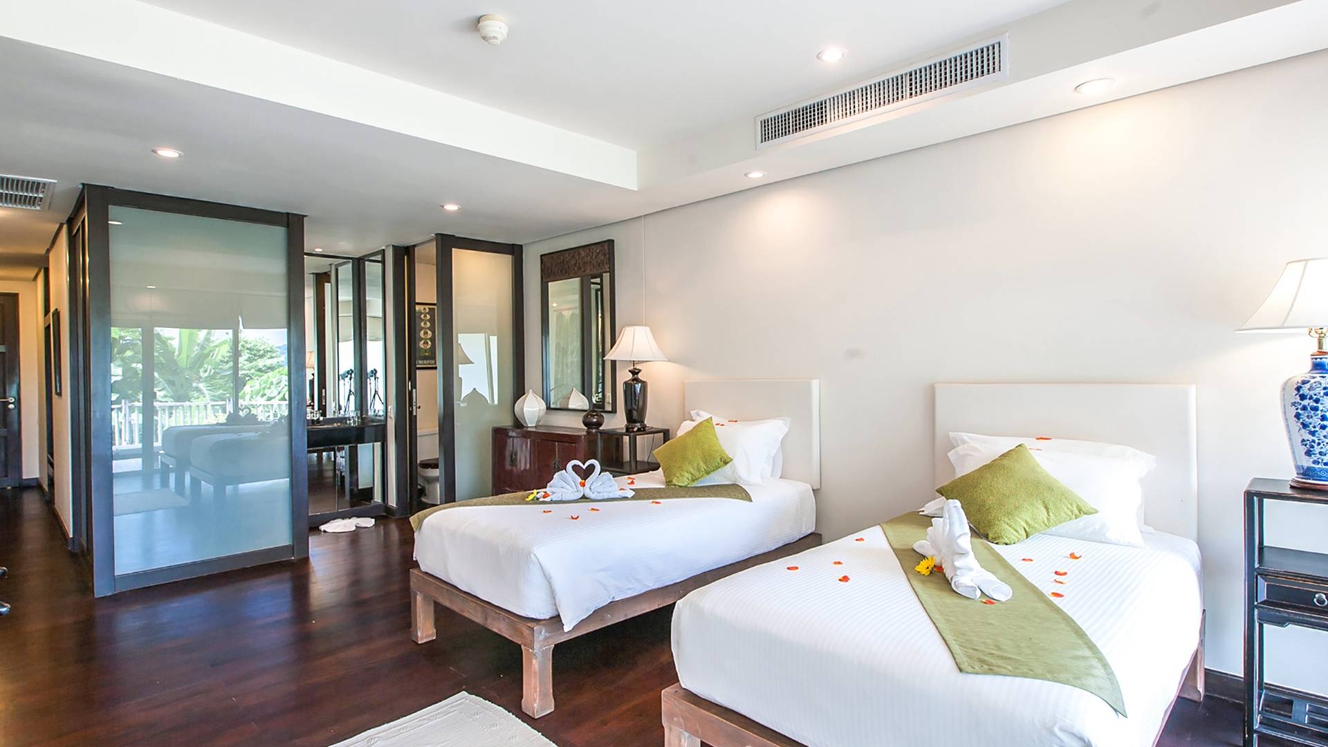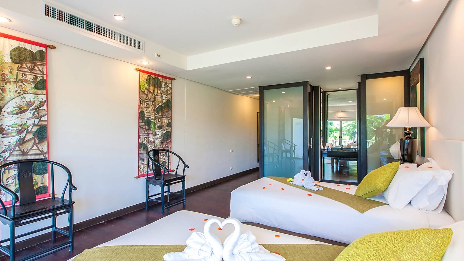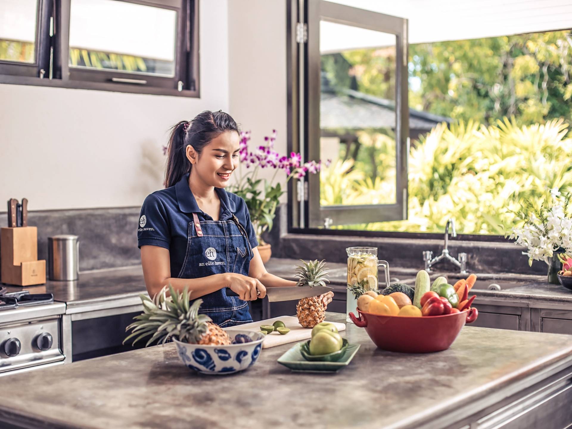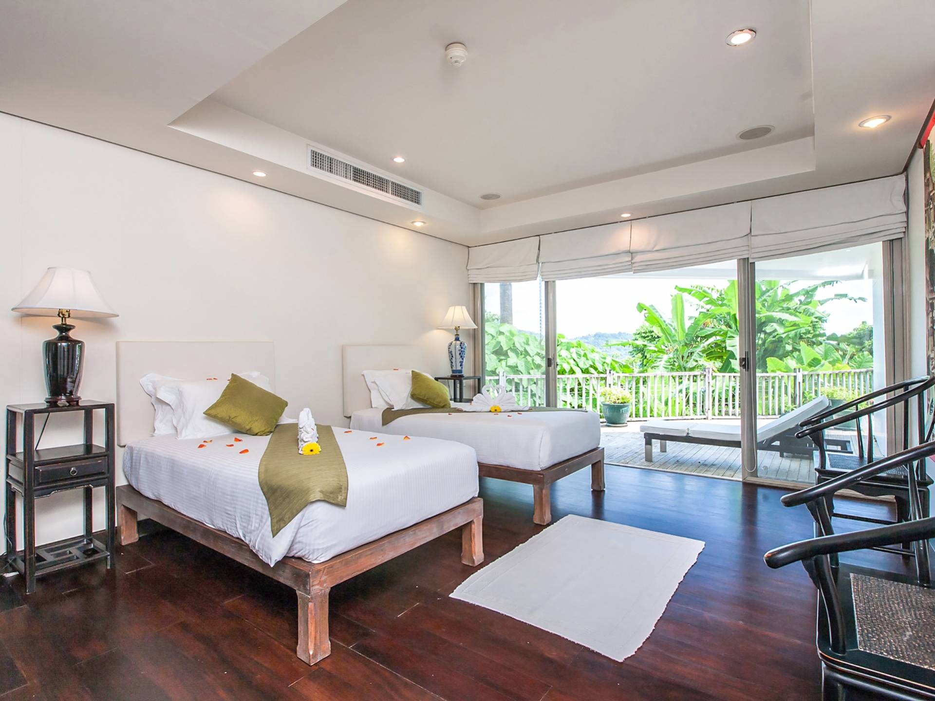 The villa has three spacious king-size bedrooms and a large twin bedroom, easily accommodating up to 8 guests. With dark wood floors, generous ensuites, and sliding glass doors, there is a homeliness to the villa, elevated by luxurious perks such as having staff to cater to your every whim. The vast modern kitchen will wow you if you’d like to stir up your signature dishes. Or, you can simply let your private chef take care of the cooking for you. With a suggestion menu available that features western as well as Thai fare, you are spoilt for choice.