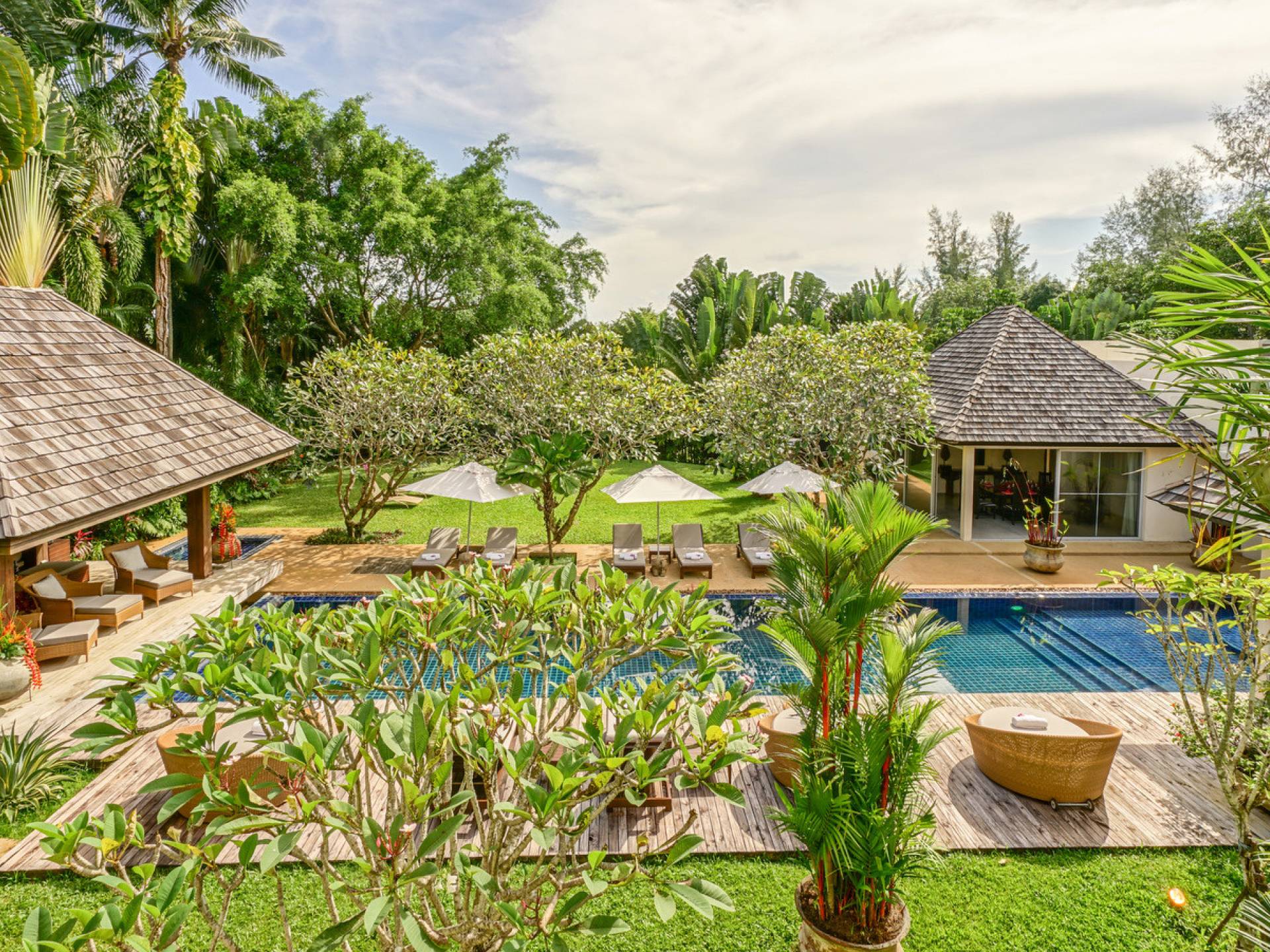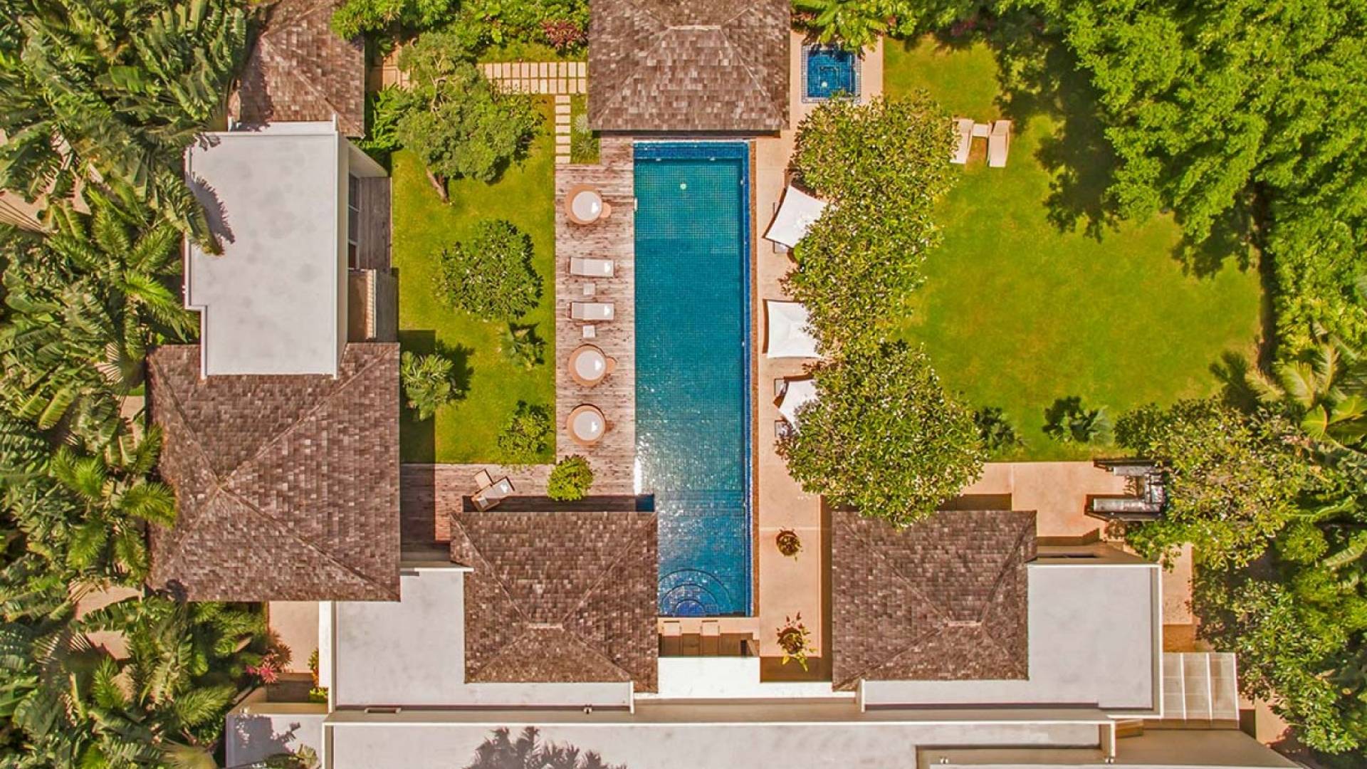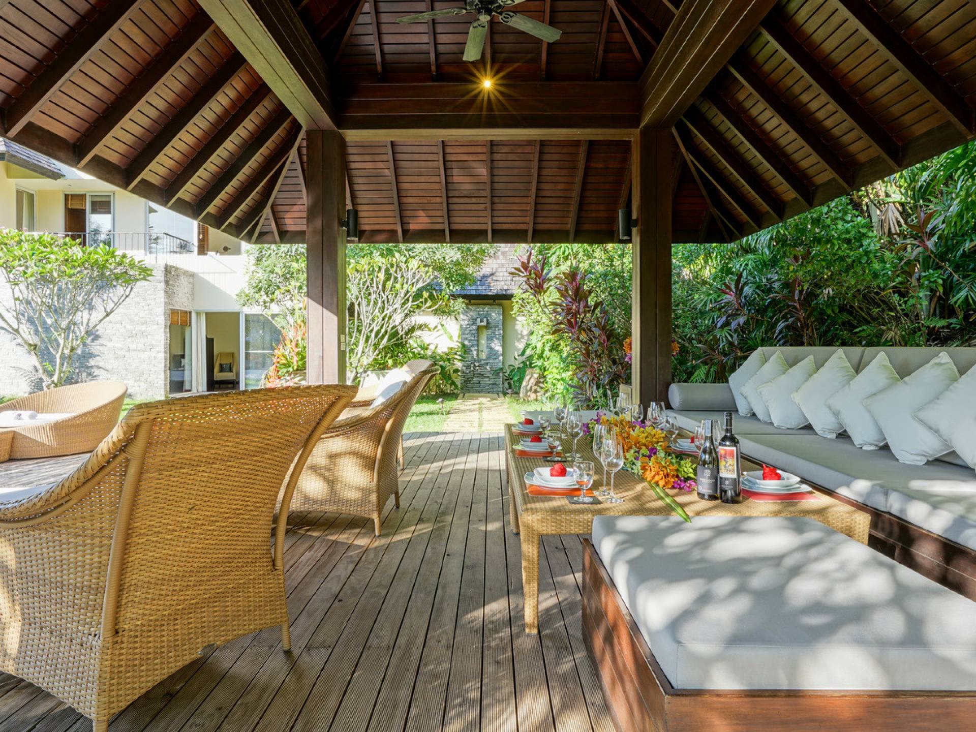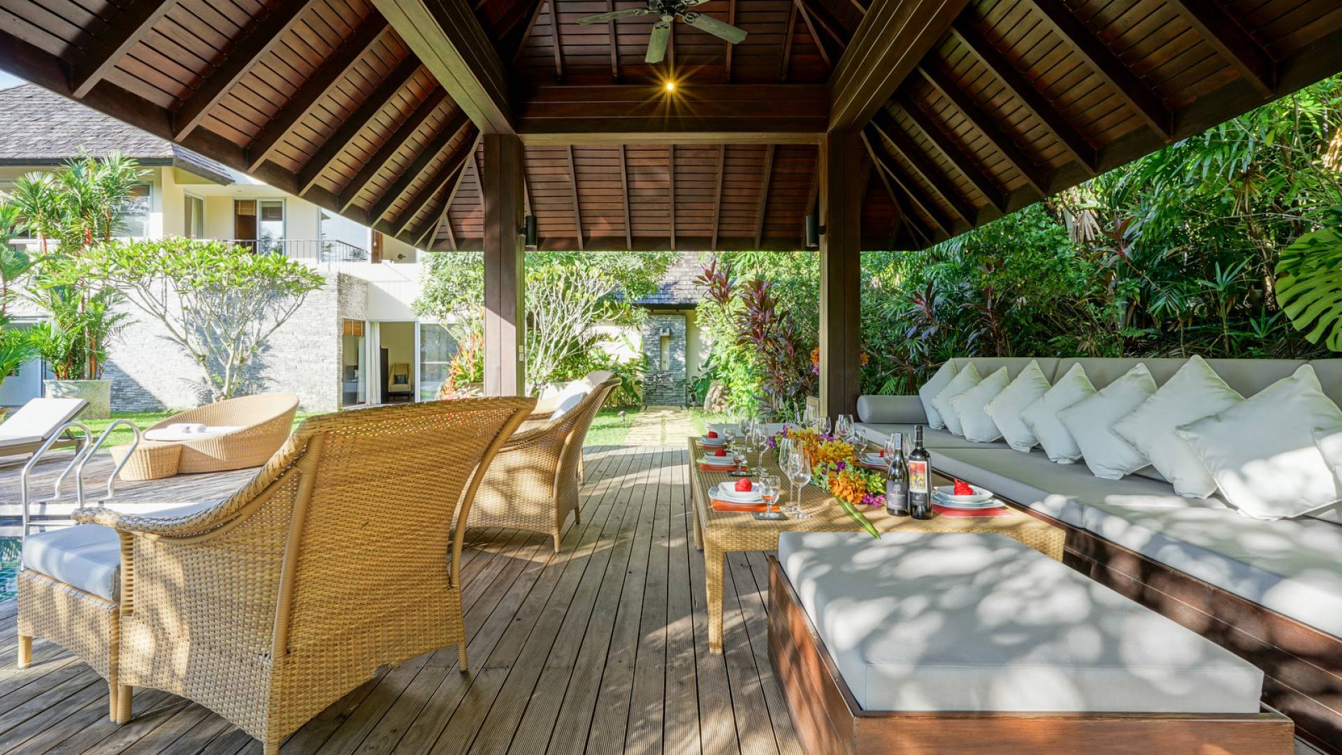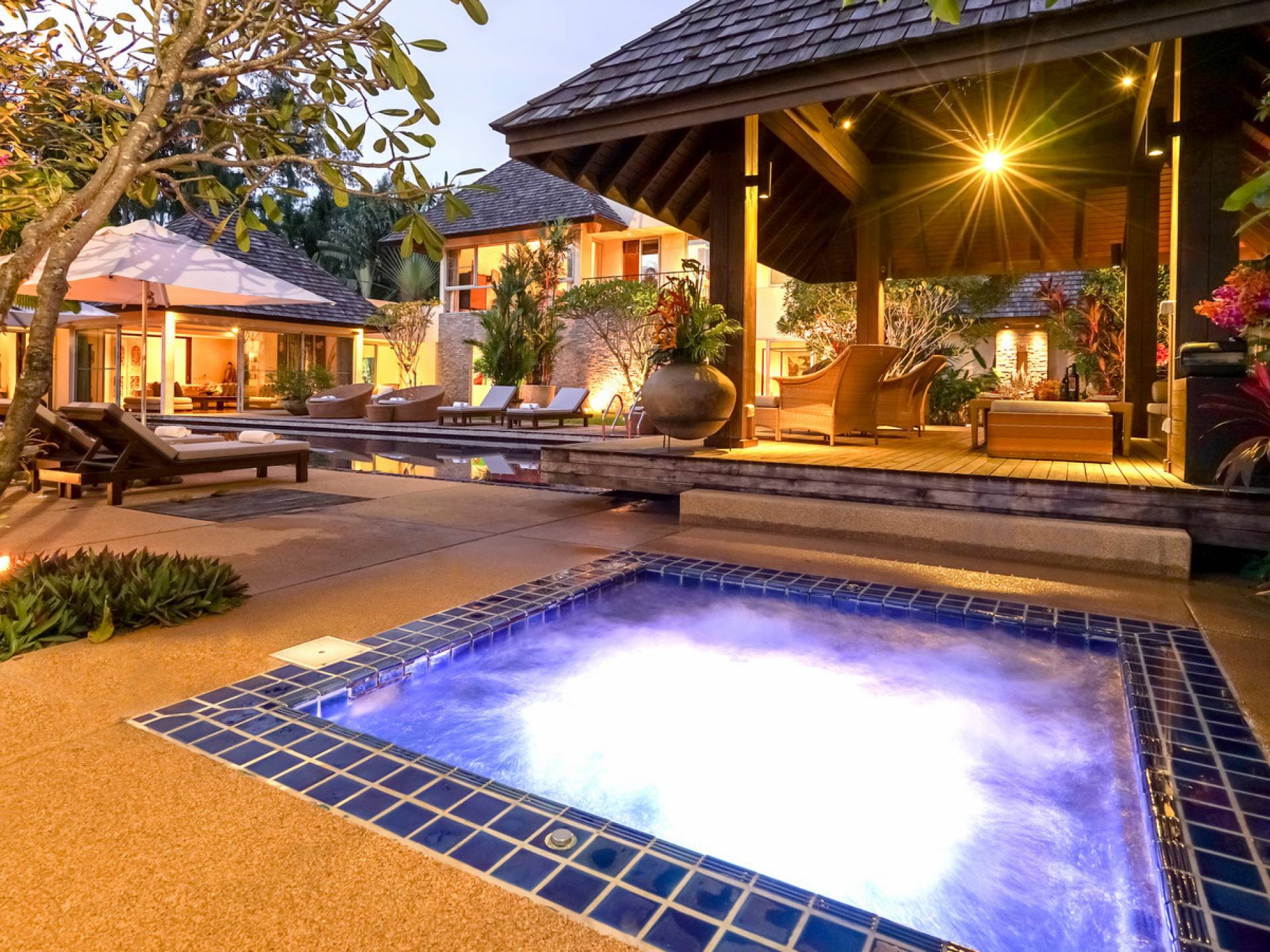 The spacious wooden pool deck offers a divine choice of spots to catch the sun’s rays, just a hop away from the 10-person jacuzzi. Towering fan palms and a rich variety of tropical garden plants create a vivid green landscape and a natural border that keep the villa ultra private and secure.
