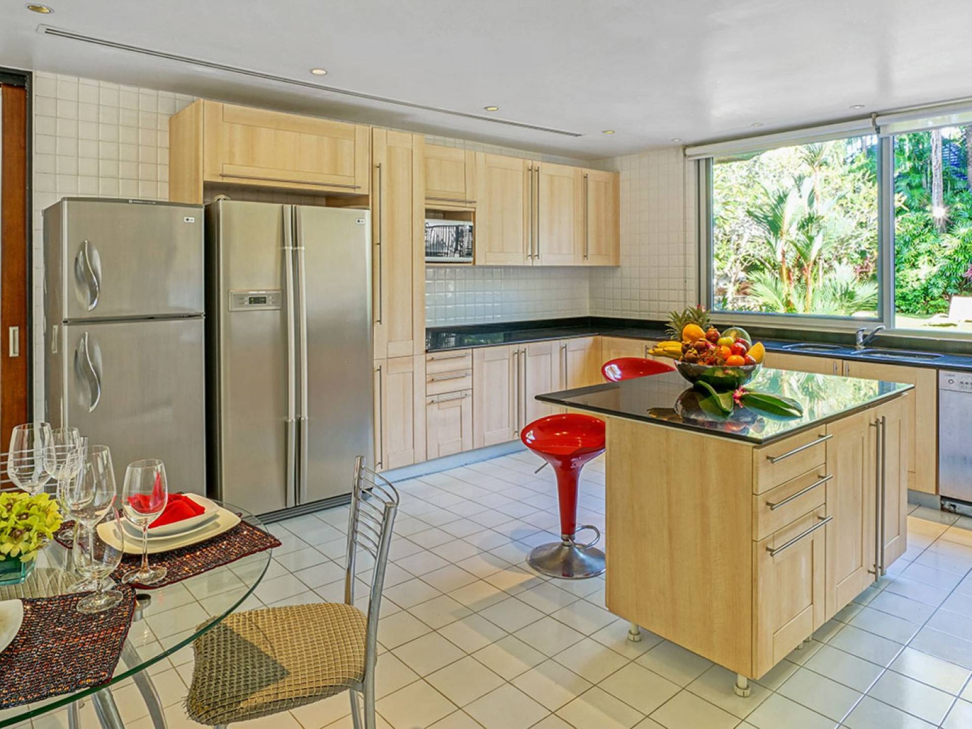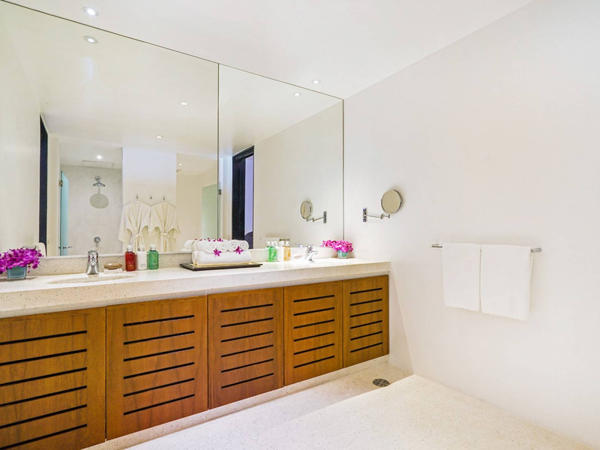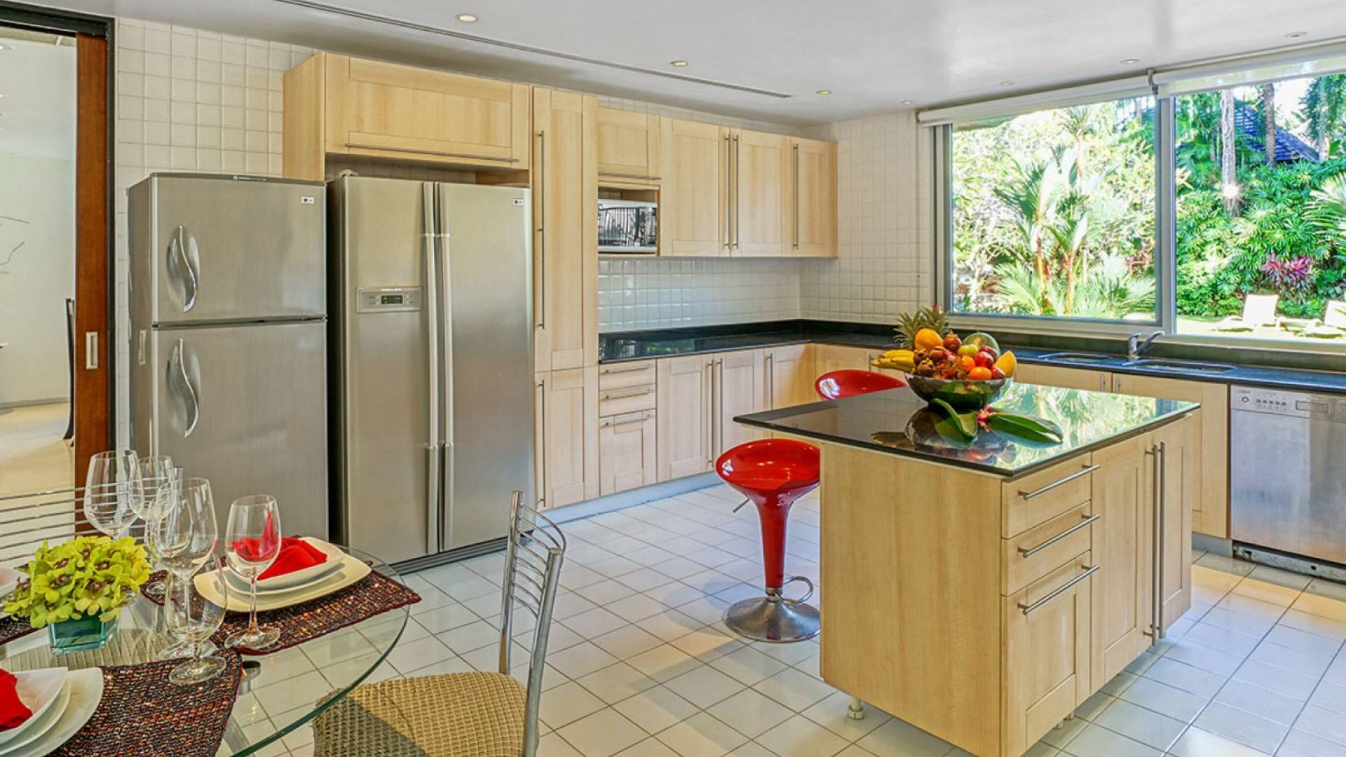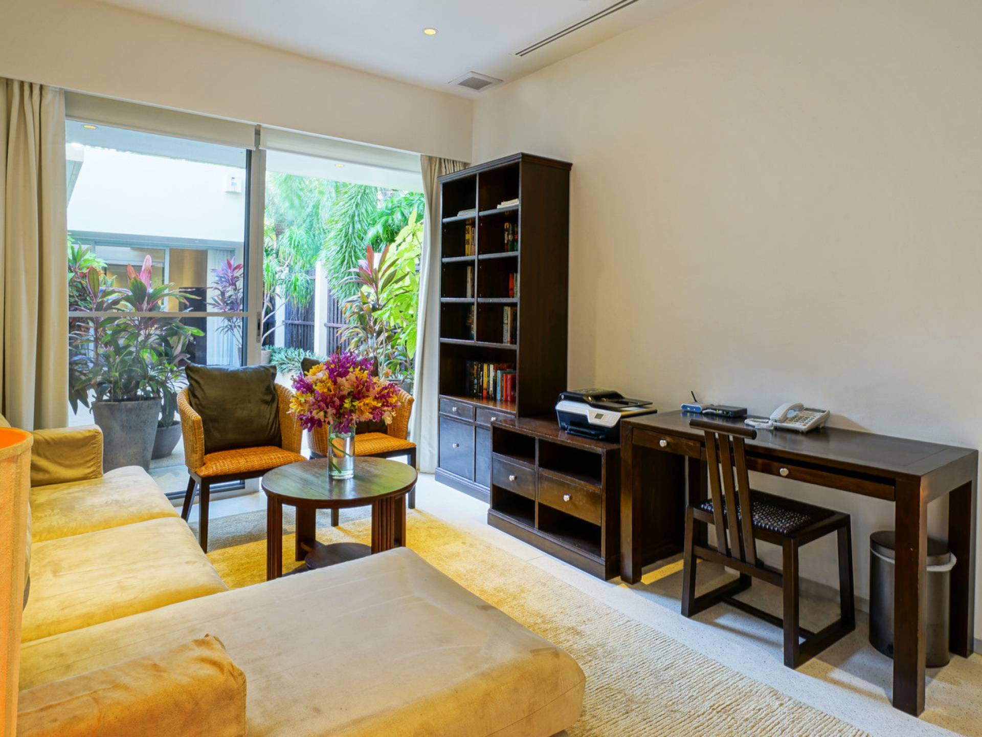 The spacious wooden pool deck offers a divine choice of spots to catch the sun’s rays, just a hop away from the 10-person jacuzzi. Towering fan palms and a rich variety of tropical garden plants create a vivid green landscape and a natural border that keep the villa ultra private and secure.