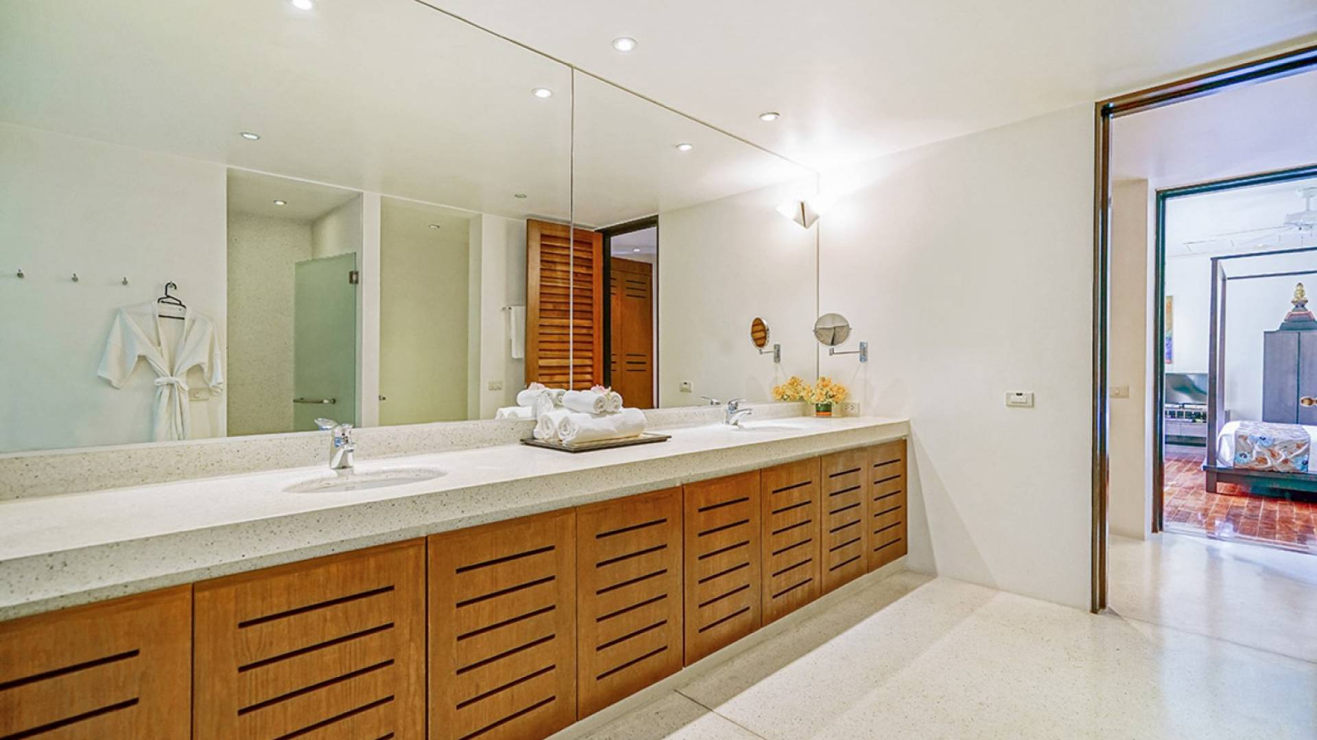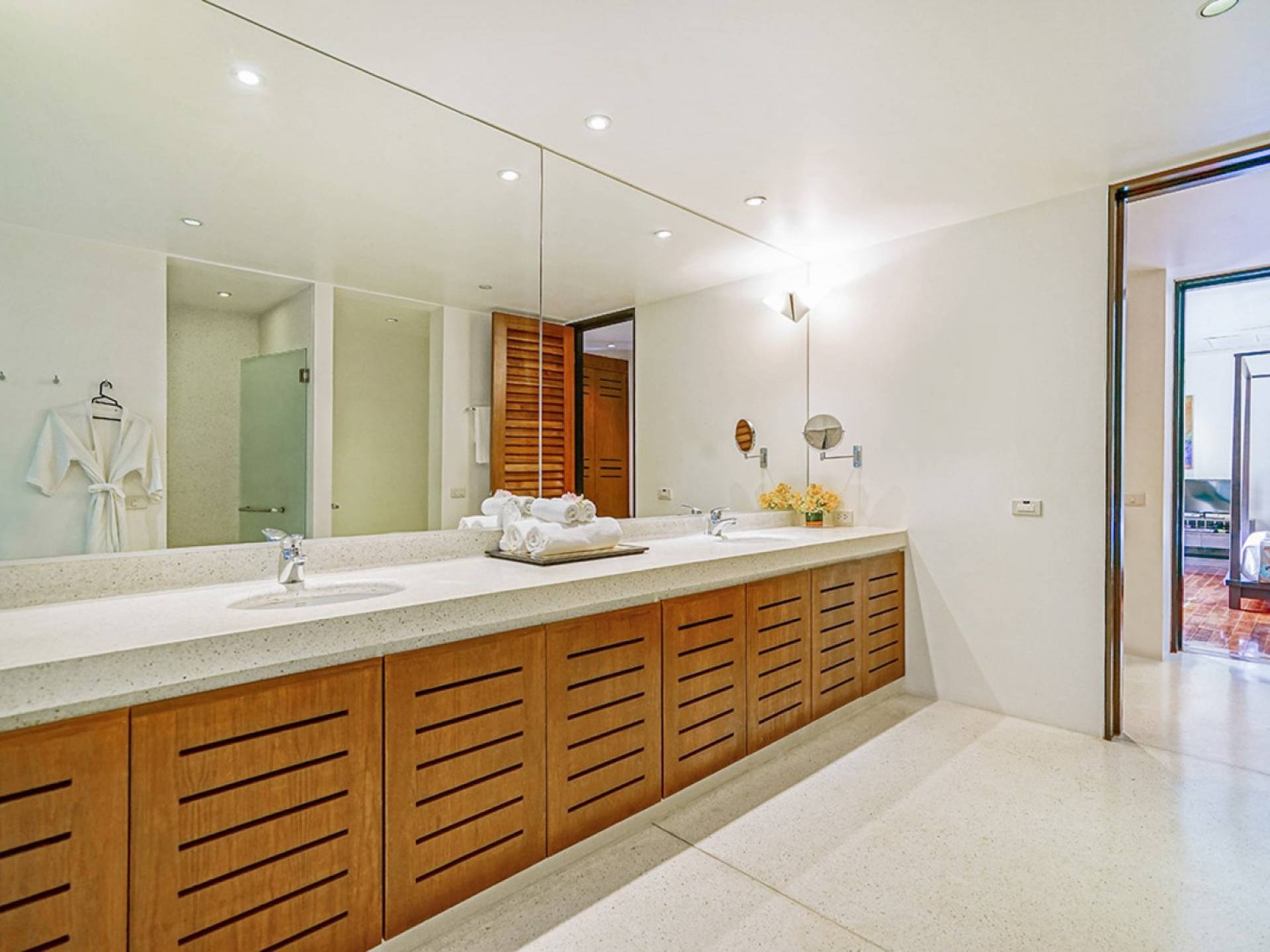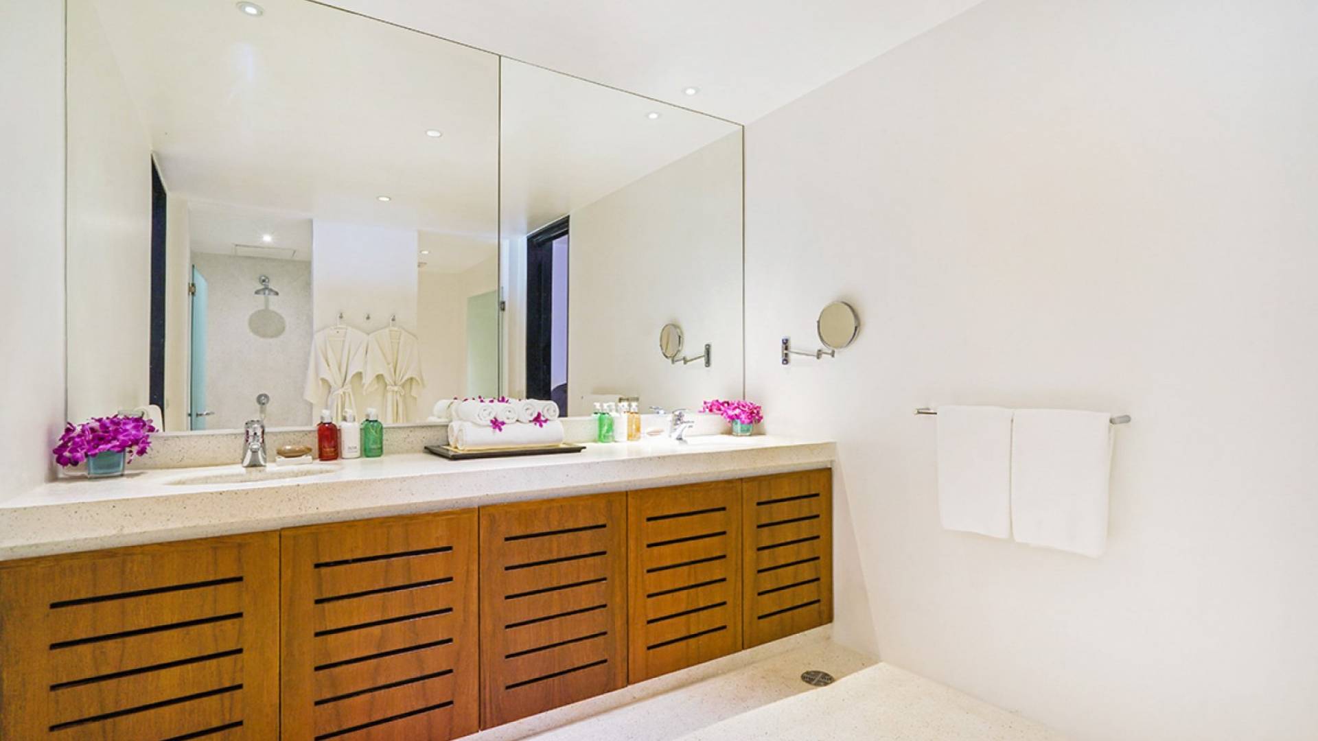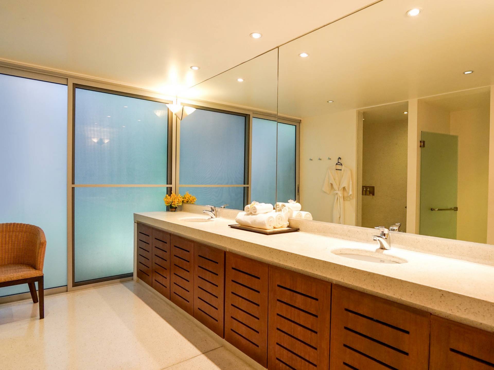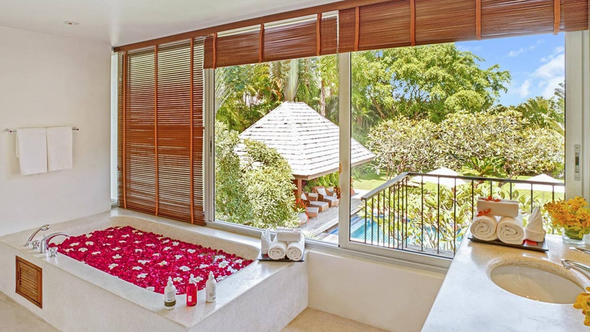 The spacious wooden pool deck offers a divine choice of spots to catch the sun’s rays, just a hop away from the 10-person jacuzzi. Towering fan palms and a rich variety of tropical garden plants create a vivid green landscape and a natural border that keep the villa ultra private and secure.