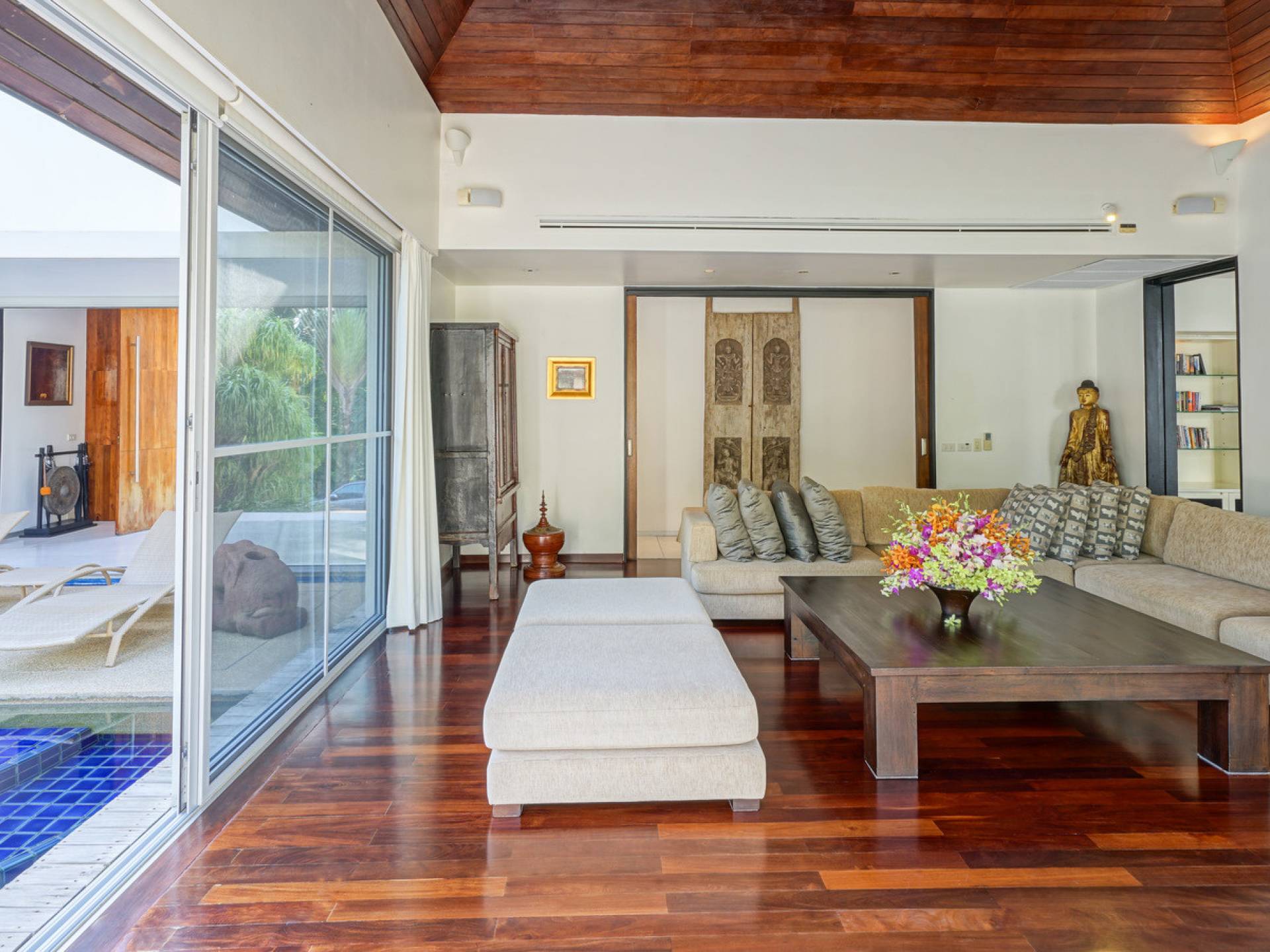 A sense of majesty ensues from the moment you arrive at Villa Samakee Phuket. Entering through its oversized teak front doors is to step inside another world; a true tropical escape. A long stretch of glimmering blue meets you on arrival: the 20 by 5-meter pool, where life in the villa revolves.