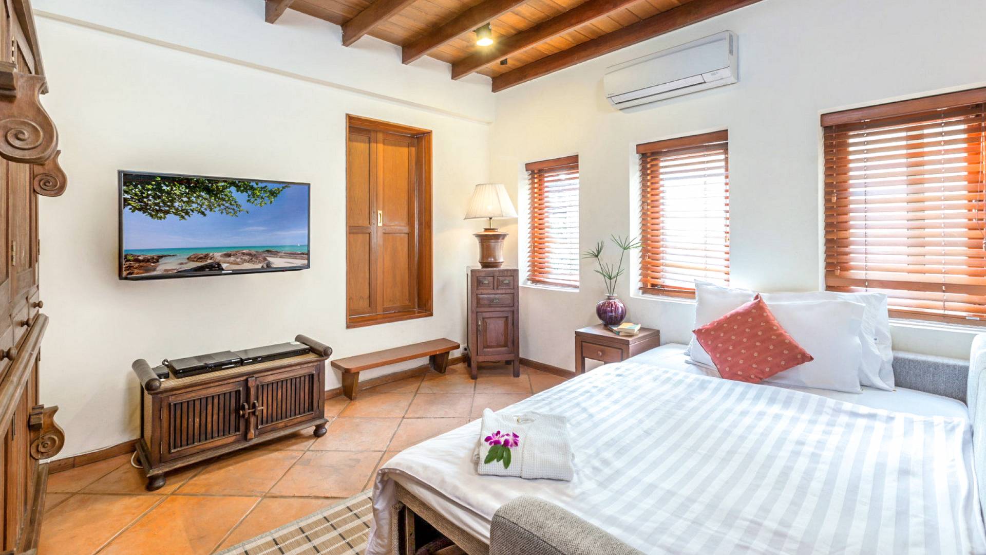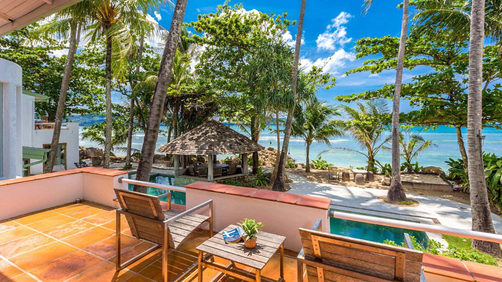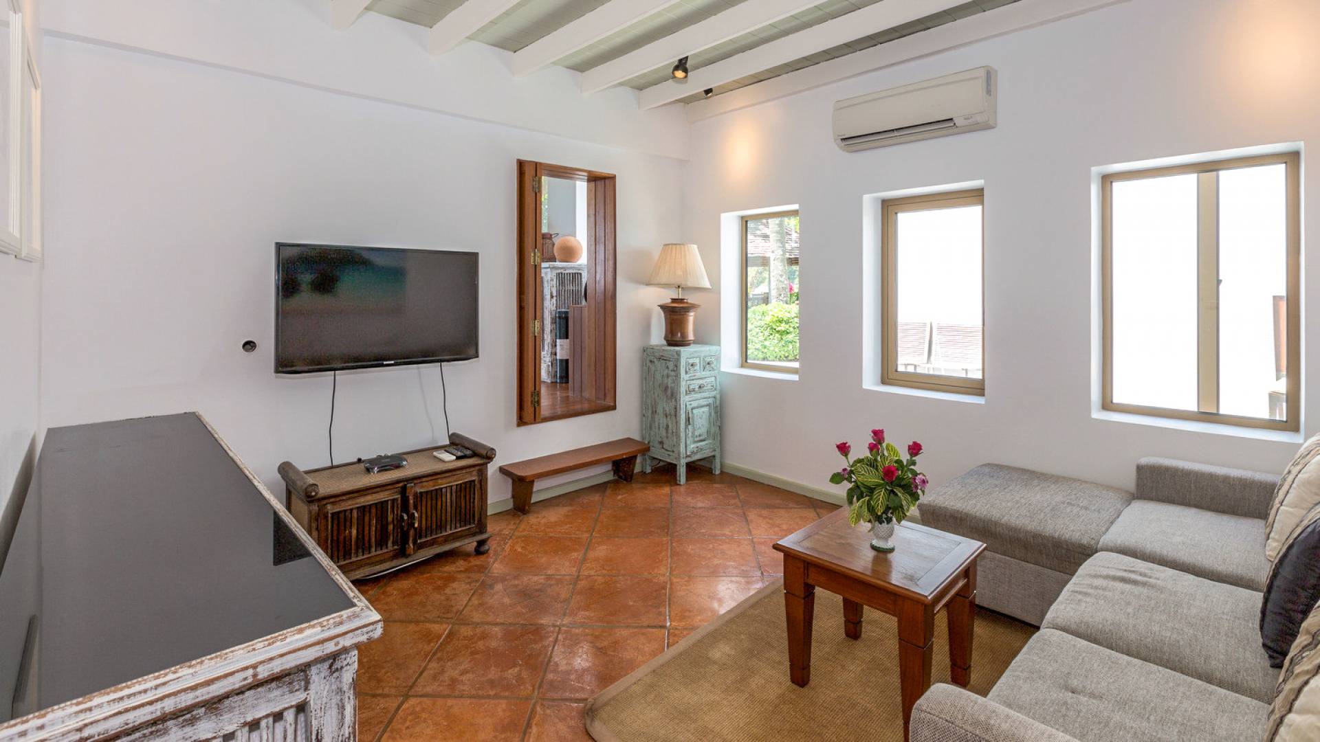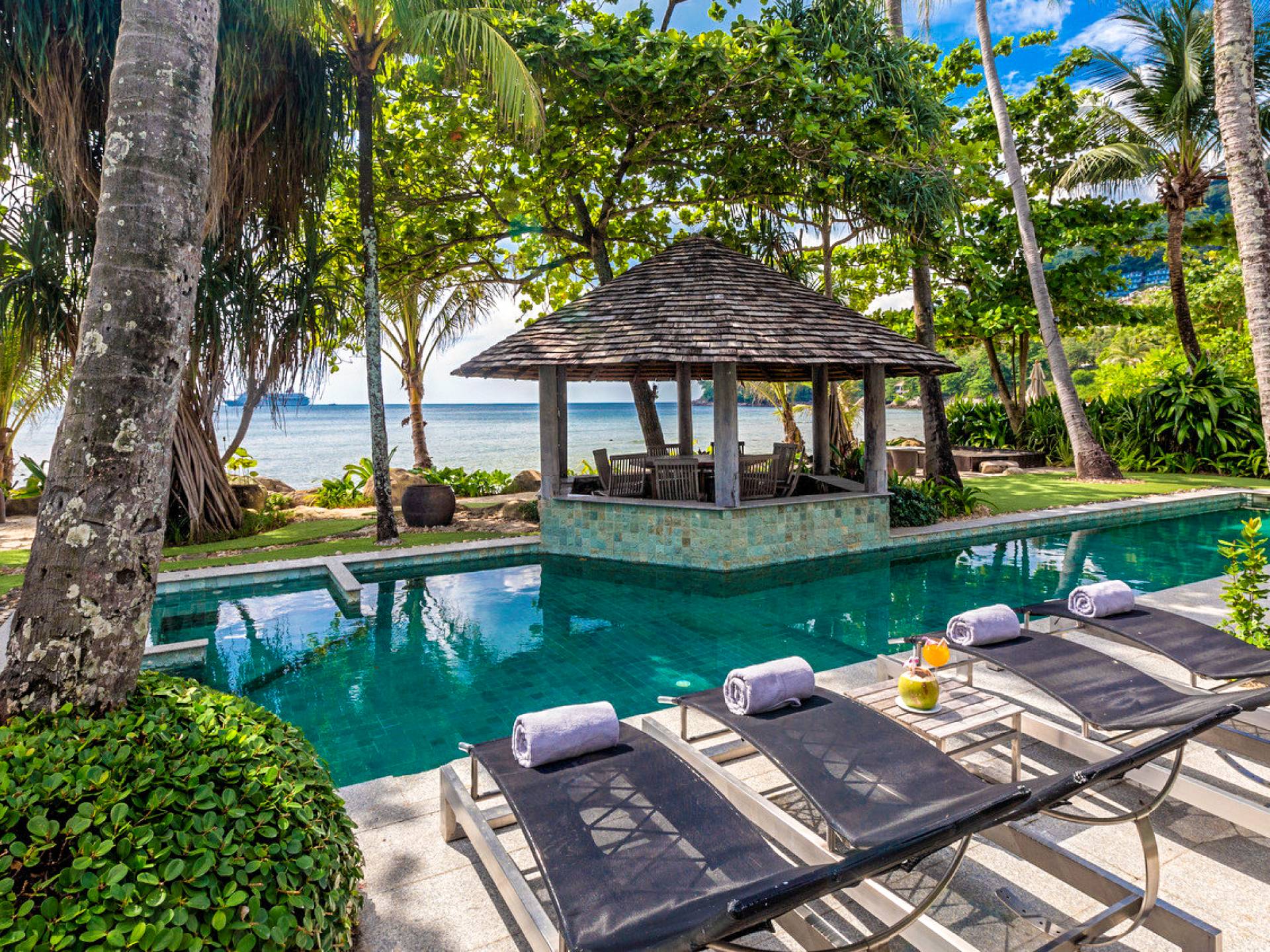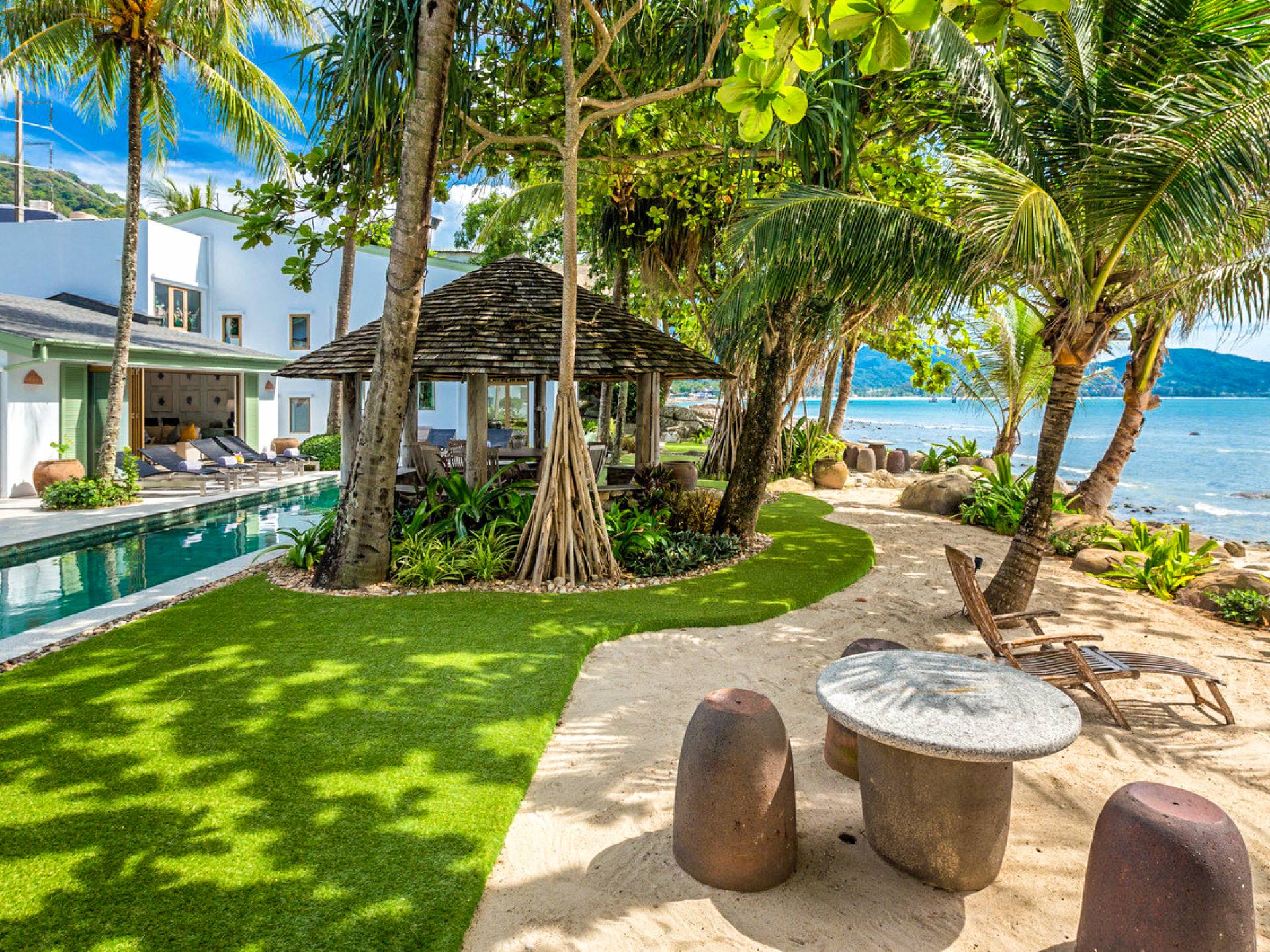 This villa features a beckoning ocean view on the outside with a beautiful and sizeable outdoor swimming pool where you can dive and swim for the best of your experiences around this villa. You can also sunbathe and relax around this villa in the large garden which features the daybeds located alongside the pool. There is also a room for lounging under the traditional sala which tends to house a dining situation and bedside dining options that are fitted with stone tables plus stools to give you a feel of tradition while enjoying your meals outside the villa.