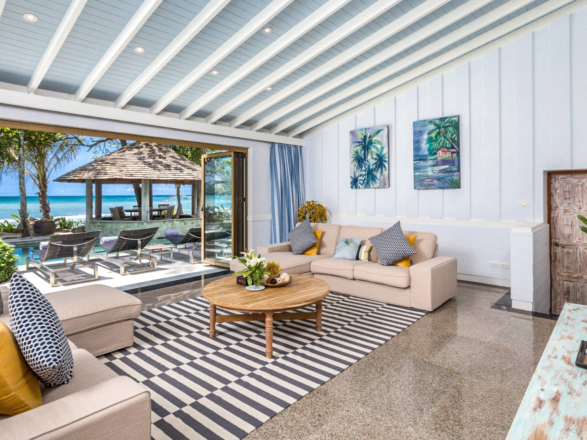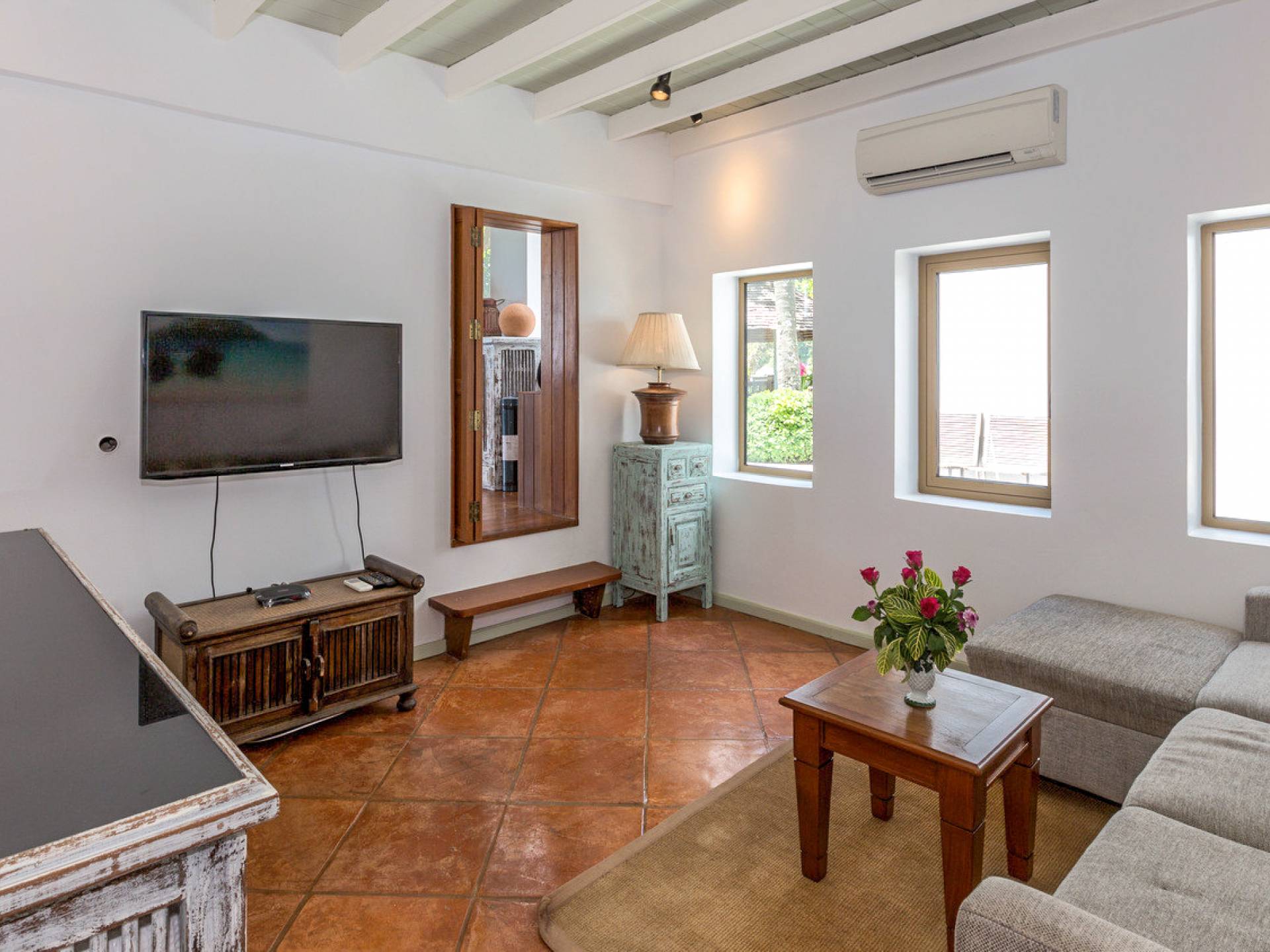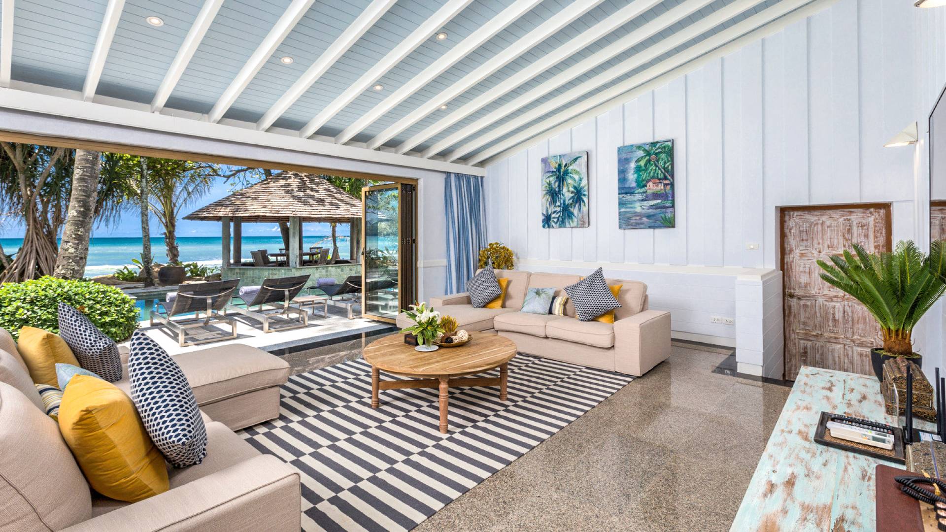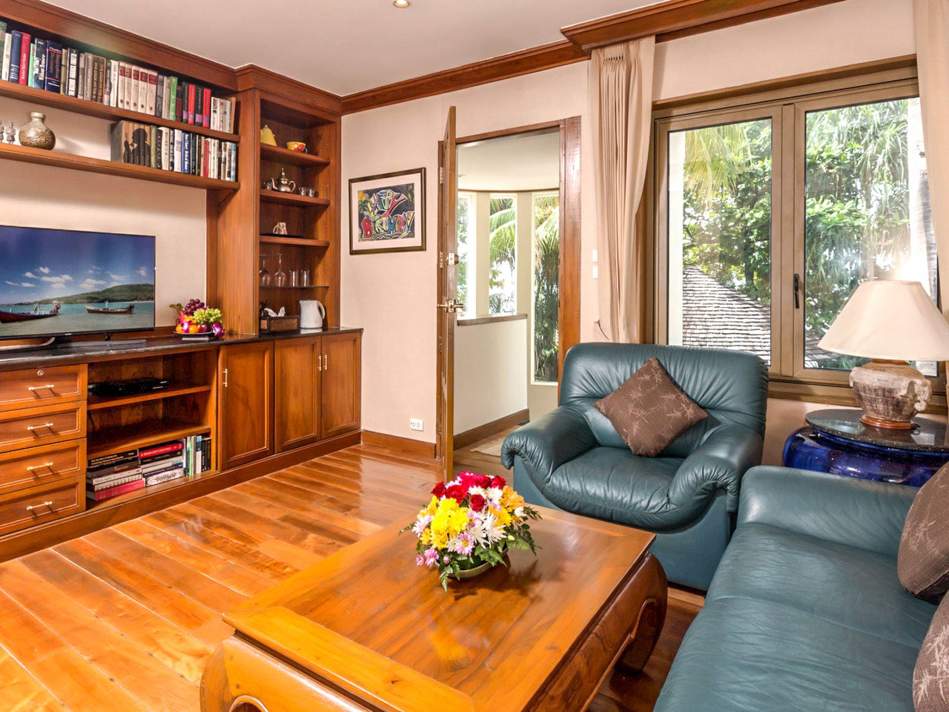 This villa features a beckoning ocean view on the outside with a beautiful and sizeable outdoor swimming pool where you can dive and swim for the best of your experiences around this villa. You can also sunbathe and relax around this villa in the large garden which features the daybeds located alongside the pool. There is also a room for lounging under the traditional sala which tends to house a dining situation and bedside dining options that are fitted with stone tables plus stools to give you a feel of tradition while enjoying your meals outside the villa.