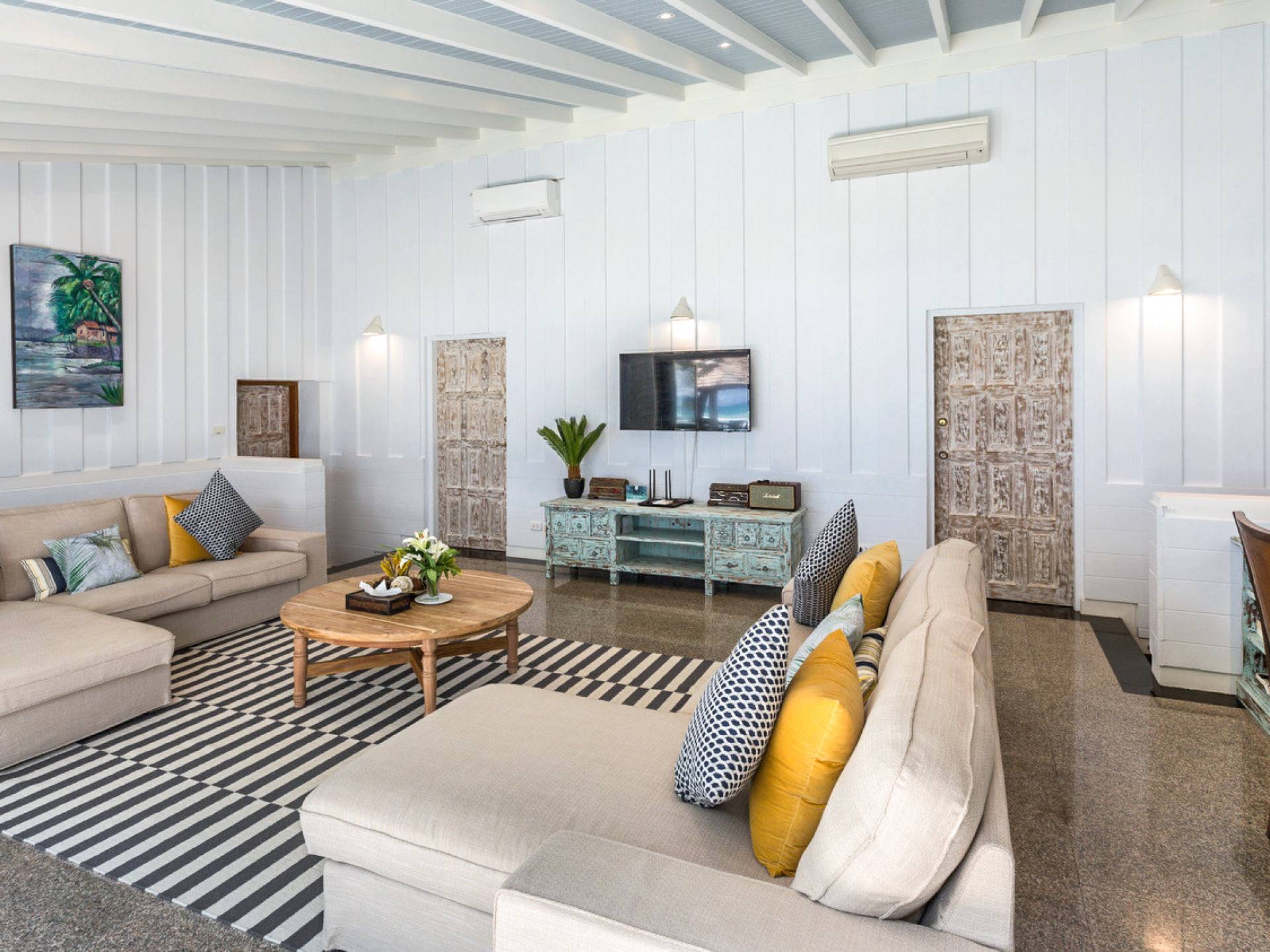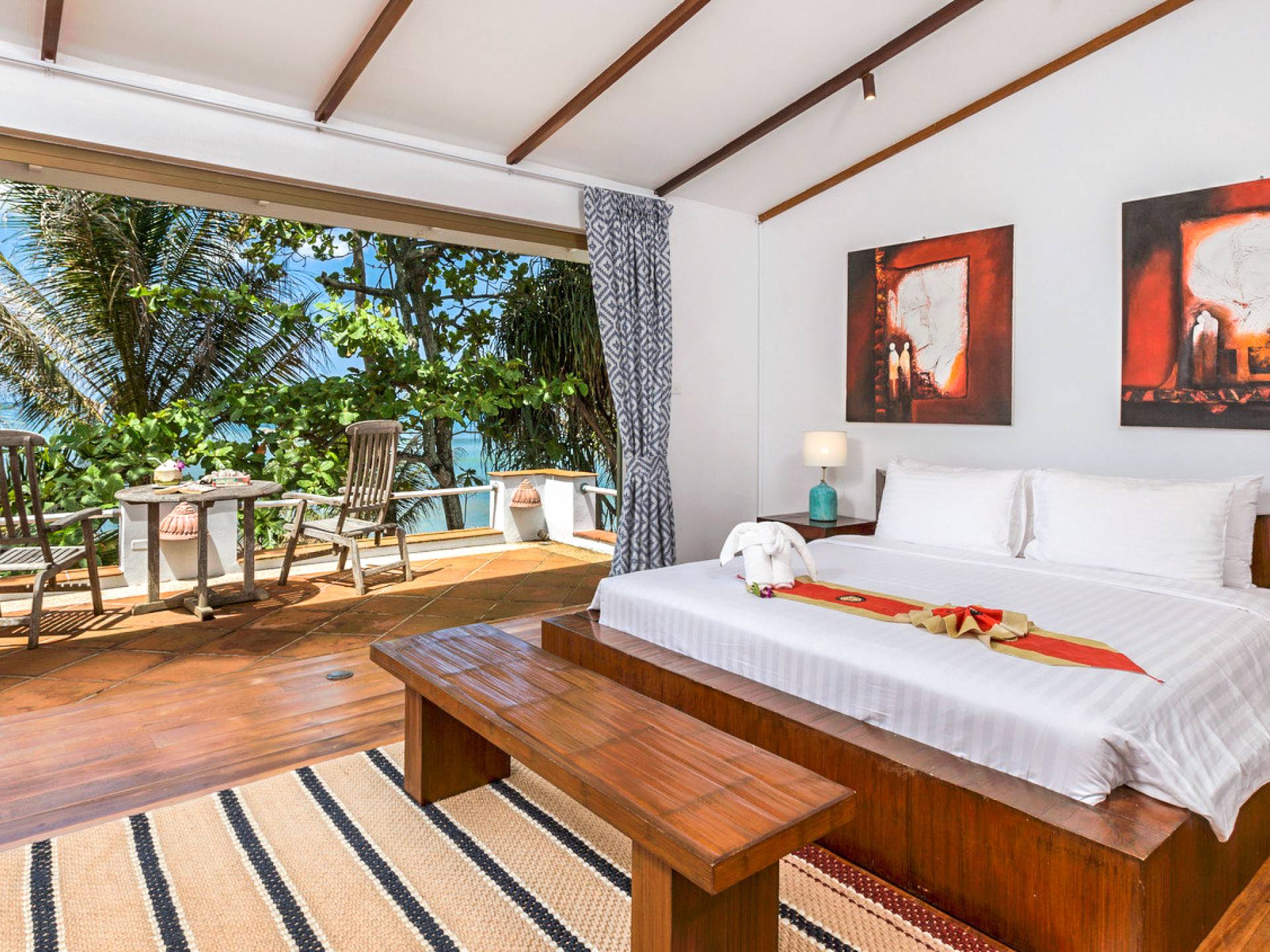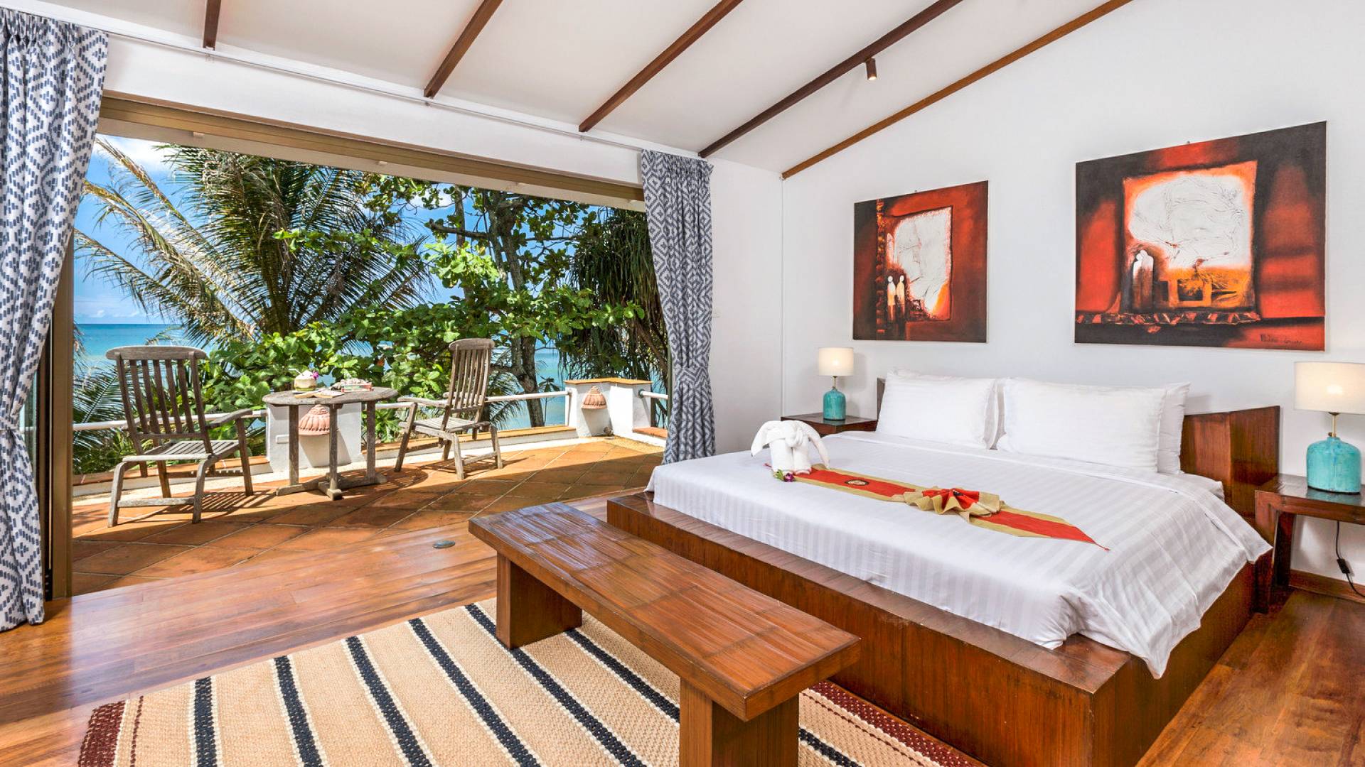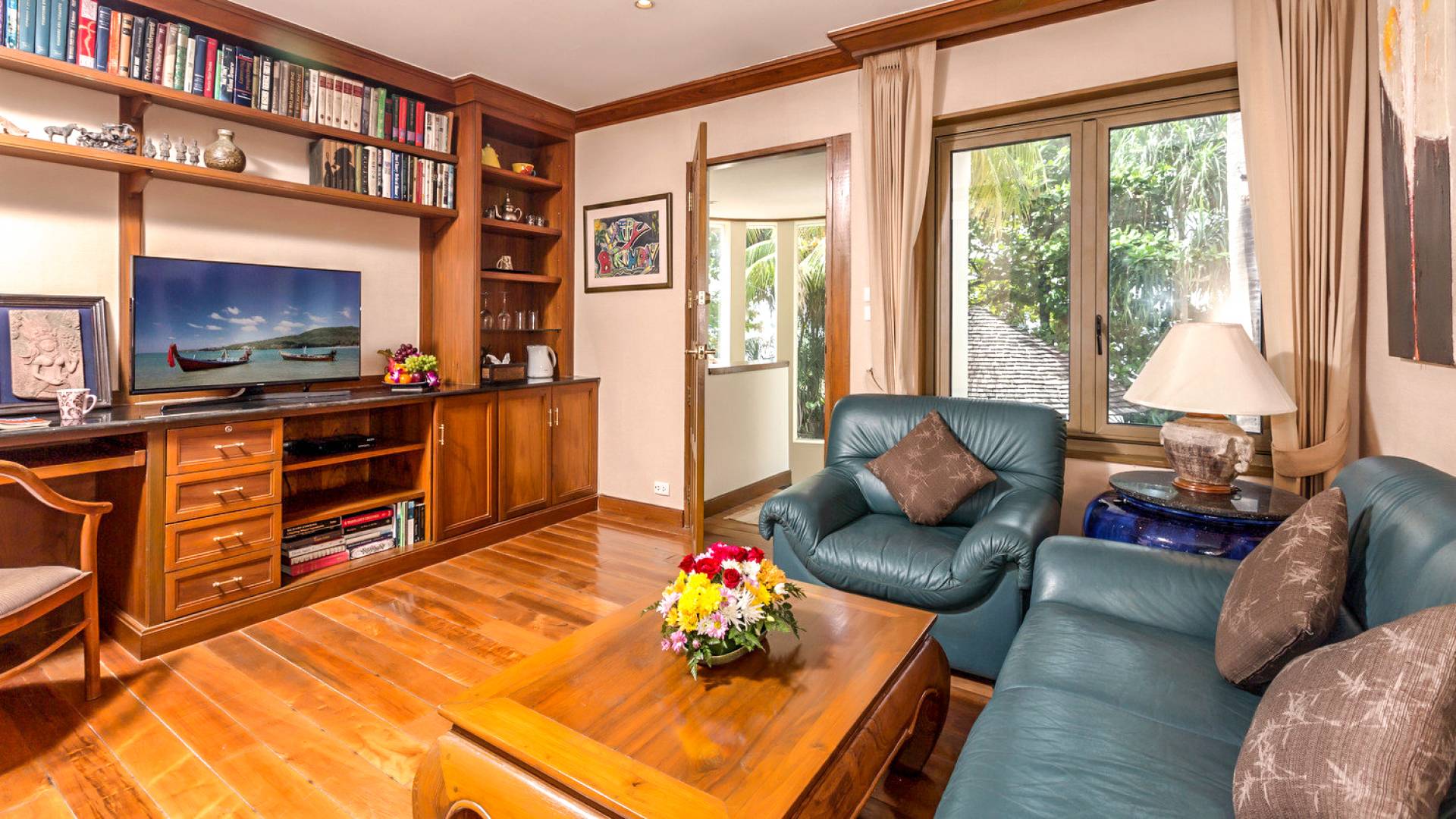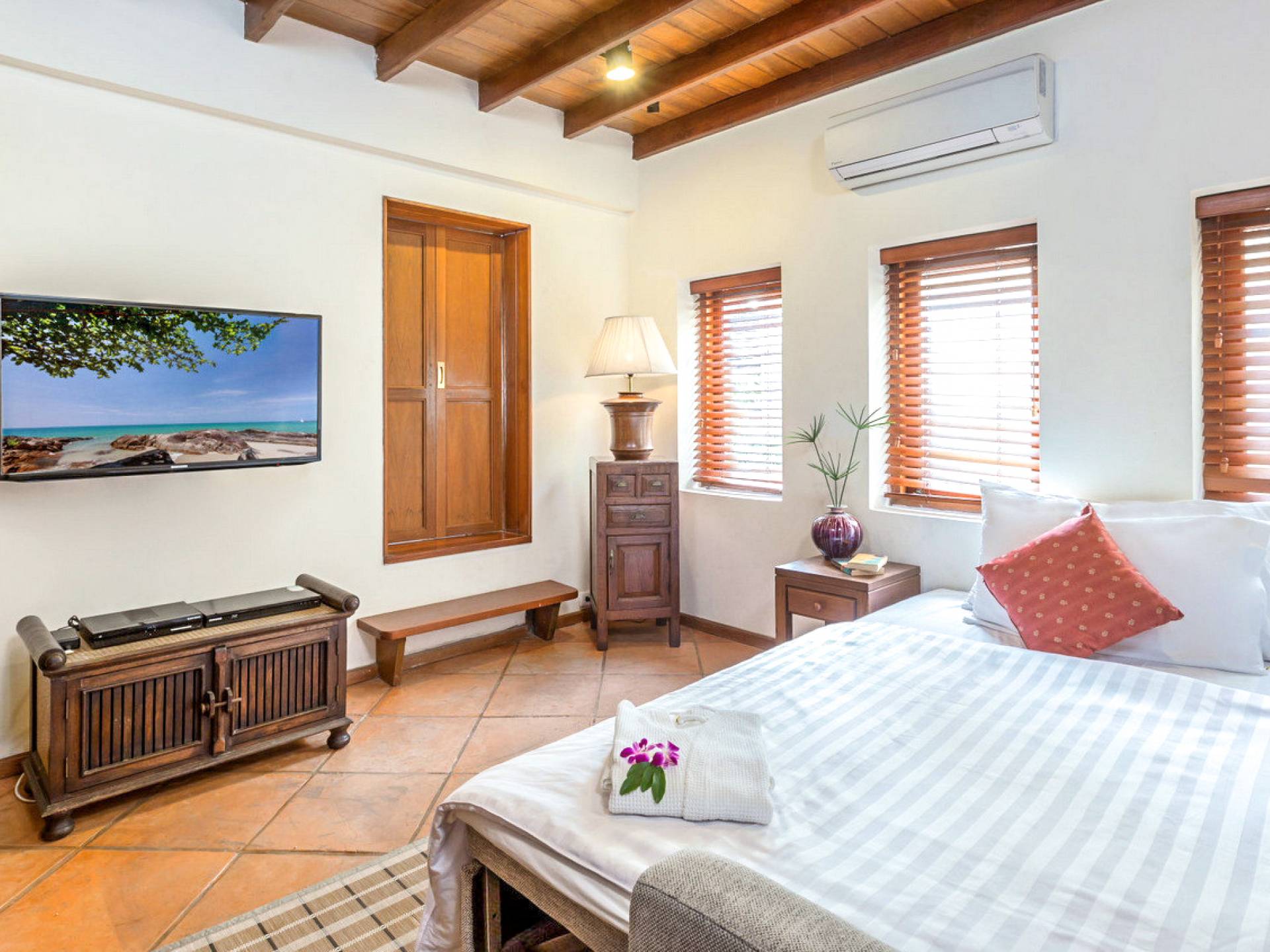 This villa features a beckoning ocean view on the outside with a beautiful and sizeable outdoor swimming pool where you can dive and swim for the best of your experiences around this villa. You can also sunbathe and relax around this villa in the large garden which features the daybeds located alongside the pool. There is also a room for lounging under the traditional sala which tends to house a dining situation and bedside dining options that are fitted with stone tables plus stools to give you a feel of tradition while enjoying your meals outside the villa.