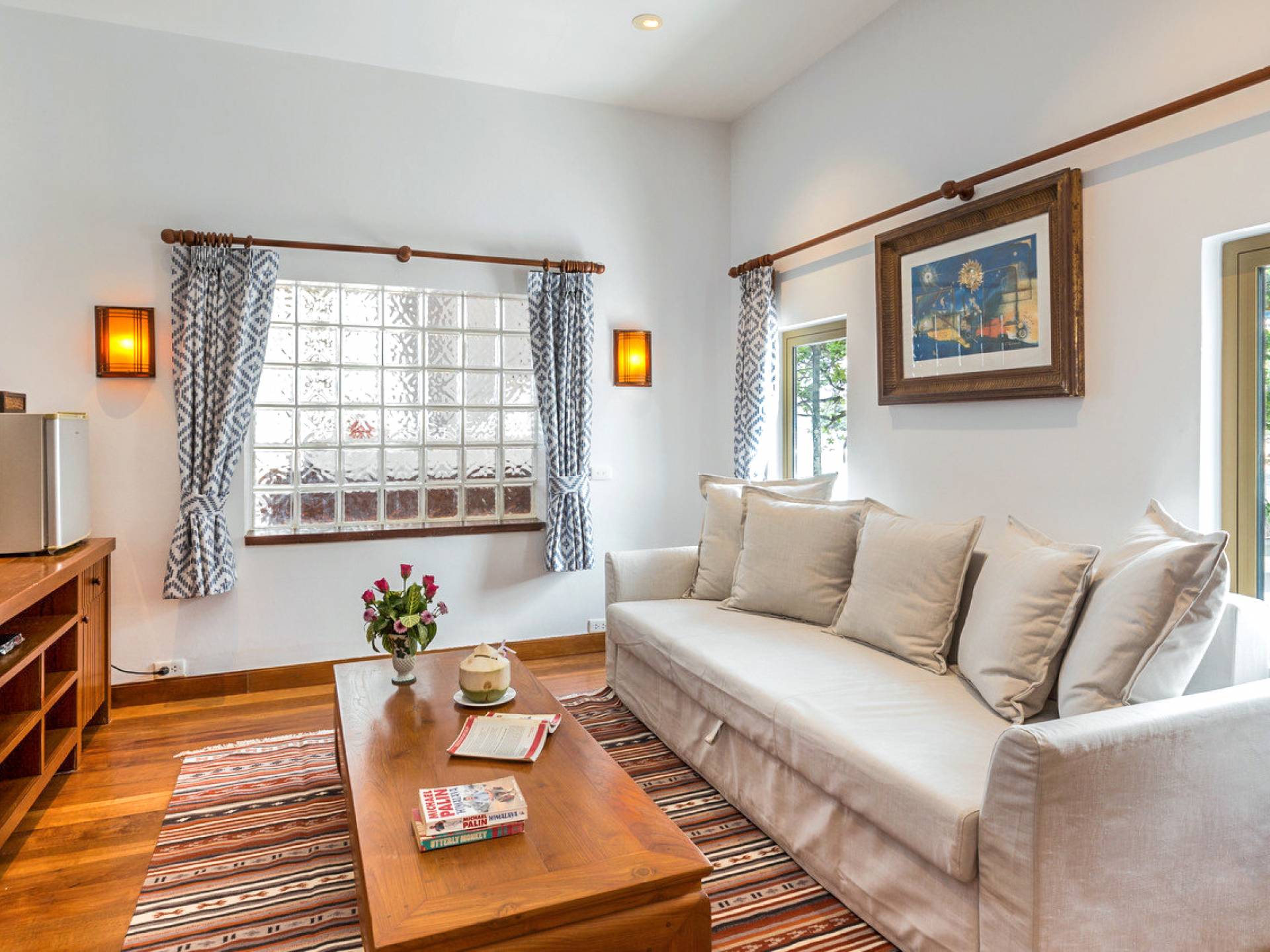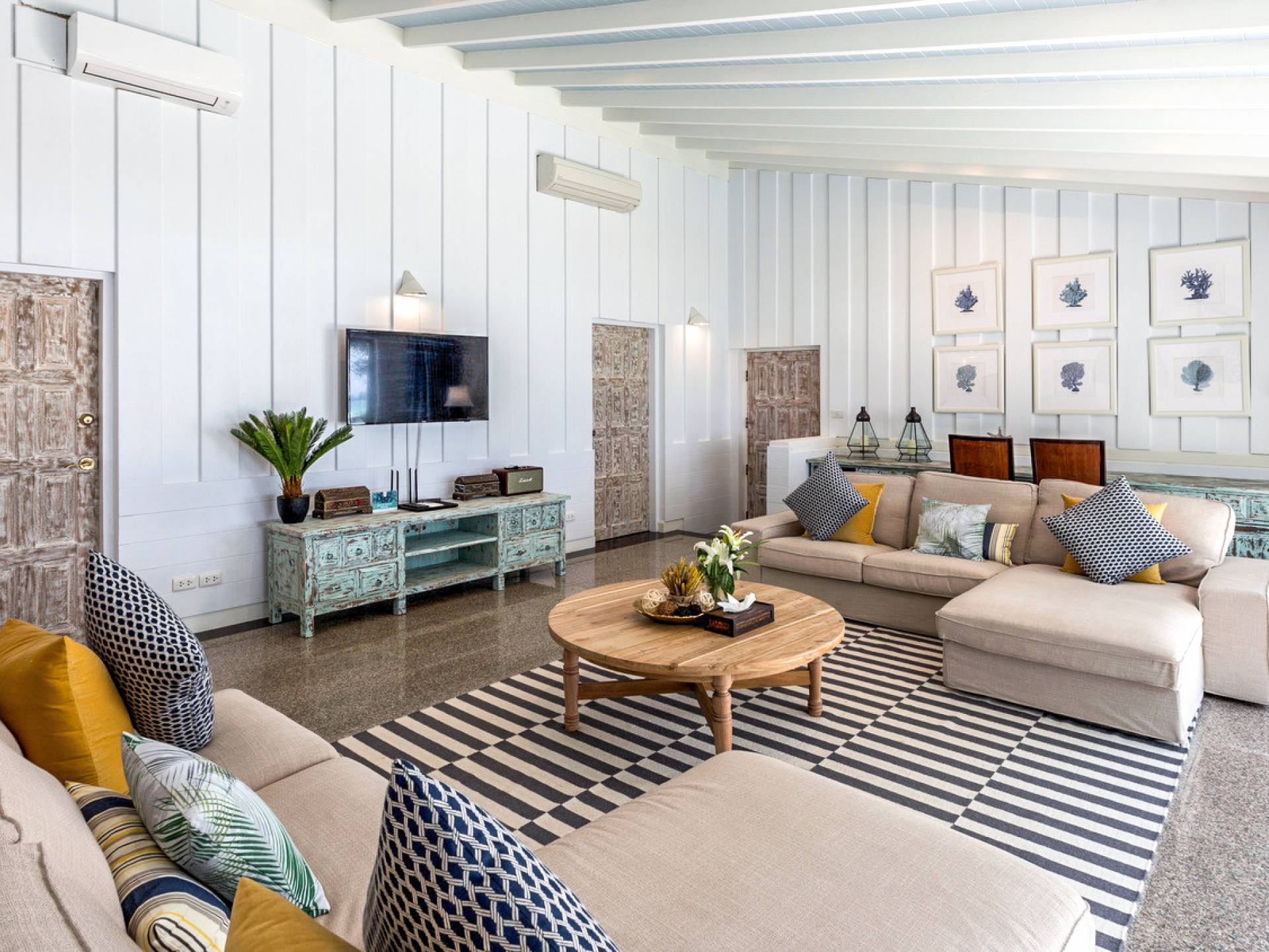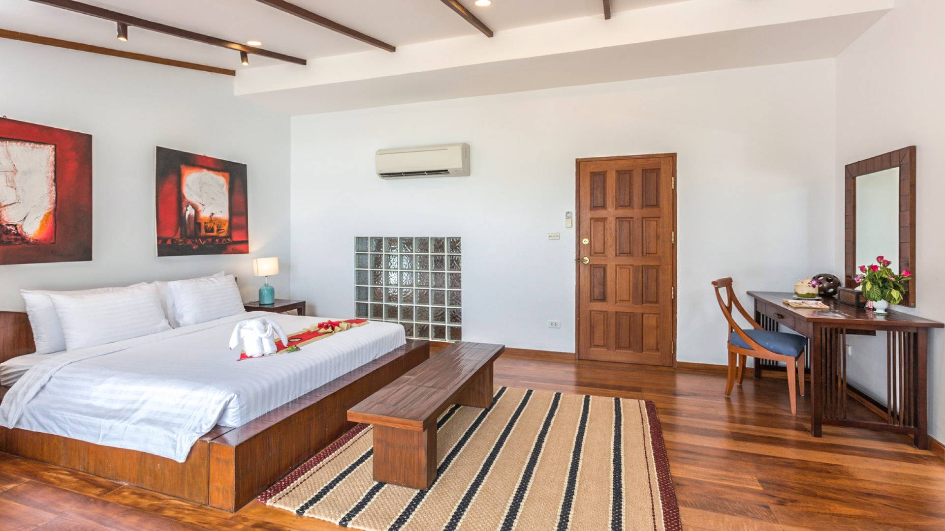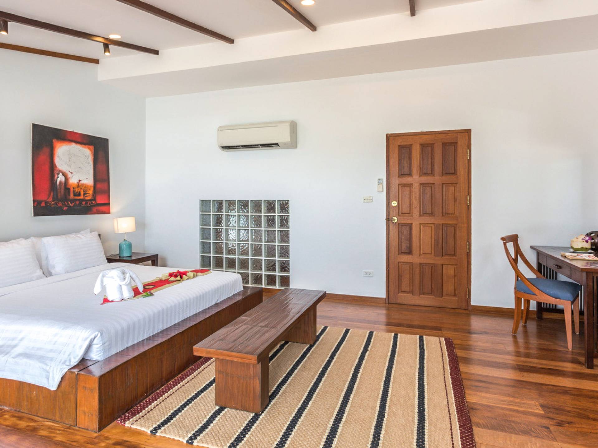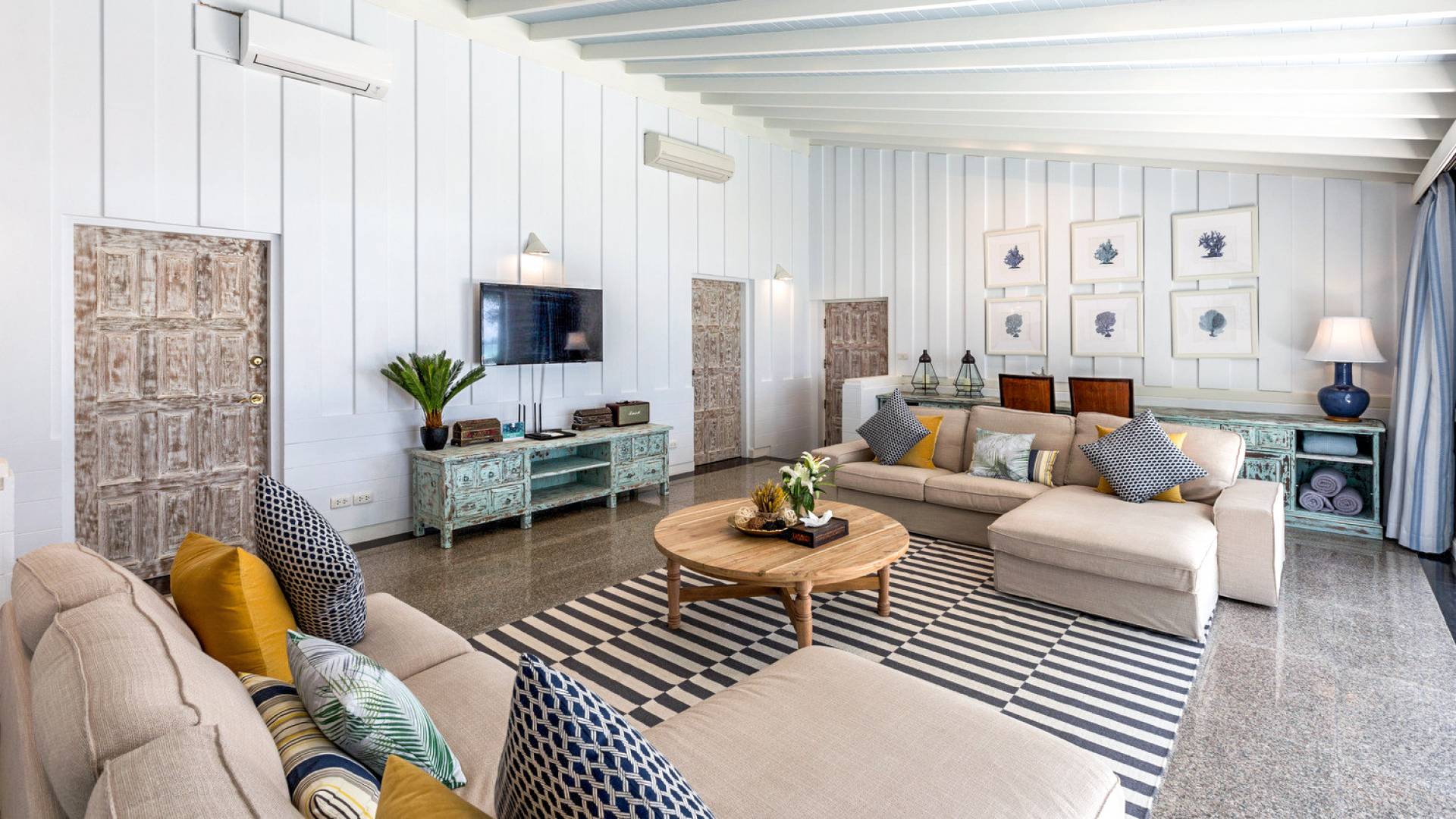 This villa features a beckoning ocean view on the outside with a beautiful and sizeable outdoor swimming pool where you can dive and swim for the best of your experiences around this villa. You can also sunbathe and relax around this villa in the large garden which features the daybeds located alongside the pool. There is also a room for lounging under the traditional sala which tends to house a dining situation and bedside dining options that are fitted with stone tables plus stools to give you a feel of tradition while enjoying your meals outside the villa.