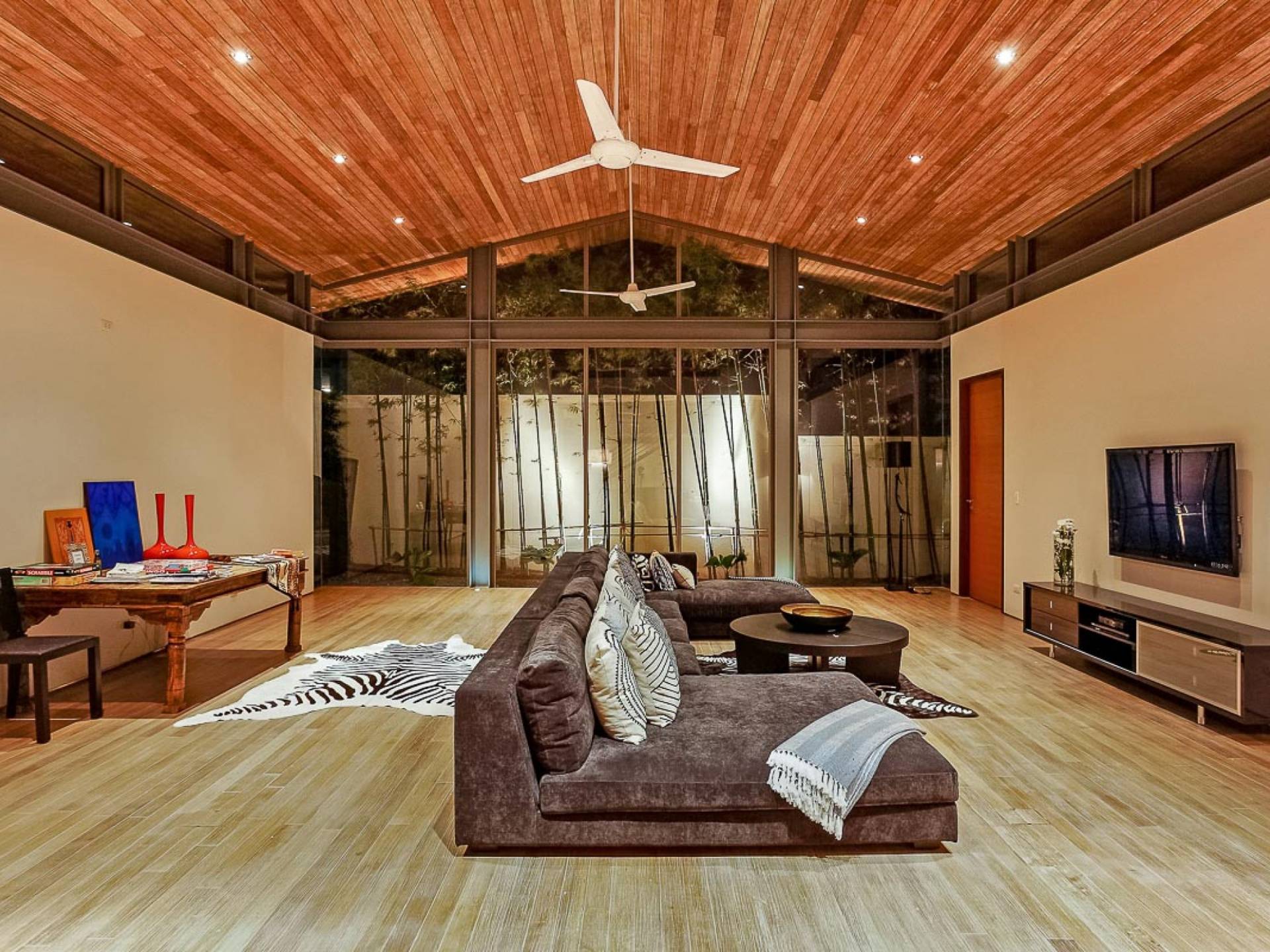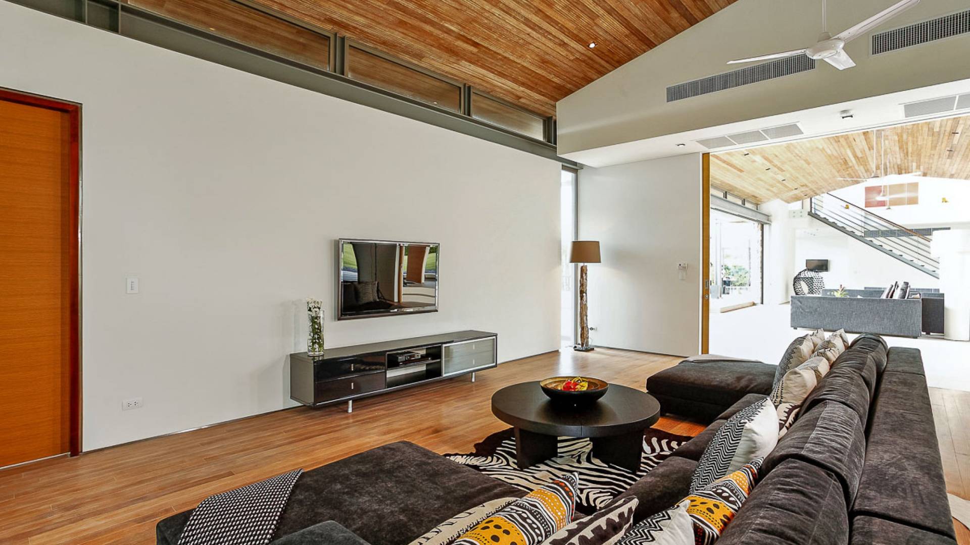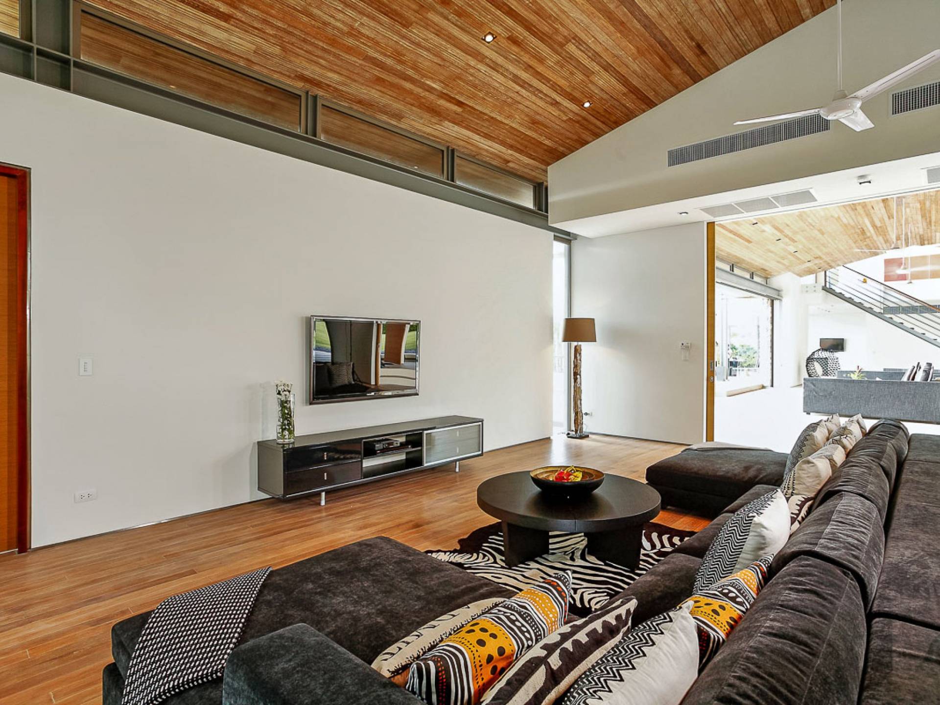 Villa Essenza’s living areas are thoughtfully designed to blend its sleek interior spaces with the exquisite tropical surrounds, allowing for ease of movement and airflow. Centrally positioned under a peaked roof is the living room, furnished with a sumptuous sofa for relaxing in cool comfort while gazing across the pool and sea. The room opens completely to the pool terrace in front and the reflecting pool behind for a breezy indoor-outdoor ambiance, or it can be closed and cooled with air conditioning. The living area flows to the dining room and modern guest kitchen where oversized sliding glass doors on three sides let the tropical sun light up the room with a magical glow. Festive meals can be enjoyed at the grand 14-seat dining table, while the breakfast bar offers a more casual place to dine. The TV room adjacent to the living area is a cozy spot for watching movies and can be sealed off by sliding wooden doors for added privacy.