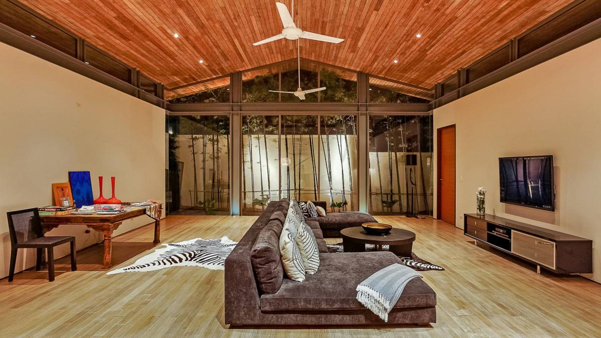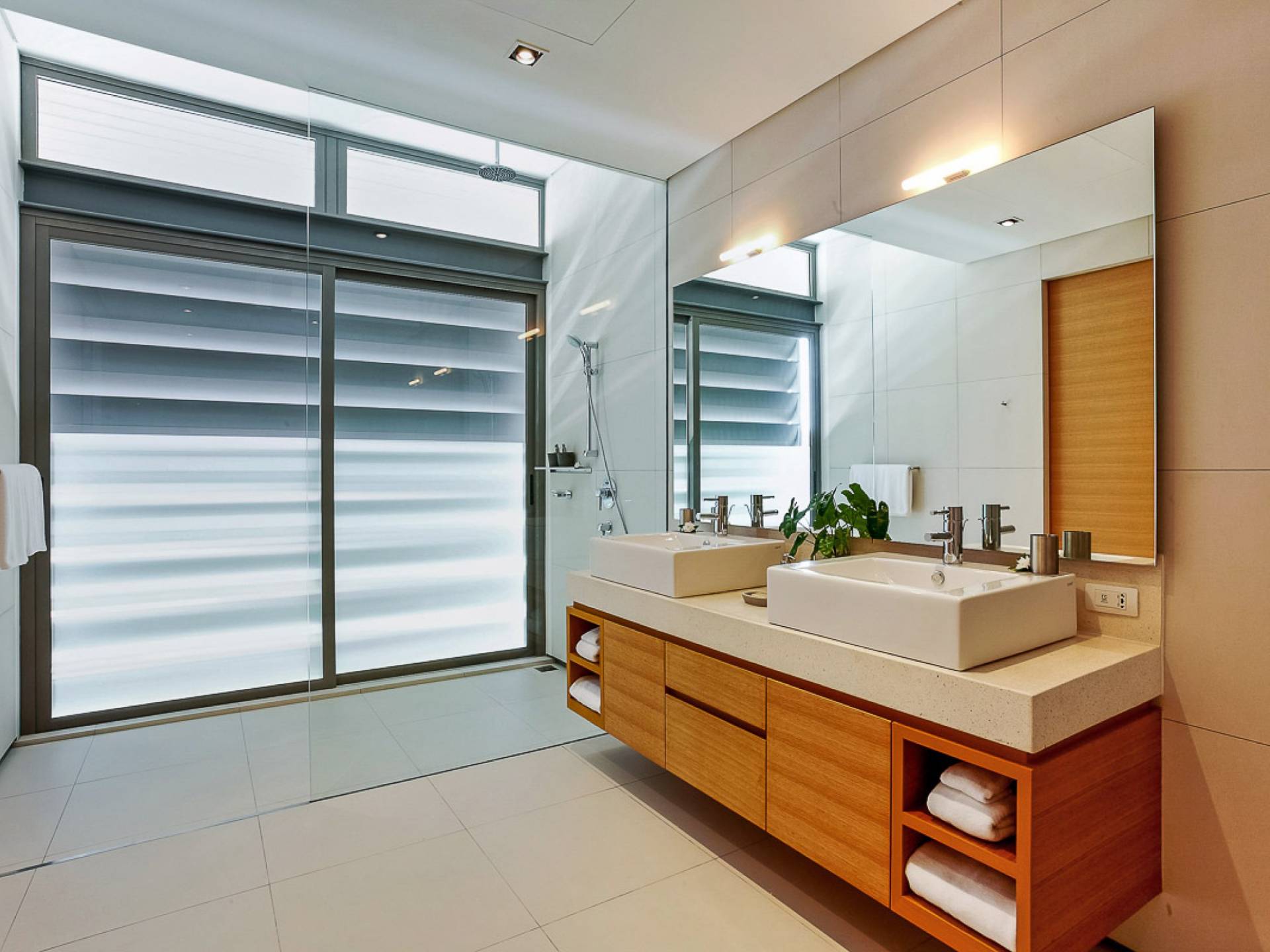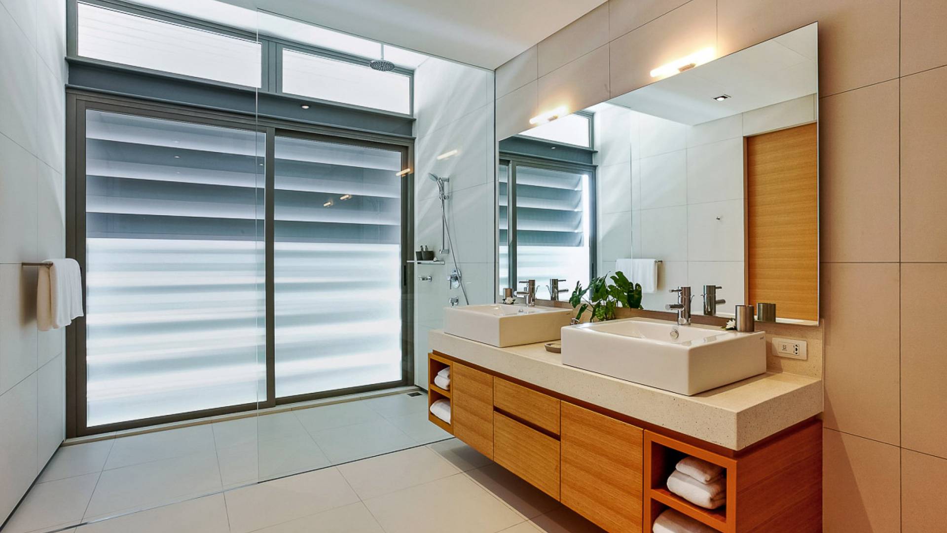 Villa Essenza’s living areas are thoughtfully designed to blend its sleek interior spaces with the exquisite tropical surrounds, allowing for ease of movement and airflow. Centrally positioned under a peaked roof is the living room, furnished with a sumptuous sofa for relaxing in cool comfort while gazing across the pool and sea. The room opens completely to the pool terrace in front and the reflecting pool behind for a breezy indoor-outdoor ambiance, or it can be closed and cooled with air conditioning. The living area flows to the dining room and modern guest kitchen where oversized sliding glass doors on three sides let the tropical sun light up the room with a magical glow. Festive meals can be enjoyed at the grand 14-seat dining table, while the breakfast bar offers a more casual place to dine. The TV room adjacent to the living area is a cozy spot for watching movies and can be sealed off by sliding wooden doors for added privacy.
