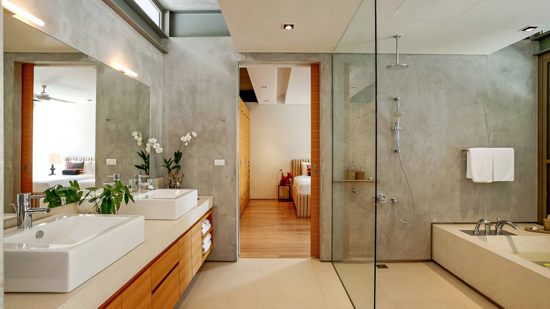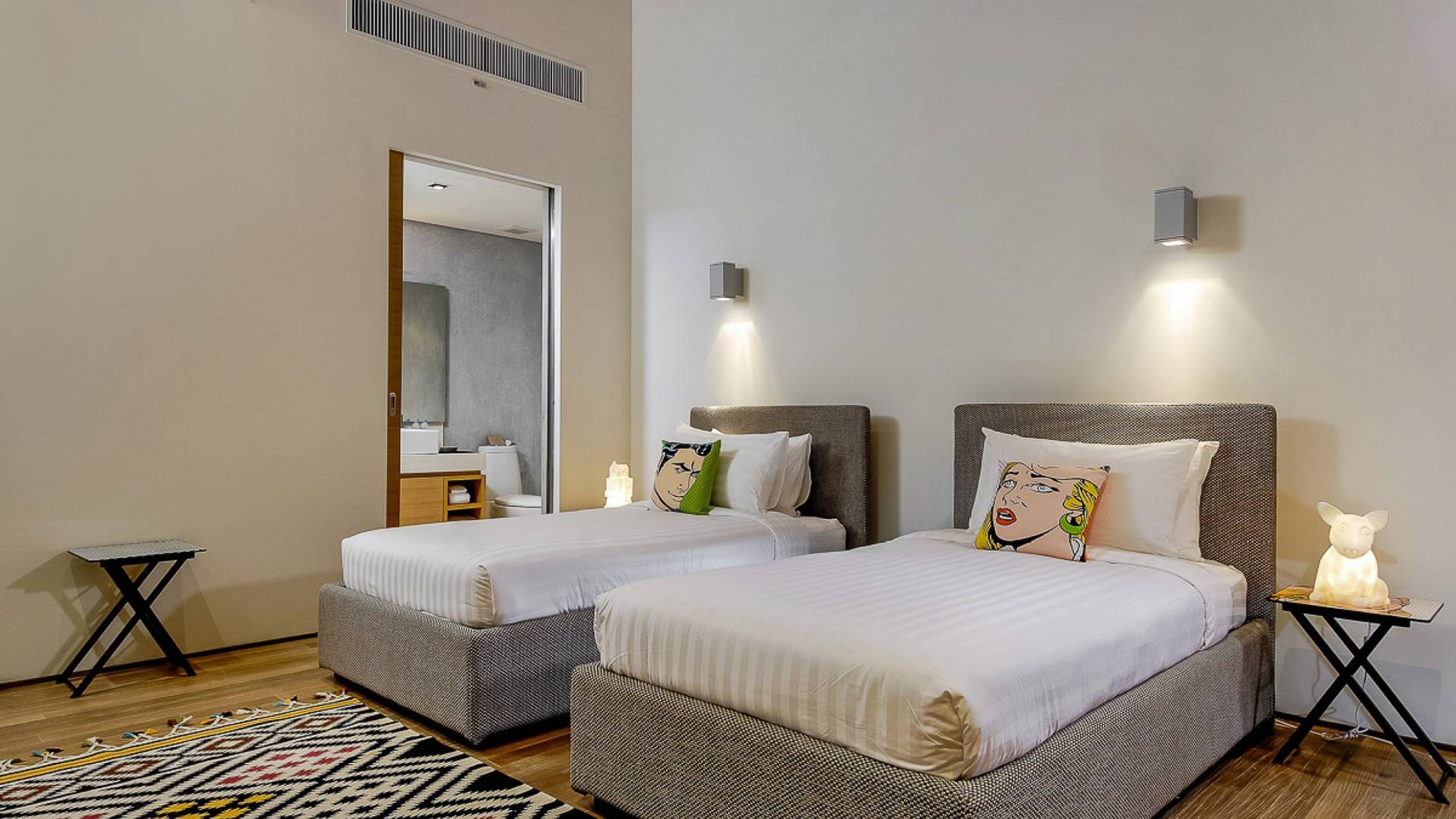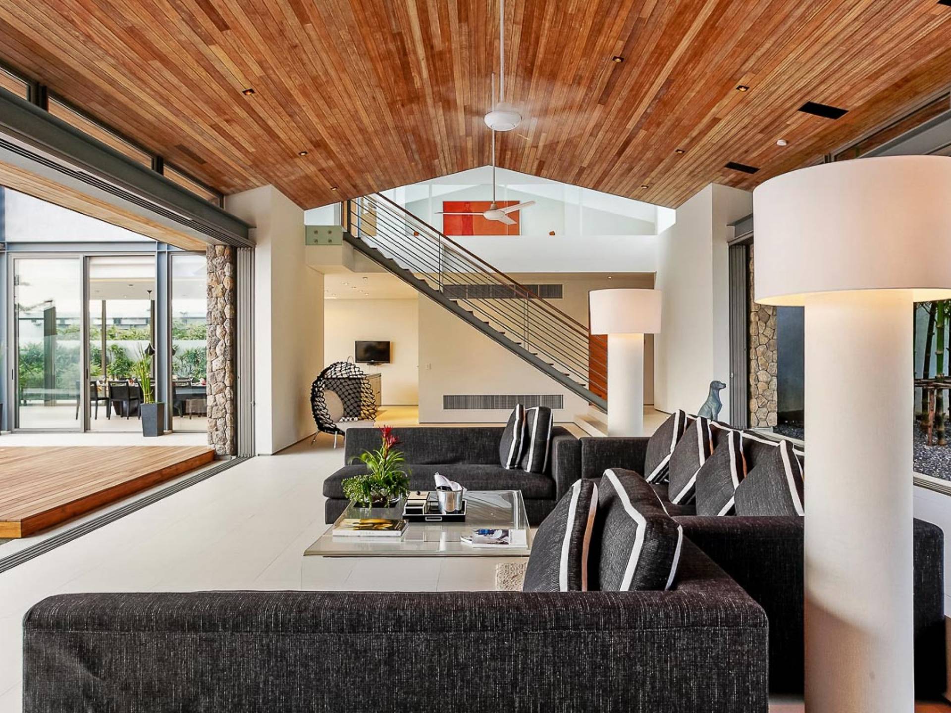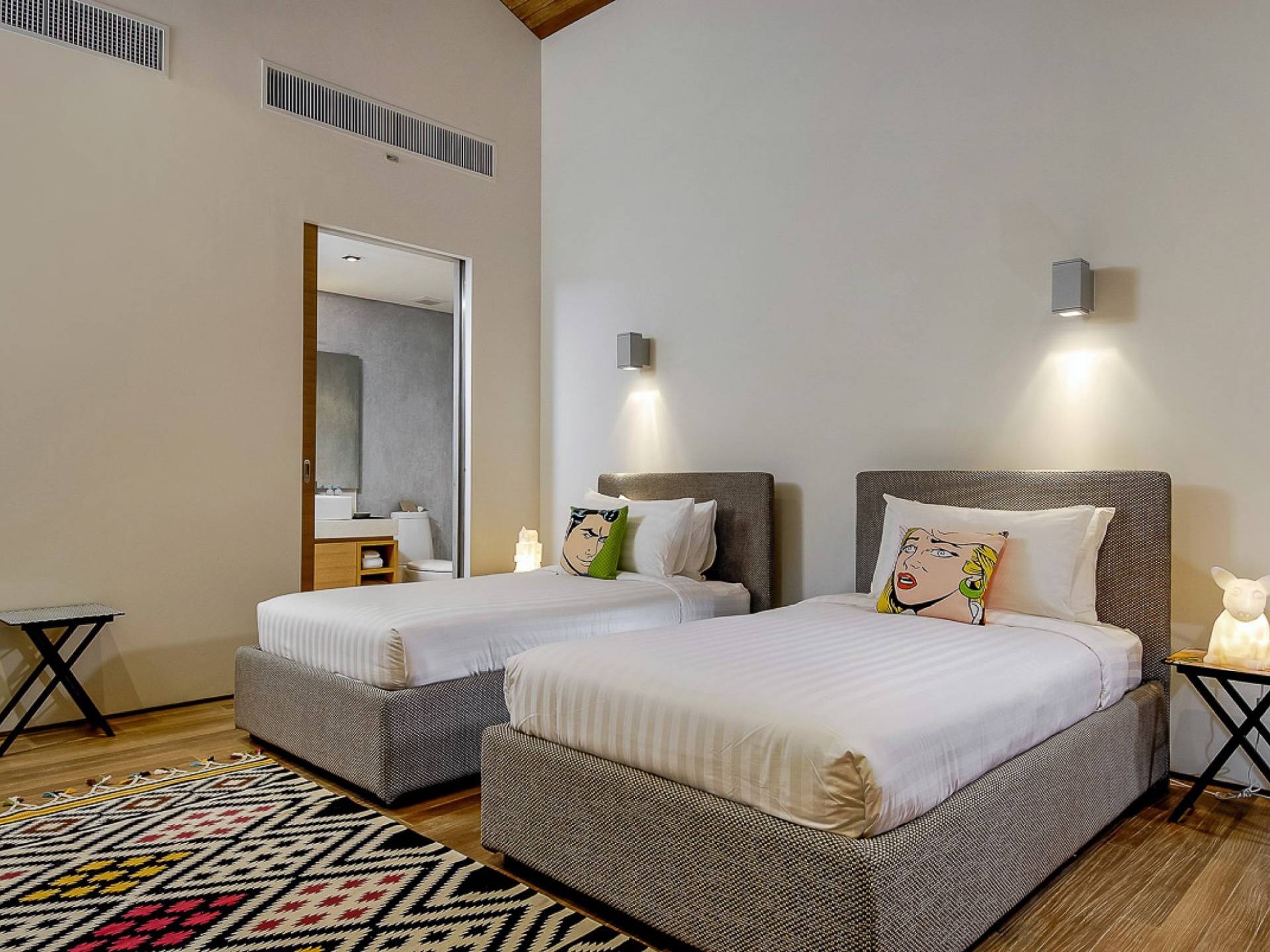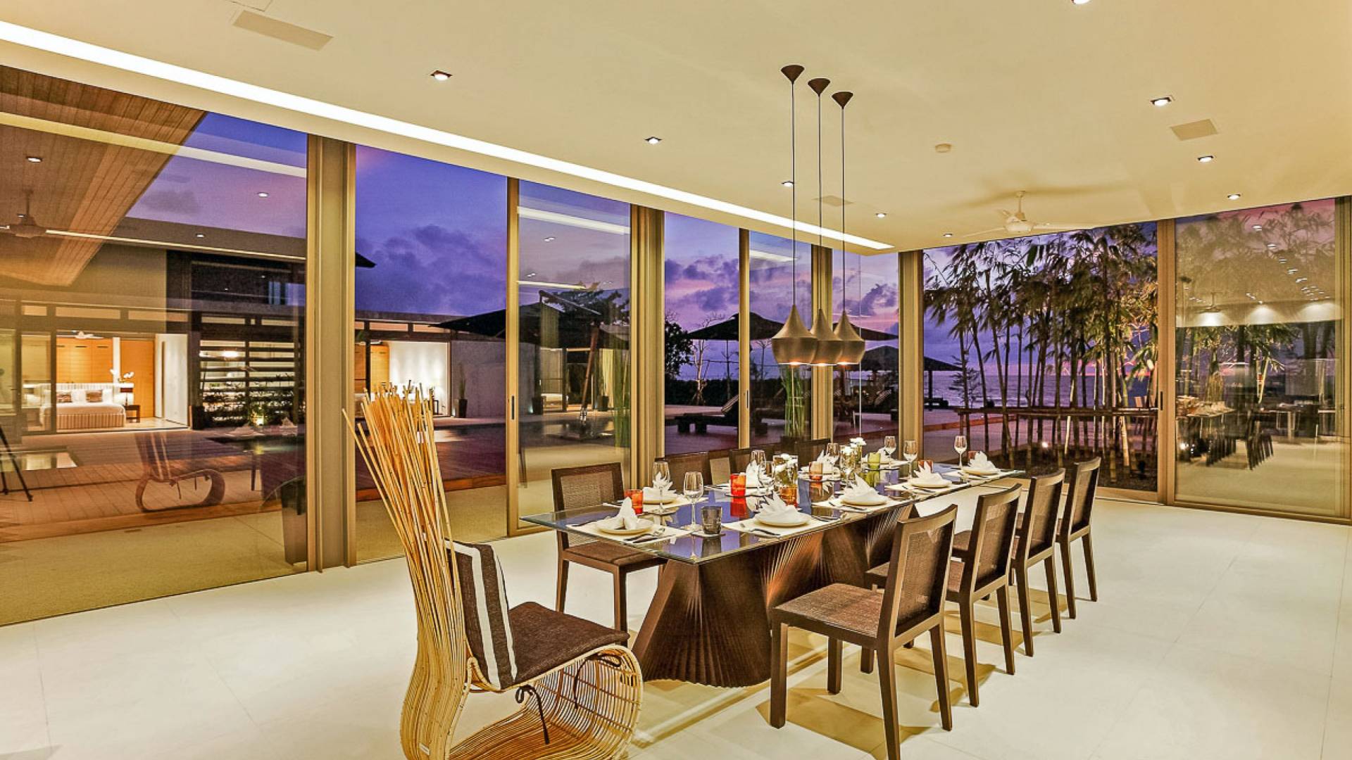 Villa Essenza is fitted with shimmering glass walls, arranged in a U-shape that brings focus to the central pool and the stunning sea views. Set just behind the private pool, Essenza’s open-plan living area features floor-to-ceiling glass doors that slide open fully to let the ocean breezes flow through. All areas of the villa – indoors and outdoors – are accessed via this pivotal space. On one side, the TV room leads to the villa’s single-store wing with three bedrooms including a master suite that extends along the pool’s length towards the sea. The dining area and guest kitchen are on the ground floor of the two-floor wing opposite, with a second master suite and two guest bedrooms upstairs.