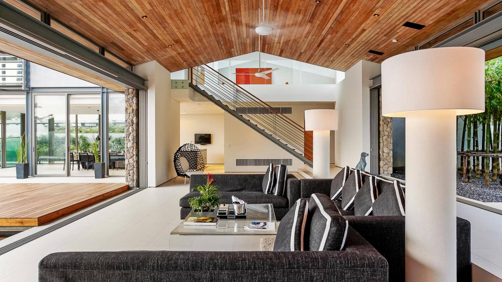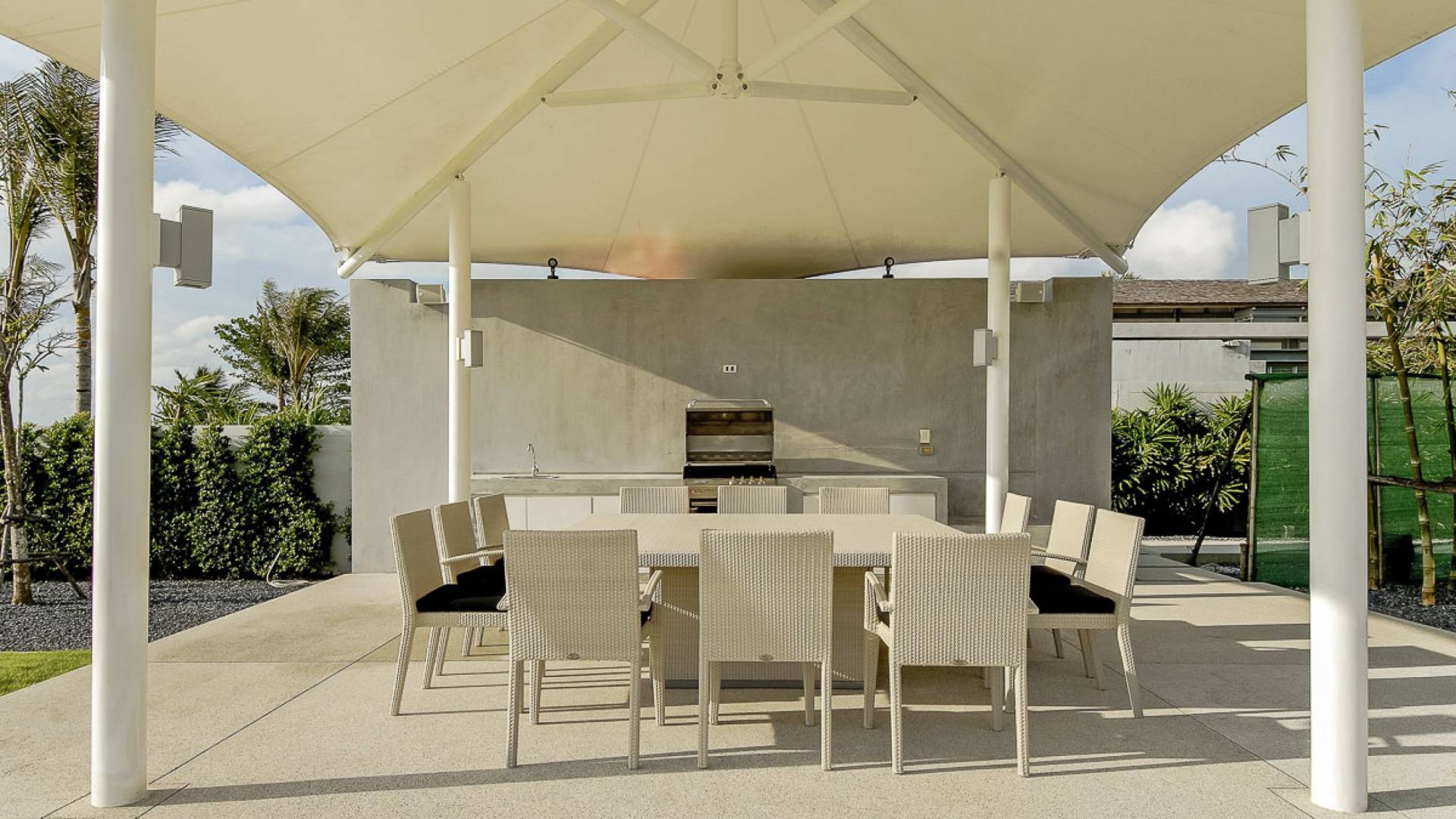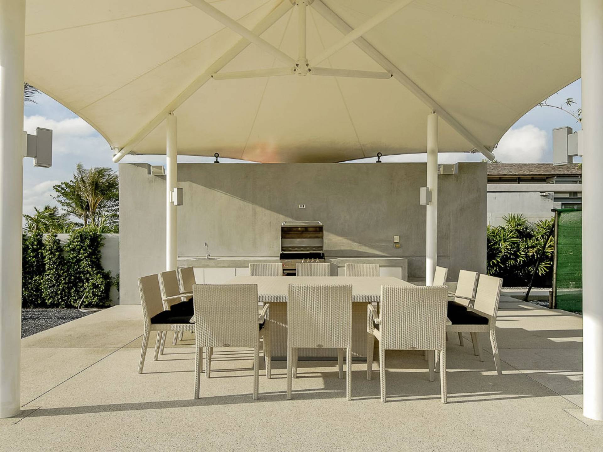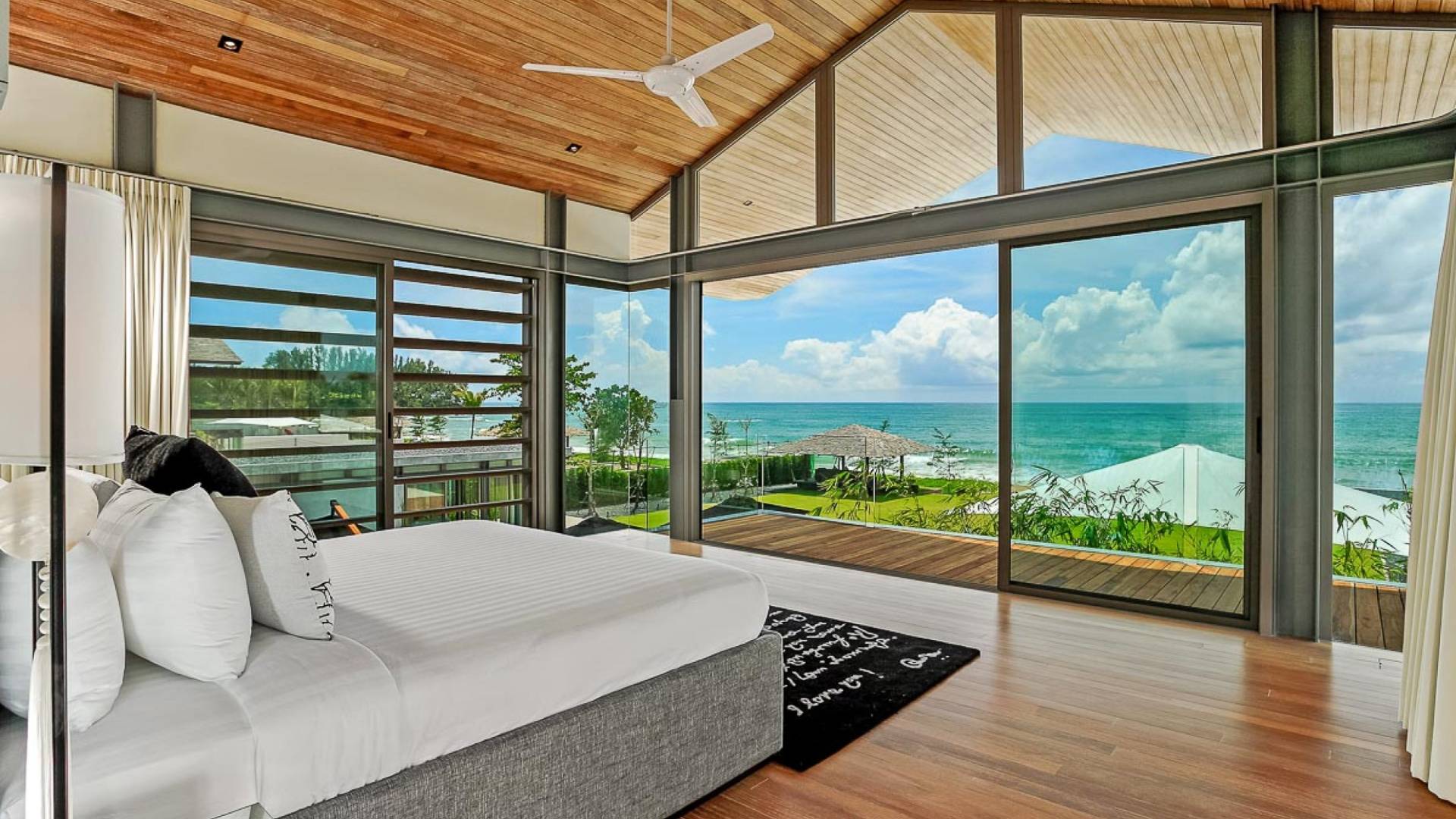 With almost an acre of beachfront land to play on, Villa Essenza is an outdoor lover’s dream home. Cool down and relish the sea views from the enormous infinity pool, then soak up the sun on one of the sun loungers that line the stylish deck. Perfect for events or informal family gatherings, the barbeque dining area is comfortably shaded by a canopy. On the beachfront lawn is a peak-roof sala offering prime sea views, while sports enthusiasts can make use of the villa’s volleyball and football equipment on the large lawn to the rear of the villa.