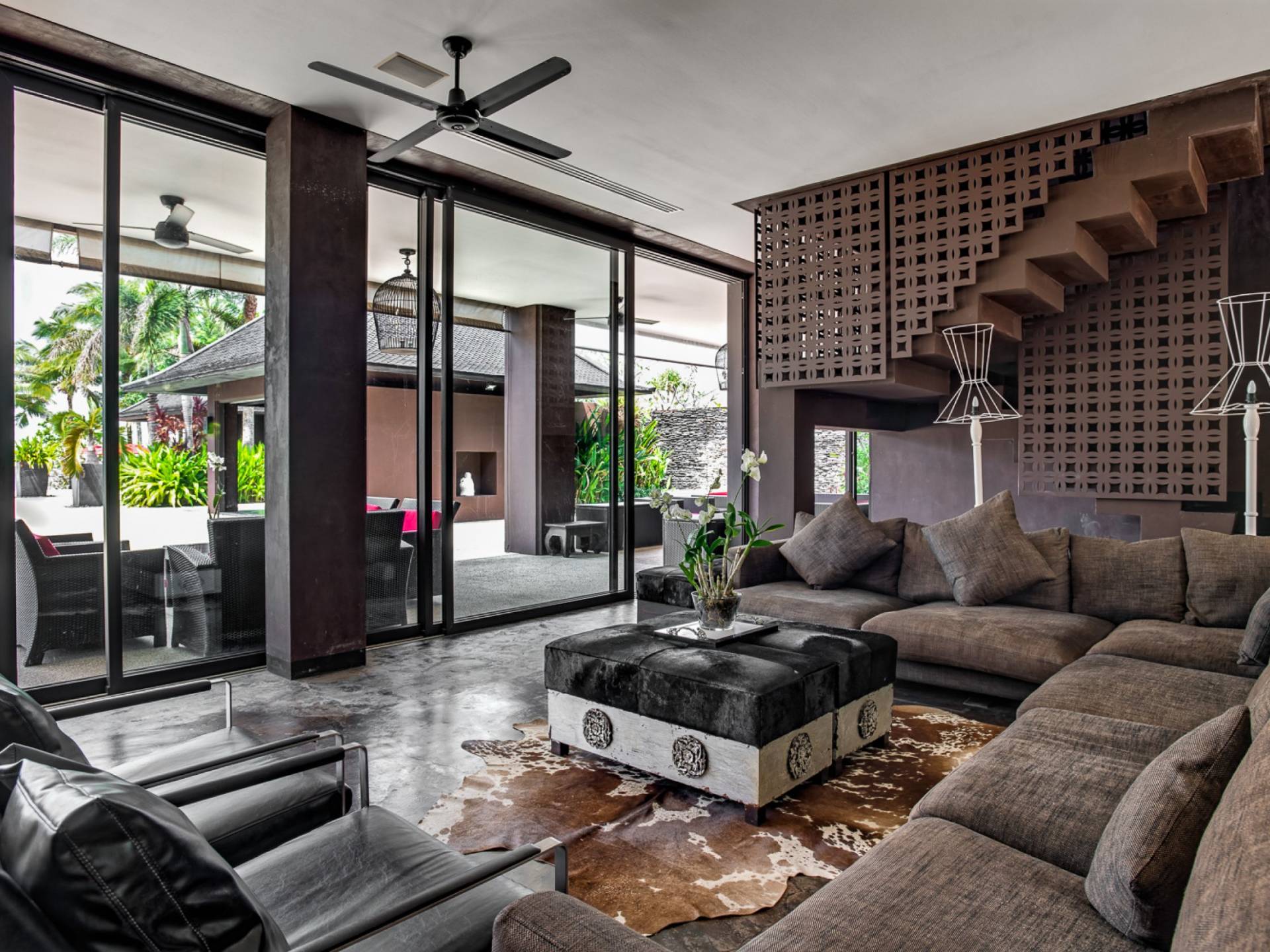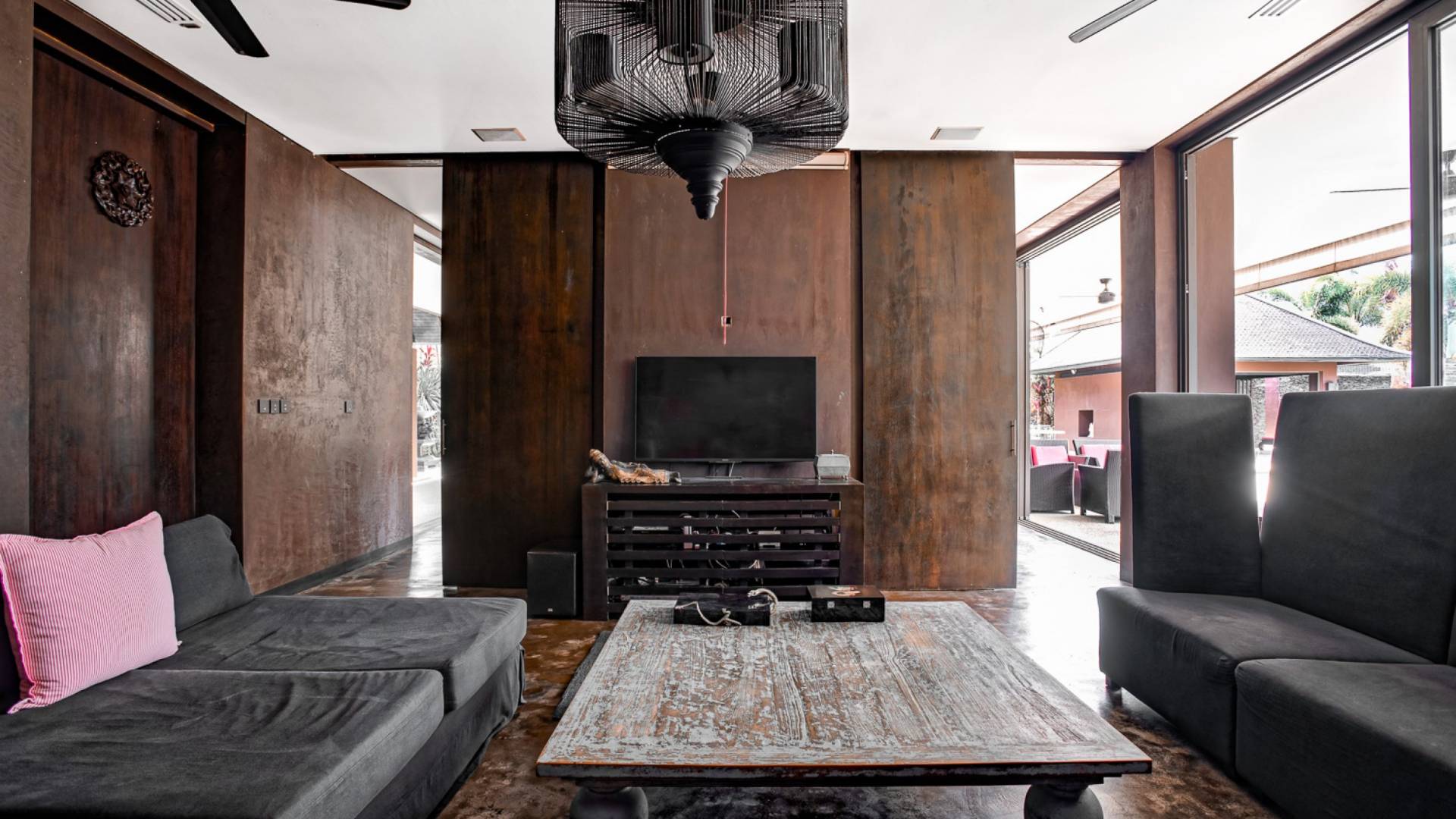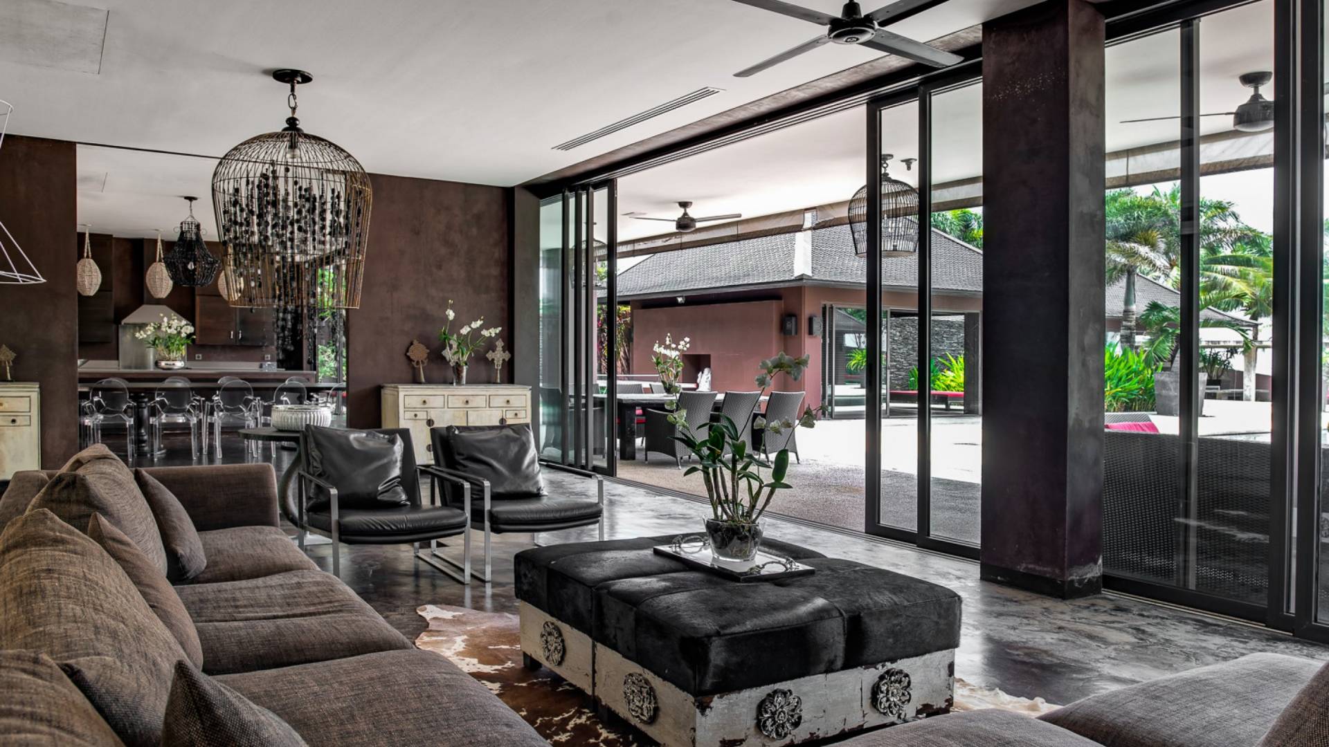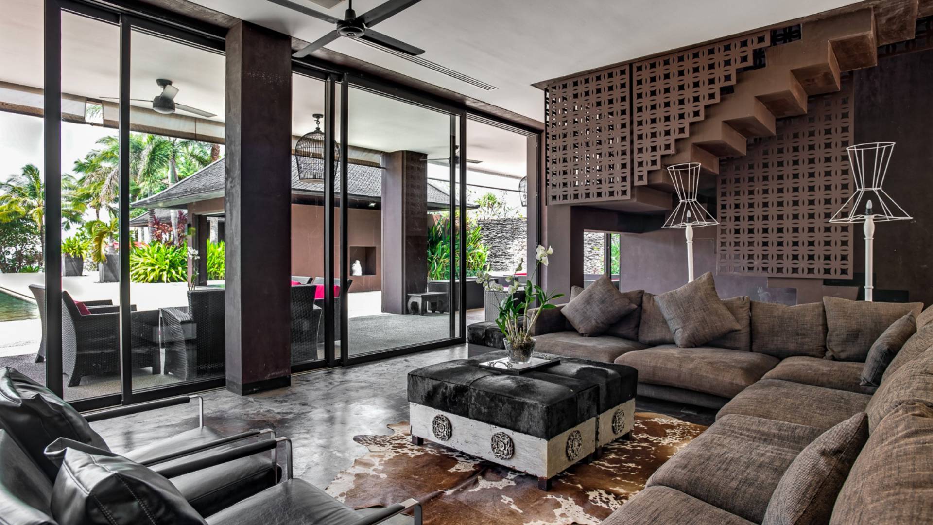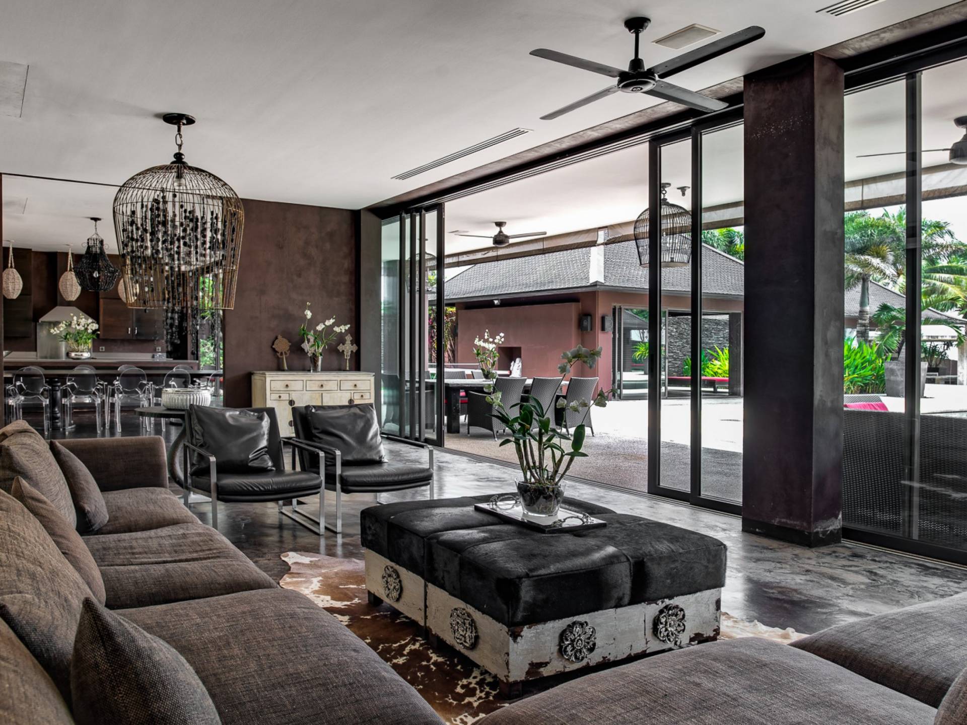 Villa Saanti enjoys a contemporary and elegant design with most surfaces in dark colors while some impressive flecks of shades of red and orange create a harmonious antithesis. Fine quality decorative elements, furnishings and fittings, high ceilings, and oversized sliding glass doors give a great cachet to this already astonishing place. The floor-to-ceiling doors provide the guests with breathtaking views while they allow the sunlight and fresh air to enter the villa and create a bright and airy ambiance.