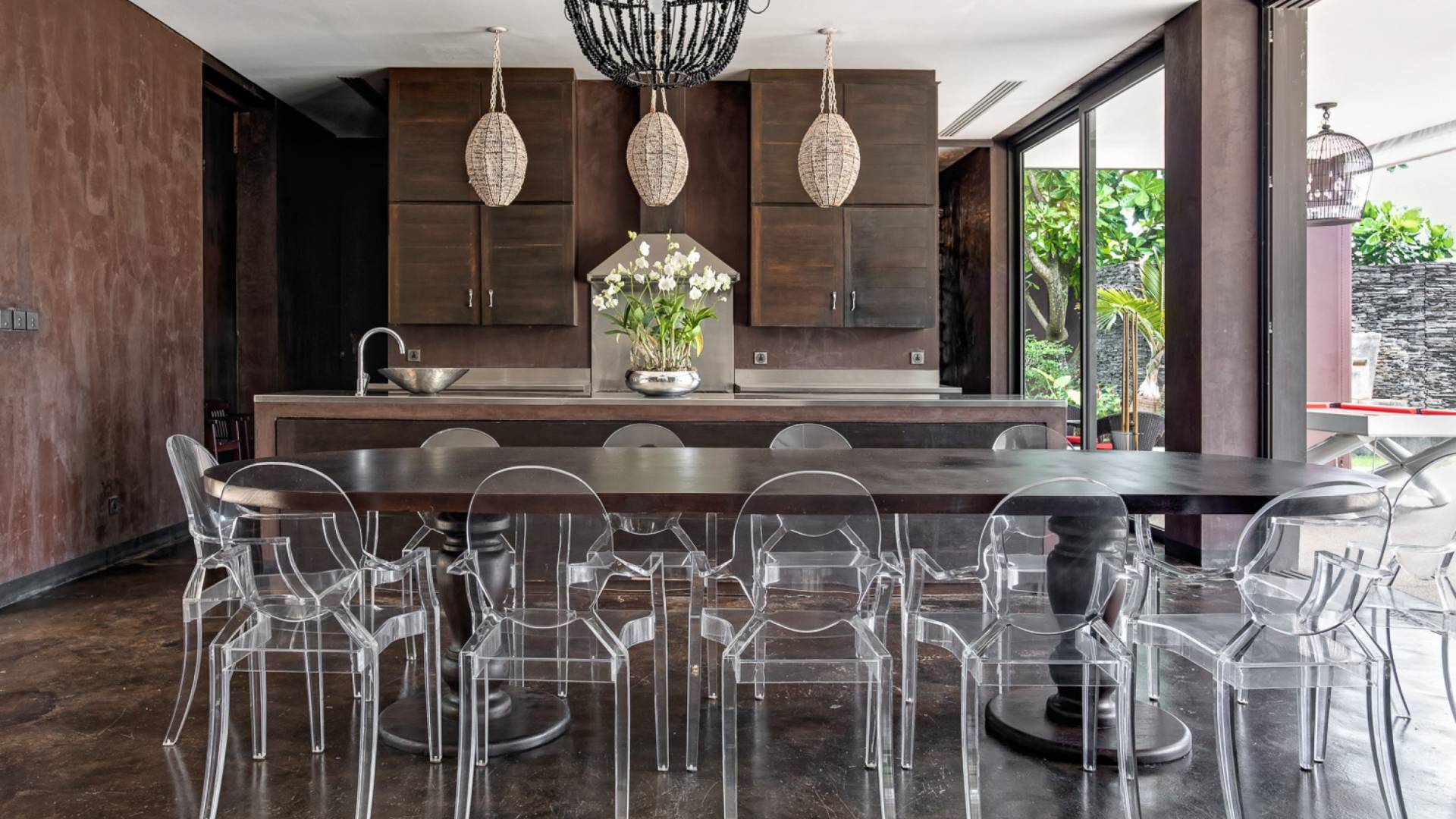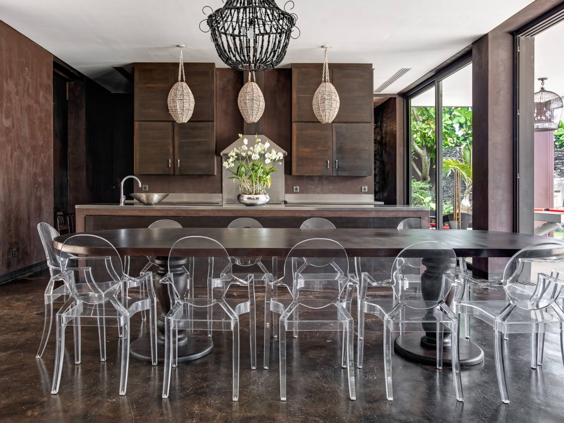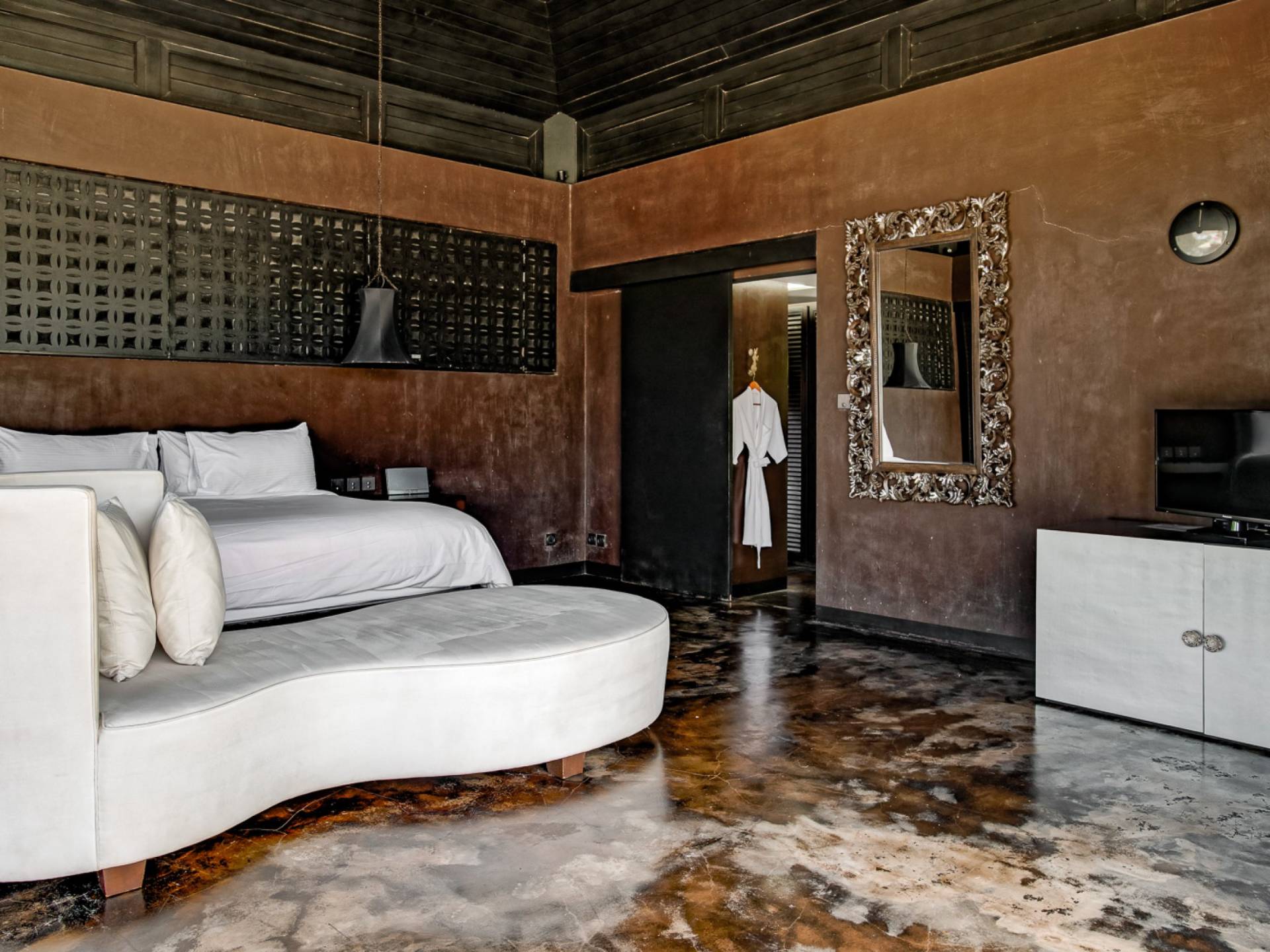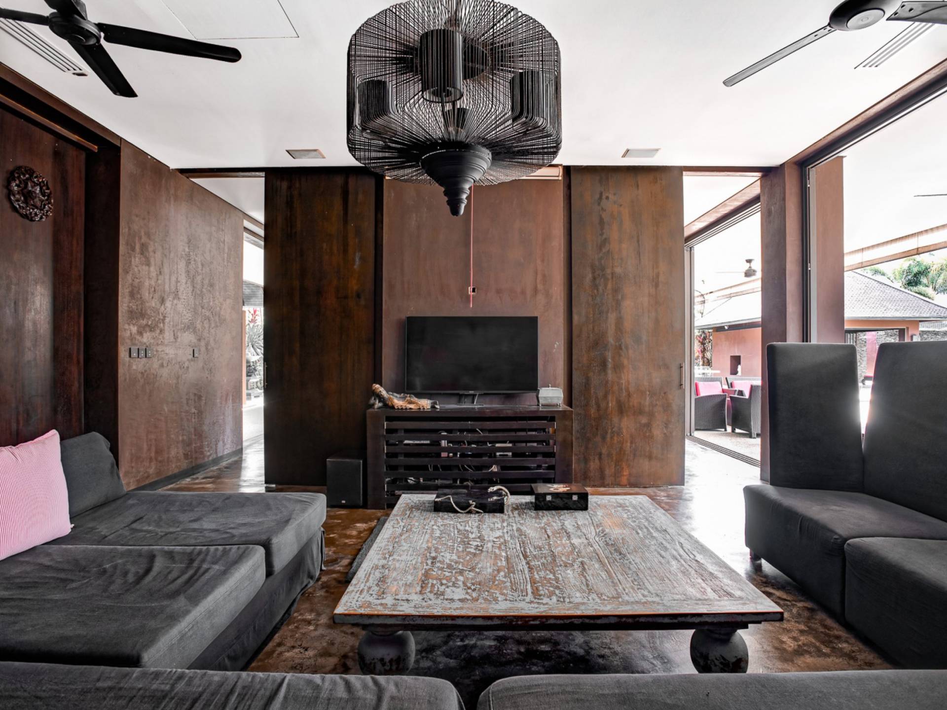 Villa Saanti enjoys a contemporary and elegant design with most surfaces in dark colors while some impressive flecks of shades of red and orange create a harmonious antithesis. Fine quality decorative elements, furnishings and fittings, high ceilings, and oversized sliding glass doors give a great cachet to this already astonishing place. The floor-to-ceiling doors provide the guests with breathtaking views while they allow the sunlight and fresh air to enter the villa and create a bright and airy ambiance.