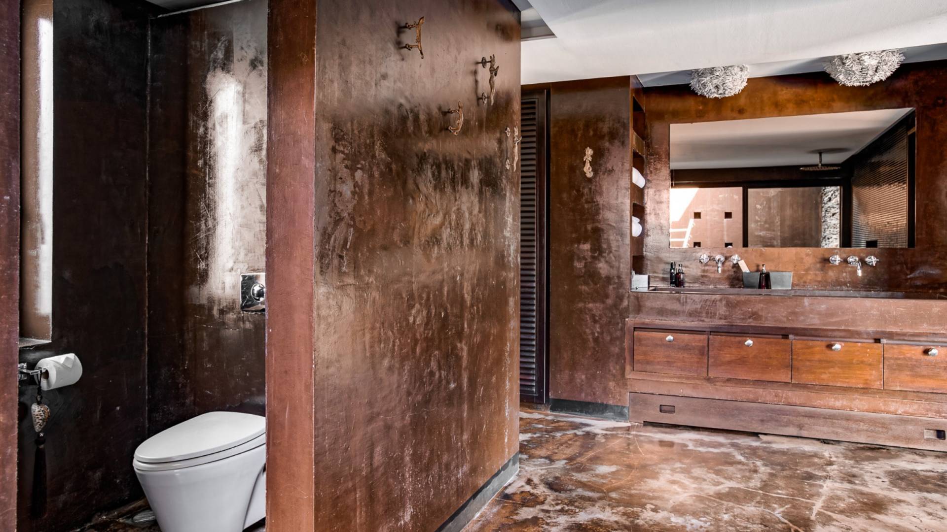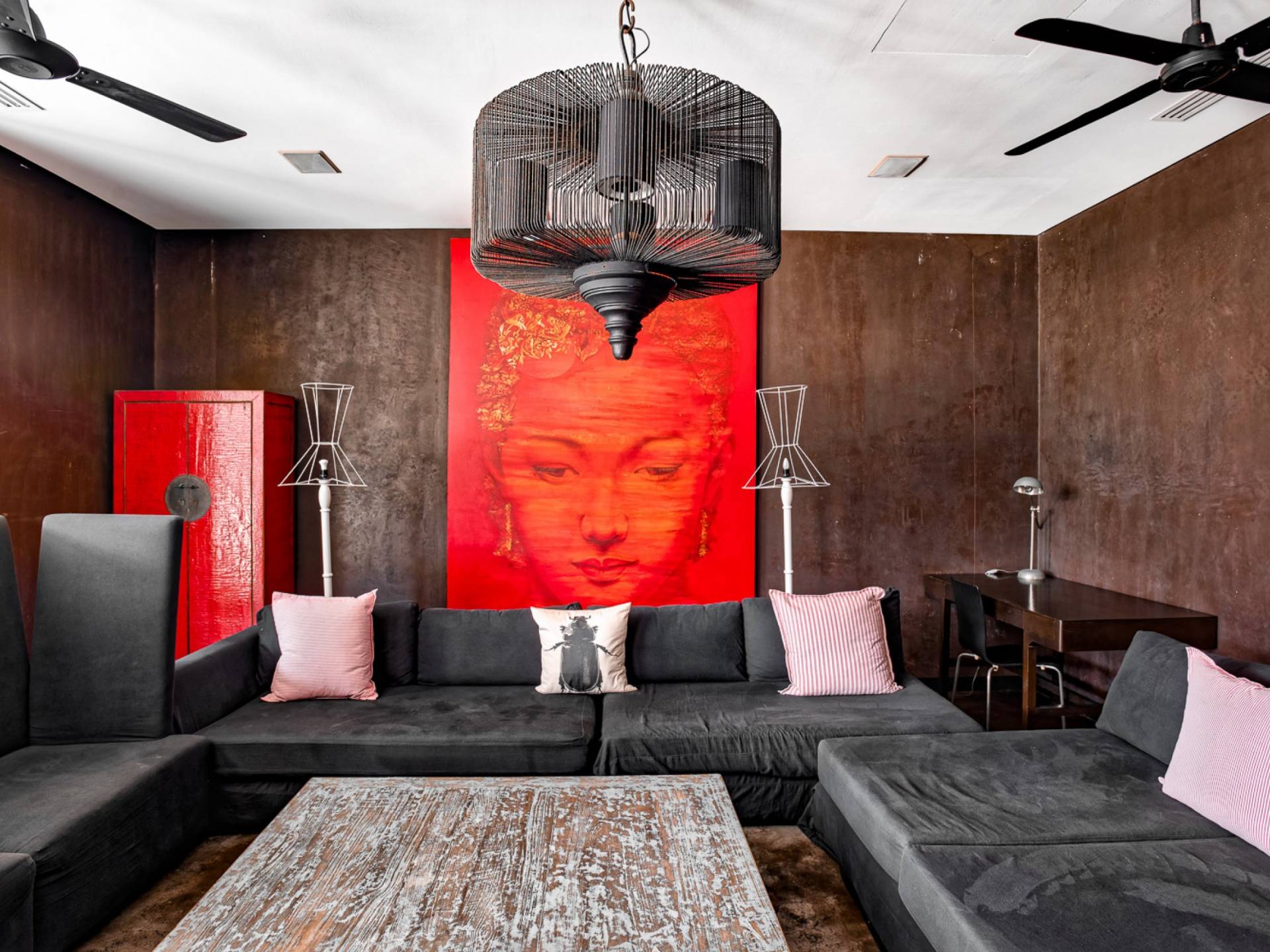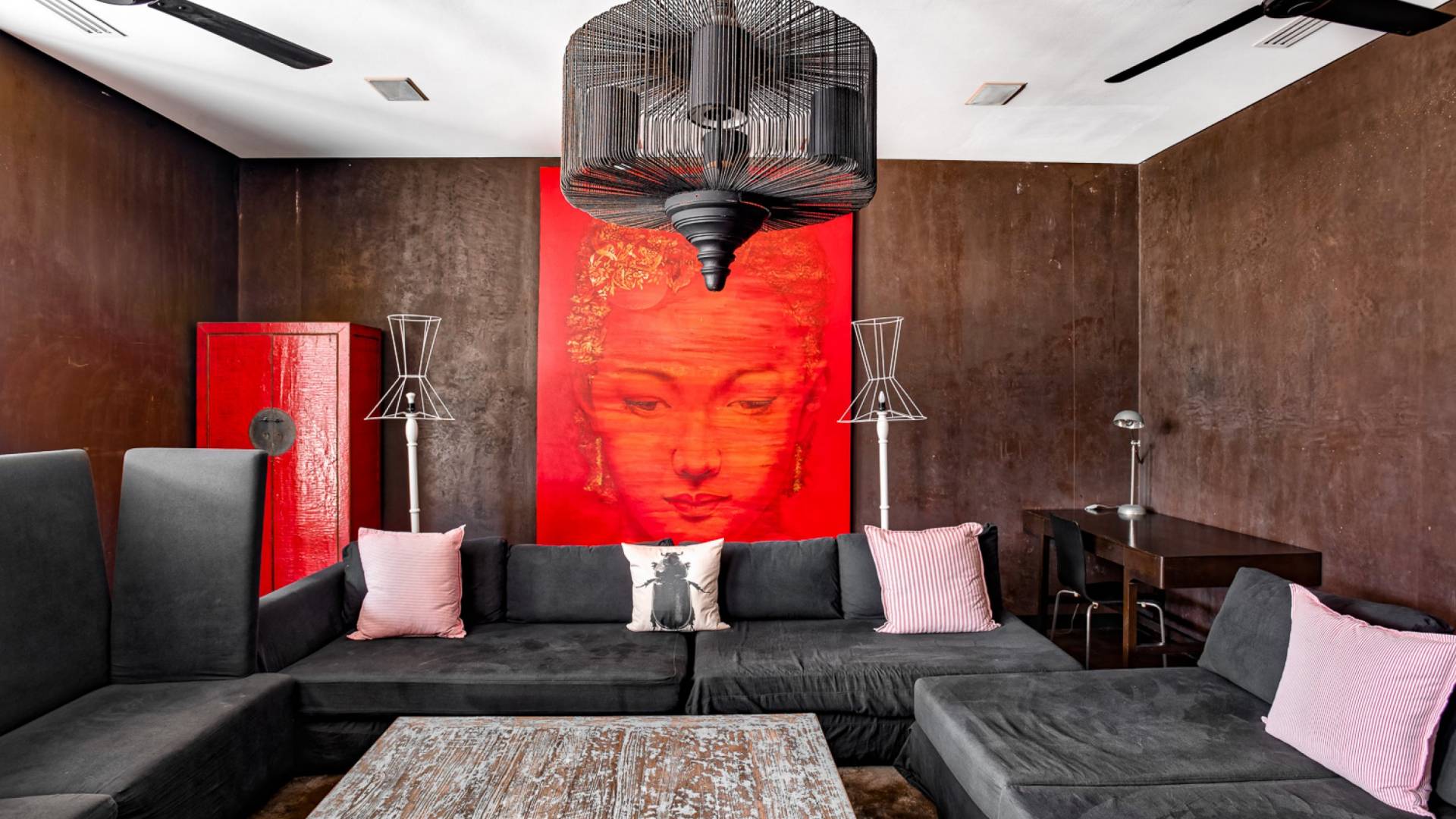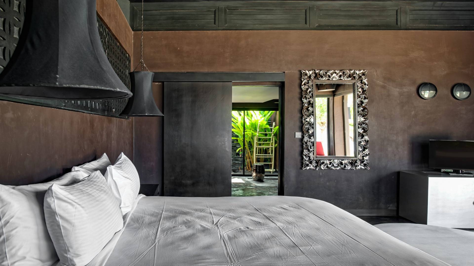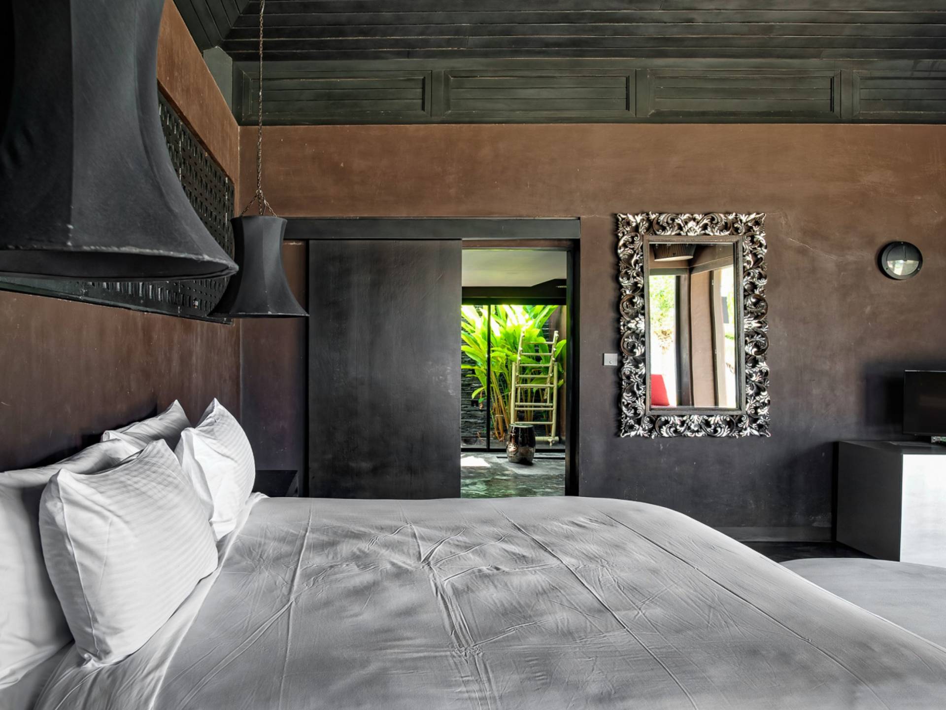 Villa Saanti enjoys a contemporary and elegant design with most surfaces in dark colors while some impressive flecks of shades of red and orange create a harmonious antithesis. Fine quality decorative elements, furnishings and fittings, high ceilings, and oversized sliding glass doors give a great cachet to this already astonishing place. The floor-to-ceiling doors provide the guests with breathtaking views while they allow the sunlight and fresh air to enter the villa and create a bright and airy ambiance.