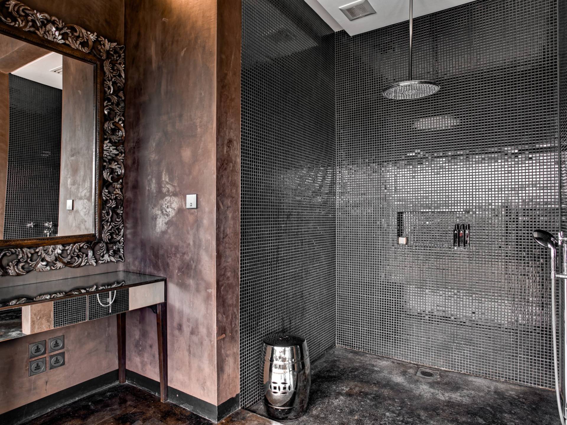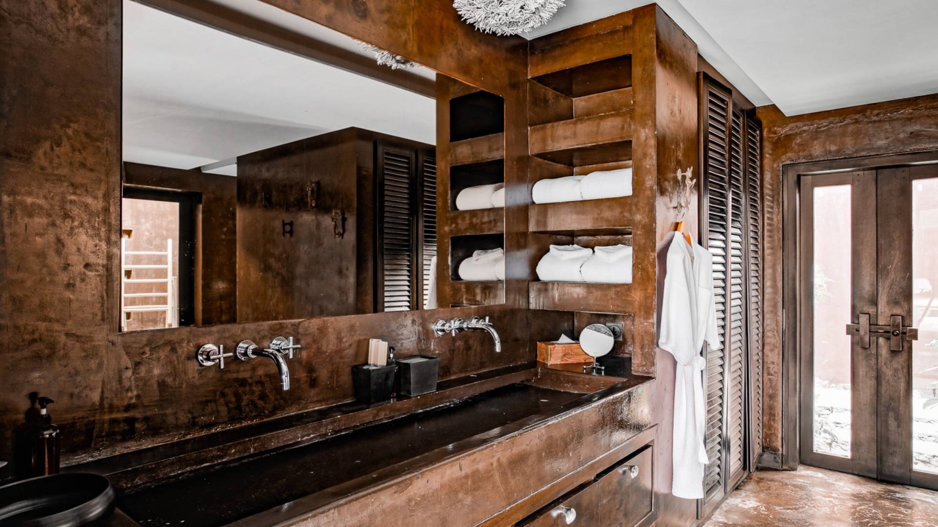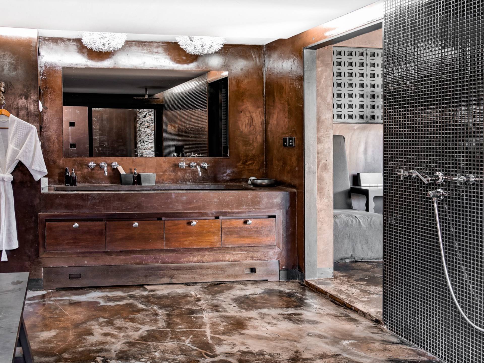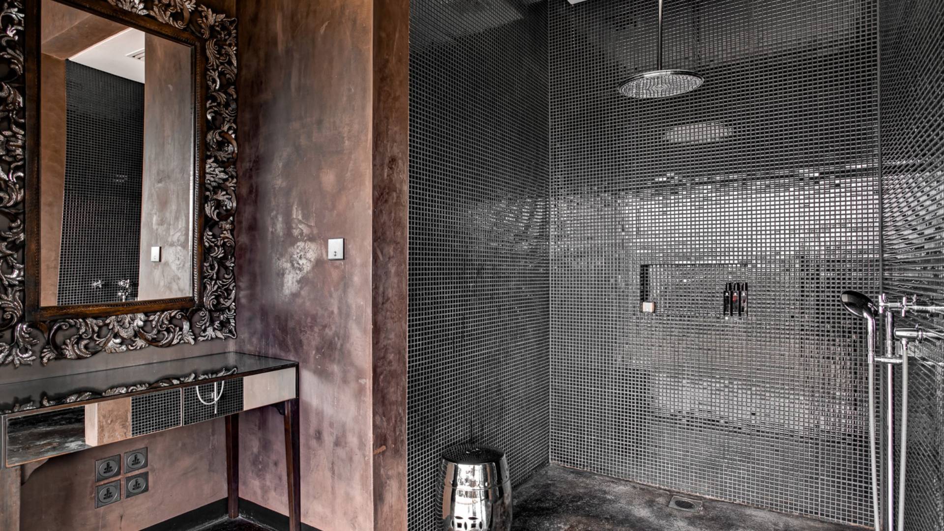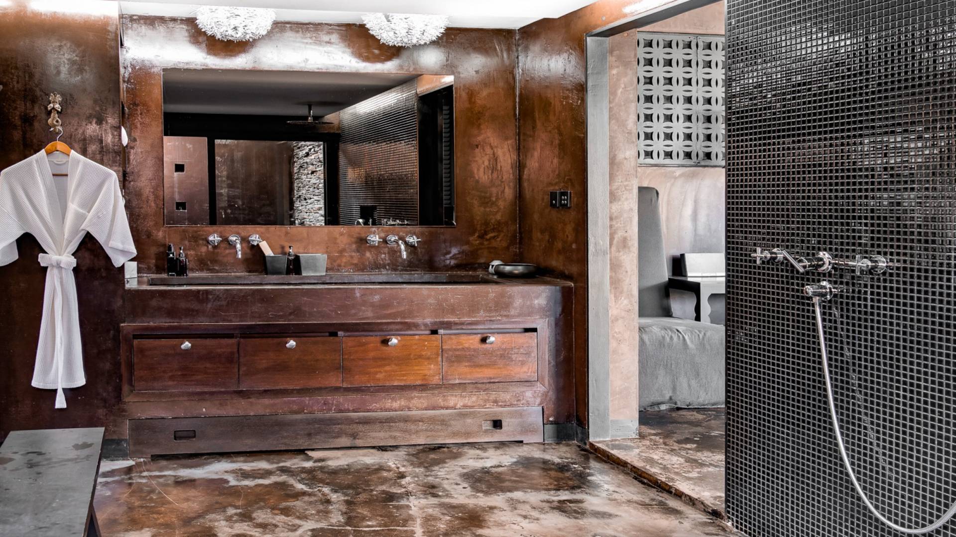 Villa Saanti enjoys a contemporary and elegant design with most surfaces in dark colors while some impressive flecks of shades of red and orange create a harmonious antithesis. Fine quality decorative elements, furnishings and fittings, high ceilings, and oversized sliding glass doors give a great cachet to this already astonishing place. The floor-to-ceiling doors provide the guests with breathtaking views while they allow the sunlight and fresh air to enter the villa and create a bright and airy ambiance.