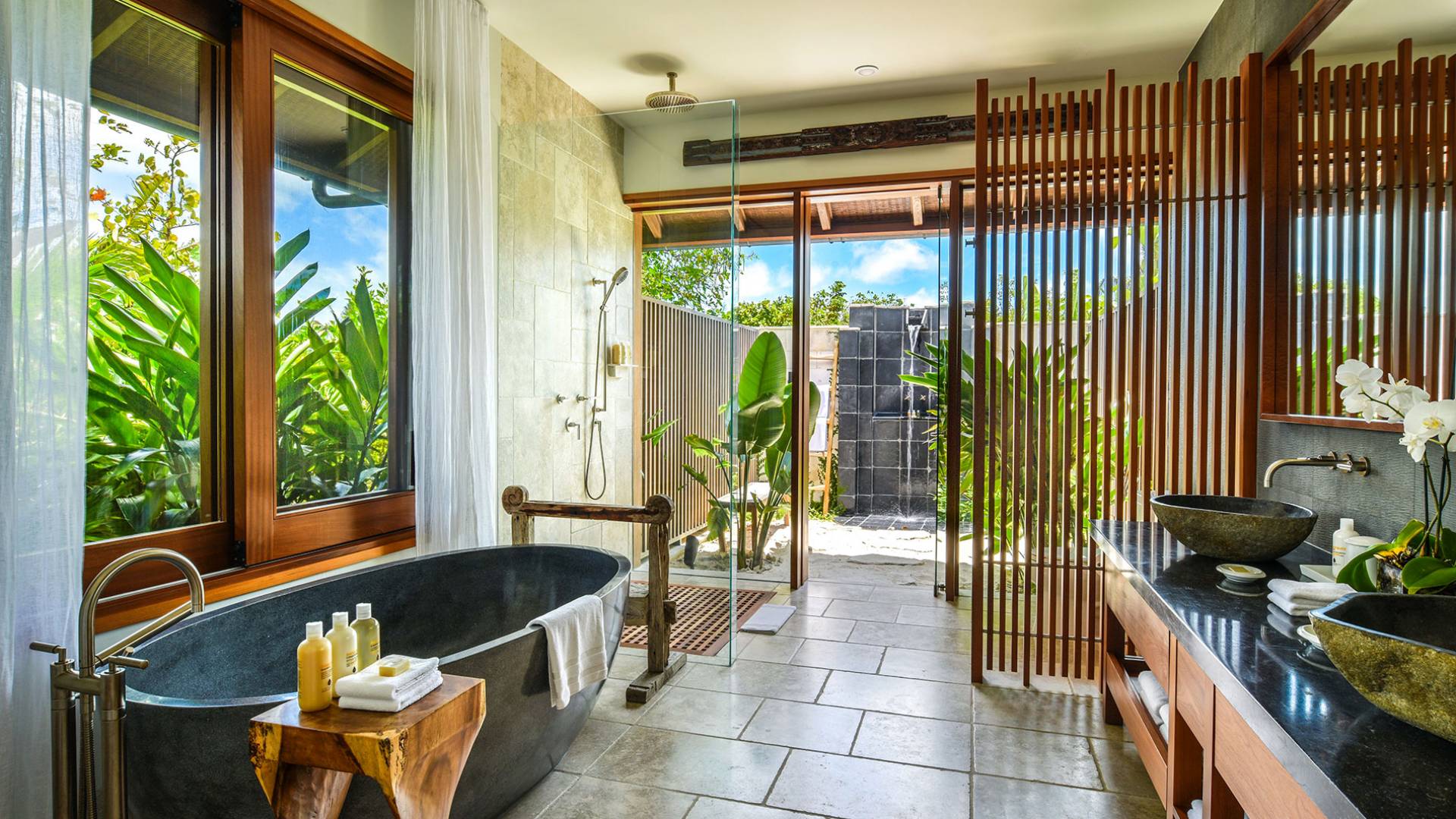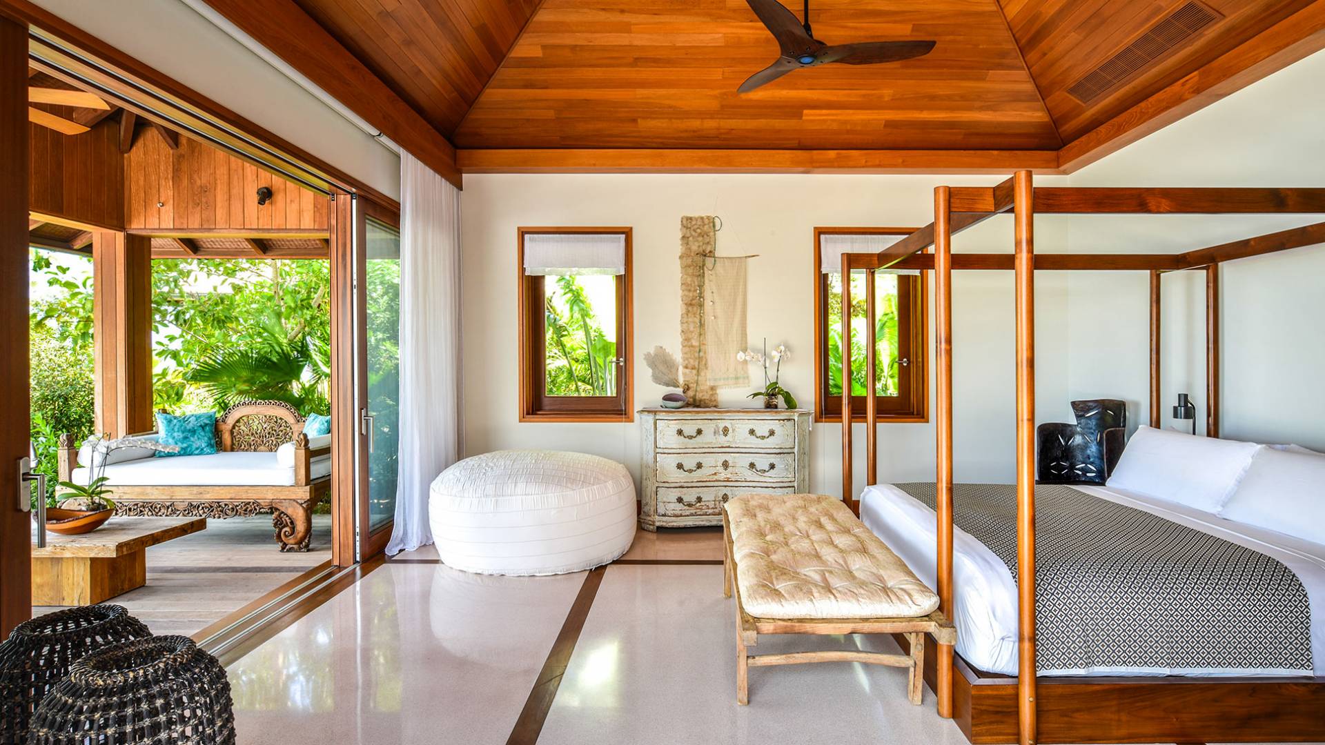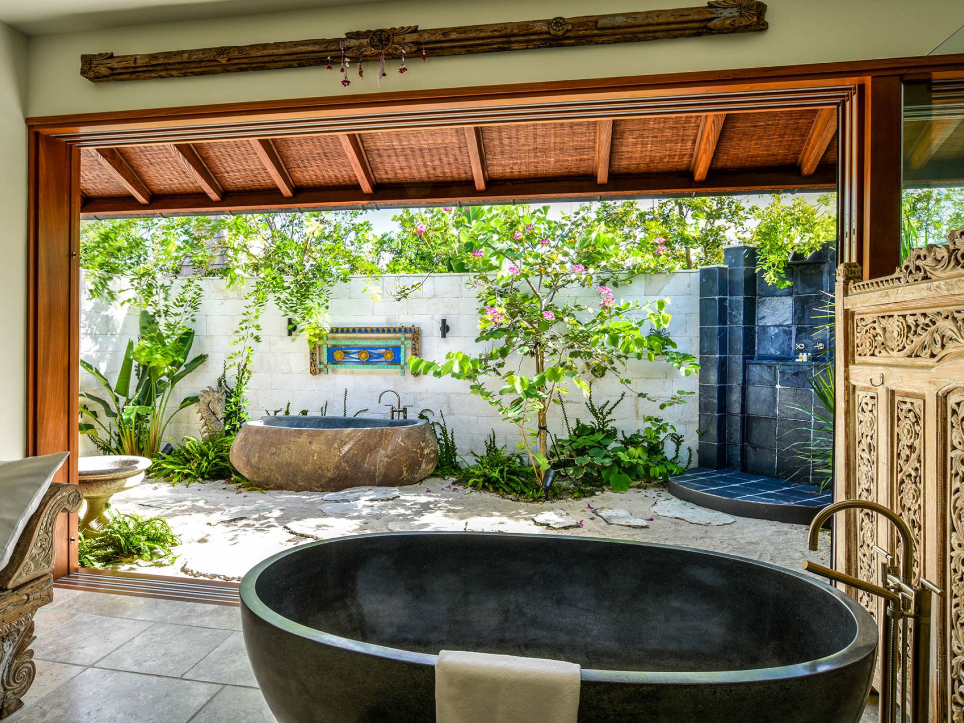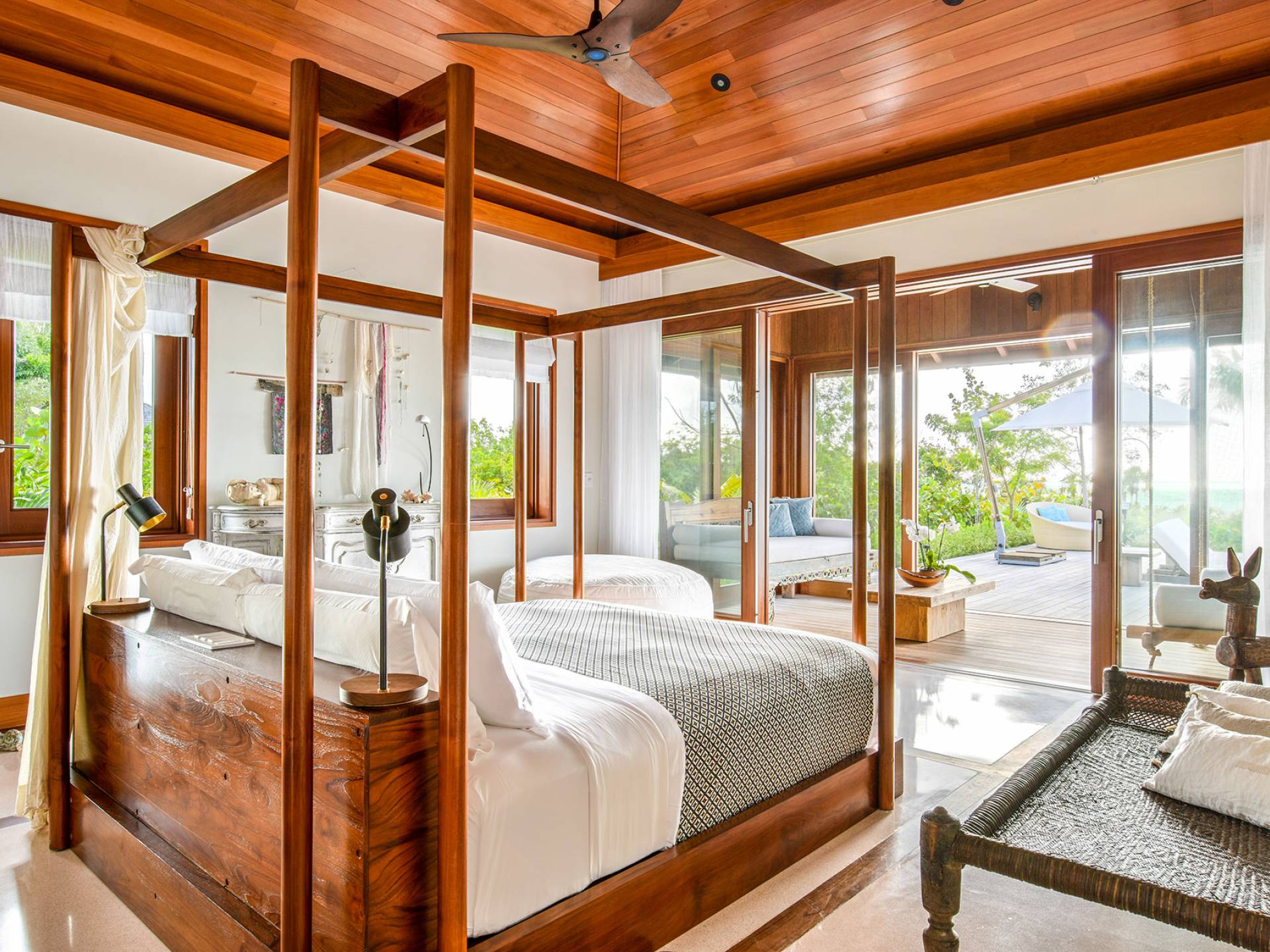 The 7,200 sq ft (668 sq m) main house has a particularly large master bedroom, which opens to a private deck with a teak daybed, as well as its own beach. Every spacious bedroom has an en suite bathroom featuring stone sinks and bathtubs, and stone floors etched with sea fossils. The master bedroom’s en suite can become an open-air bathroom, with a dark stone waterfall shower and sunken tub – both with views out over the turquoise ocean. Outside the house, you can find a 60ft x 21ft infinity pool made from lava rock, surrounded by island greenery and a deck dotted with teak lounge chairs. A large floating Balinese gazebo acts as centerpiece.