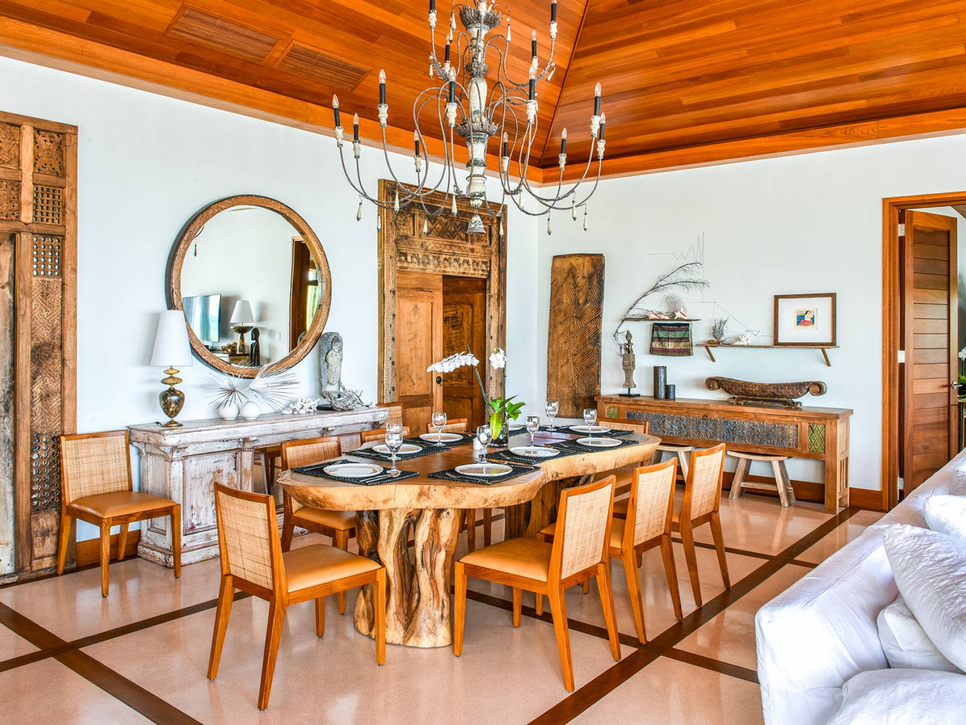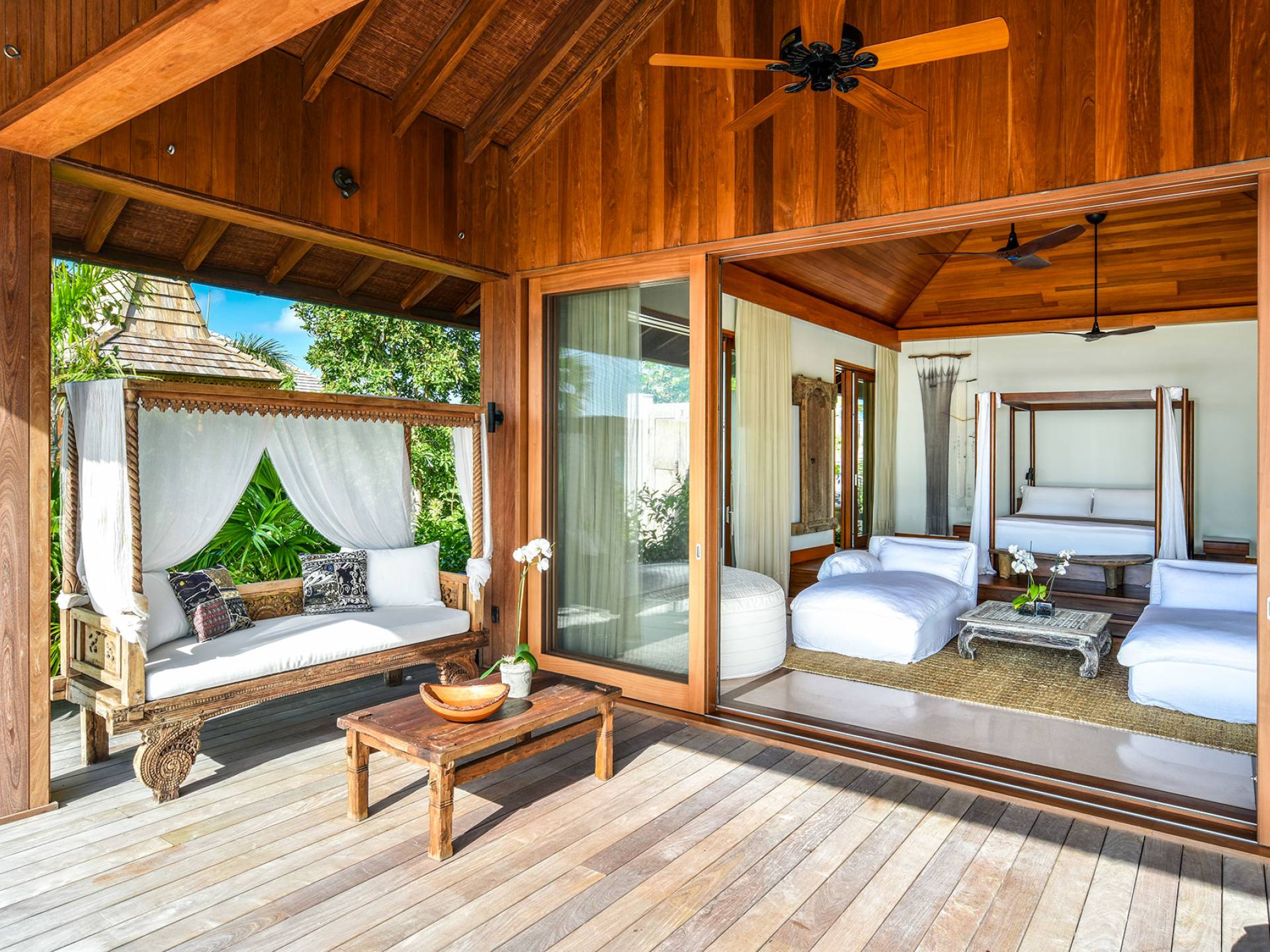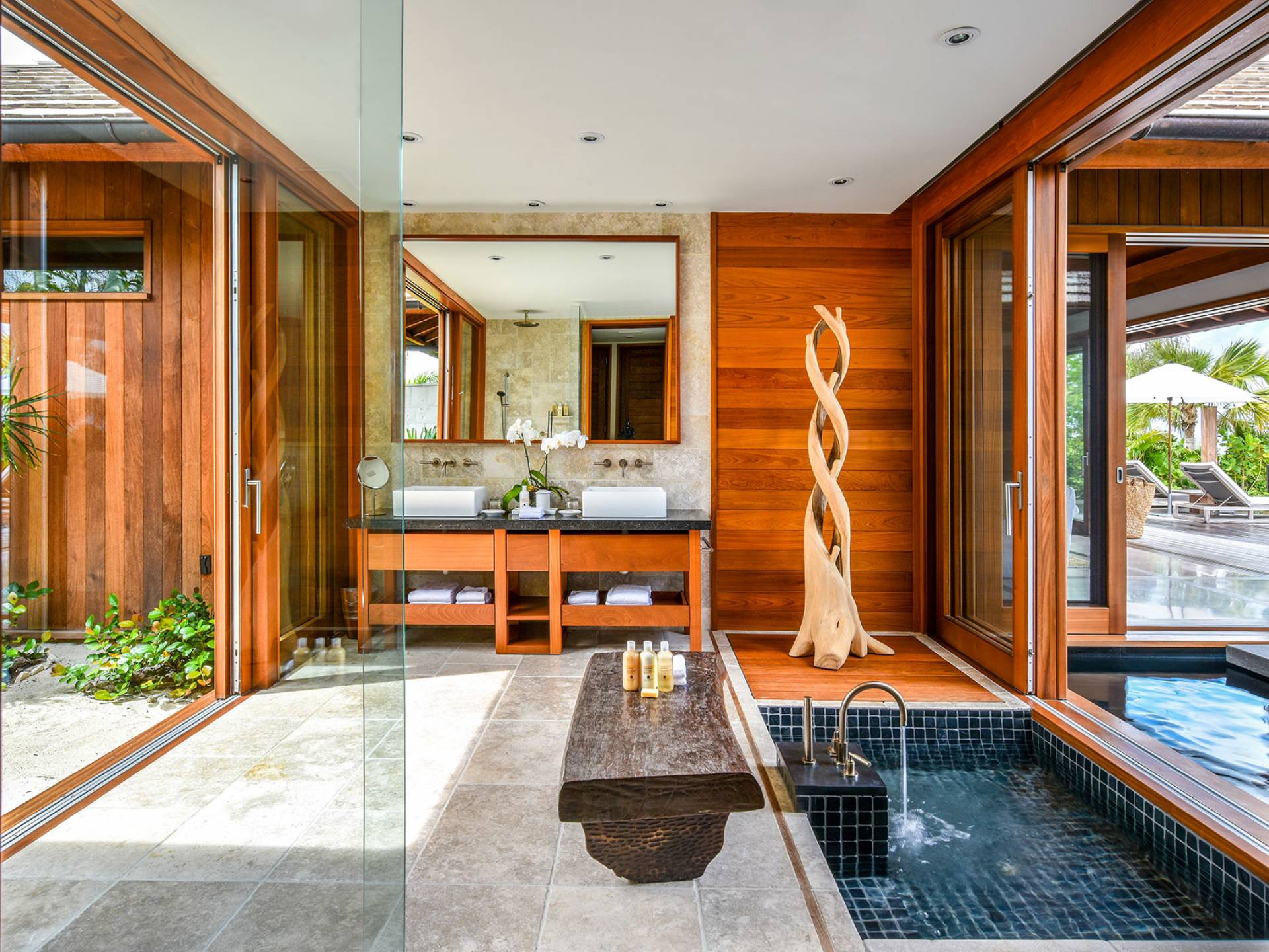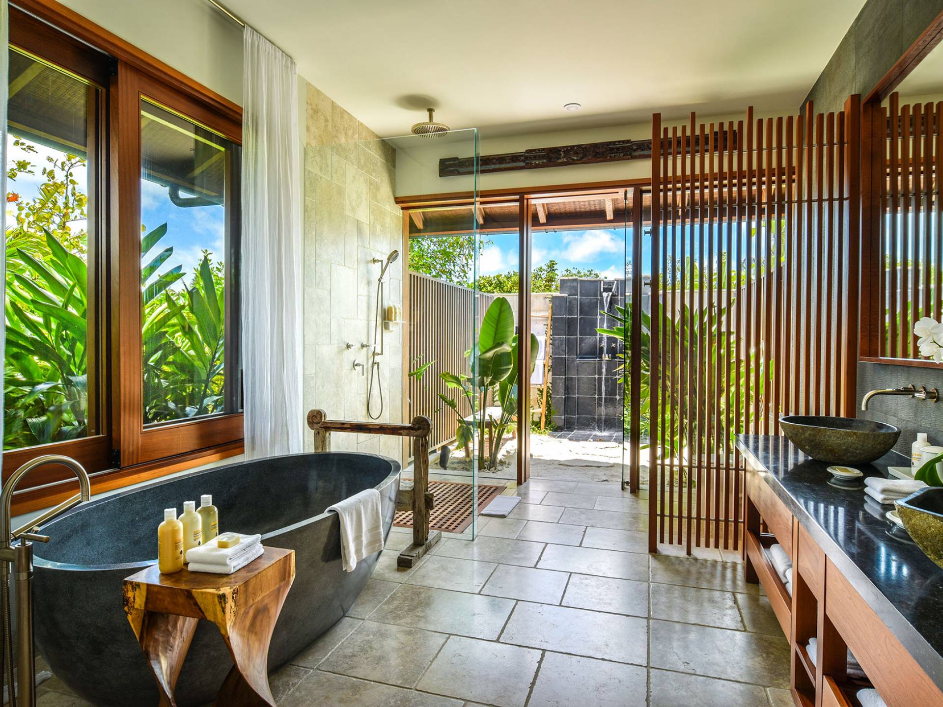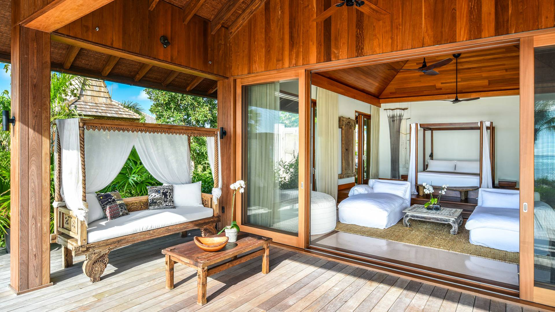 The 7,200 sq ft (668 sq m) main house has a particularly large master bedroom, which opens to a private deck with a teak daybed, as well as its own beach. Every spacious bedroom has an en suite bathroom featuring stone sinks and bathtubs, and stone floors etched with sea fossils. The master bedroom’s en suite can become an open-air bathroom, with a dark stone waterfall shower and sunken tub – both with views out over the turquoise ocean. Outside the house, you can find a 60ft x 21ft infinity pool made from lava rock, surrounded by island greenery and a deck dotted with teak lounge chairs. A large floating Balinese gazebo acts as centerpiece.