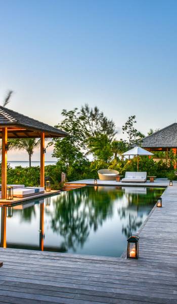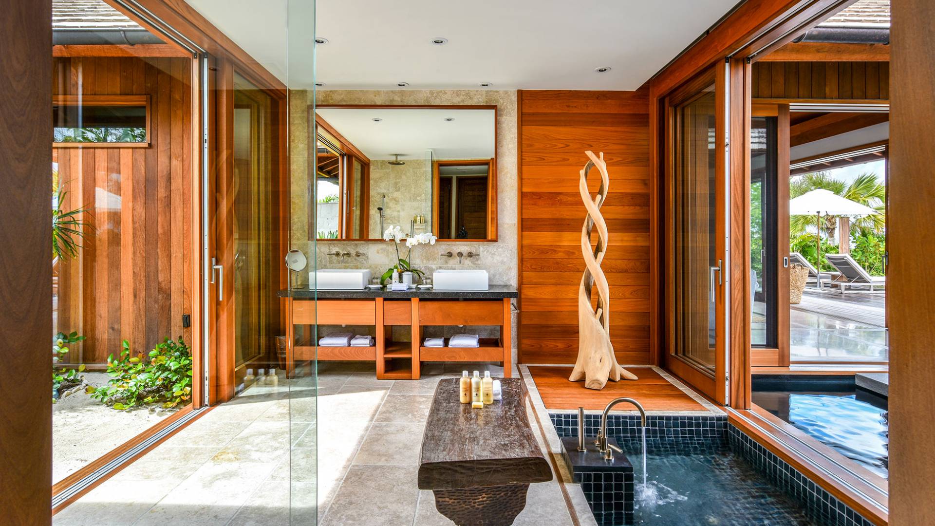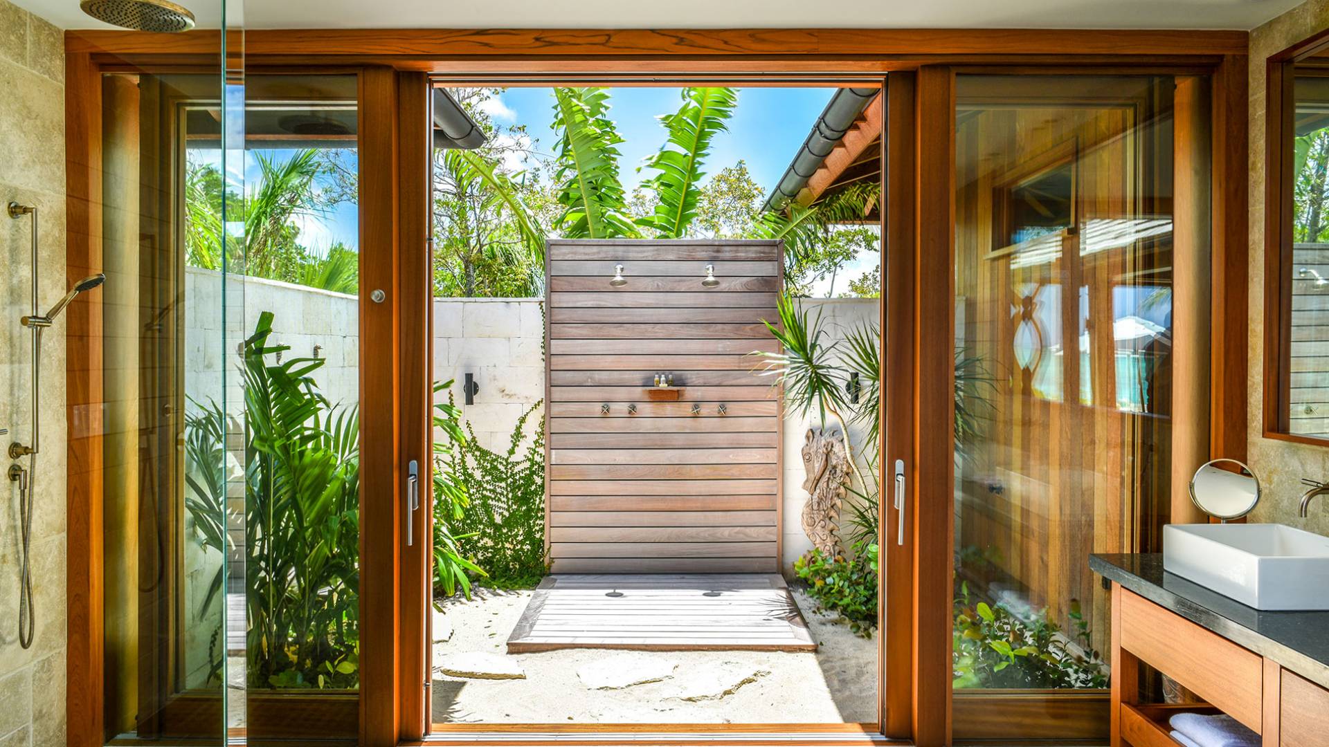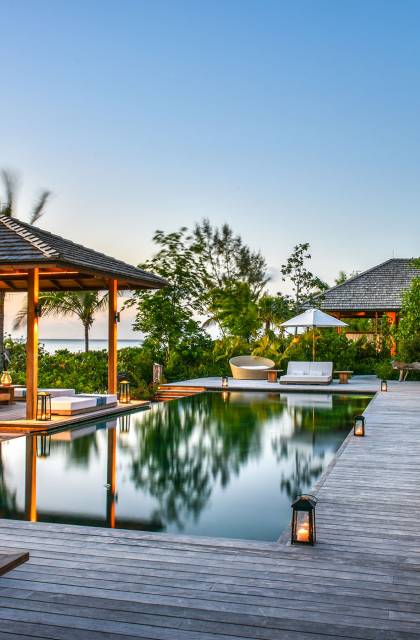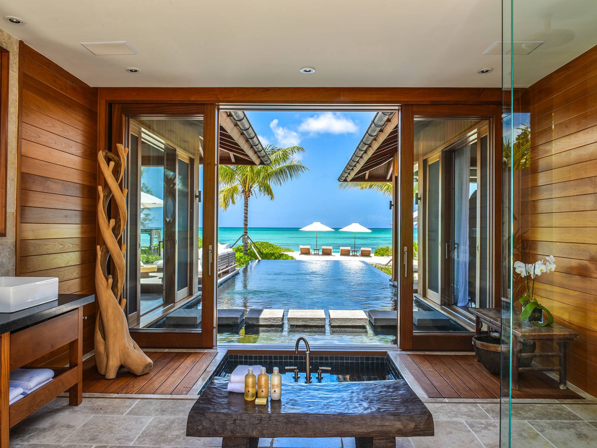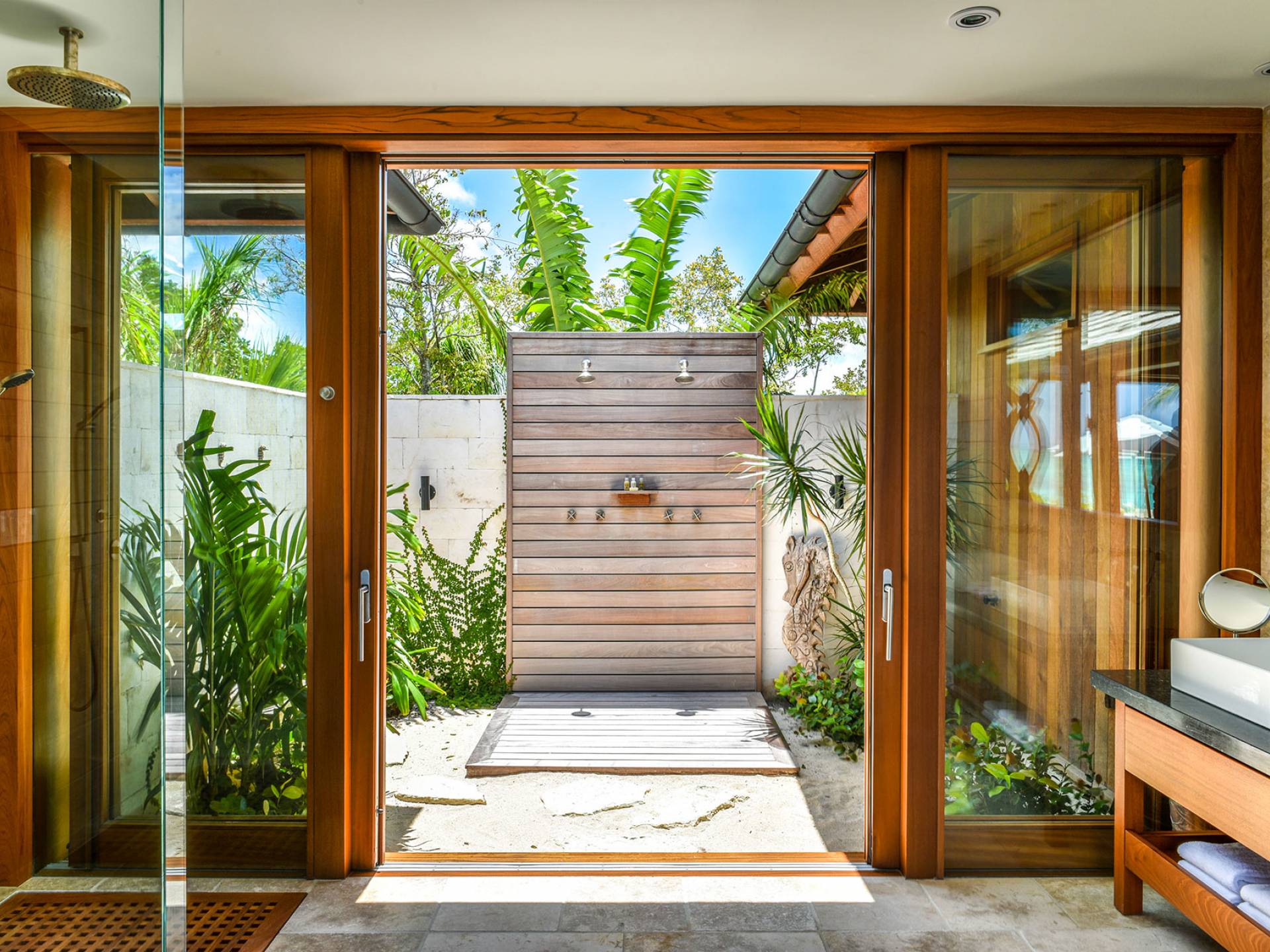 The 7,200 sq ft (668 sq m) main house has a particularly large master bedroom, which opens to a private deck with a teak daybed, as well as its own beach. Every spacious bedroom has an en suite bathroom featuring stone sinks and bathtubs, and stone floors etched with sea fossils. The master bedroom’s en suite can become an open-air bathroom, with a dark stone waterfall shower and sunken tub – both with views out over the turquoise ocean. Outside the house, you can find a 60ft x 21ft infinity pool made from lava rock, surrounded by island greenery and a deck dotted with teak lounge chairs. A large floating Balinese gazebo acts as centerpiece.