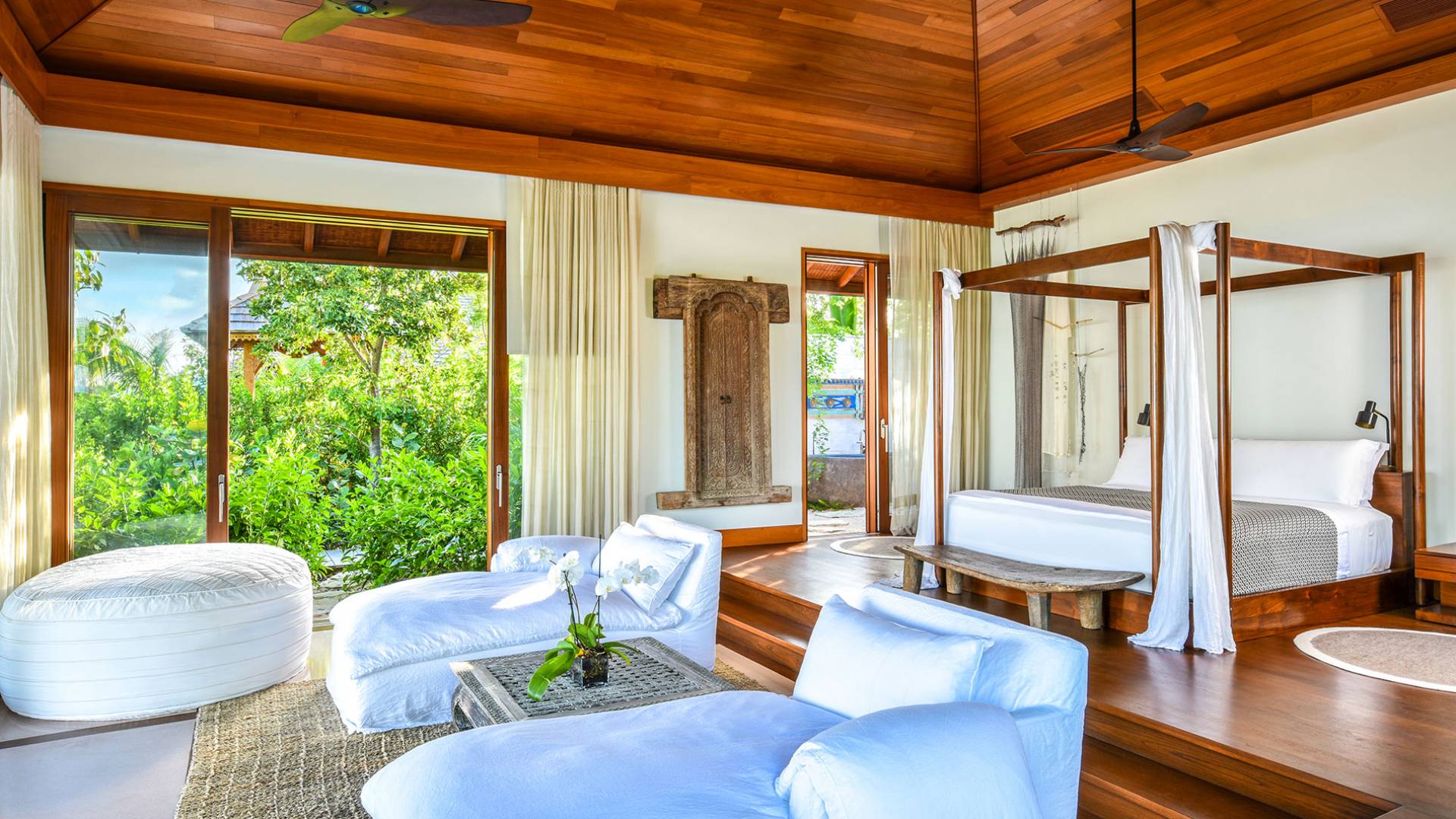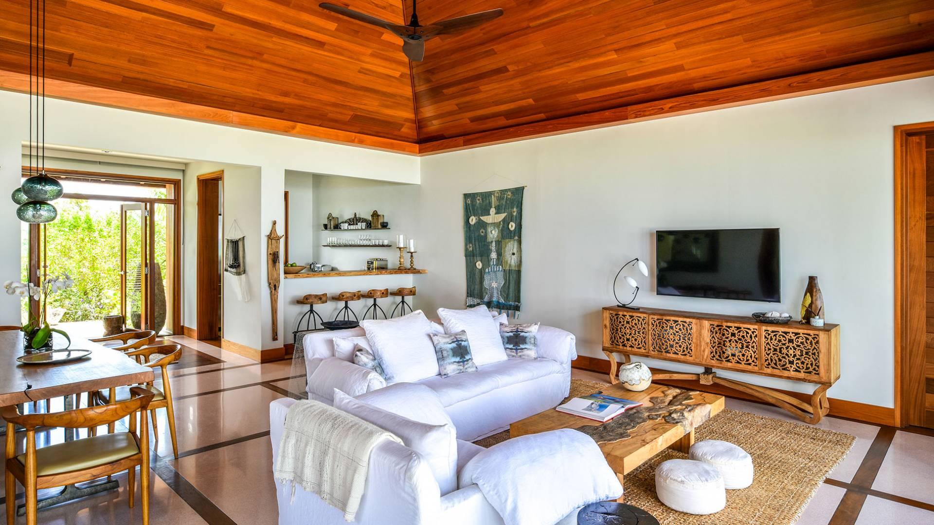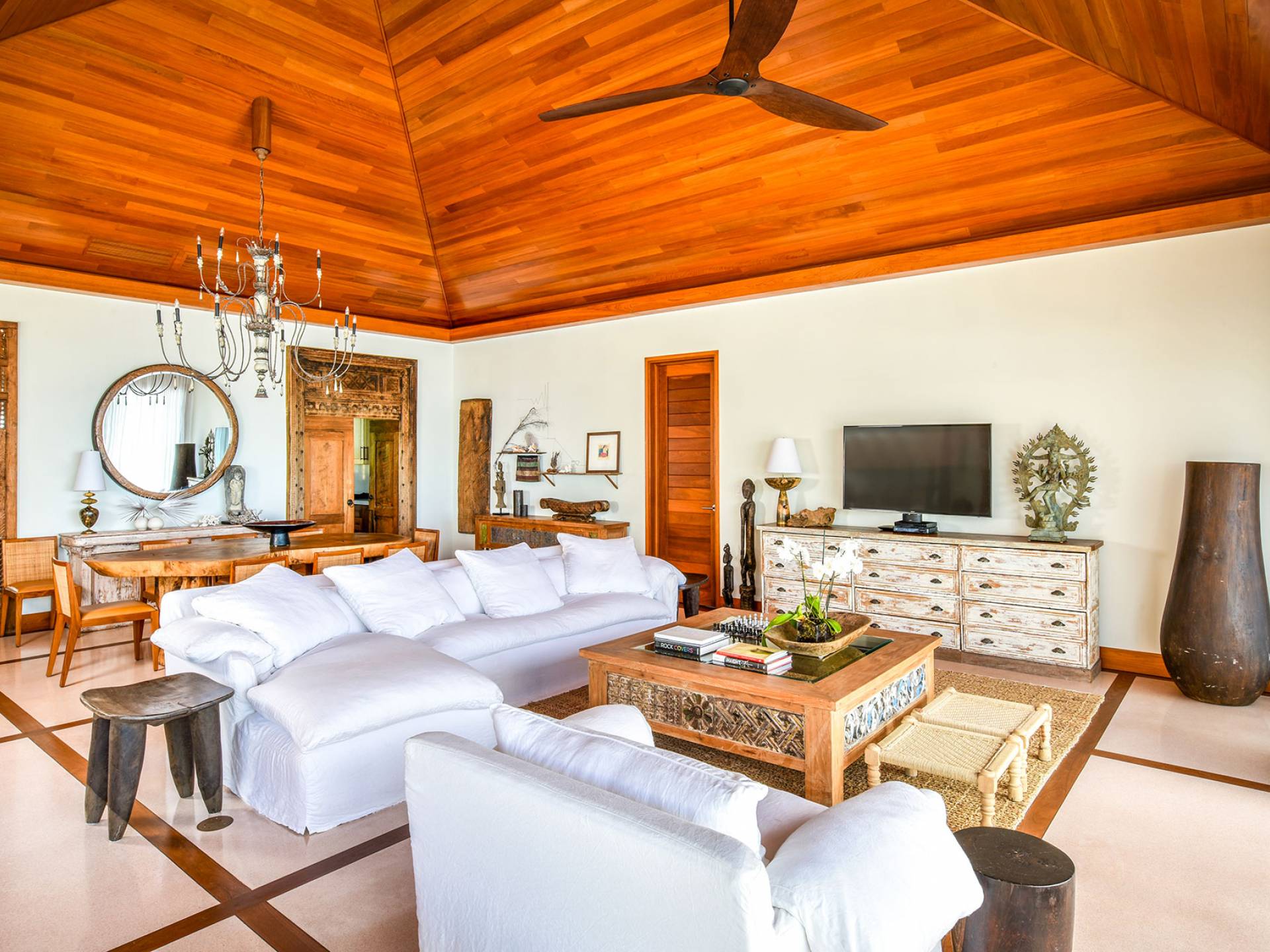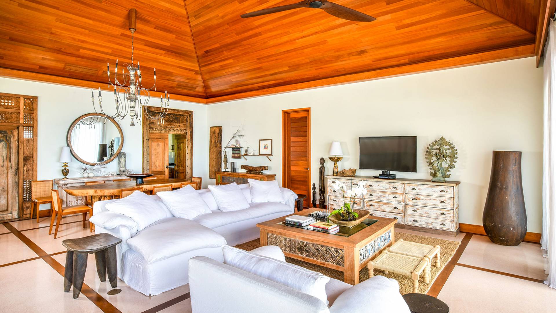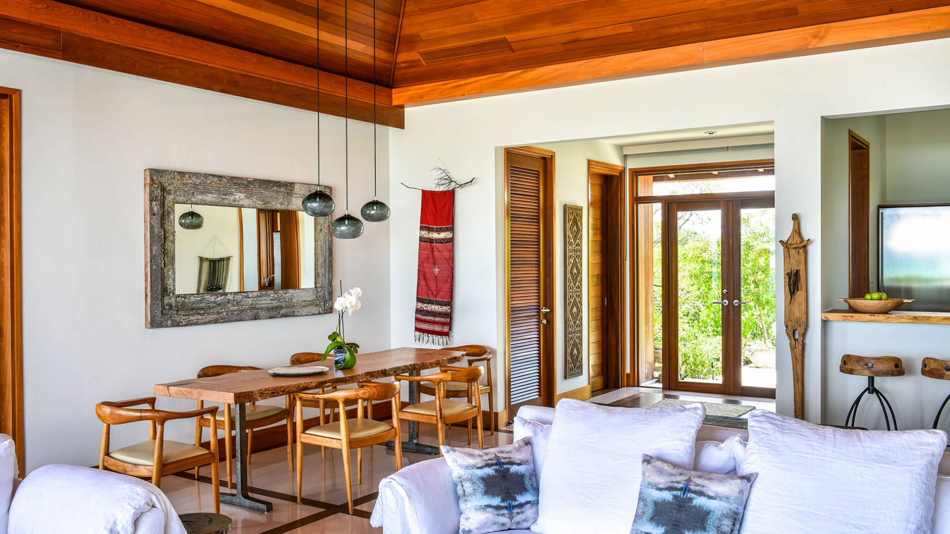 The guest villa, measuring over 3,325sq ft (308 sq m), follows a similar design scheme as the main house, with an abundance of wooden textures, sophisticated whites, and cotton and linen fabrics. A large deck allows you to laze around the dark 46ft x 14ft lava rock pool, which also offers spectacular views of the sea. The spacious master bedroom here mirrors the main house in that its en suite can become an outdoor bathroom once large glasses windows are opened, with a sunken tub and slate outdoor shower. The villa’s second bedroom boasts two queen beds positioned on a terrazzo platform and teak wood plinths. From the living area, you can see straight down to the ocean, with rolling waves during daylight and starry skies at night.