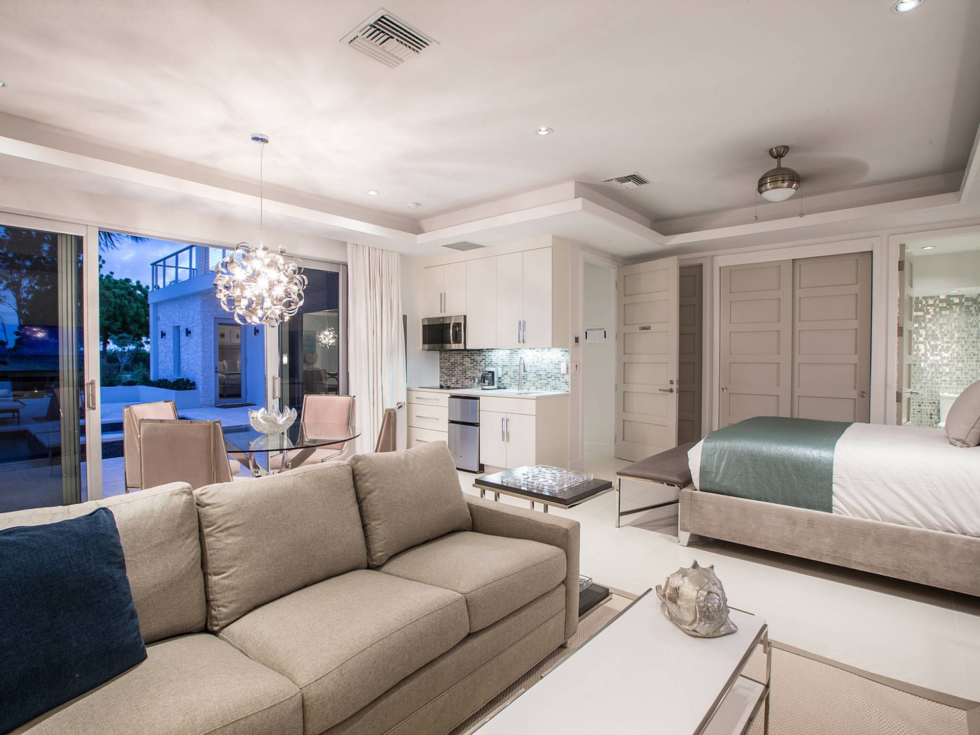 A beautiful ground floor studio with queen bed, kitchenette with cooktop, refrigerator, microwave, and sink. Sofa bed and dining table, and a 60-inch TV. Sliding glass door to the pool deck. The bathroom features a Grohe rainshower.