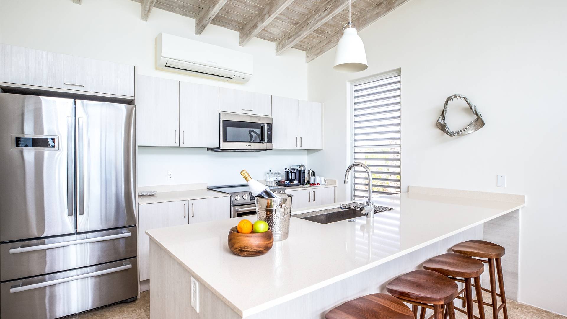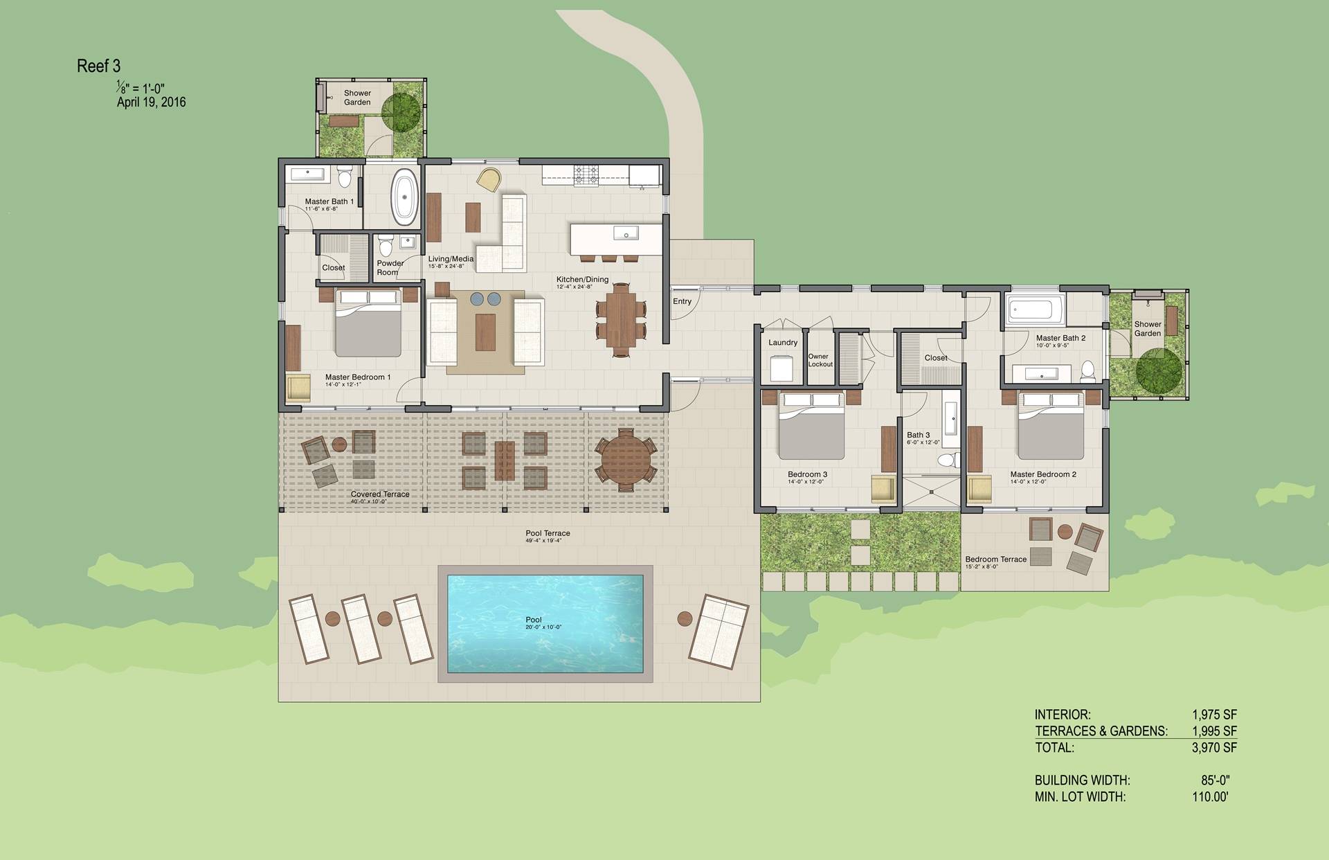 The Three-Bedroom Oceanfront Reef Villa is located directly on an elevated oceanfront site in the Sailrock Peninsula neighborhood with spanning views of the Atlantic Ocean. Part of a low-density and naturally preserved community, the Three Bedroom Oceanfront Reef Villa features 3 bedrooms all with ensuite bathrooms, an open great room with a chef’s kitchen and dining area, and an outdoor shaded dining area, and a large sun terrace with multiple lounging areas and infinity-edge pool.