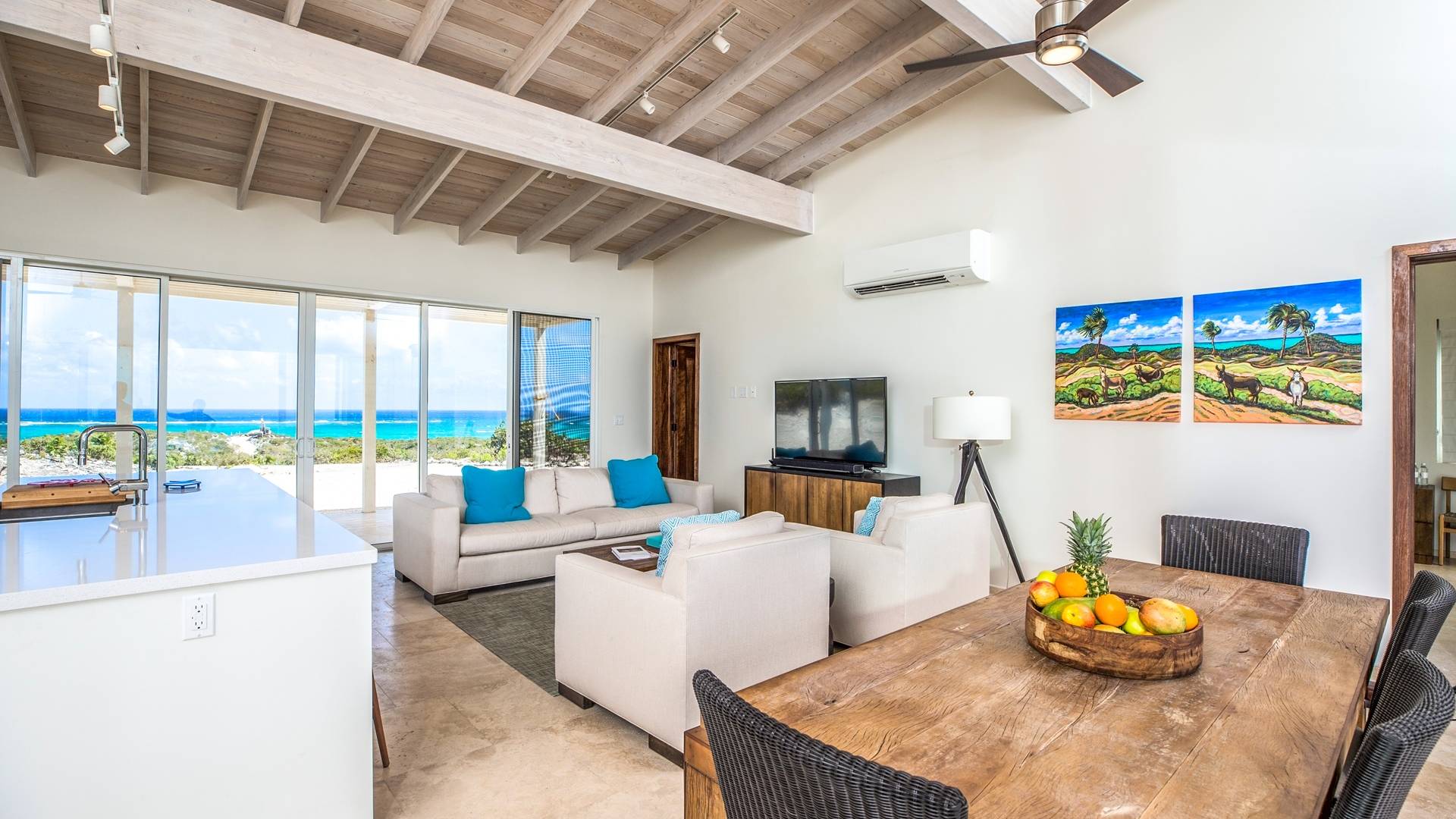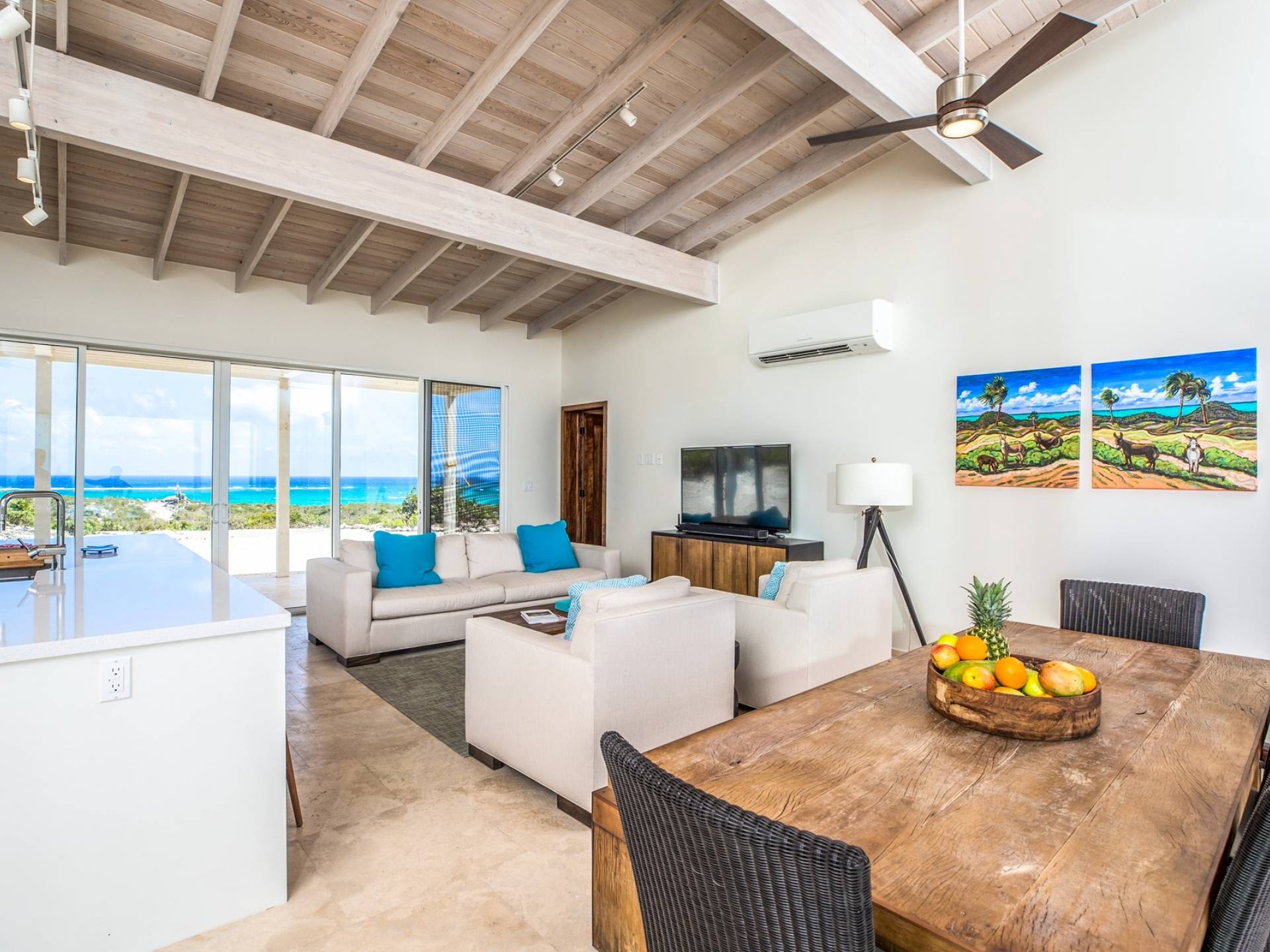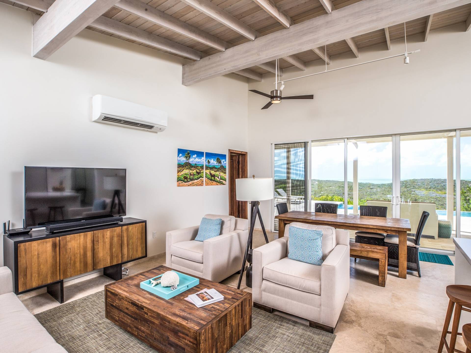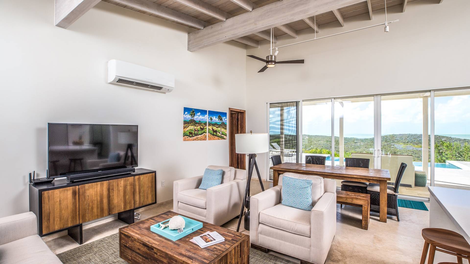 Open the sliding glass foyer wall to let the outside in. The combination of dark re-purposed Brazilian barn wood furniture and cream-colored sofa and armchairs provide for a fresh clean tropical decor. The great room boasts WiFi, a large flat-screen TV along with a Sonos system and CD/DVD player. The ideal island getaway, tranquil and serene, invites relaxed “barefoot” living. Breathtaking views defy belief but can easily convince you that you are the only folks on the planet. And when the gentle night envelopes the stars, seemingly so close as to be able to grasp one, will charm and captivate.