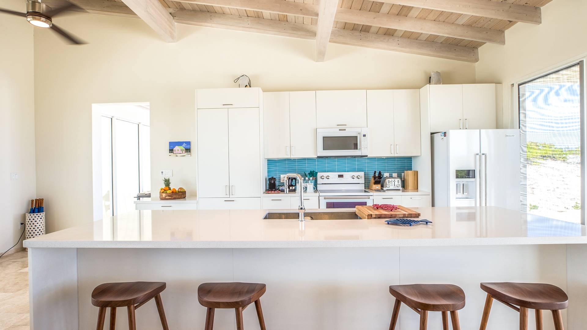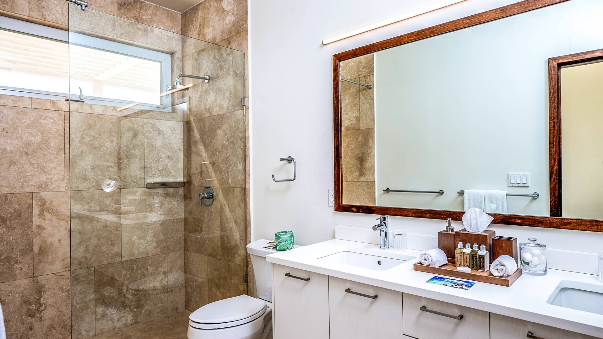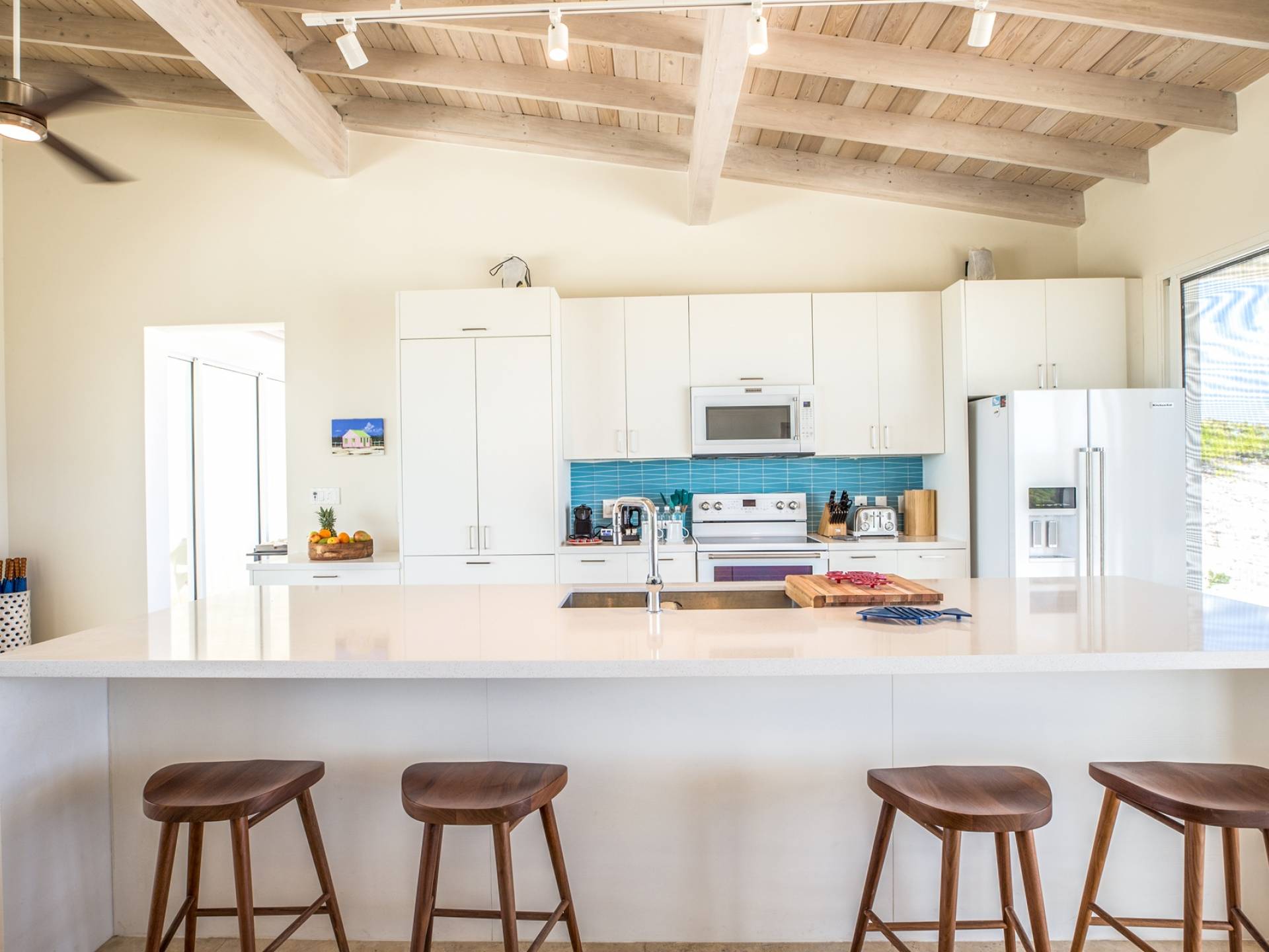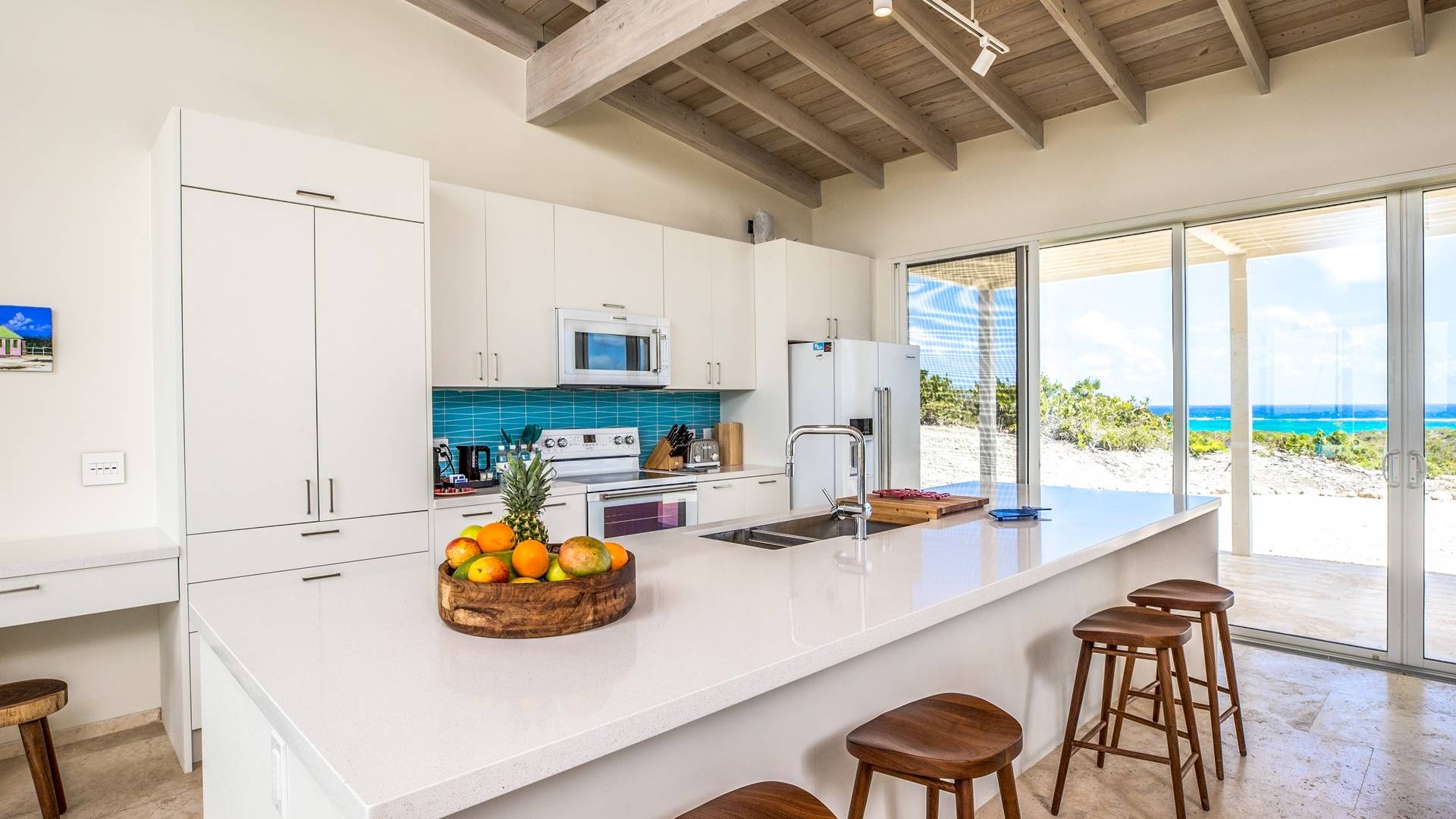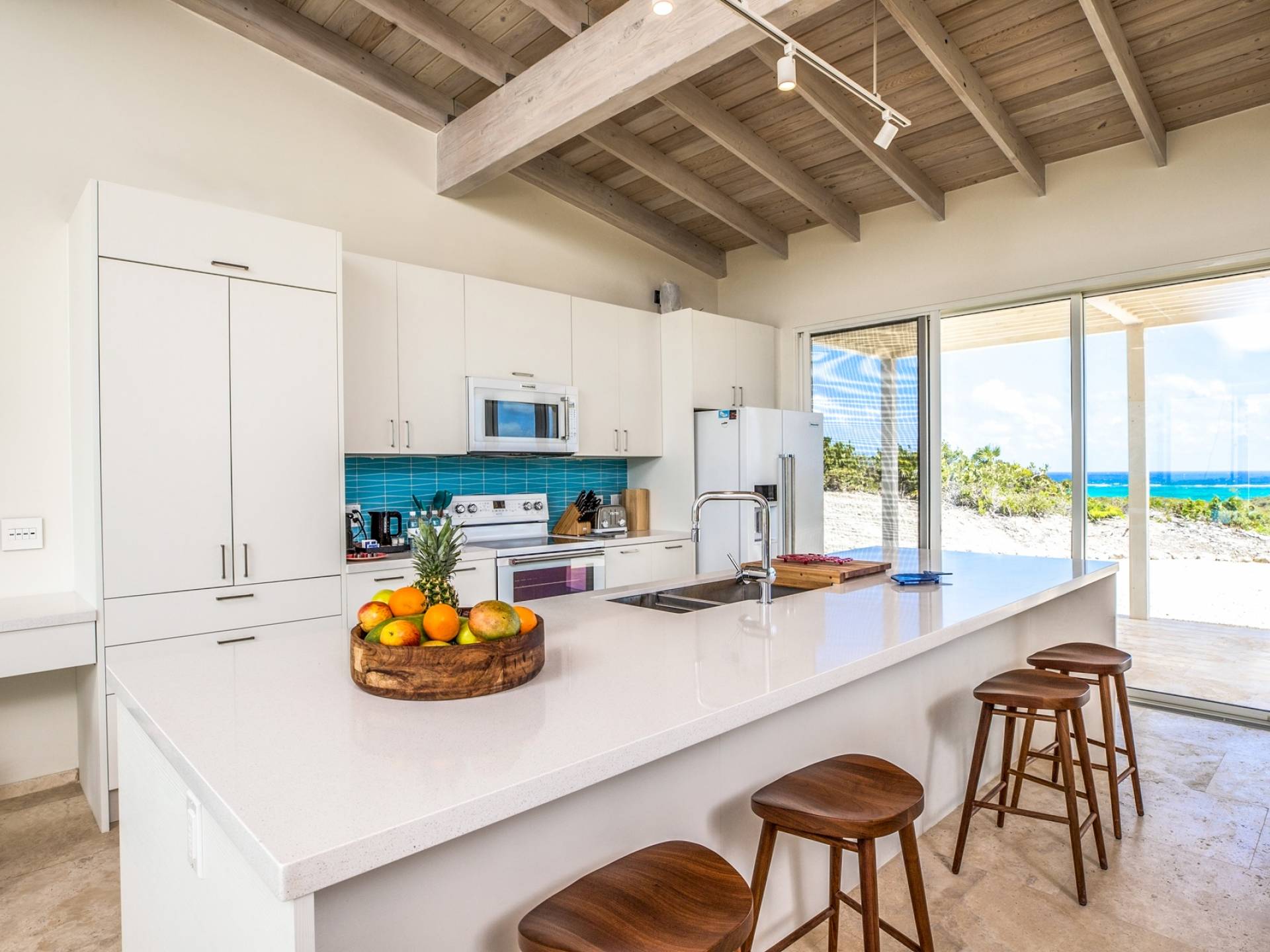 Open the sliding glass foyer wall to let the outside in. The combination of dark re-purposed Brazilian barn wood furniture and cream-colored sofa and armchairs provide for a fresh clean tropical decor. The great room boasts WiFi, a large flat-screen TV along with a Sonos system and CD/DVD player. The ideal island getaway, tranquil and serene, invites relaxed “barefoot” living. Breathtaking views defy belief but can easily convince you that you are the only folks on the planet. And when the gentle night envelopes the stars, seemingly so close as to be able to grasp one, will charm and captivate.