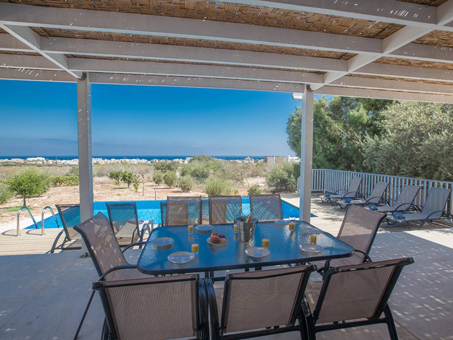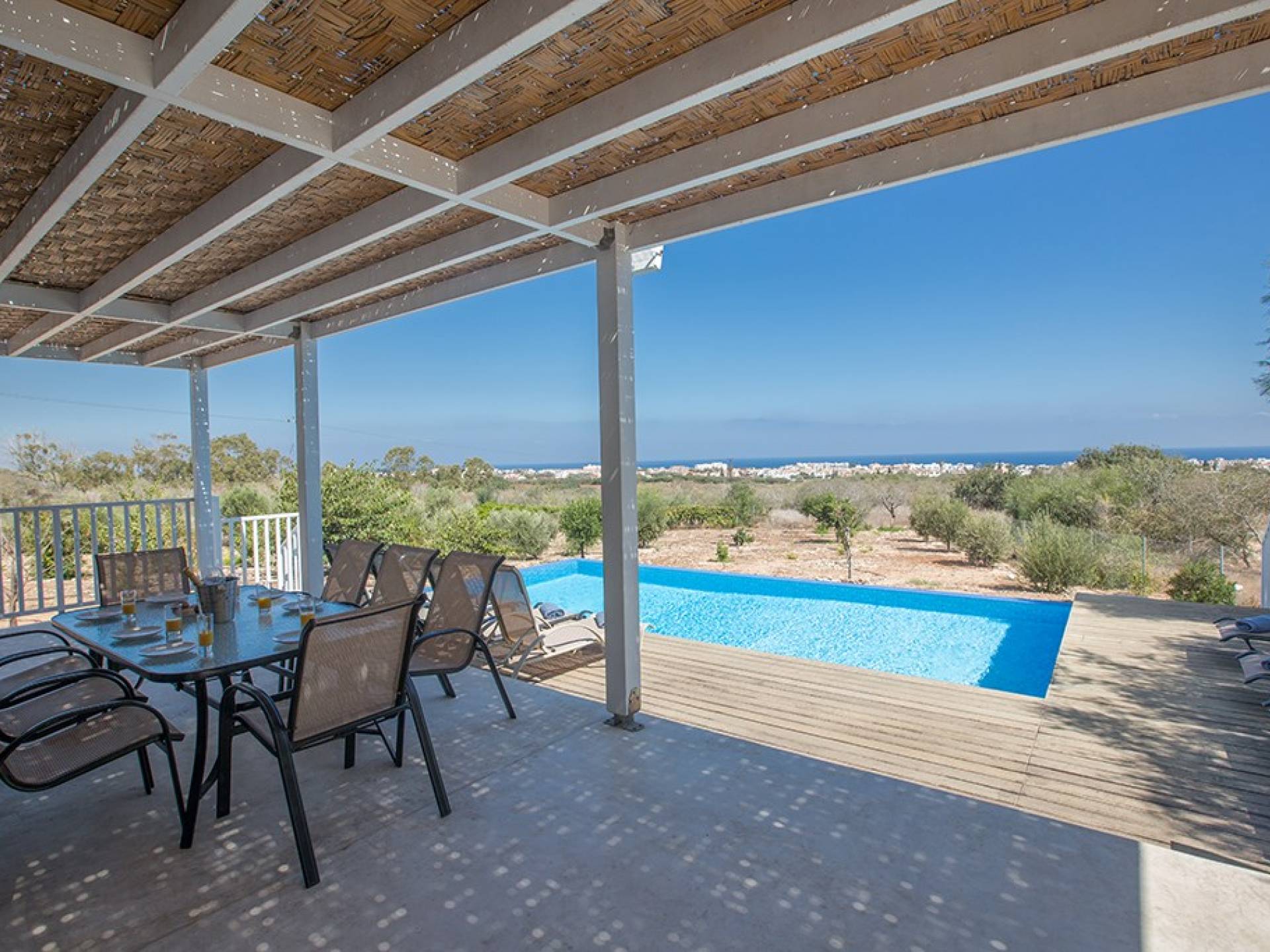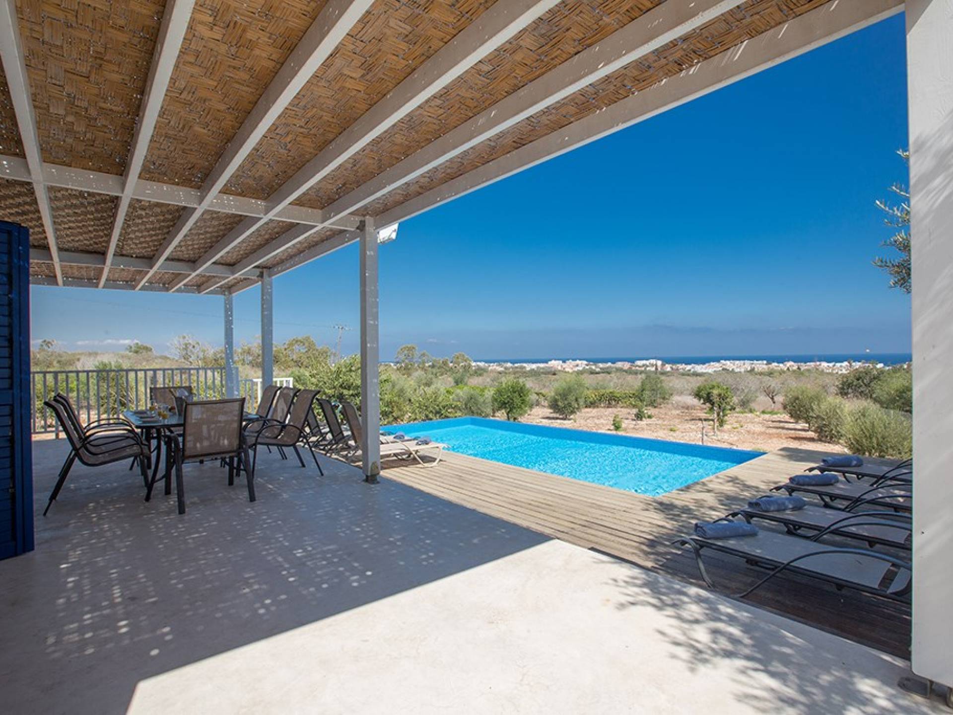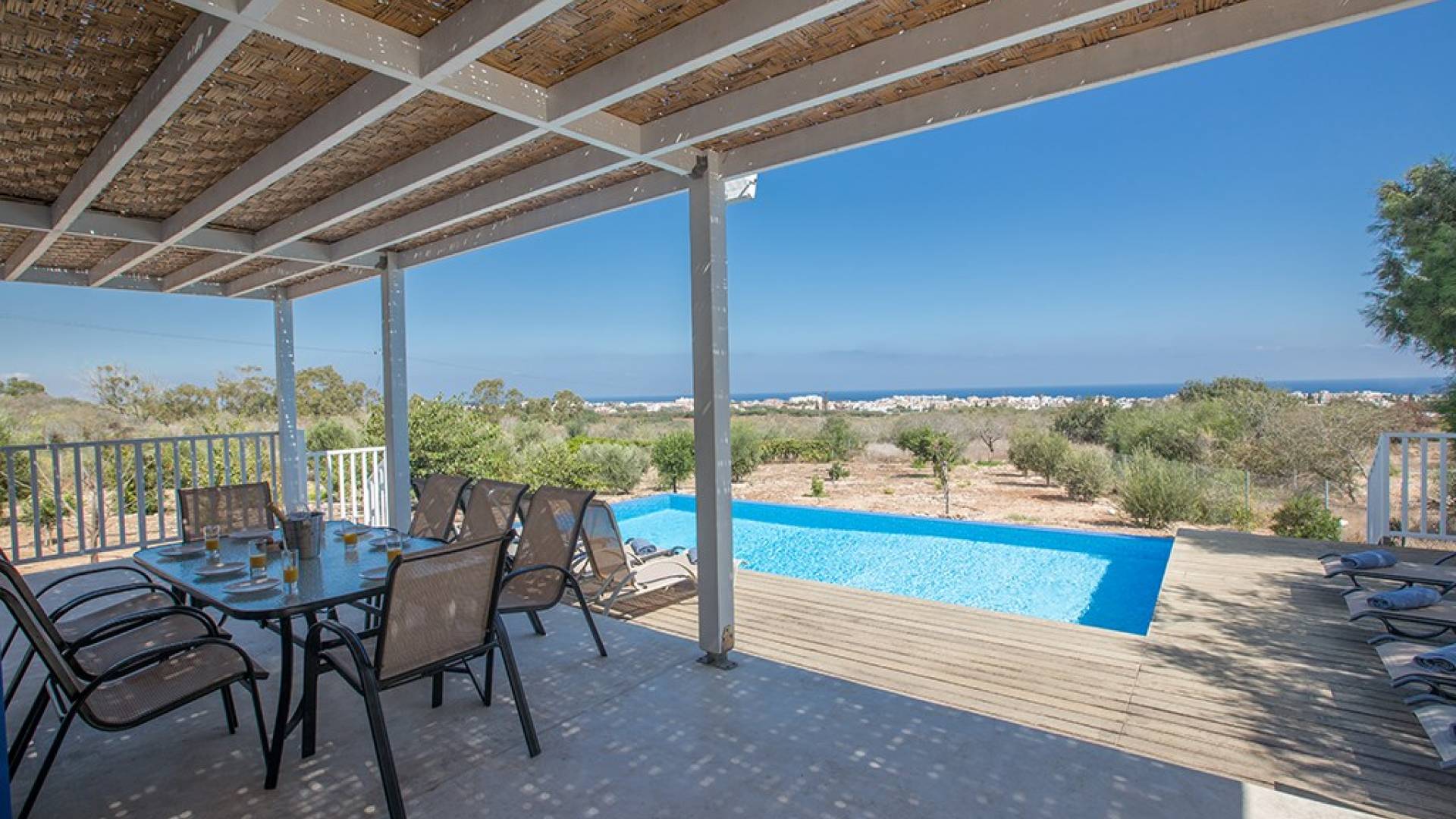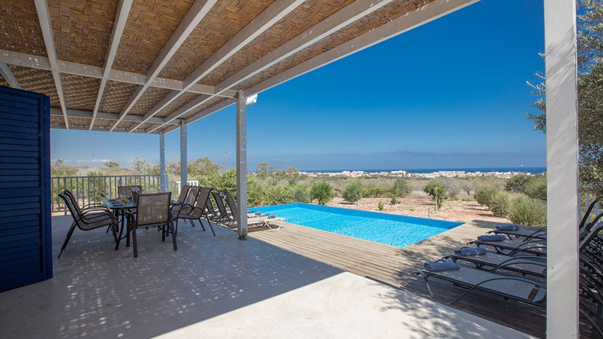 Afuera, en el jardín, encontrará un comedor exterior a la sombra, barbacoa, tumbonas y piscina privada con vistas al mar rodeada de una selección de árboles frutales. Una hermosa y moderna villa equipada con todo lo que pueda necesitar para su descanso relajante.