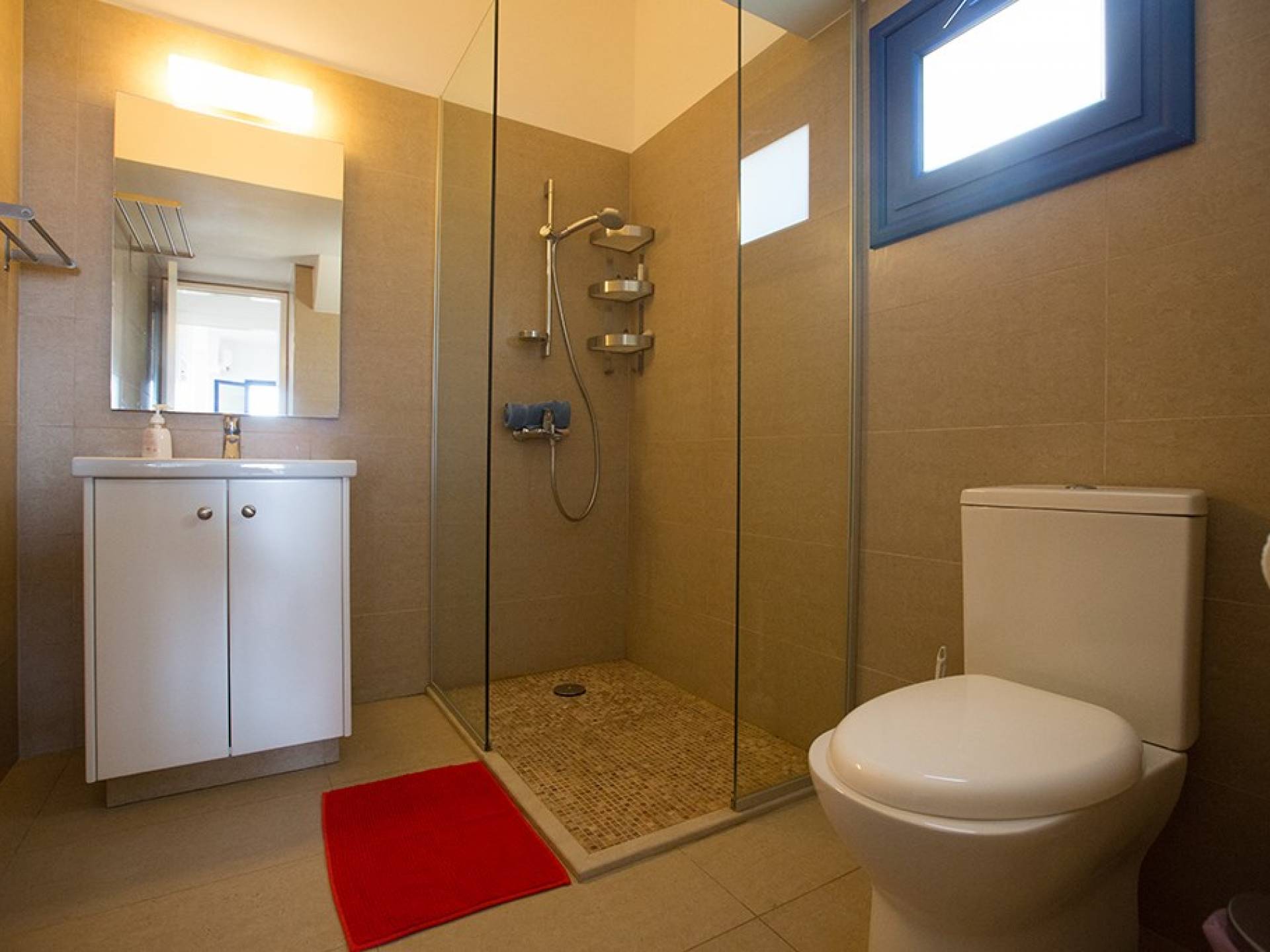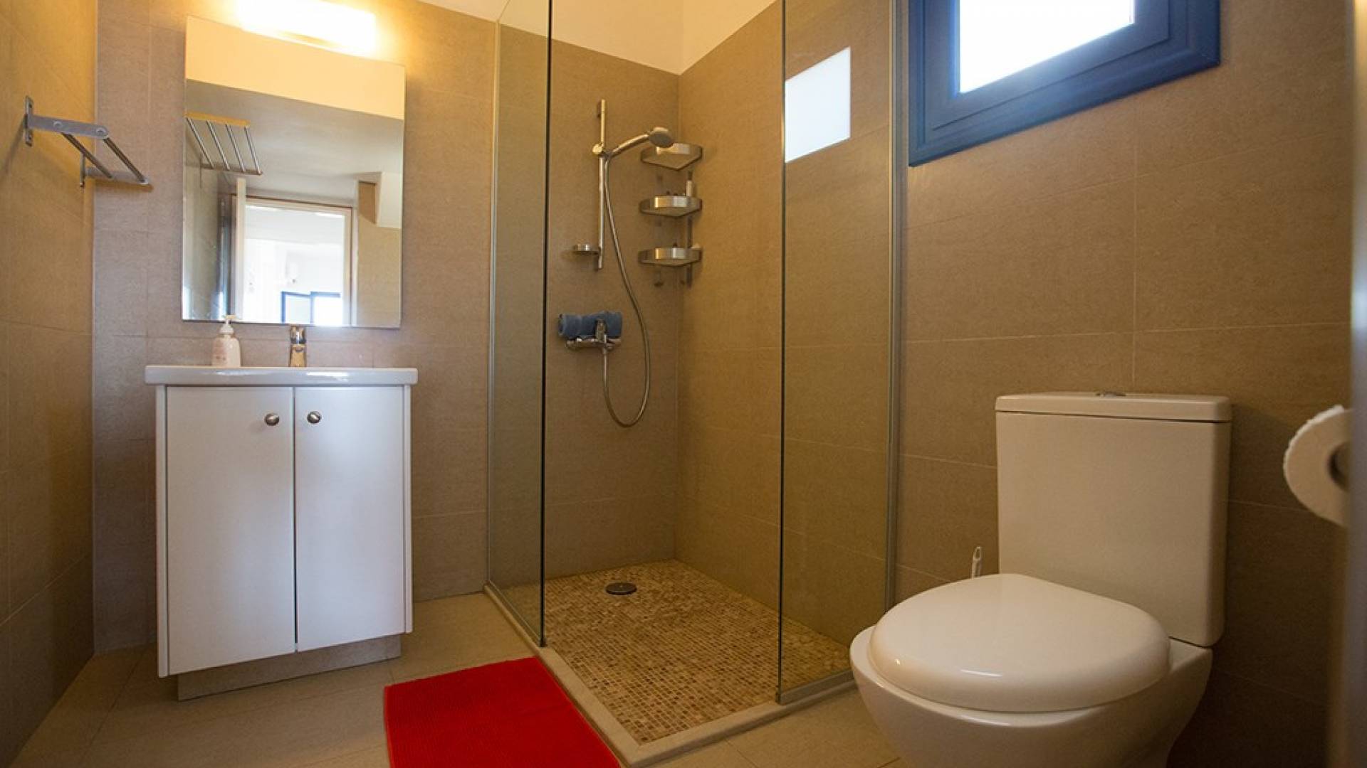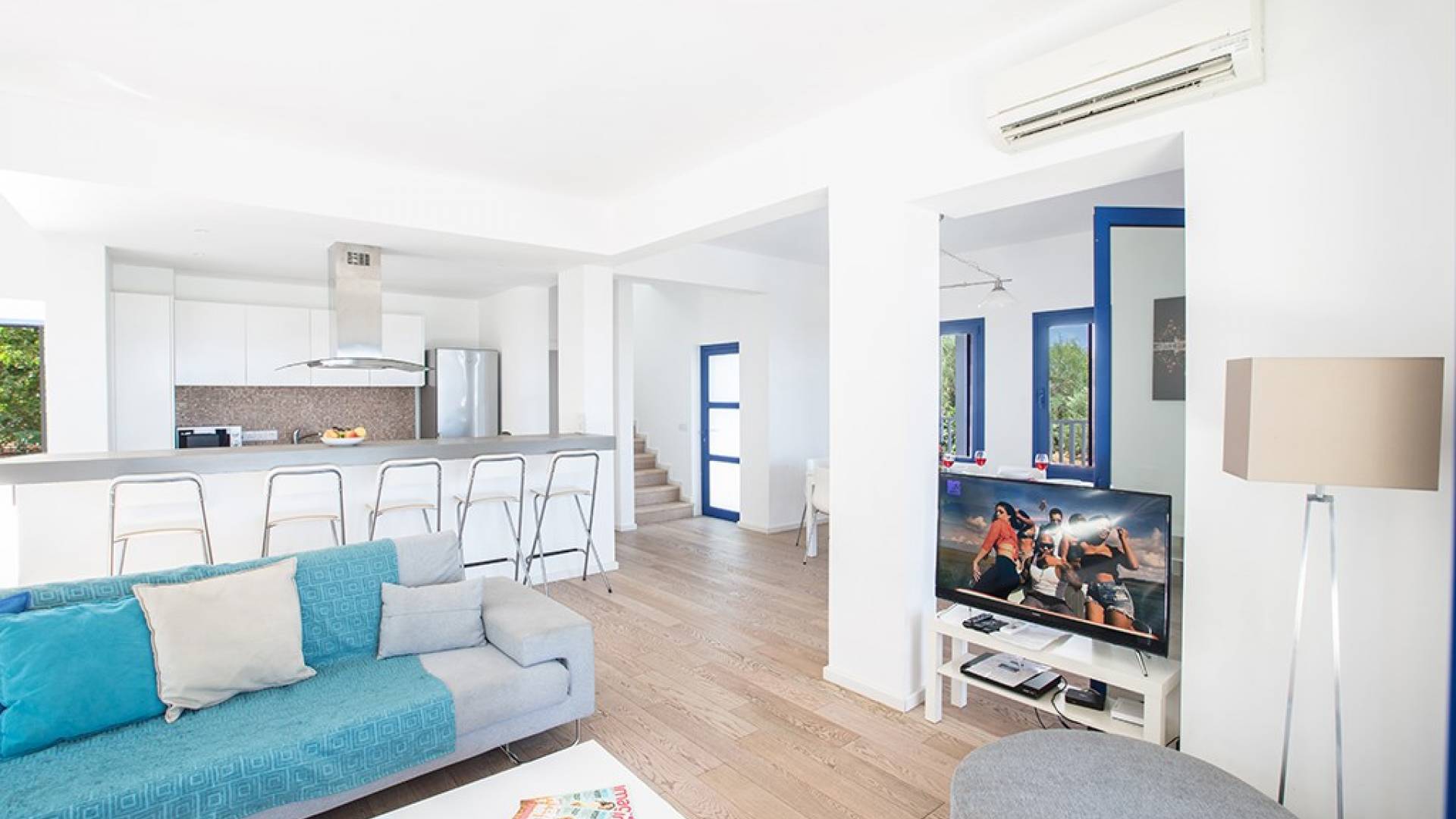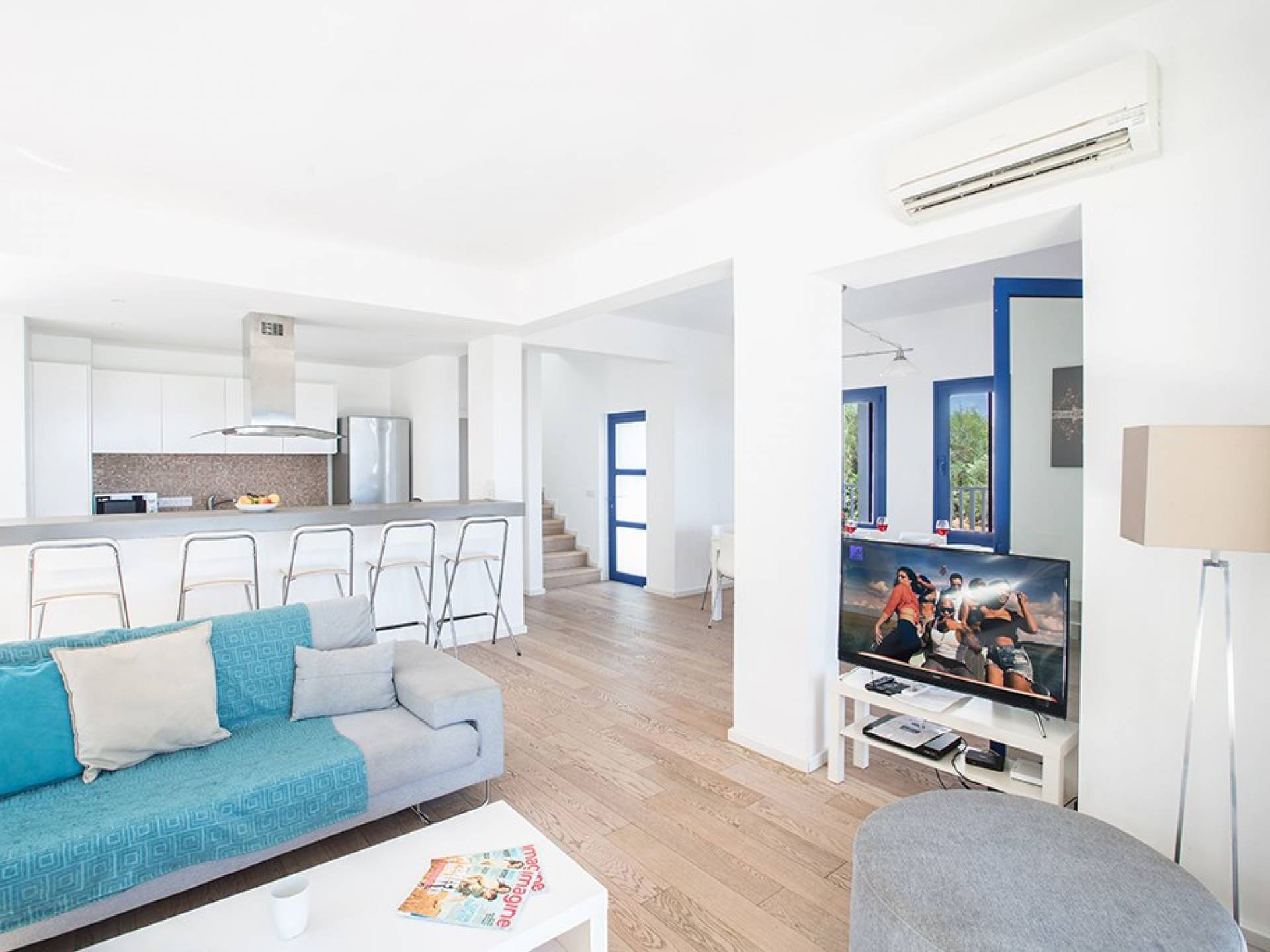 Al entrar en la villa, encontrará una sala de estar, un comedor y una cocina de planta abierta. La sala de estar cuenta con un televisor de pantalla ancha, TV satelital completa del Reino Unido (incluido SKY) y un reproductor de DVD. La cocina moderna cuenta con una elegante isla con vitrocerámica, campana extractora y barra de desayuno con capacidad para cinco personas. También tiene todos los electrodomésticos esenciales, incluyendo una nevera/congelador, microondas y una máquina de café espresso. El comedor tiene capacidad para 8 personas. En la planta baja también encontrarás uno de los dormitorios con cama de matrimonio, armarios empotrados, mesitas de noche y un aseo con ducha.
