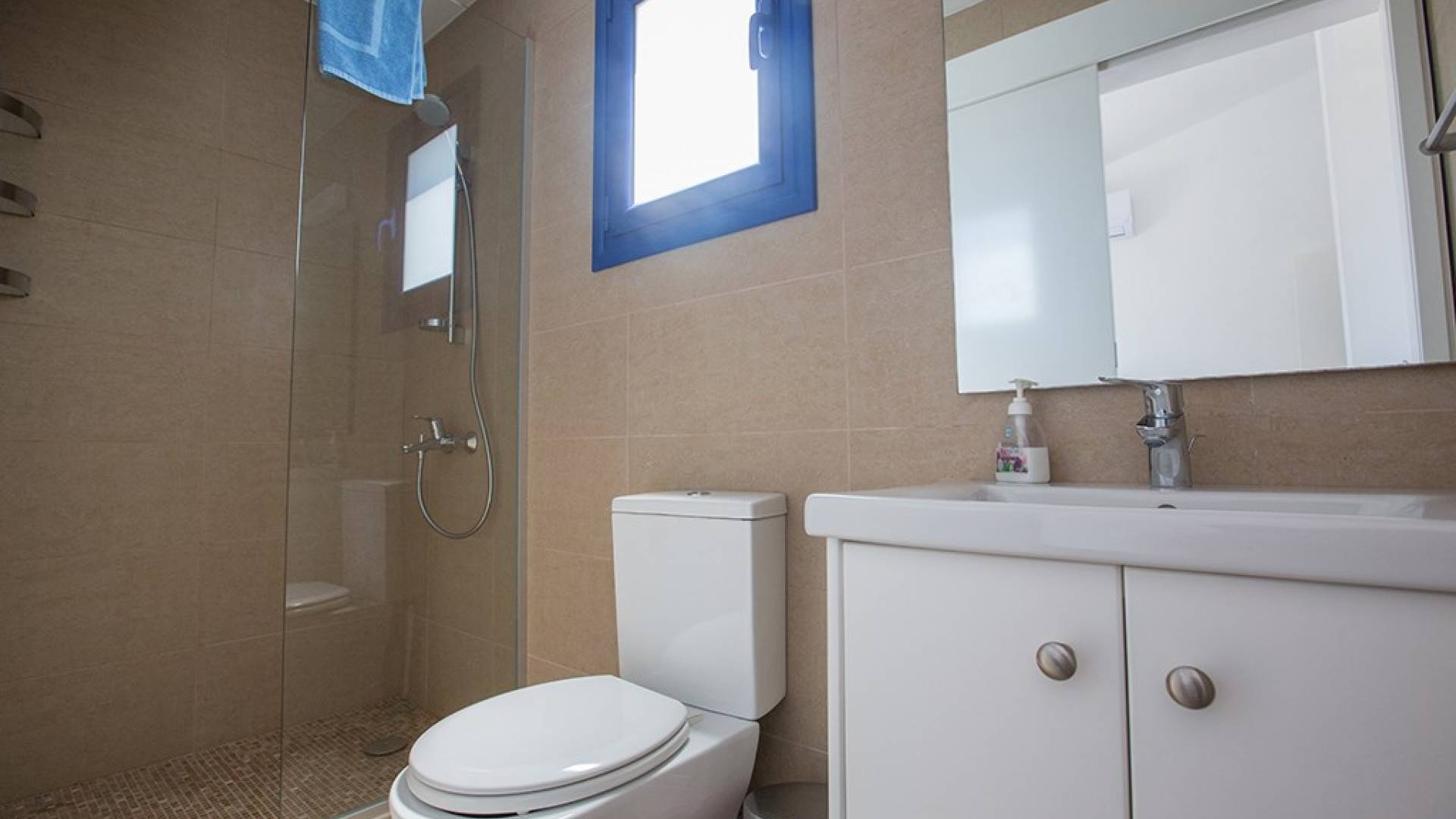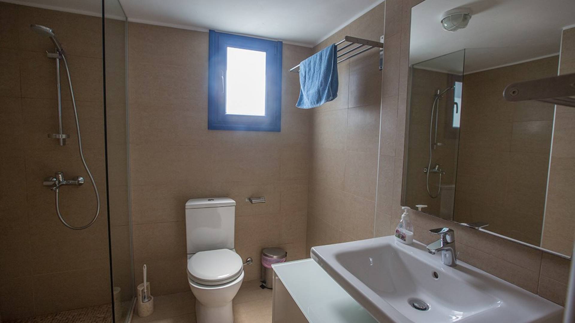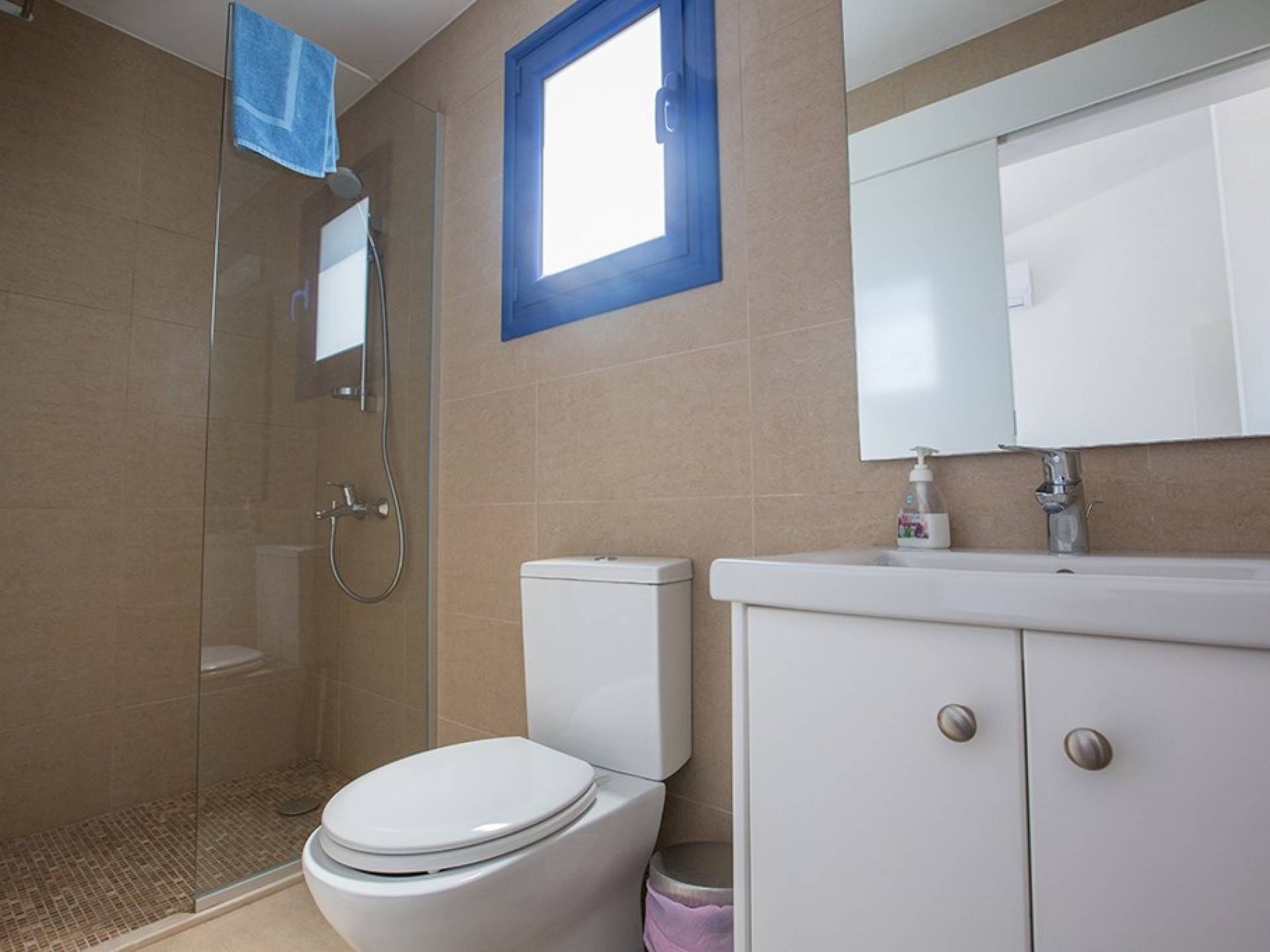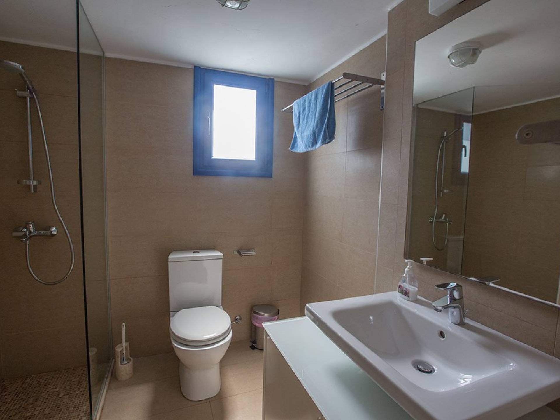 Arriba están los tres dormitorios restantes junto con el baño familiar. El dormitorio principal tiene baño en suite con ducha y WC, cama doble, armarios empotrados y mesitas de noche. El segundo dormitorio también tiene una cama doble y armarios empotrados y mesitas de noche. El tercer dormitorio tiene una cama litera, armarios empotrados y mesitas de noche. El baño familiar cuenta con ducha y WC.