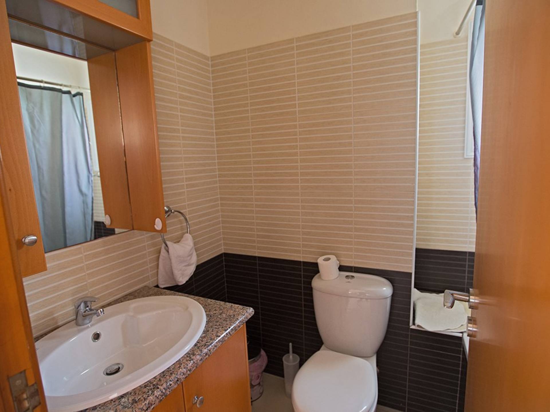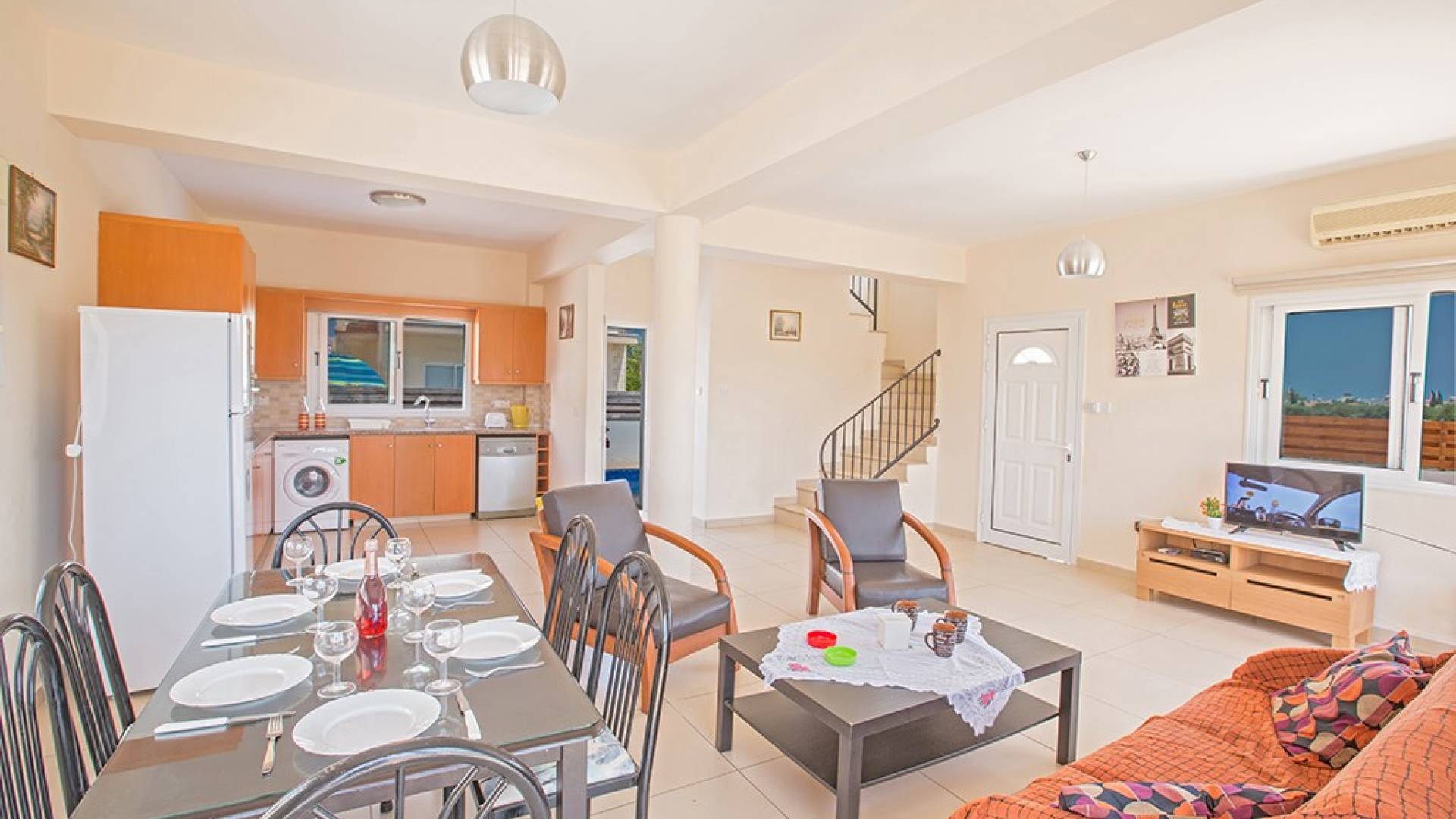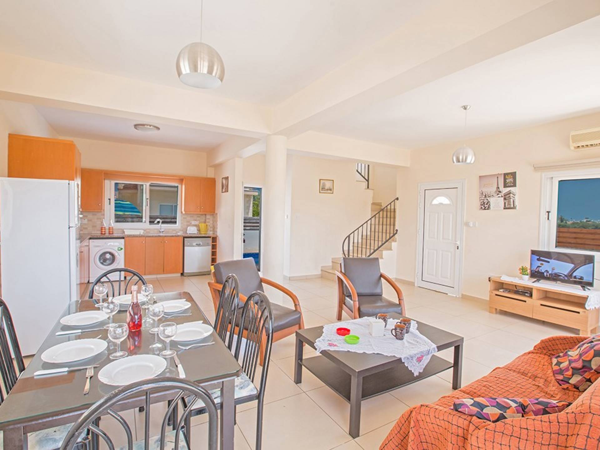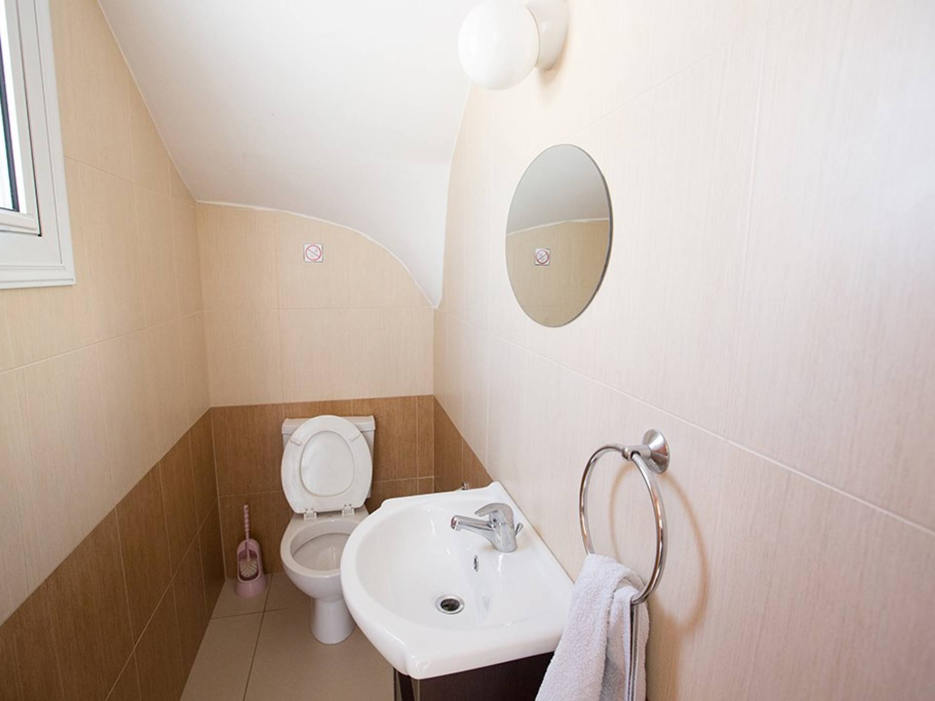 En la planta baja, encontrará una gran sala de estar, cocina y comedor de planta abierta. El salón cuenta con cómodos sofás y televisión de pantalla panorámica con satélite. El comedor tiene una mesa y sillas para 6 personas y la cocina está totalmente equipada con todos los electrodomésticos modernos que necesitará durante su estadía. También hay un W / C en este piso.