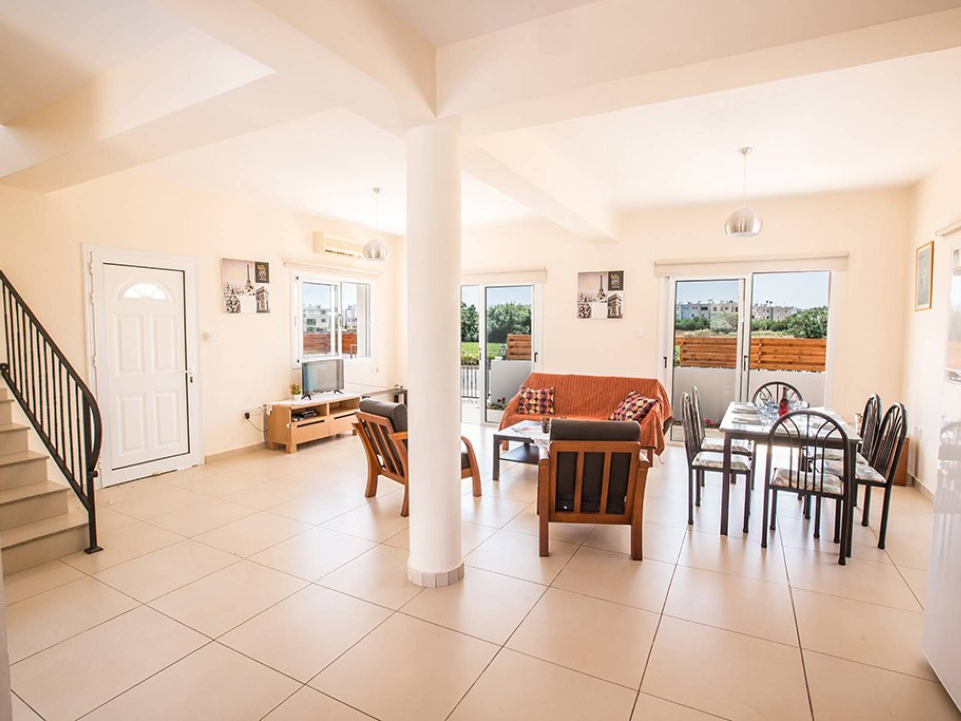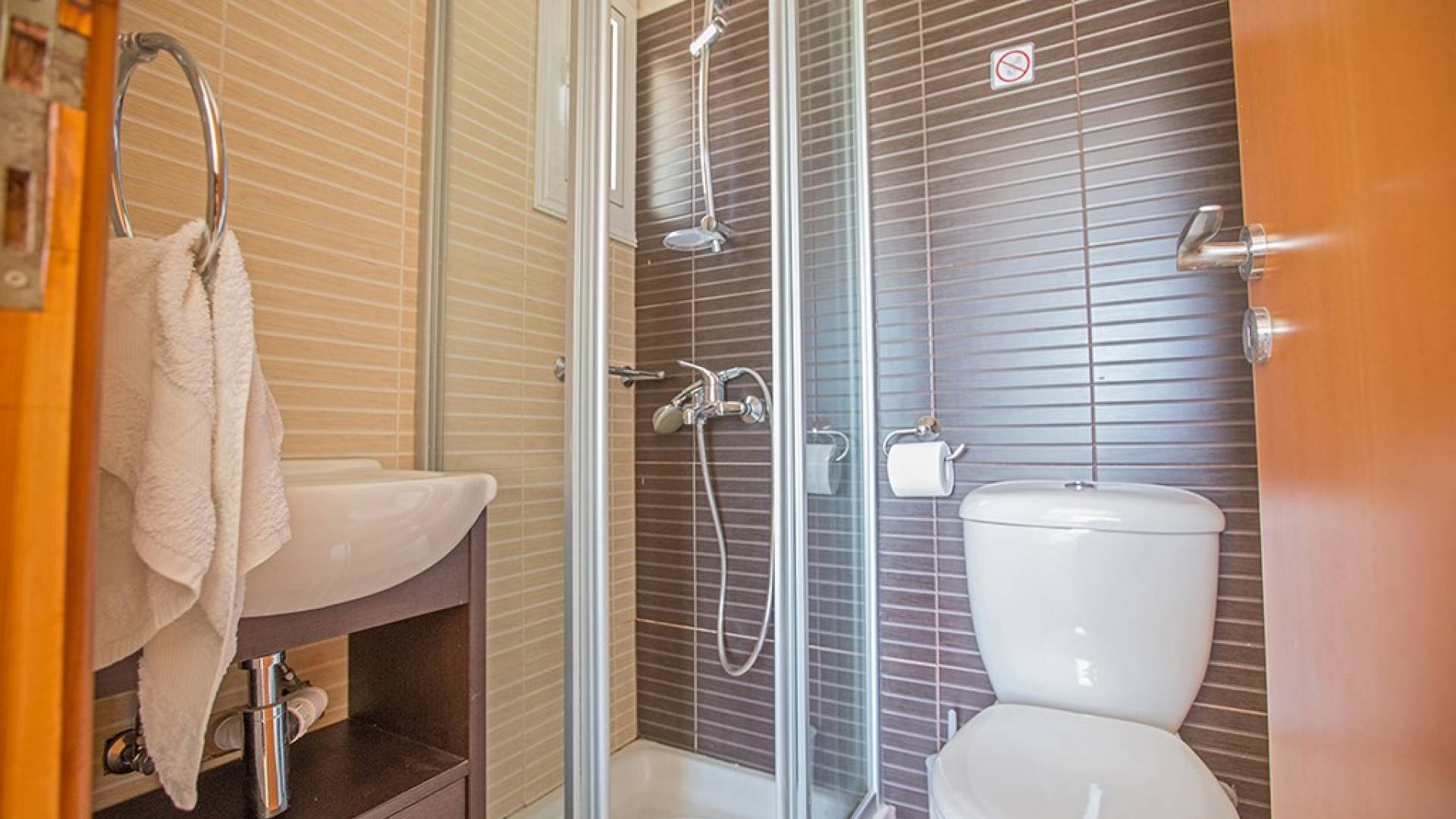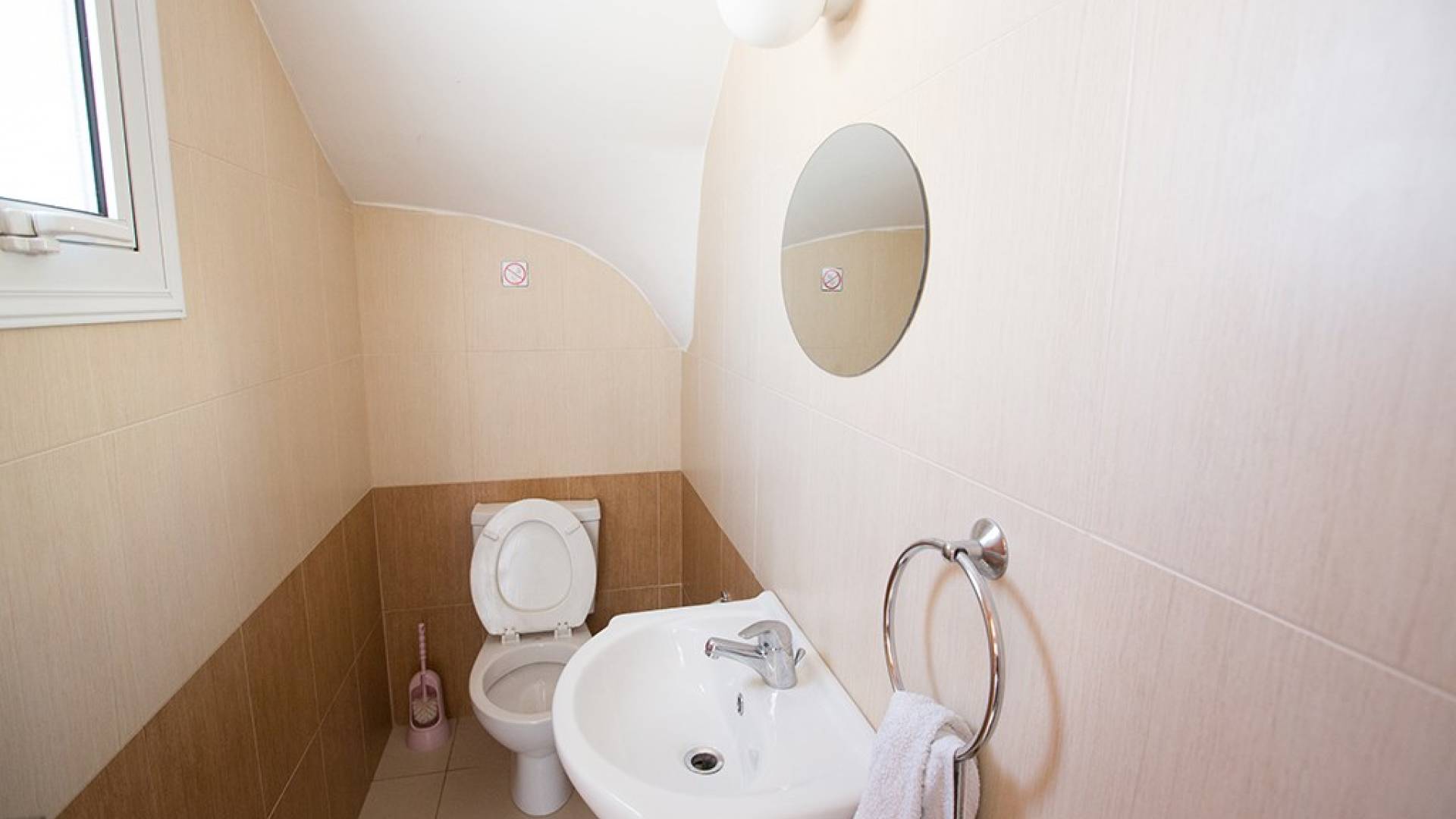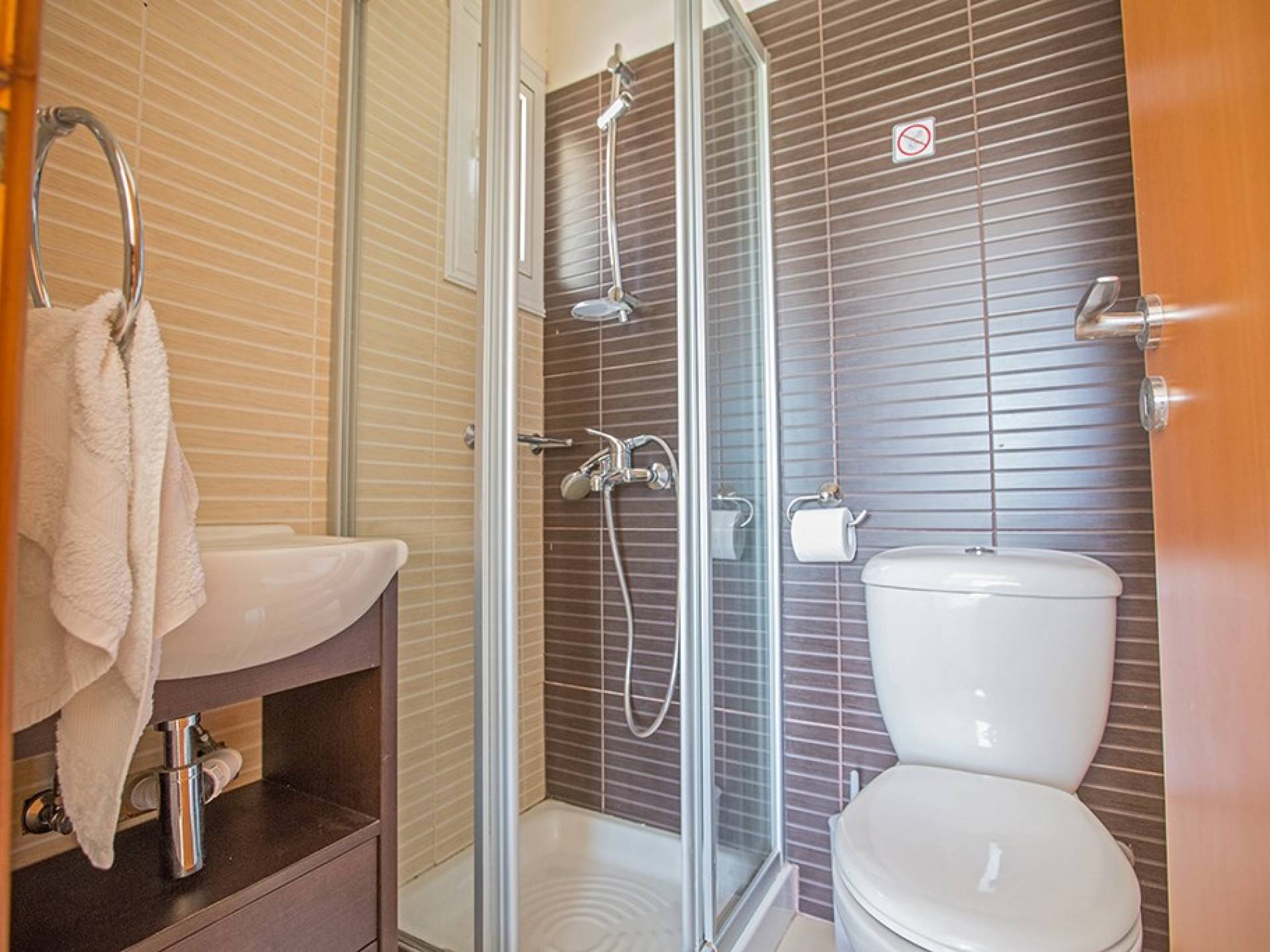 En la planta baja, encontrará una gran sala de estar, cocina y comedor de planta abierta. El salón cuenta con cómodos sofás y televisión de pantalla panorámica con satélite. El comedor tiene una mesa y sillas para 6 personas y la cocina está totalmente equipada con todos los electrodomésticos modernos que necesitará durante su estadía. También hay un W / C en este piso.