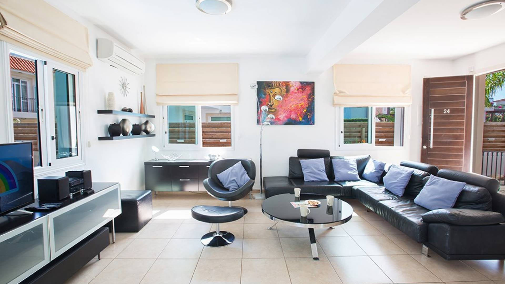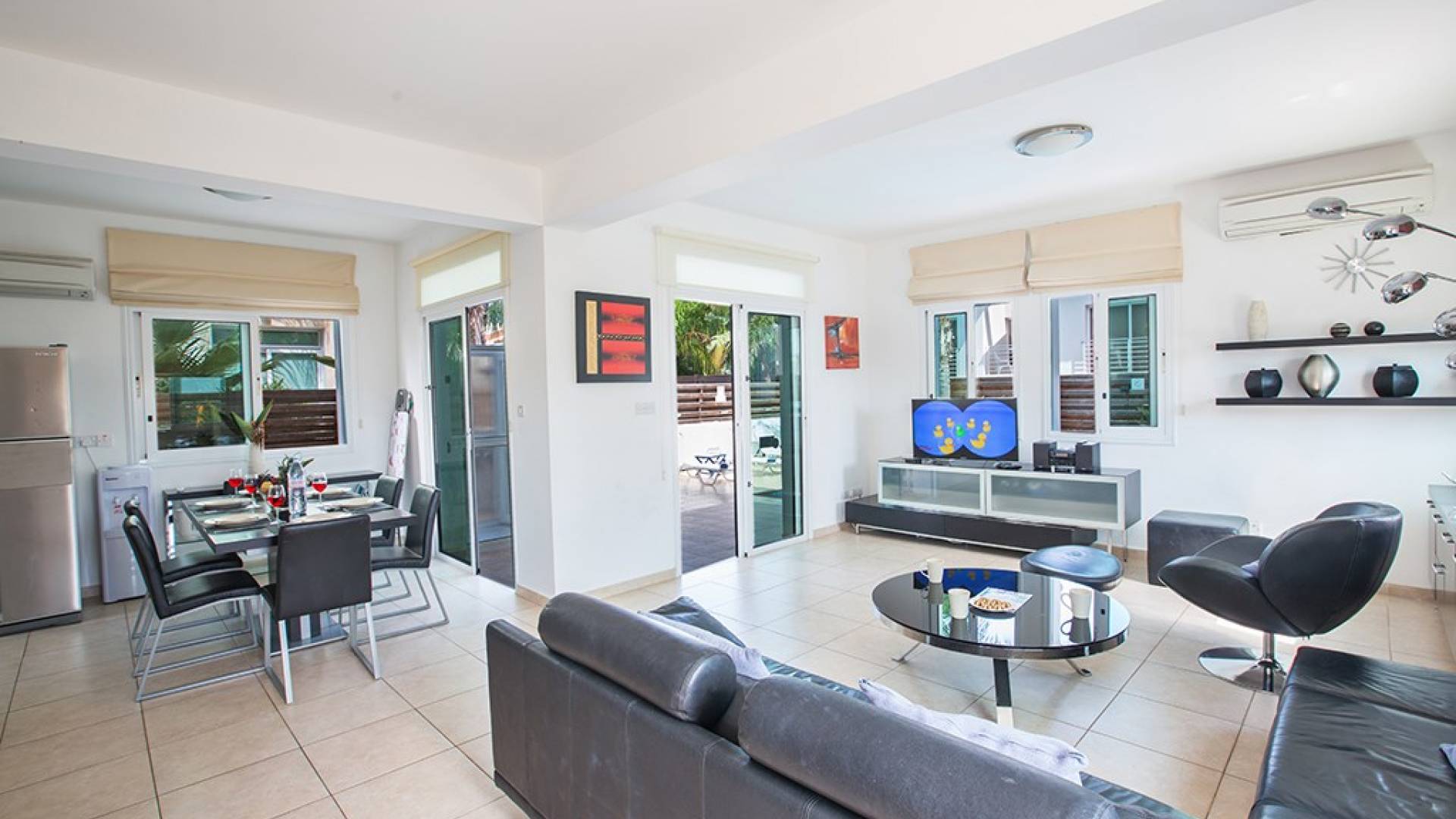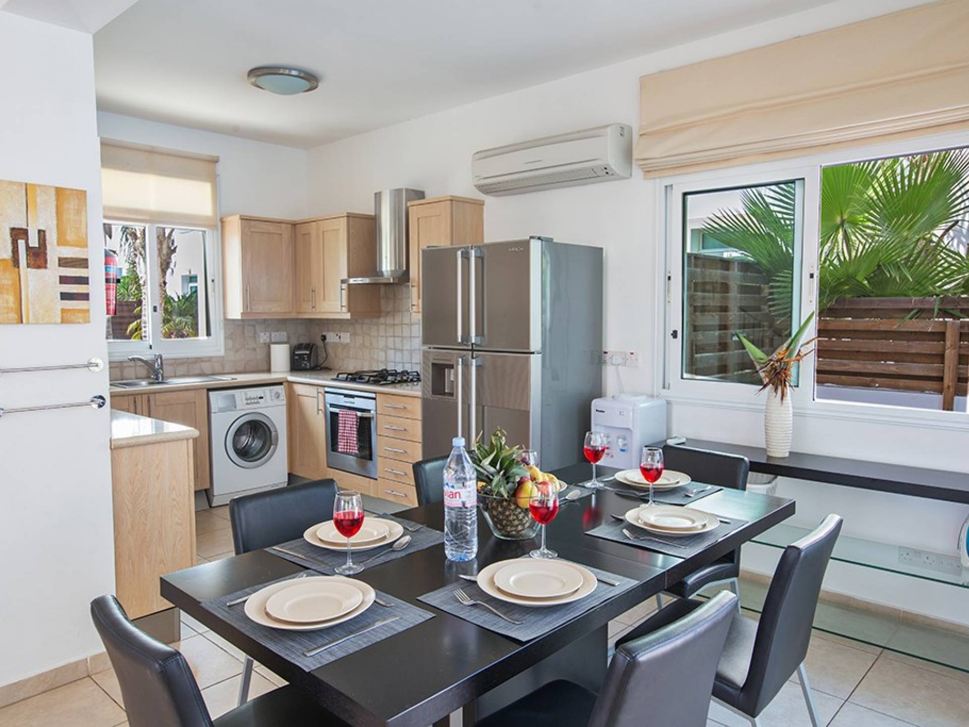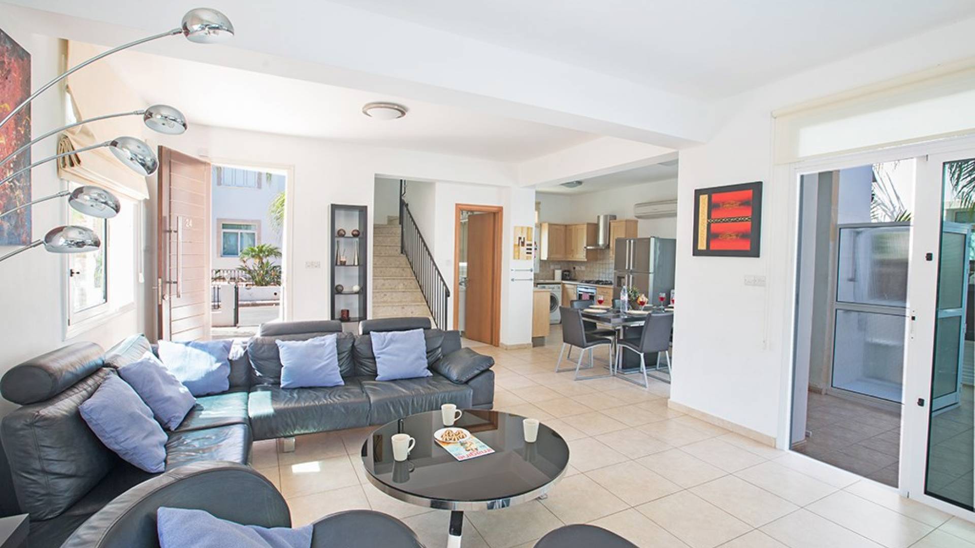 En el interior, la villa está muy bien amueblada con una decoración moderna. La planta baja cuenta con una sala de estar de planta abierta, un comedor con capacidad para 8 personas y una cocina totalmente equipada. Se proporciona un televisor de pantalla ancha, reproductor de DVD, televisión por satélite, WIFI y estación de conexión para iPod/iPhone. También hay un W/C en este piso.