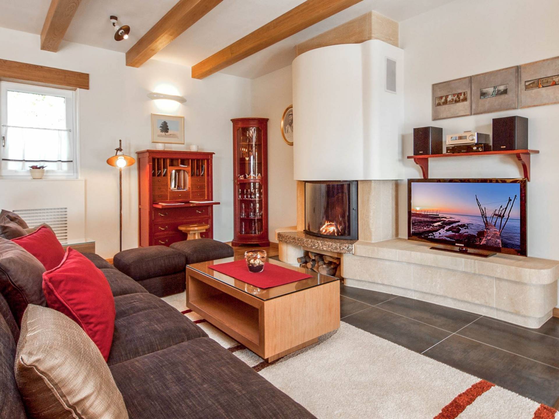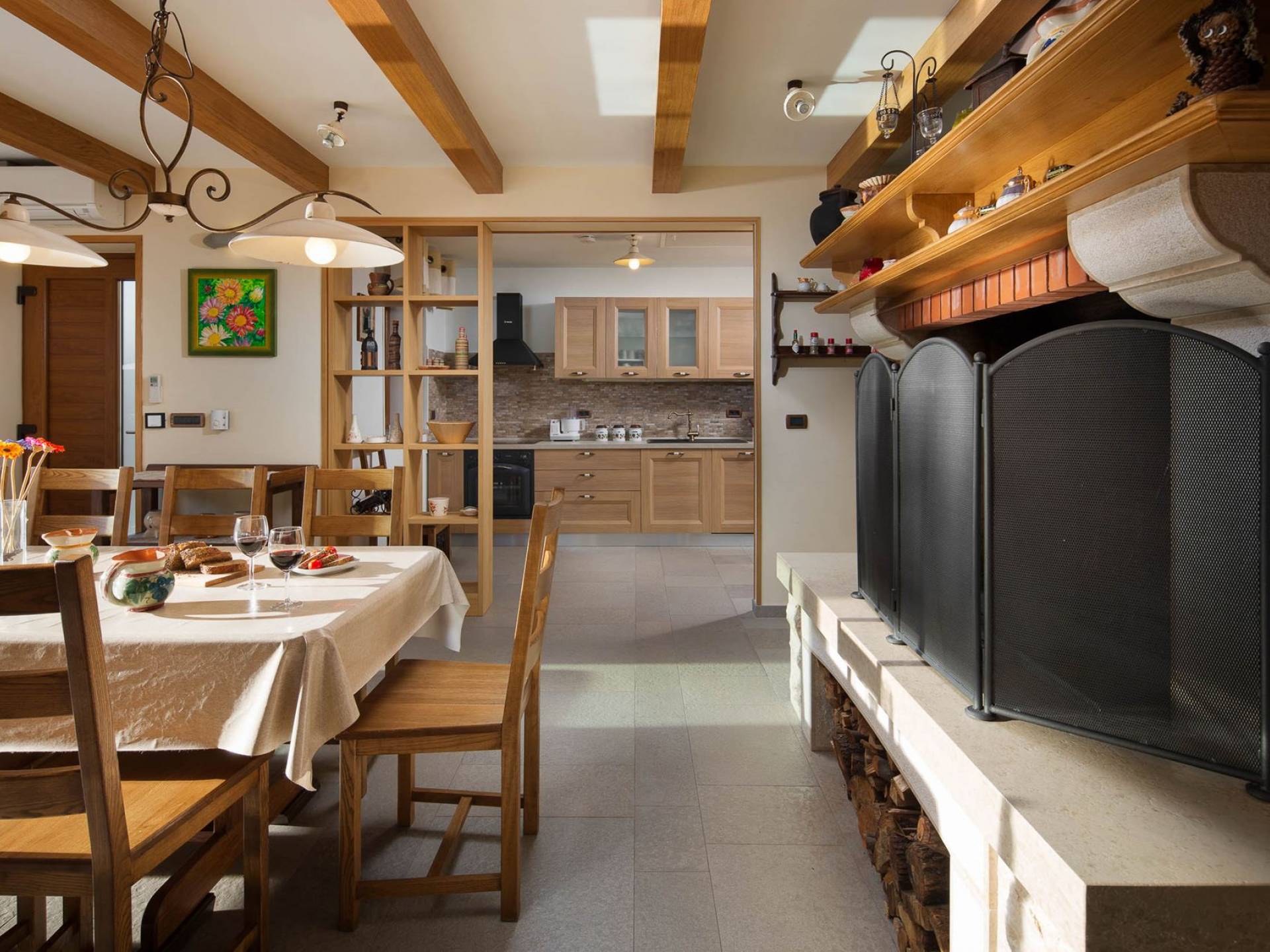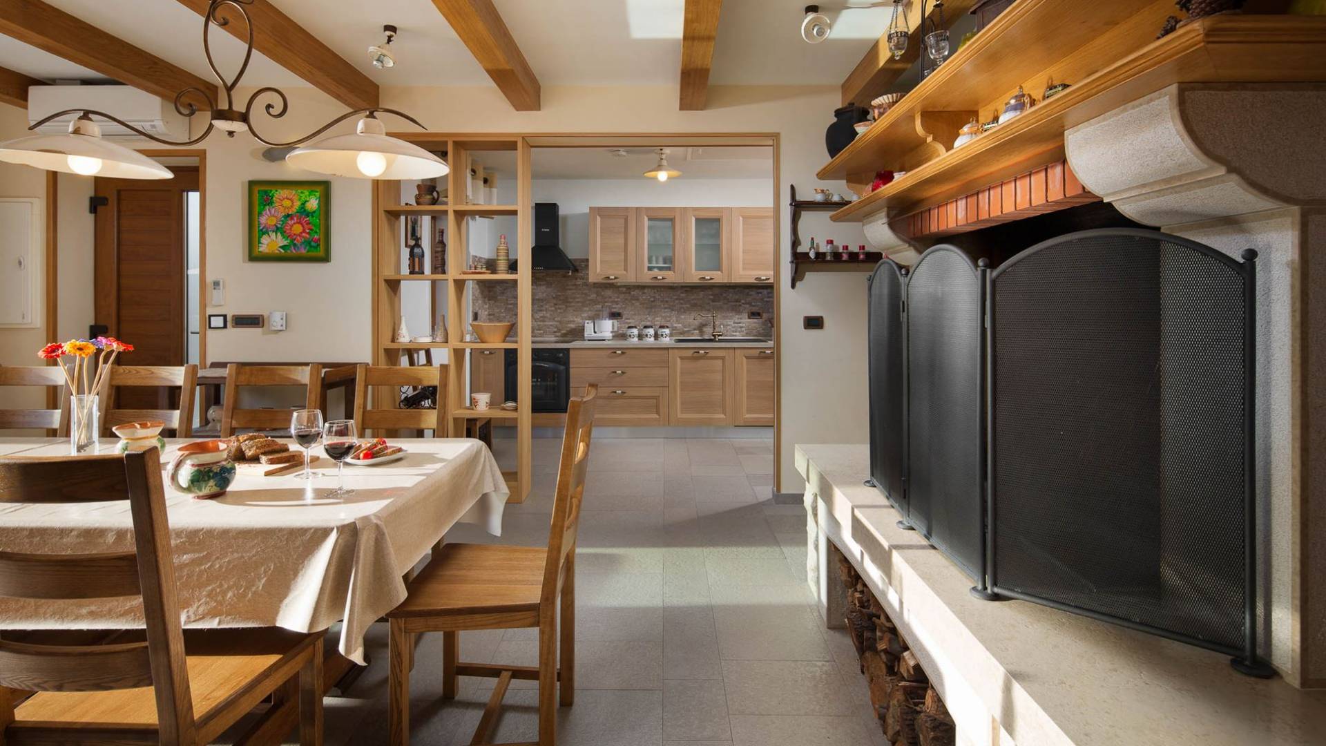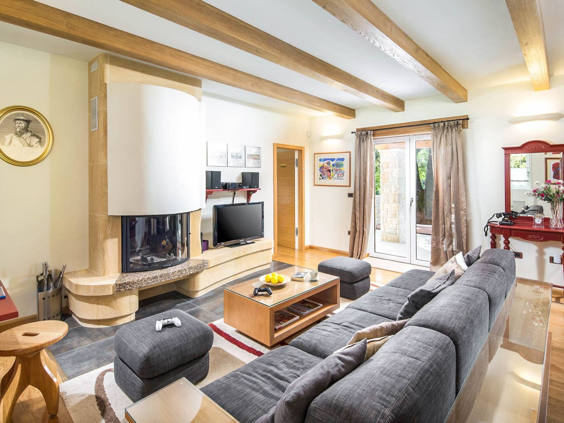 La parte de diario, que se caracteriza por la limpieza de líneas, la sencillez y la modernidad, está situada junto a una gran chimenea de piedra moderna, pensada para relajarse con un libro, el fuego de la chimenea, ver la televisión o películas en DVD y escuchar a la música La sala de estar fue refinada por obras de pintores de la academia local que confirman la auténtica historia de Labin, un lugar donde muchos artistas buscaron refugio e inspiración.