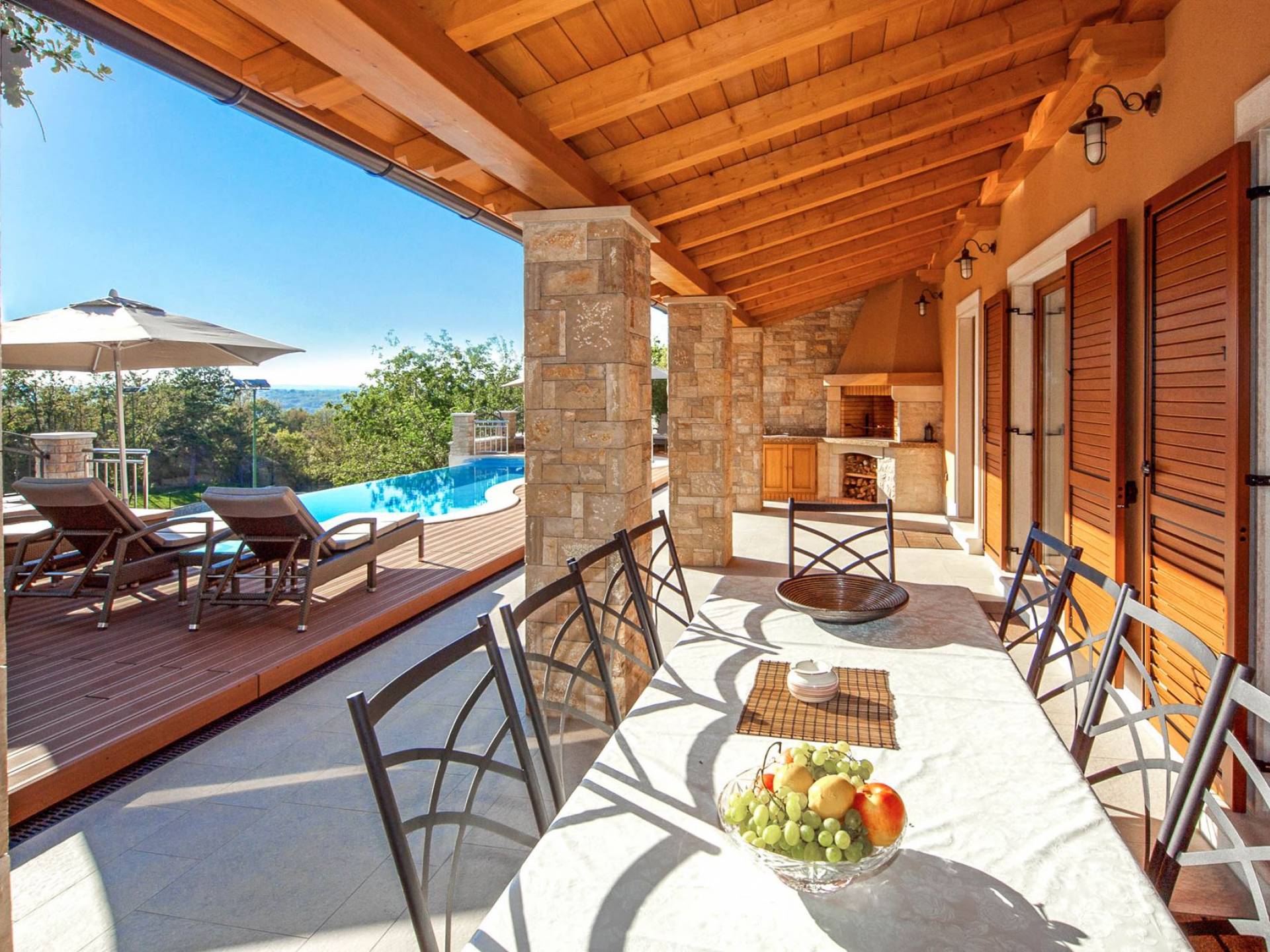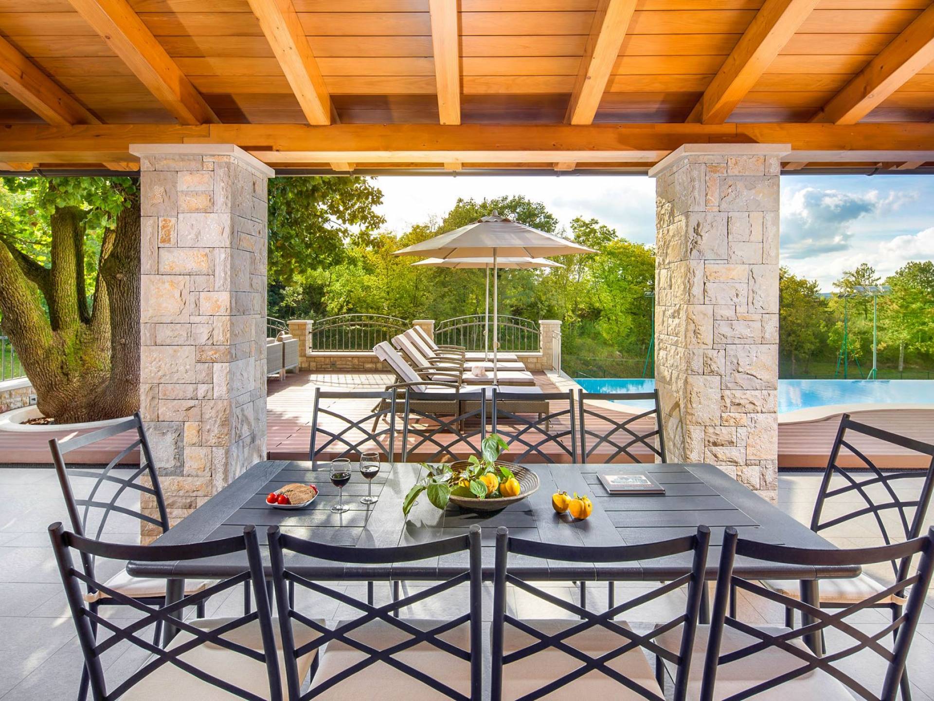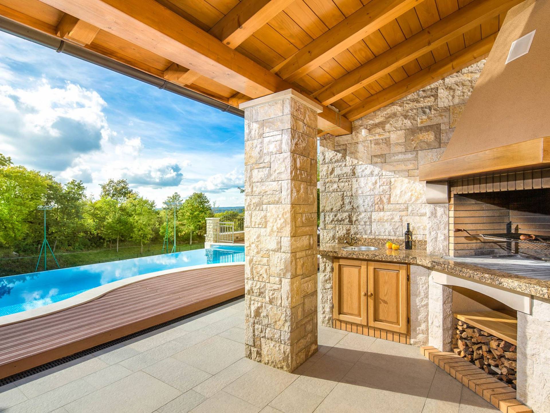 Gran terraza cubierta con elegante mobiliario de jardín, situada a la sombra de un roble centenario, se encuentra justo al lado de una bonita piscina que fluye naturalmente, como una cascada, a lo largo de un lado Debajo de la terraza cubierta, en su esquina junto a la piscina, hay una chimenea de piedra abierta para barbacoas. Este arreglo permite una estadía continua también para cenar al aire libre.