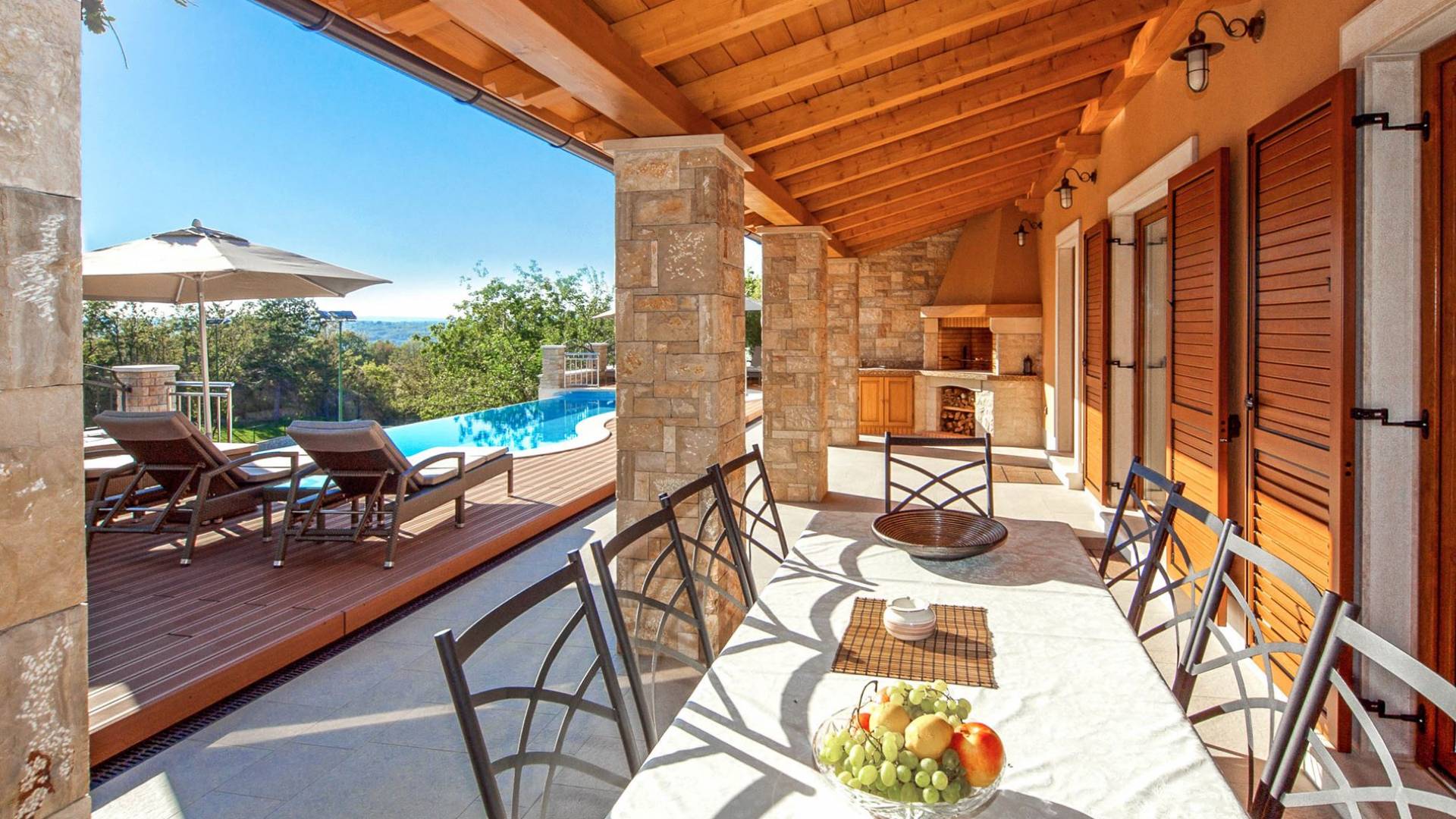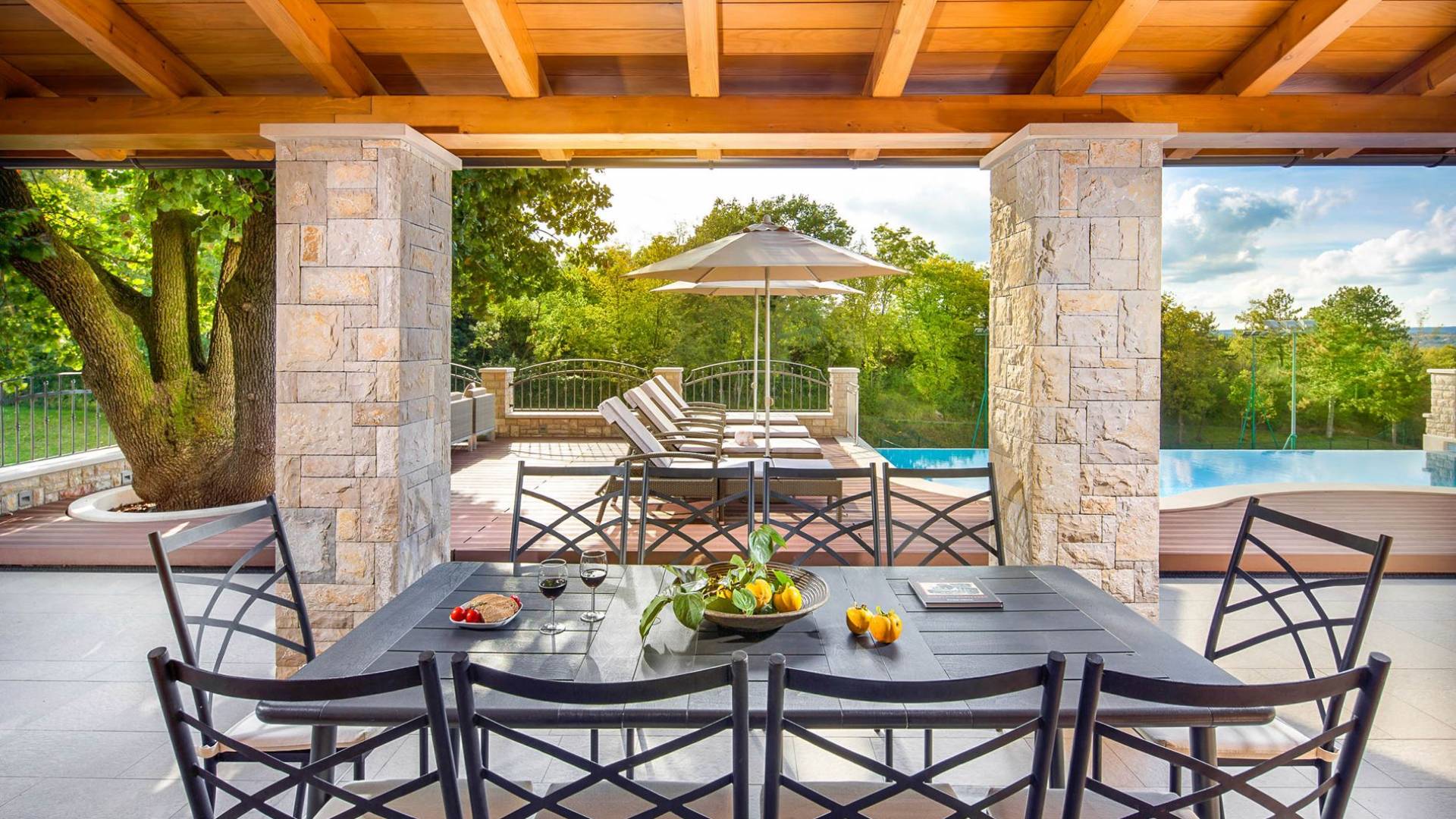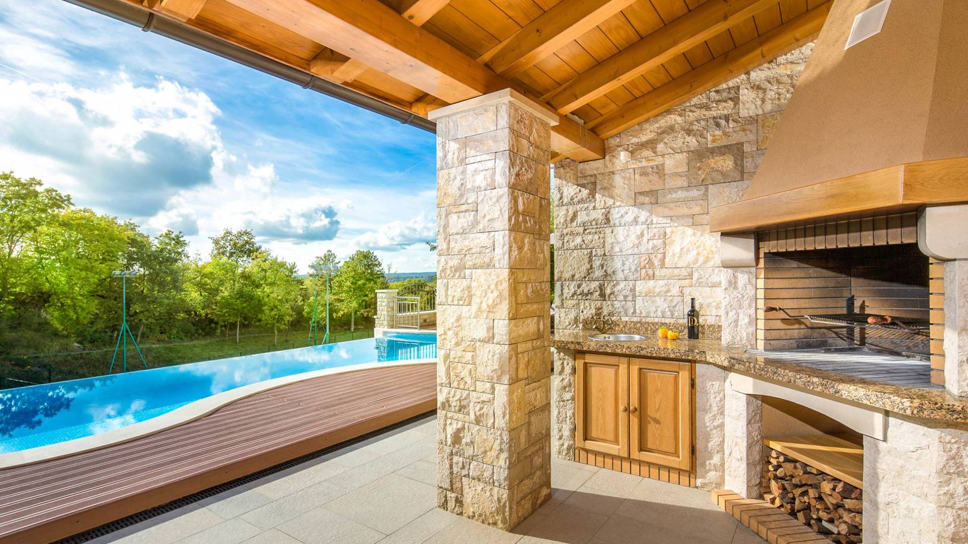 Gran terraza cubierta con elegante mobiliario de jardín, situada a la sombra de un roble centenario, se encuentra justo al lado de una bonita piscina que fluye naturalmente, como una cascada, a lo largo de un lado Debajo de la terraza cubierta, en su esquina junto a la piscina, hay una chimenea de piedra abierta para barbacoas. Este arreglo permite una estadía continua también para cenar al aire libre.