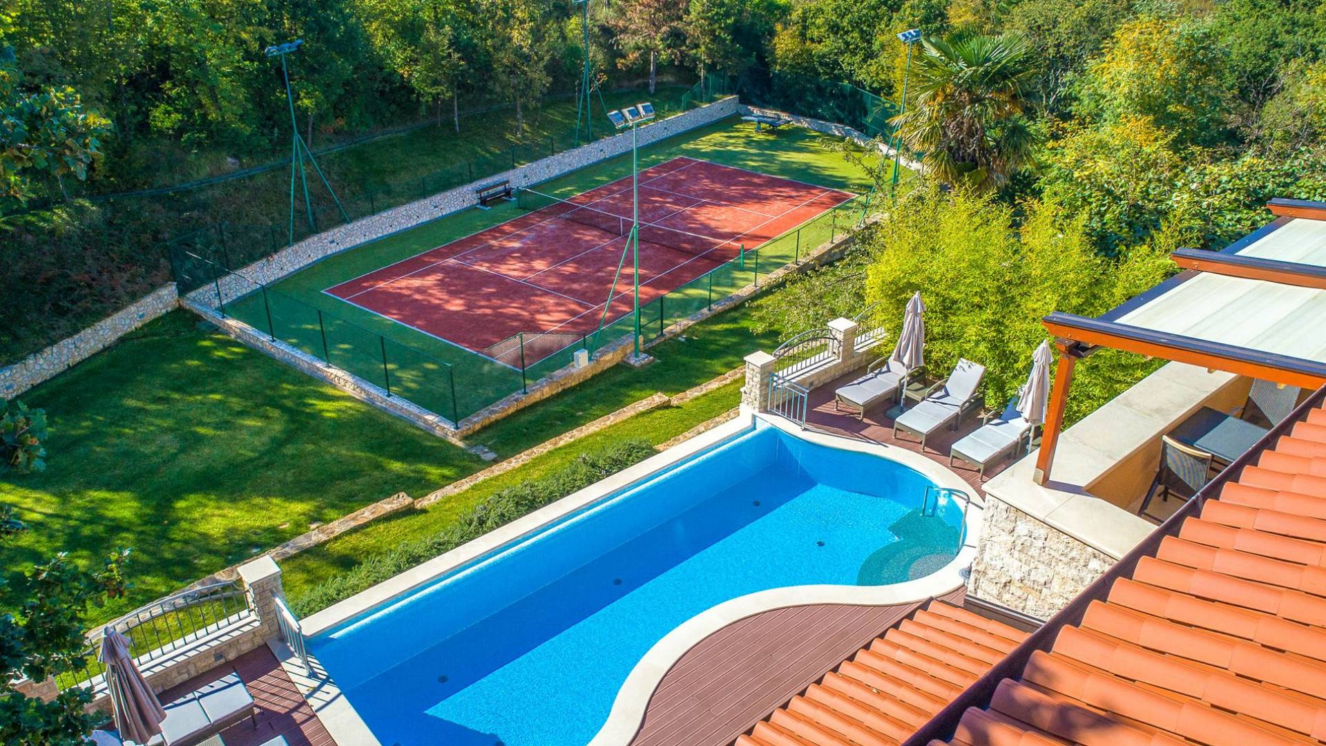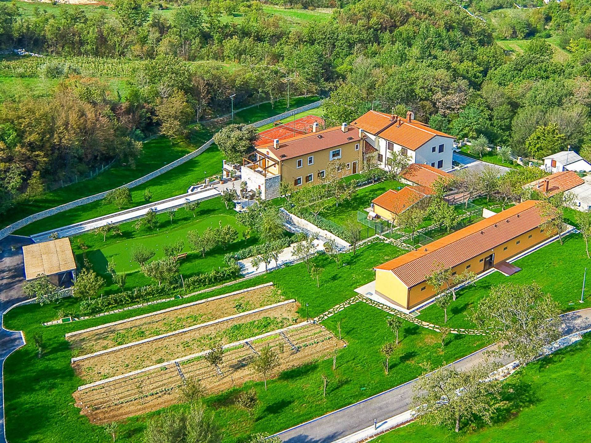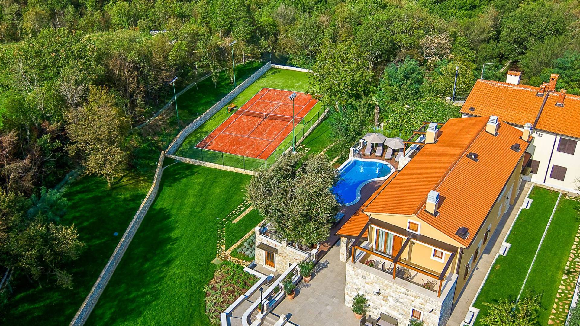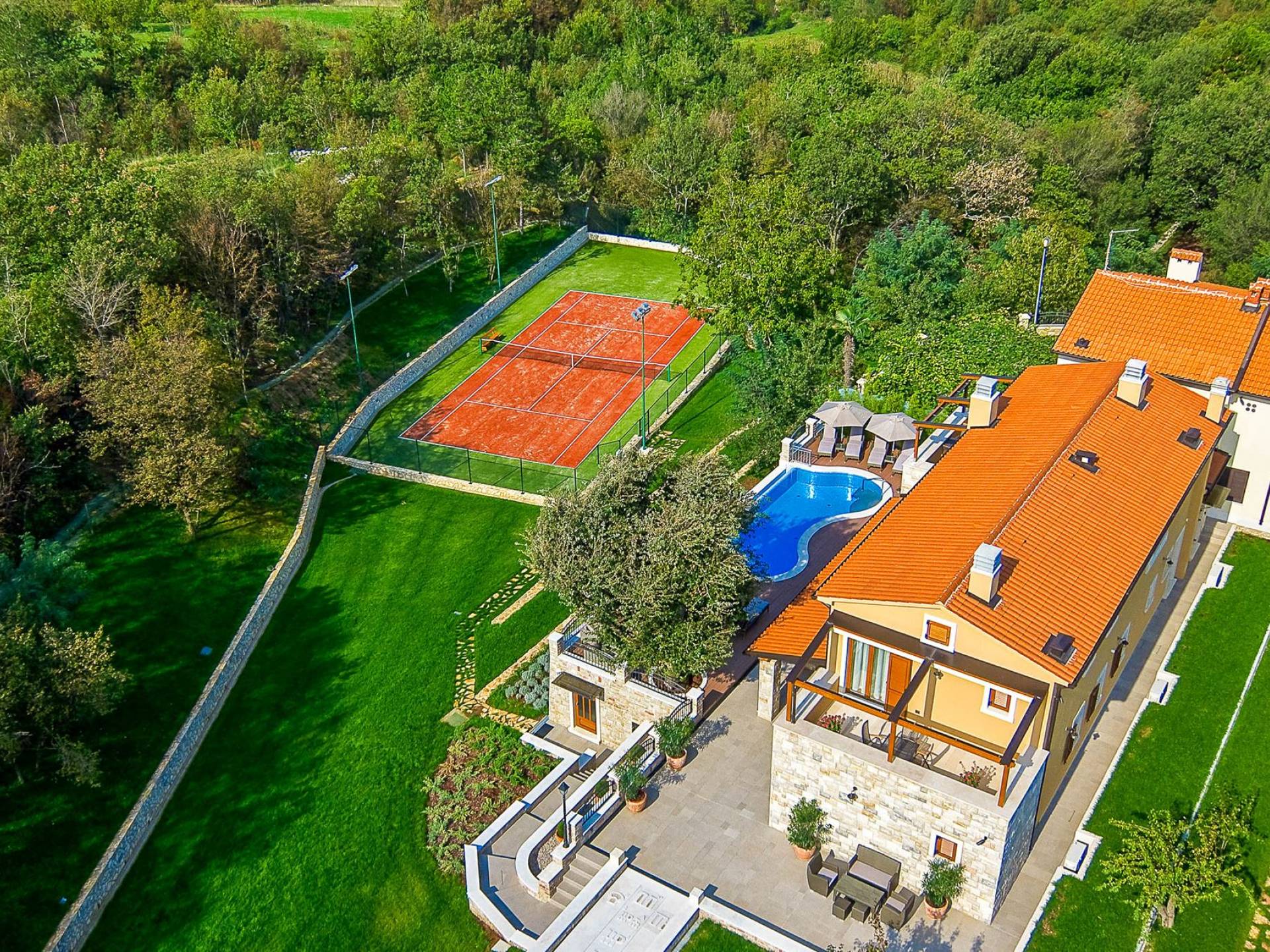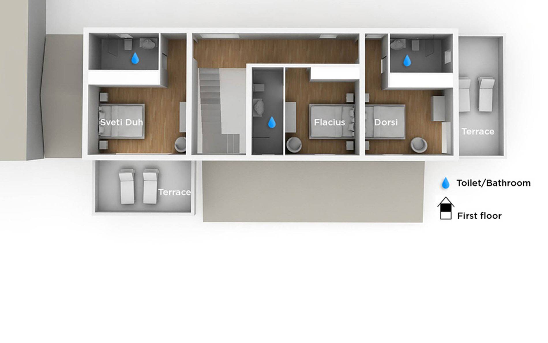 A su lado está la habitación Dorsi, la habitación más atrevida de la casa, con un romanticismo acentuado apoyado en una terraza con una hermosa vista a los jardines de la finca y al amanecer. Sveti Duh, una habitación que lleva el nombre de "Santo Spirito", el nombre original de la microubicación de la finca. Está abierto hacia su parte sur, con una terraza con vistas a la piscina y solarium, y una pista de tenis junto al bosque que rodea la finca.