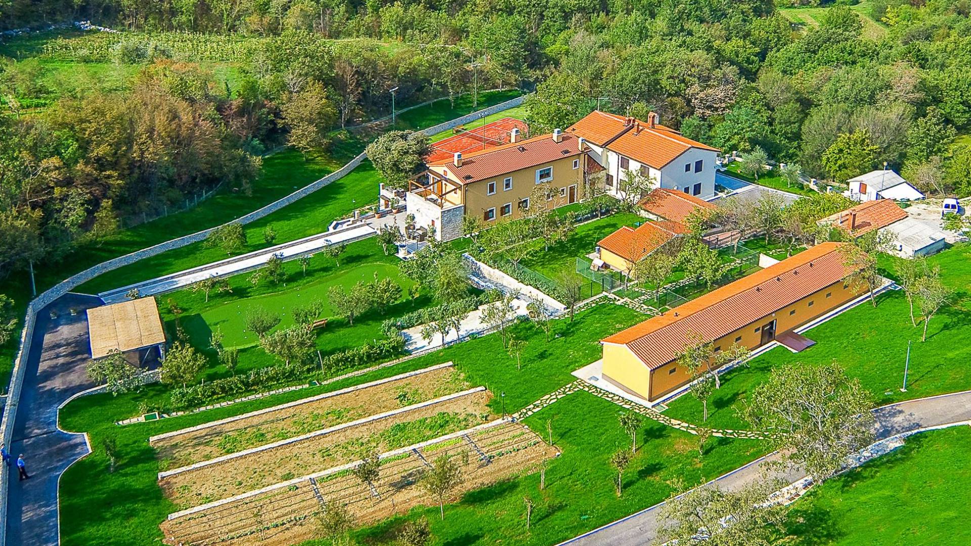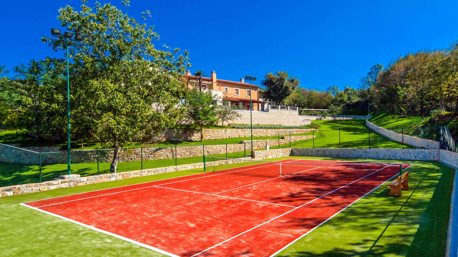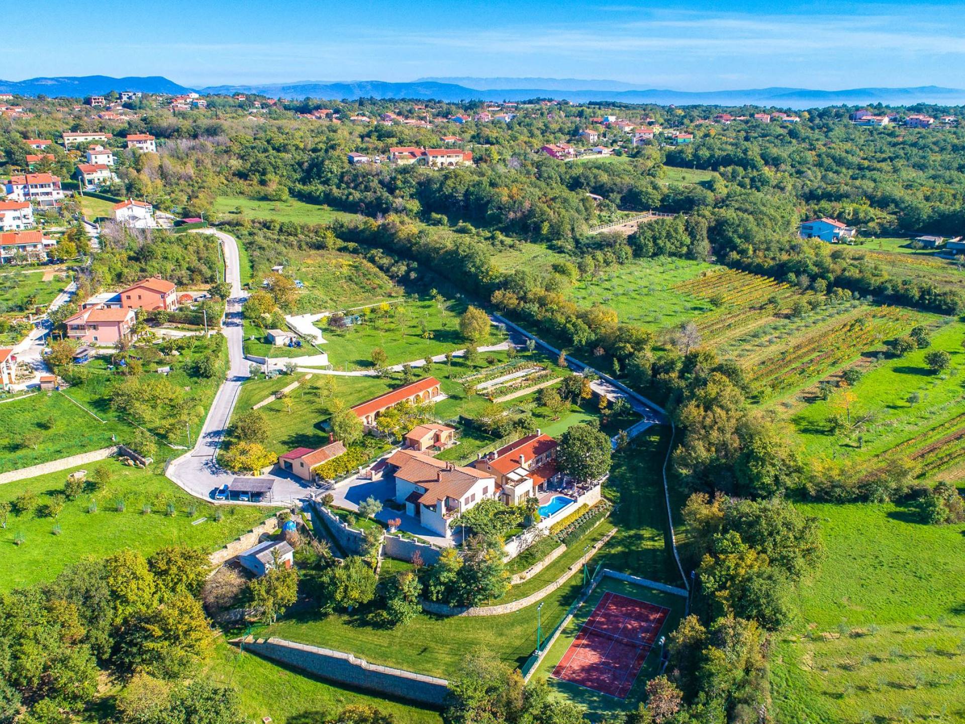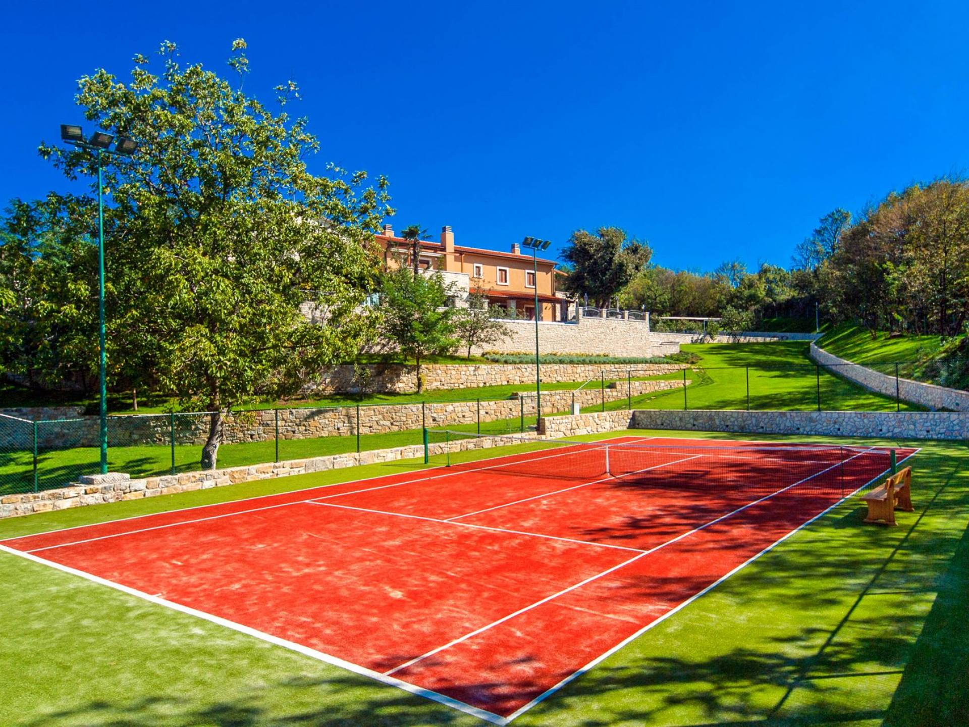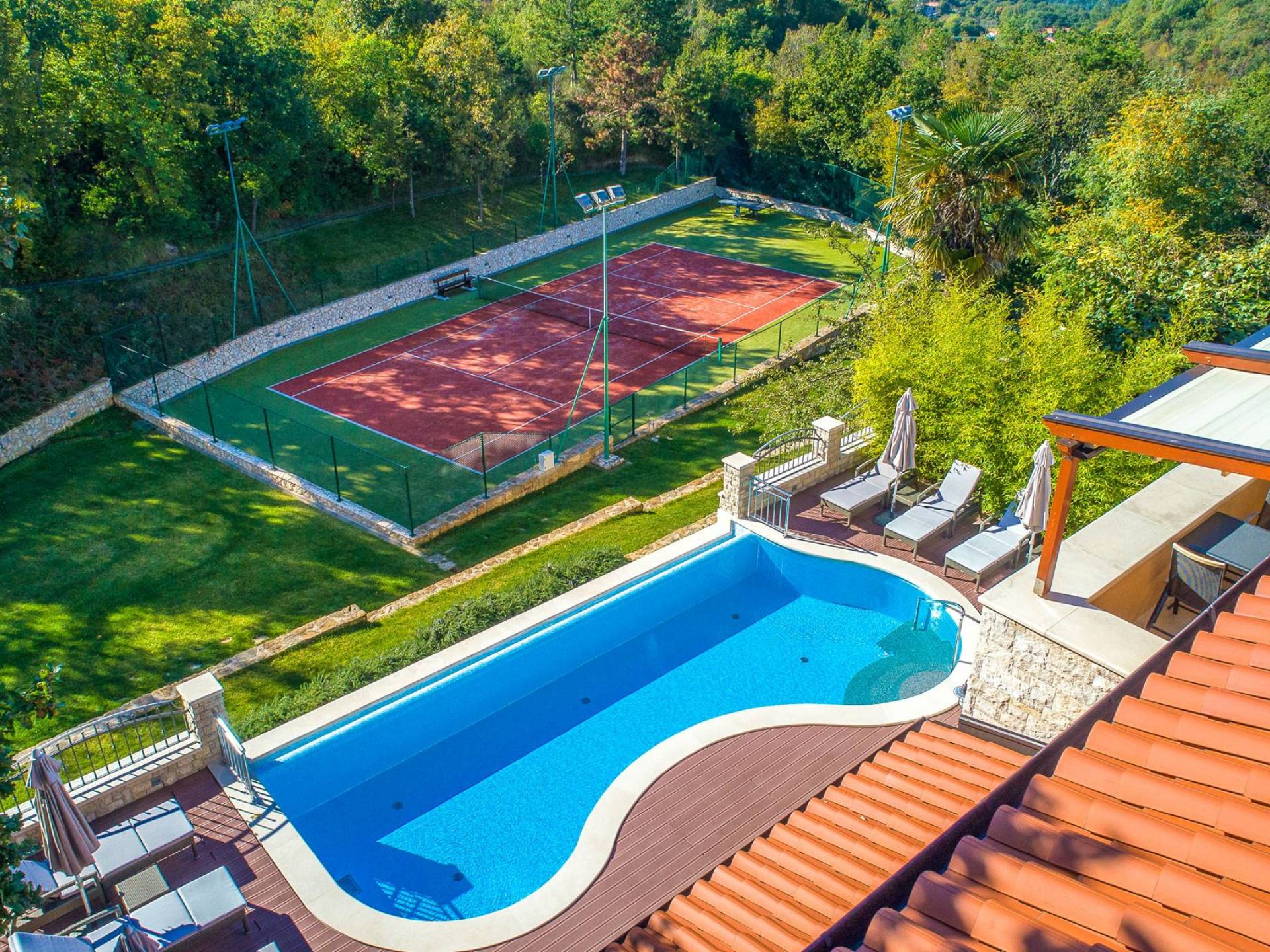 A su lado está la habitación Dorsi, la habitación más atrevida de la casa, con un romanticismo acentuado apoyado en una terraza con una hermosa vista a los jardines de la finca y al amanecer. Sveti Duh, una habitación que lleva el nombre de "Santo Spirito", el nombre original de la microubicación de la finca. Está abierto hacia su parte sur, con una terraza con vistas a la piscina y solarium, y una pista de tenis junto al bosque que rodea la finca.