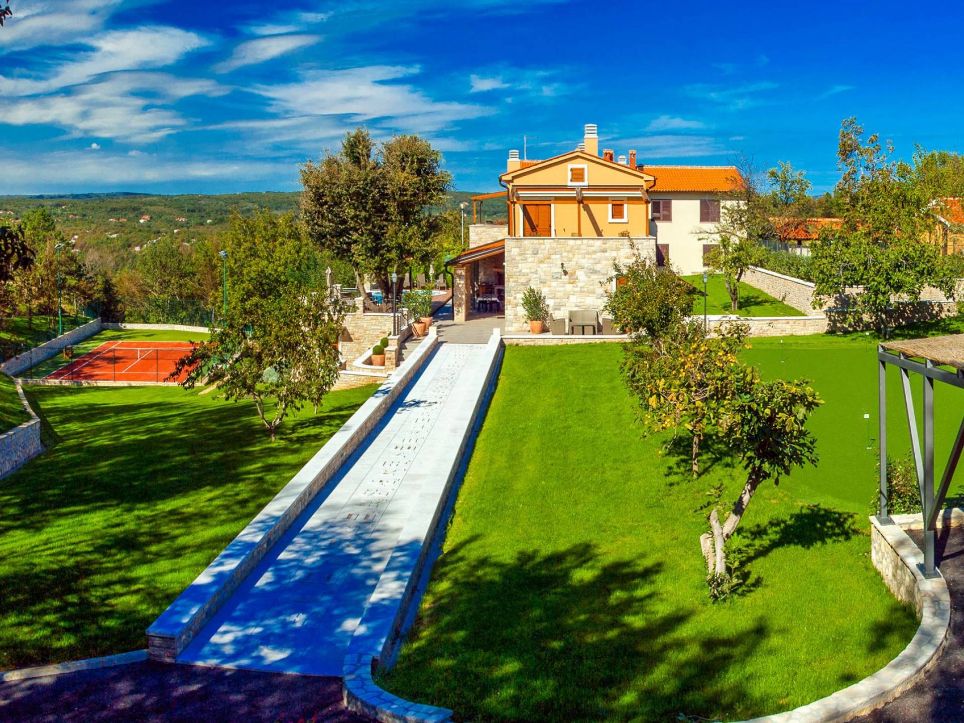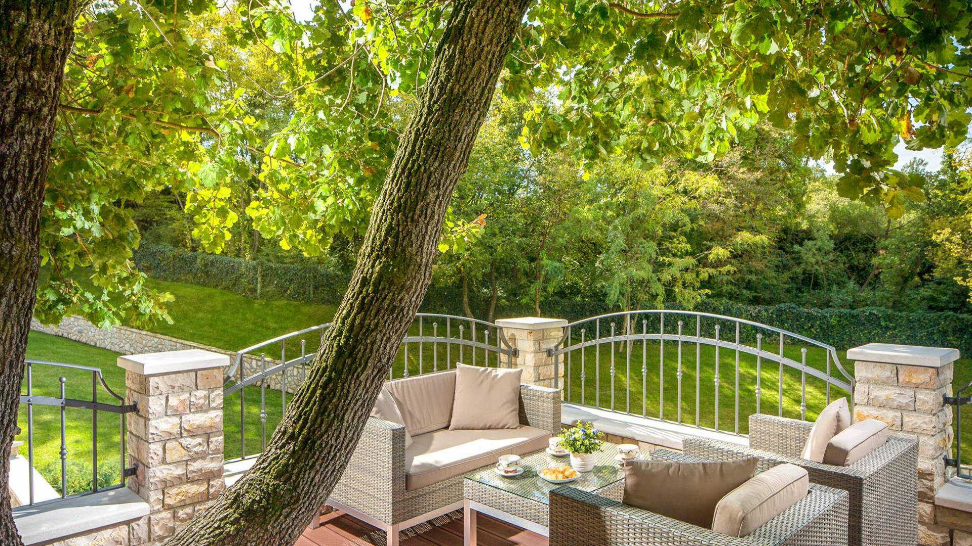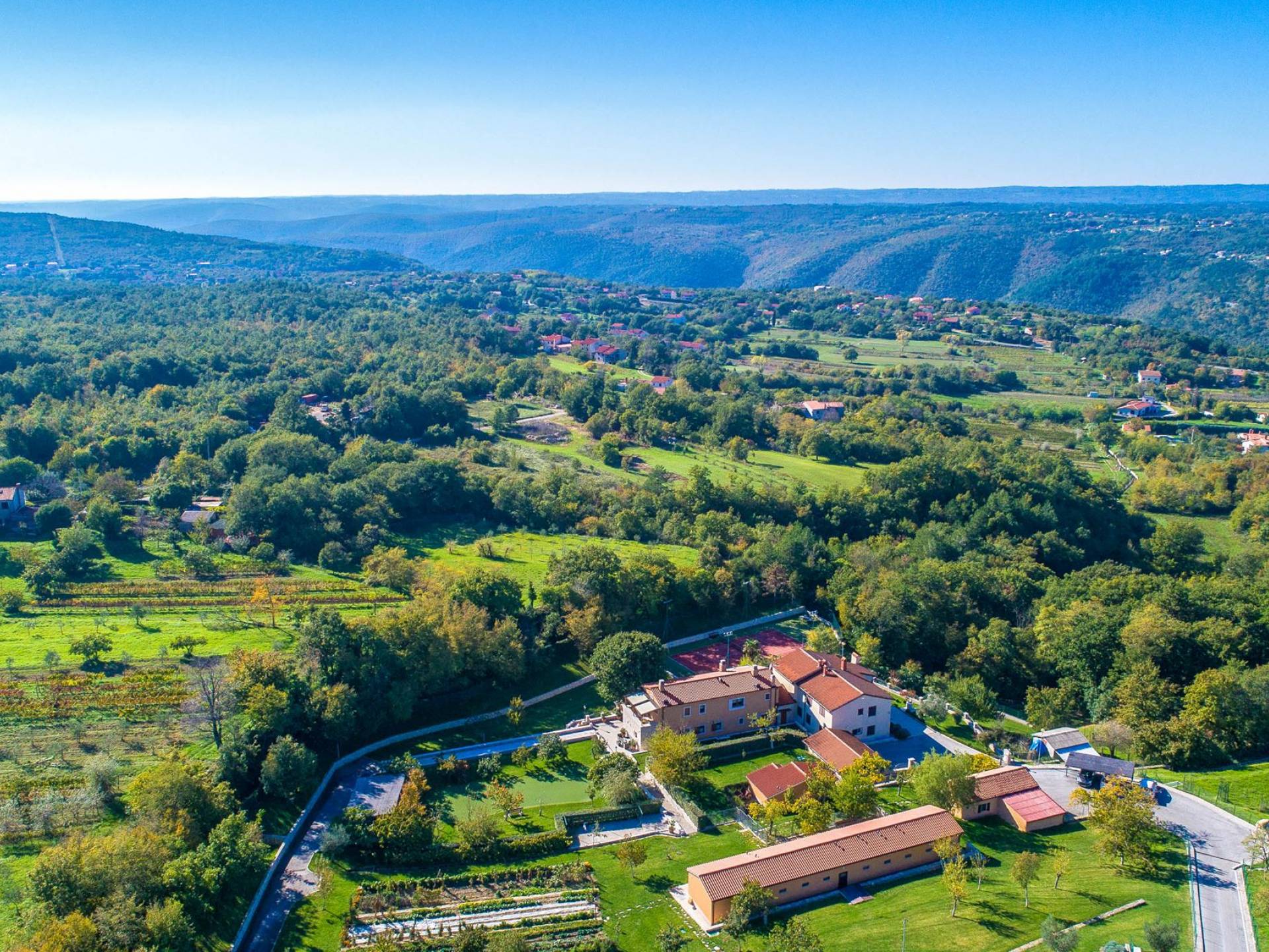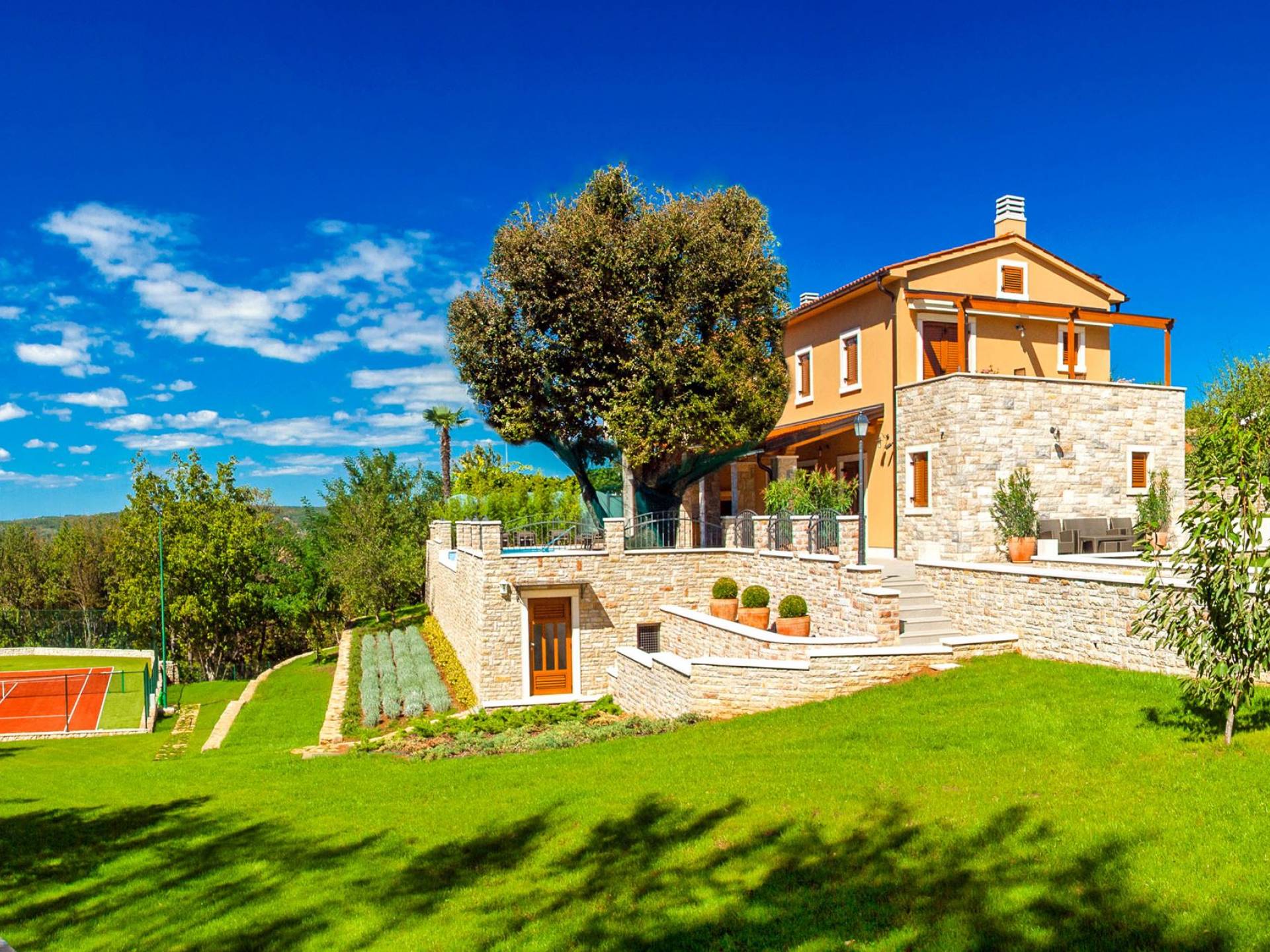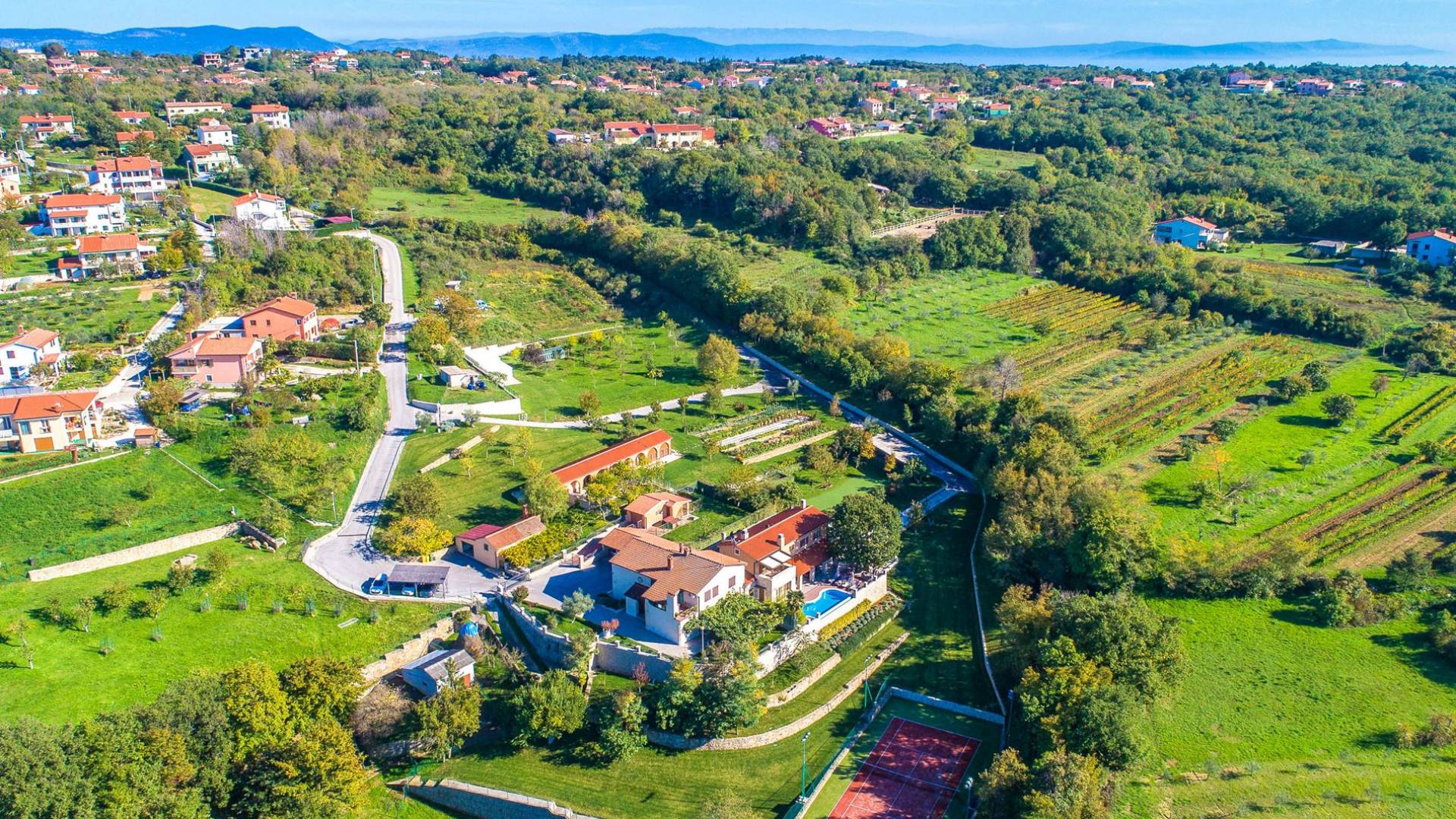 A su lado está la habitación Dorsi, la habitación más atrevida de la casa, con un romanticismo acentuado apoyado en una terraza con una hermosa vista a los jardines de la finca y al amanecer. Sveti Duh, una habitación que lleva el nombre de "Santo Spirito", el nombre original de la microubicación de la finca. Está abierto hacia su parte sur, con una terraza con vistas a la piscina y solarium, y una pista de tenis junto al bosque que rodea la finca.