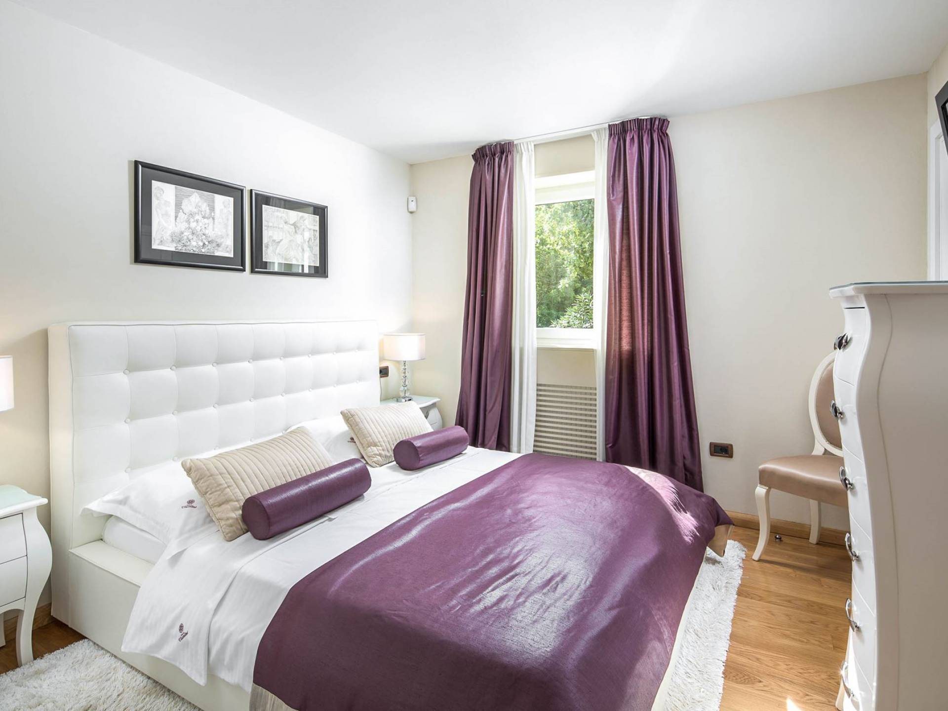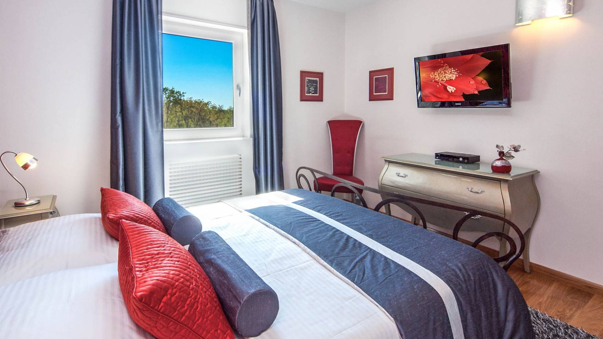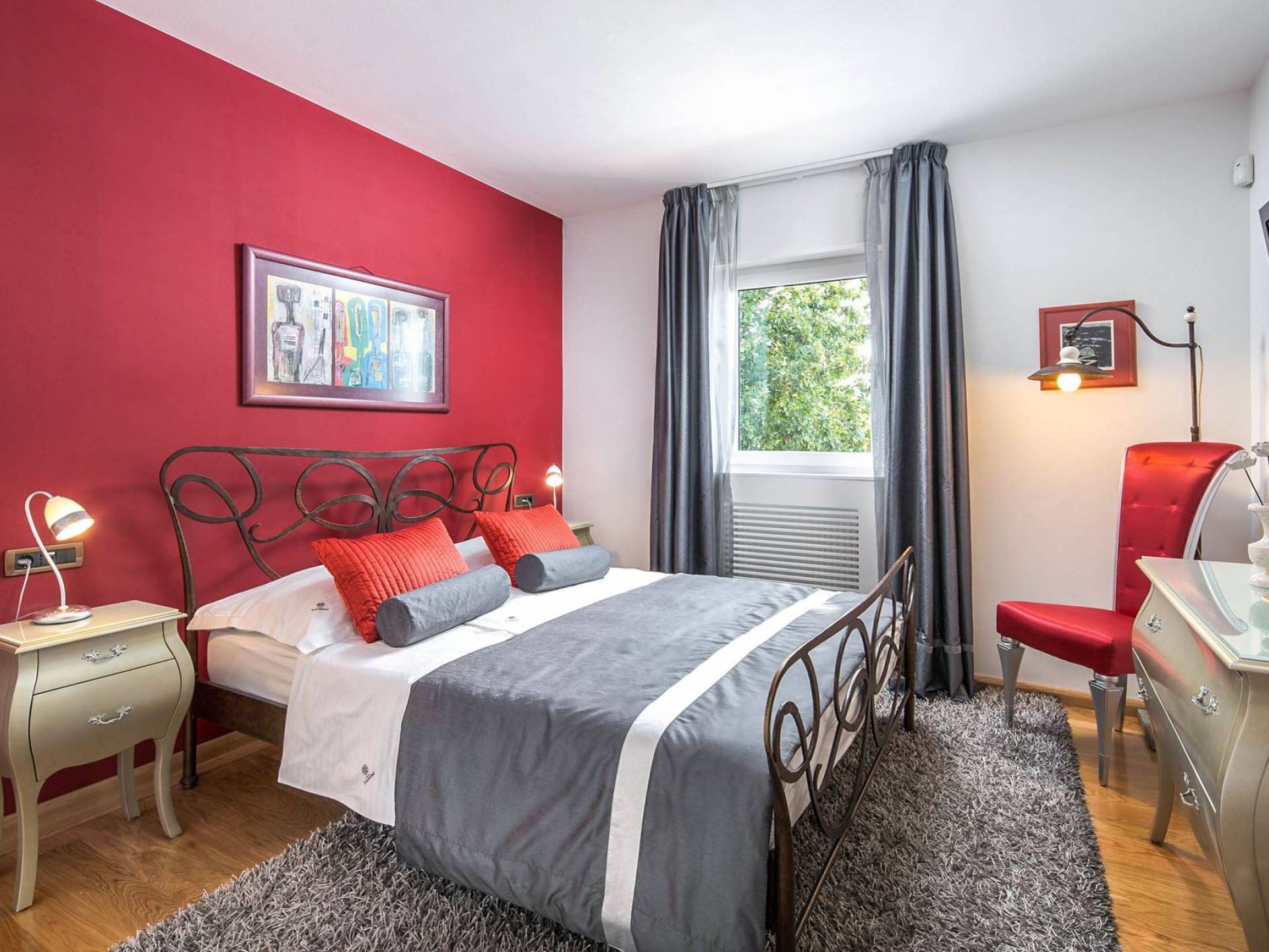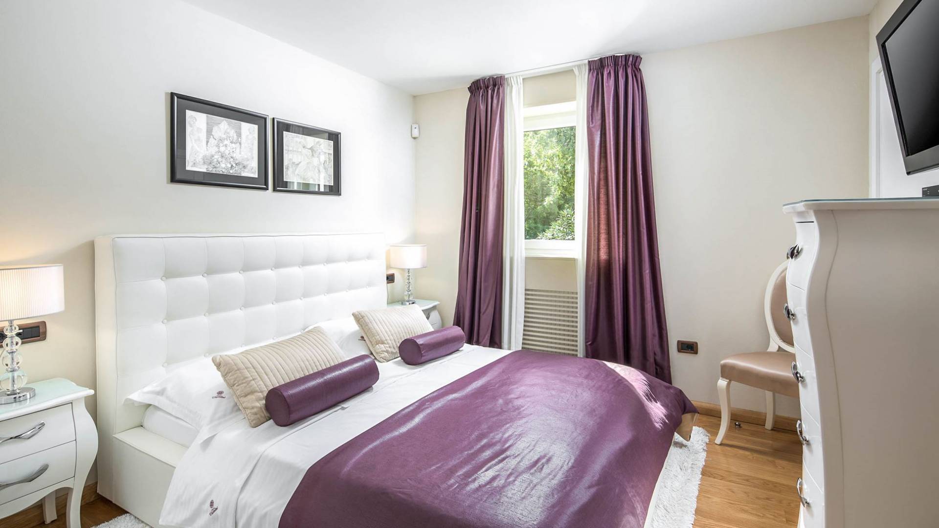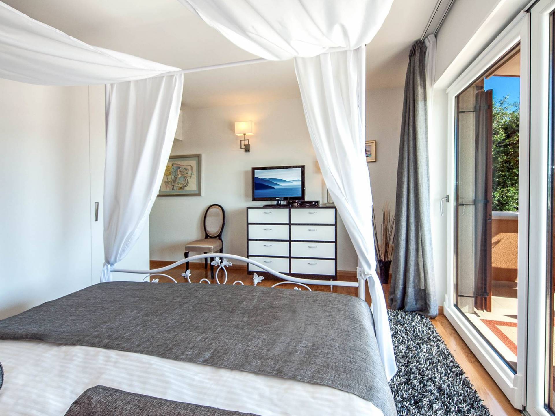 Vlastelini tiene un total de 4 dormitorios. Cada área de la Villa tiene su propia personalidad, incluidas las habitaciones, que tienen sus propios nombres. En la planta baja está la habitación Vlastelini, cuyo nombre se inspiró en el antiguo apodo de la familia Vlačić. Está dominado por una elegancia sutil, confeccionada con tonos cálidos y brillantes que enfatizan la sensación de comodidad. En el piso está la habitación Flacius, inspirada en la variante latina del apellido Vlačić, que dio a conocer el famoso antepasado Ilirik, trae colores divertidos. del amor y la atmósfera en la que se entrelazan los espíritus de Amor y Eros.