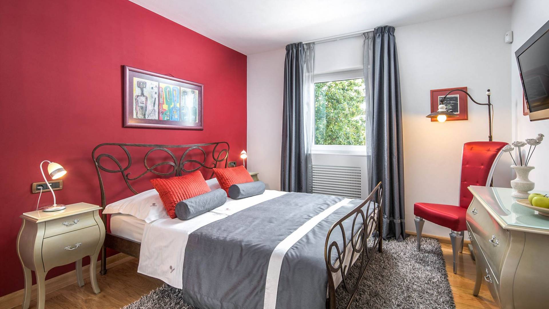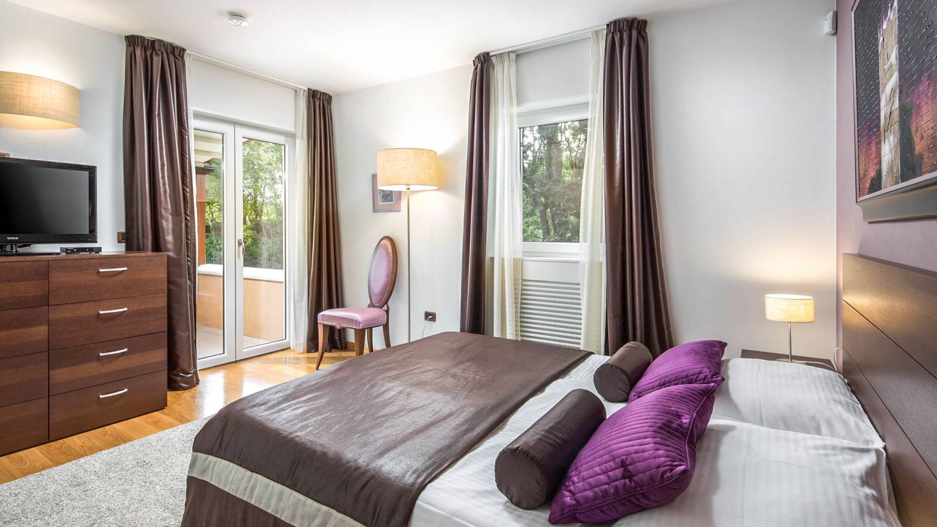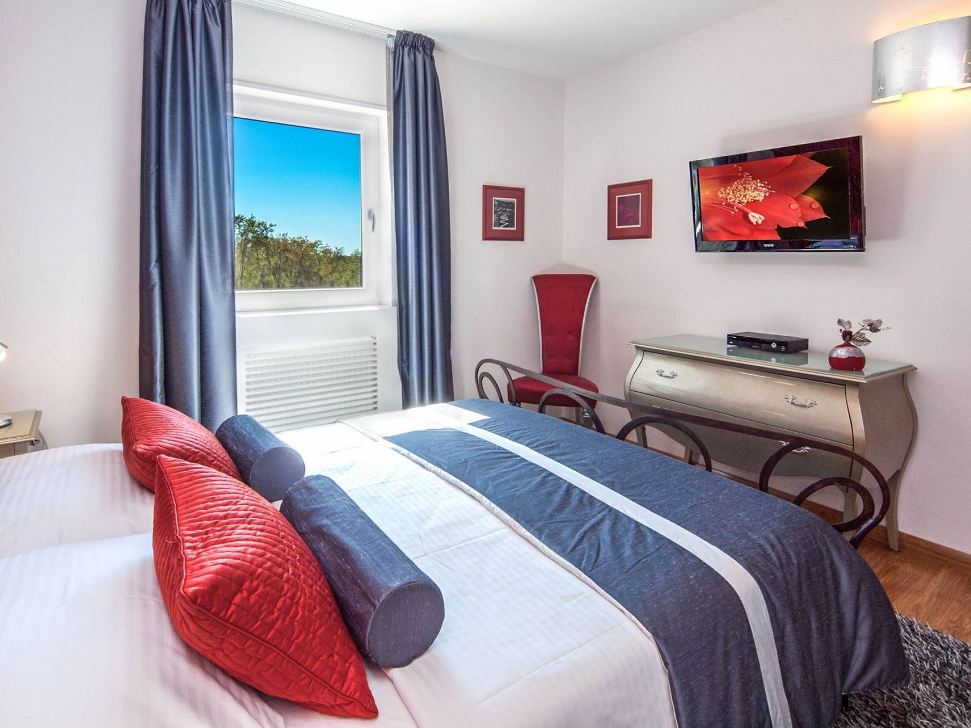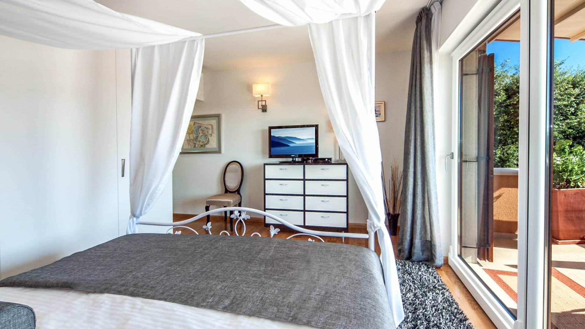 Vlastelini tiene un total de 4 dormitorios. Cada área de la Villa tiene su propia personalidad, incluidas las habitaciones, que tienen sus propios nombres. En la planta baja está la habitación Vlastelini, cuyo nombre se inspiró en el antiguo apodo de la familia Vlačić. Está dominado por una elegancia sutil, confeccionada con tonos cálidos y brillantes que enfatizan la sensación de comodidad. En el piso está la habitación Flacius, inspirada en la variante latina del apellido Vlačić, que dio a conocer el famoso antepasado Ilirik, trae colores divertidos. del amor y la atmósfera en la que se entrelazan los espíritus de Amor y Eros.