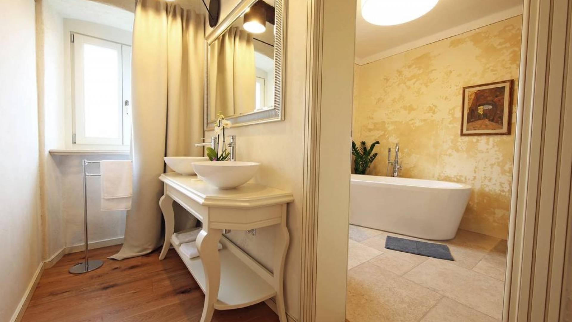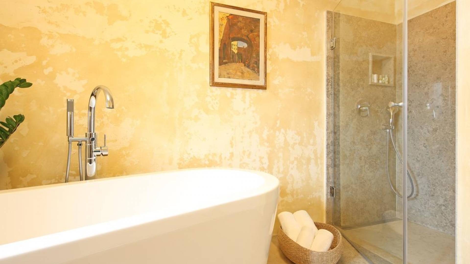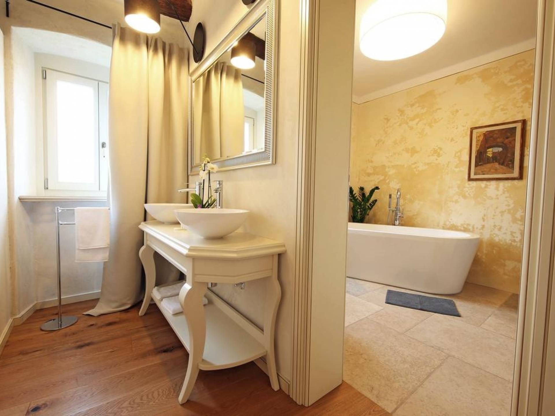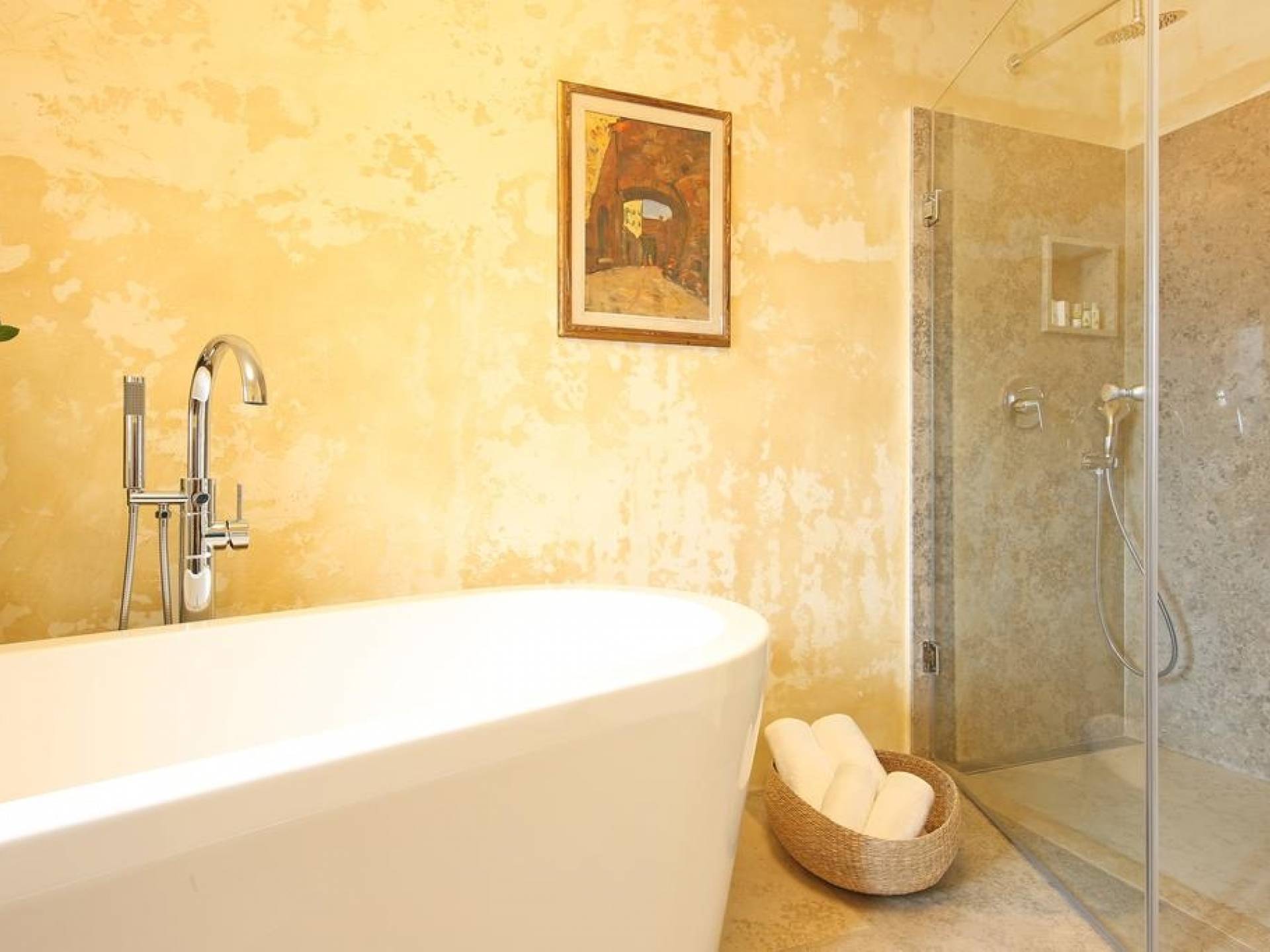 Arriba hay dos dormitorios dobles con dos baños modernos y especialmente diseñados, y uno con un sofá adicional. La casa tiene aire acondicionado, calefacción y piscina climatizada. Villa Benvenuti ofrece a los huéspedes el uso de un jardín privado con una variedad de cultivos de hortalizas de temporada de producción orgánica.