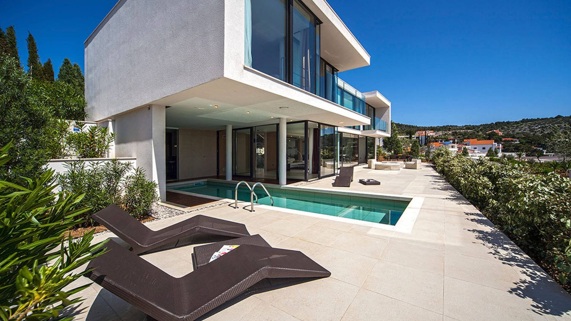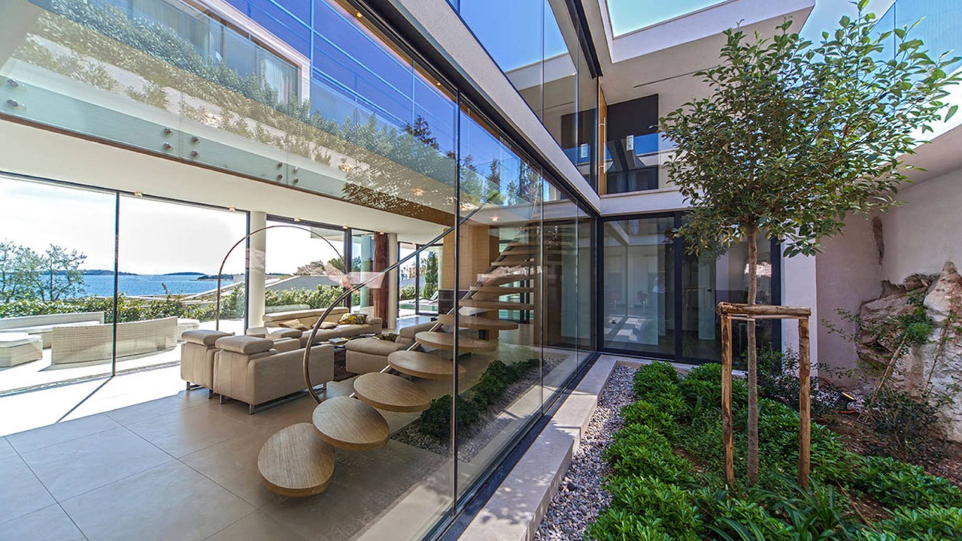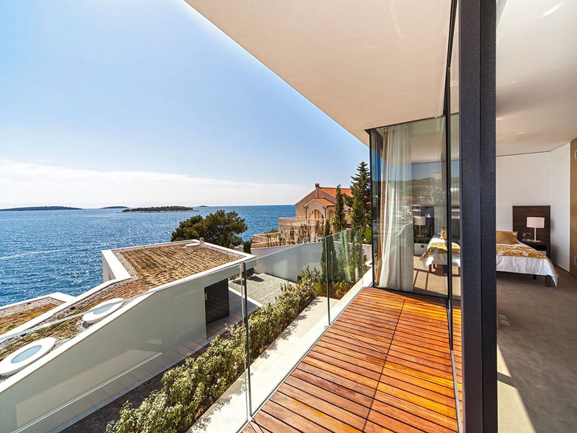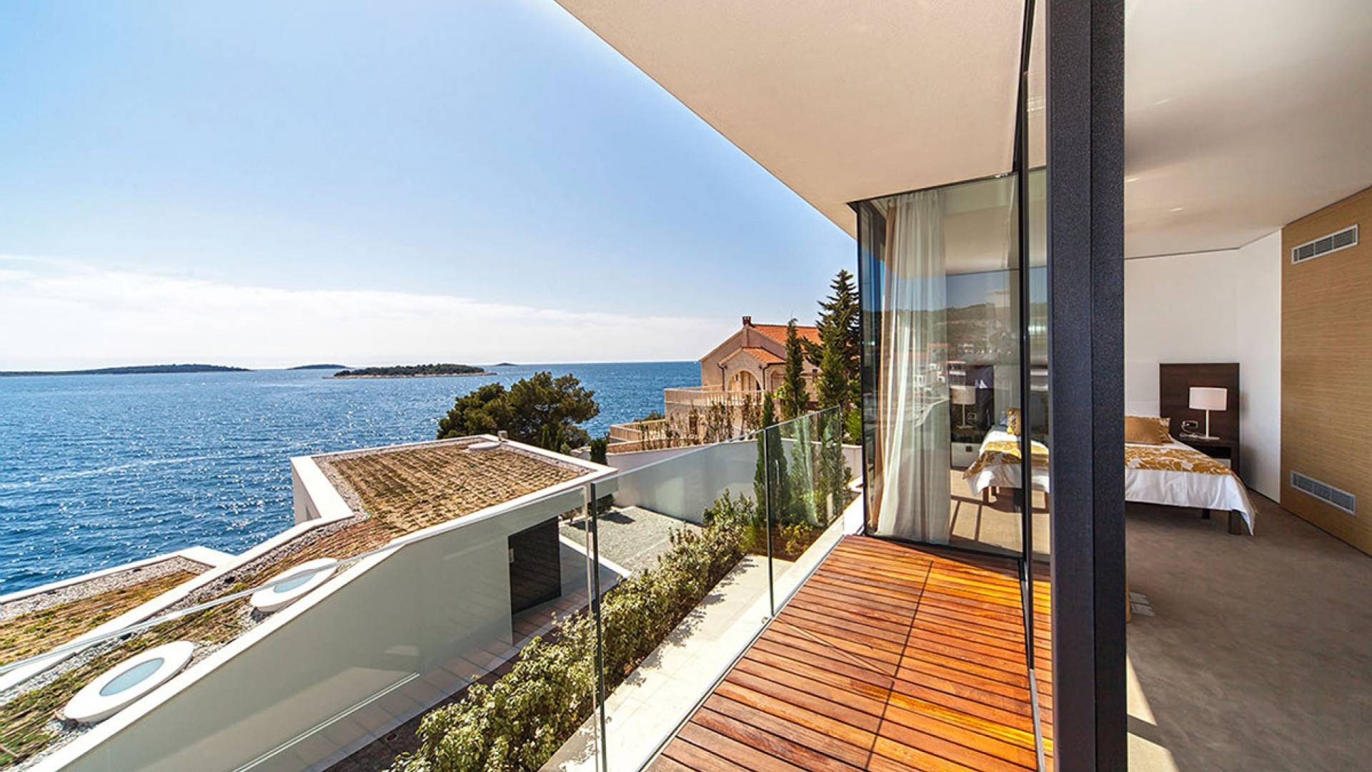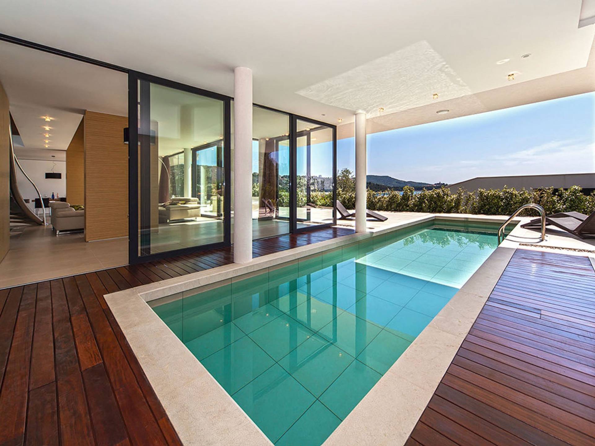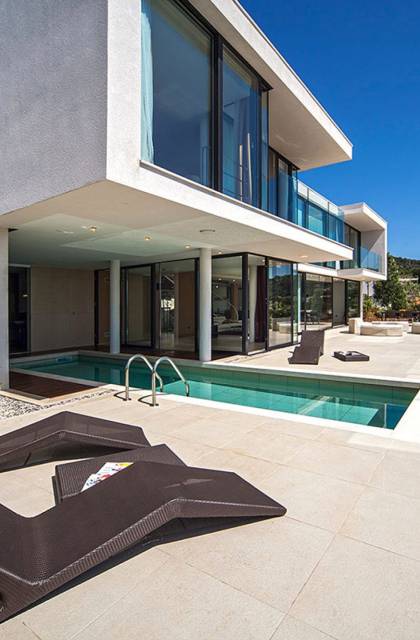 Situada a una fila del paseo marítimo, Villa Annabel tiene un ángulo para disfrutar de unas vistas óptimas al mar. Siéntese en la terraza para tomar el sol y disfrute del fabuloso panorama que tiene ante usted, pasando unos días de ocio junto a la piscina interior / exterior. El techo verde de la villa en primer plano está diseñado para crear la impresión de un jardín entre usted y el mar.