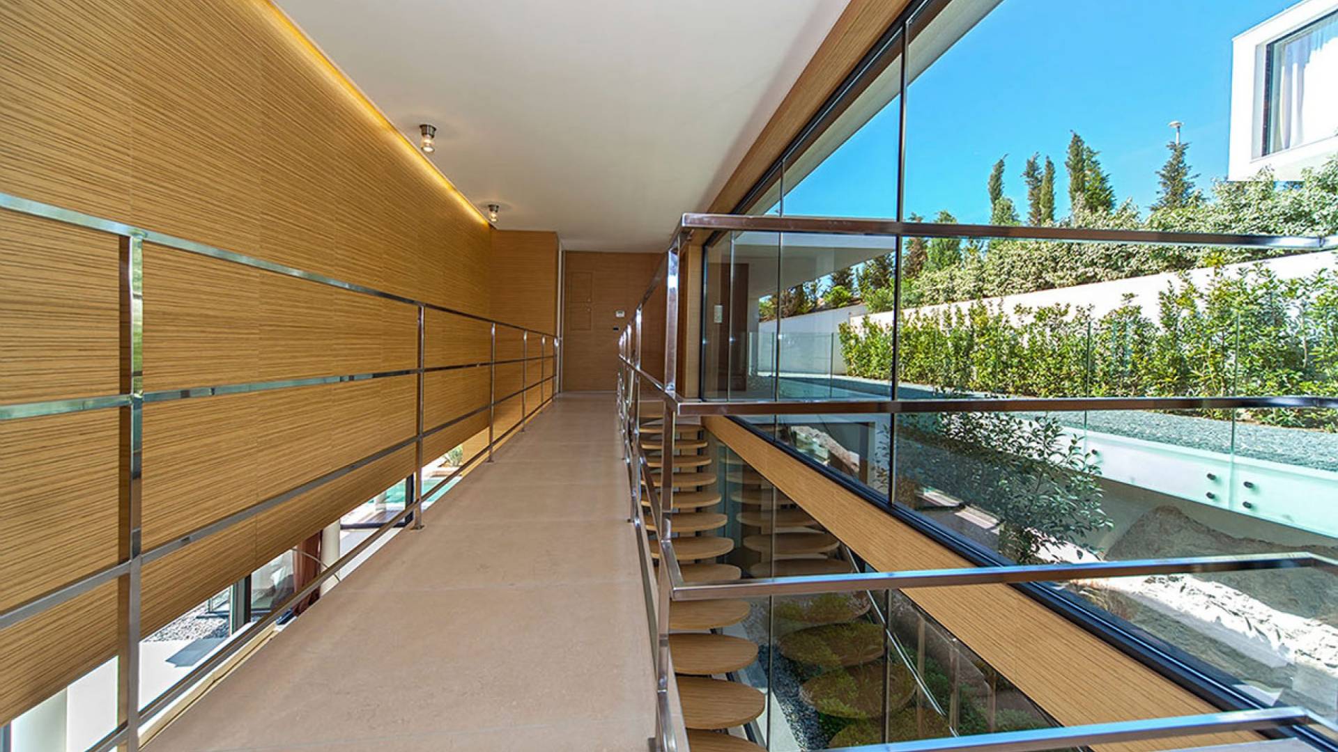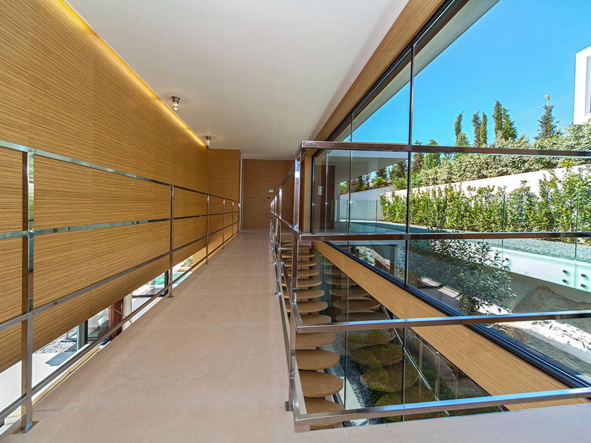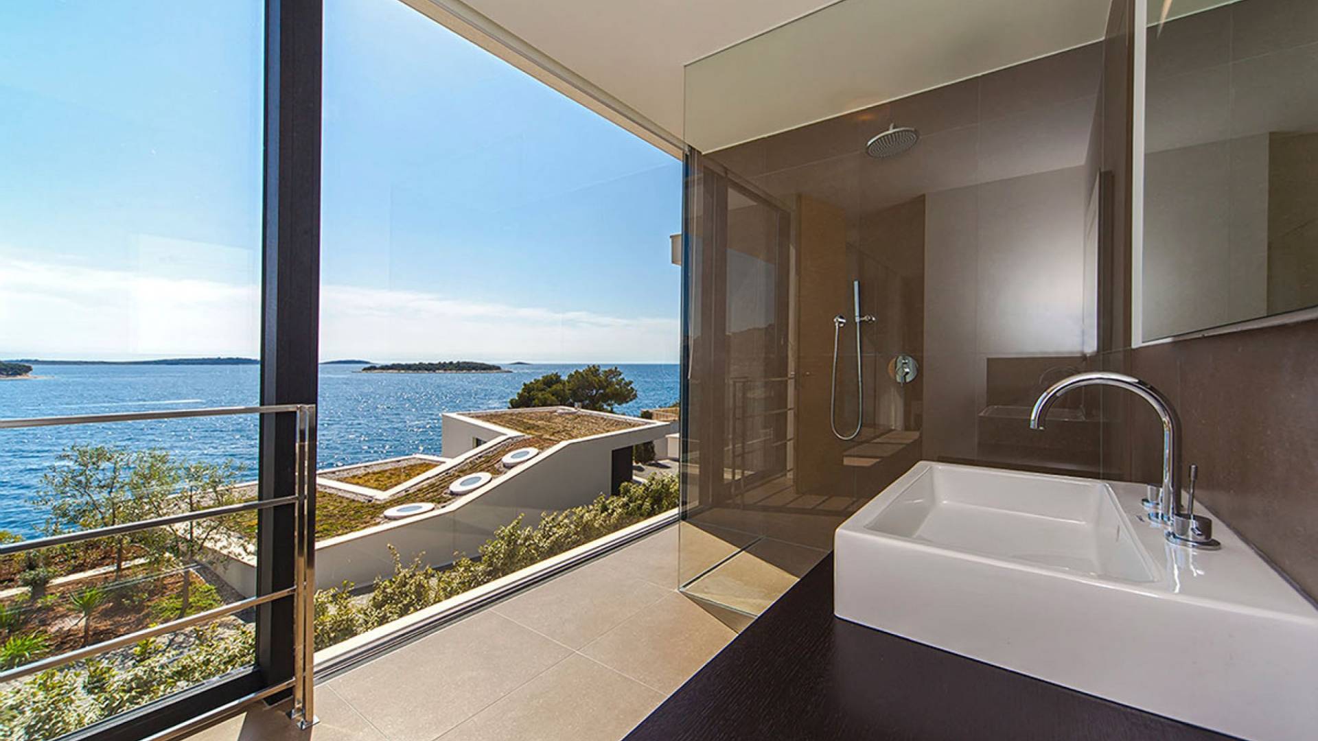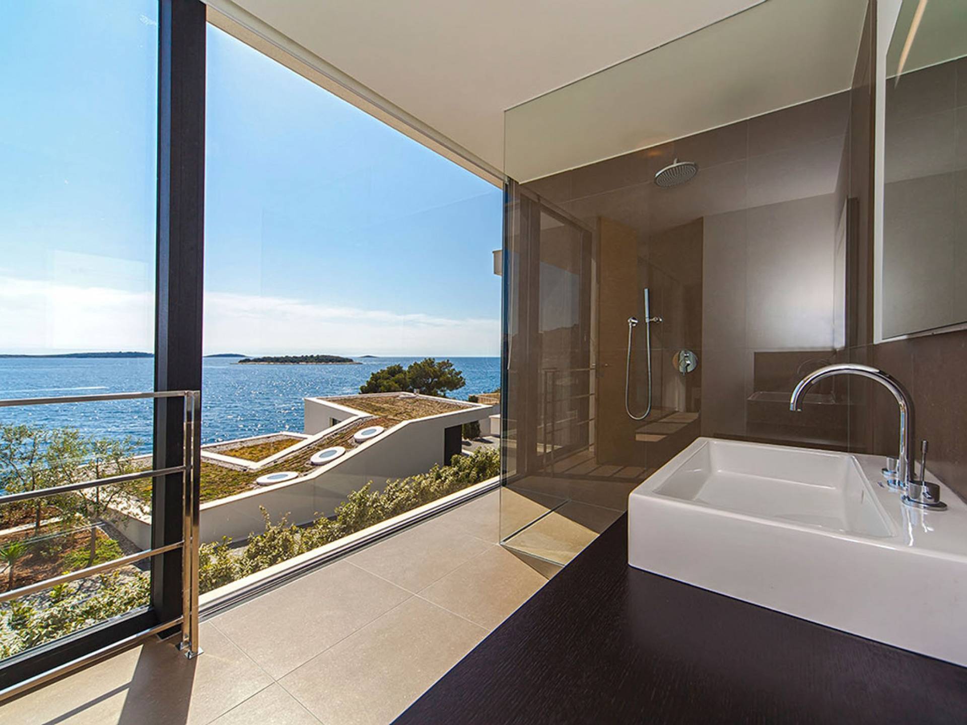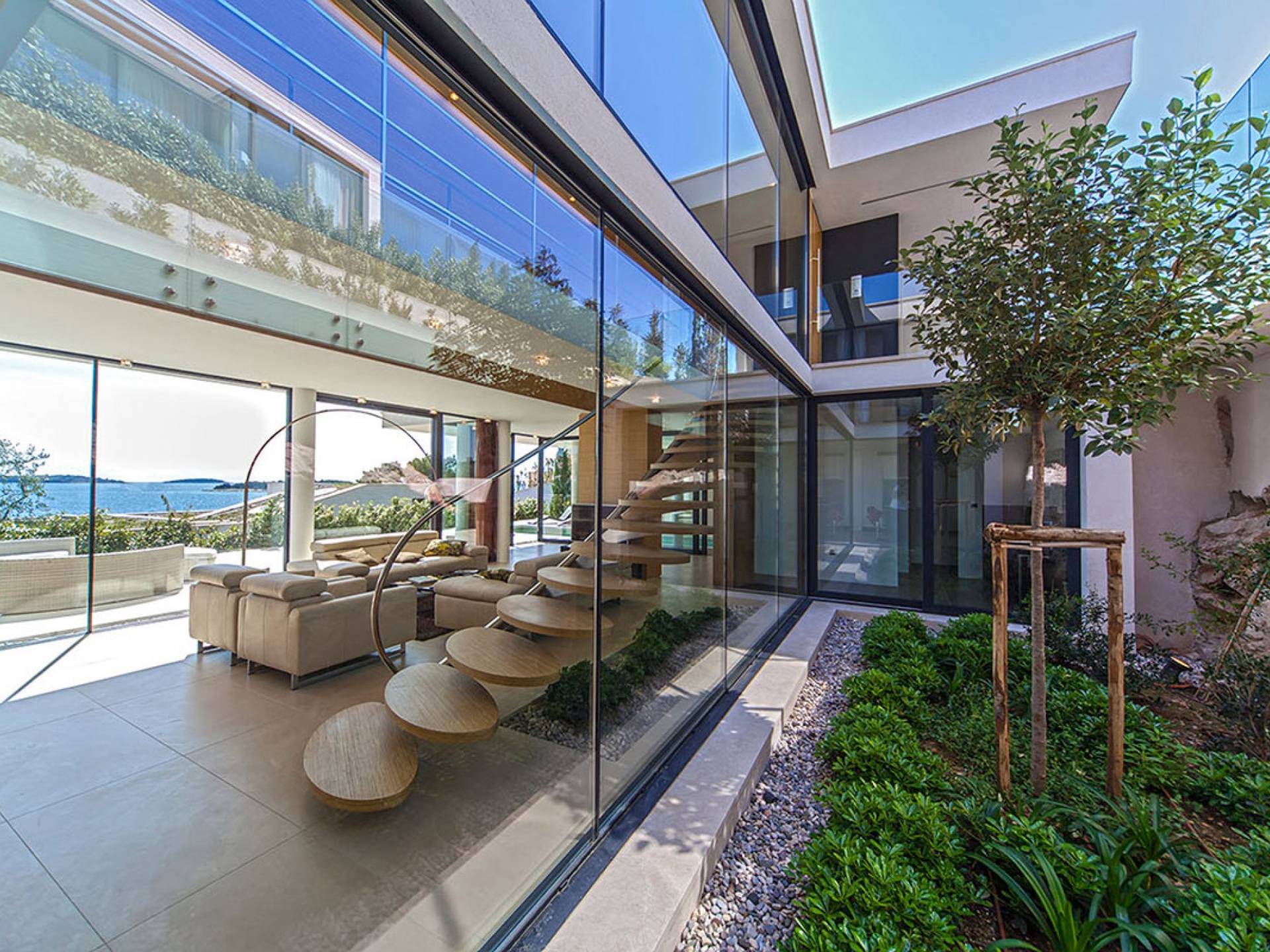Situada a una fila del paseo marítimo, Villa Annabel tiene un ángulo para disfrutar de unas vistas óptimas al mar. Siéntese en la terraza para tomar el sol y disfrute del fabuloso panorama que tiene ante usted, pasando unos días de ocio junto a la piscina interior / exterior. El techo verde de la villa en primer plano está diseñado para crear la impresión de un jardín entre usted y el mar.