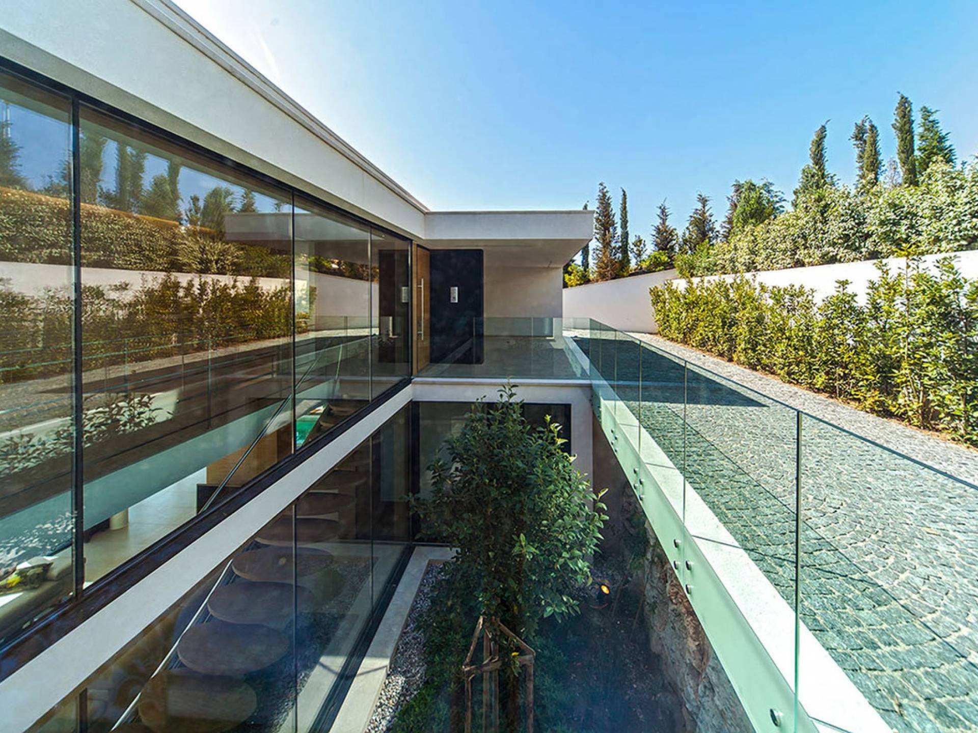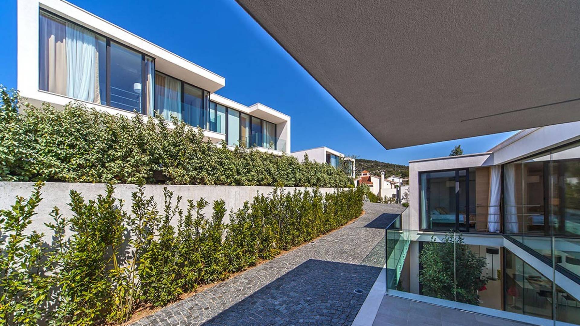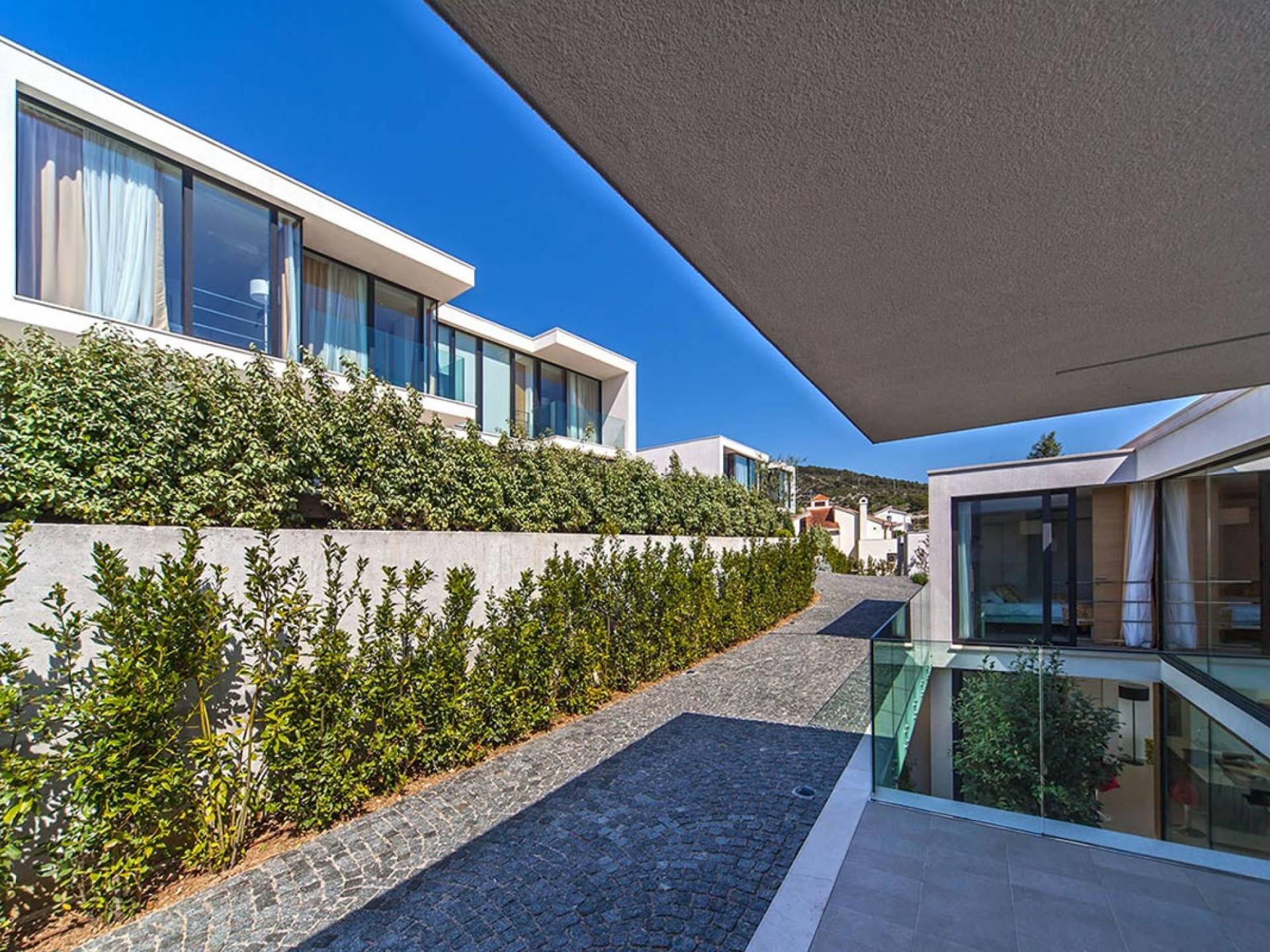 Los arquitectos han prestado especial atención a la posición del conjunto, que al mismo tiempo otorga exclusividad a cada unidad individual del mismo, sin embargo no las separa entre sí, otorgando así una vista única y despejada de cada uno de ellos. Los techos verdes en cada una de las villas crean la impresión de un jardín para la villa que está detrás.