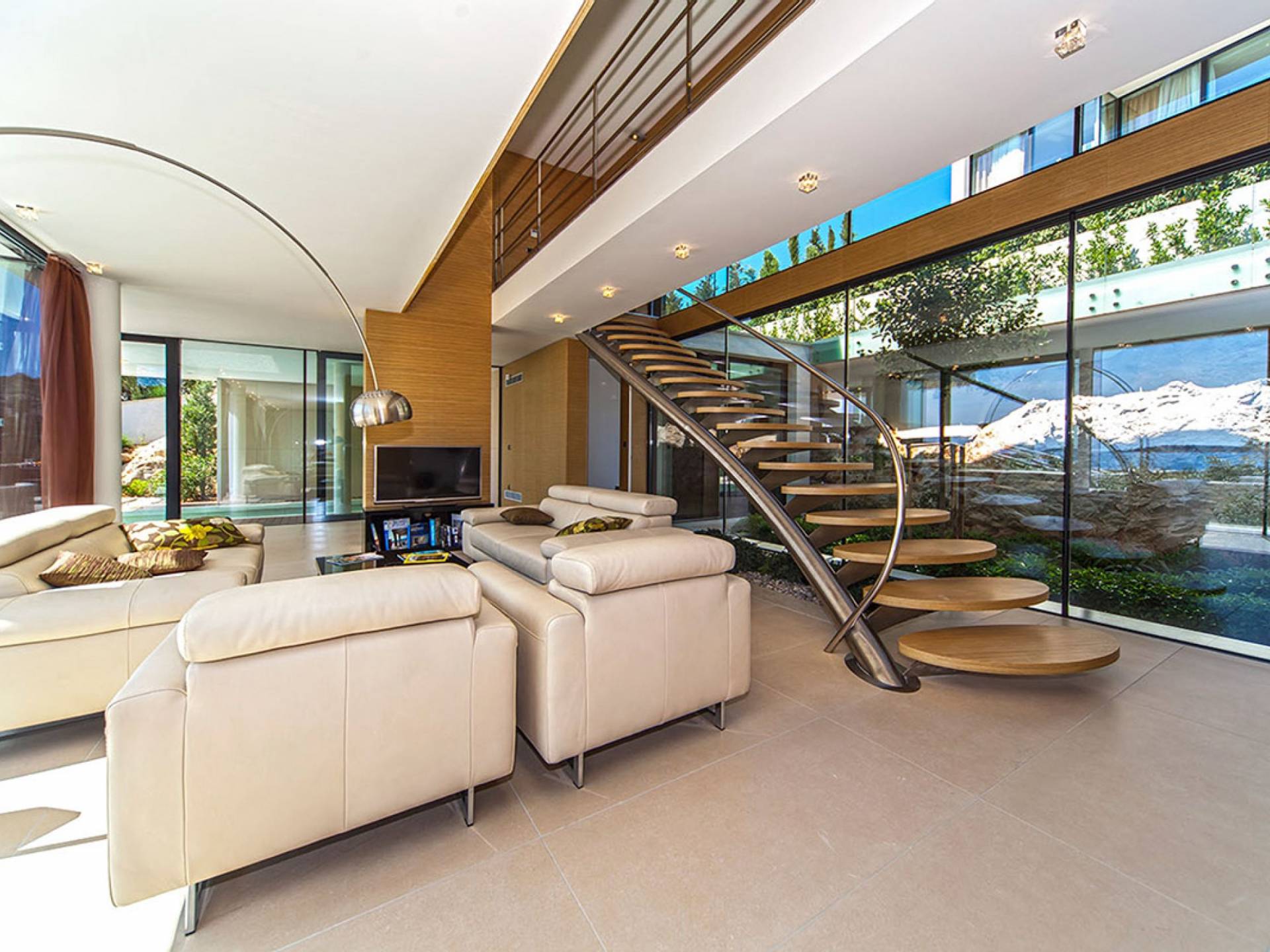 Se accede a la sala de estar de planta abierta directamente desde la terraza a través de puertas de vidrio del piso al techo: el vidrio se extiende a lo largo de toda la pared para aprovechar al máximo esas vistas y crea un espacio maravillosamente luminoso y aireado. Tómese un tiempo en los cómodos sofás y relájese frente al televisor de plasma. La sala de estar se extiende hasta la cocina bien equipada y el comedor, y hay una magnífica sauna en el nivel inferior.